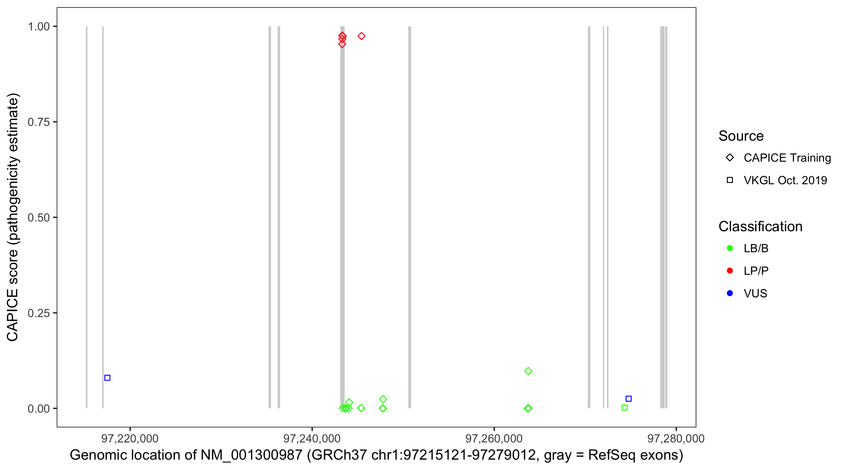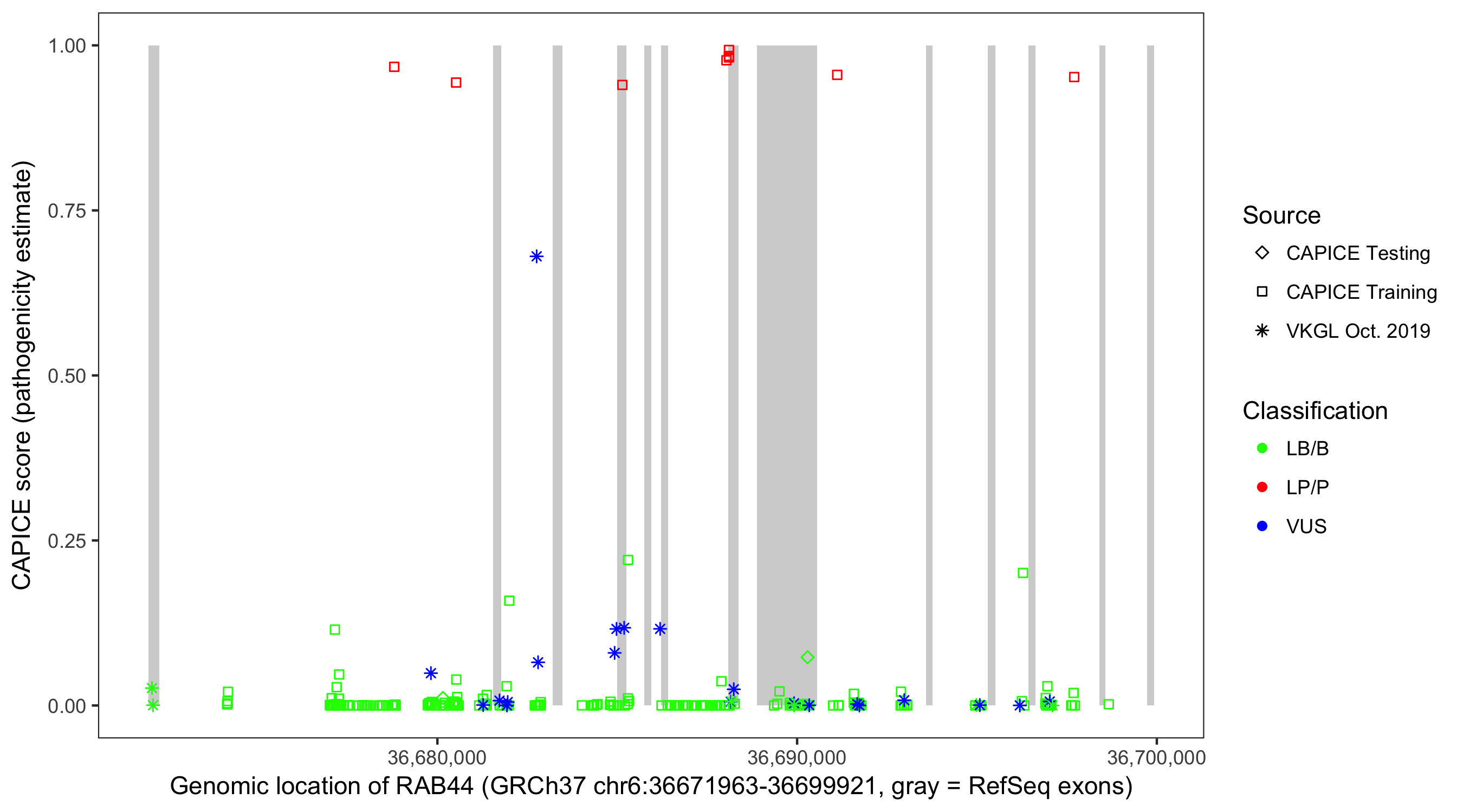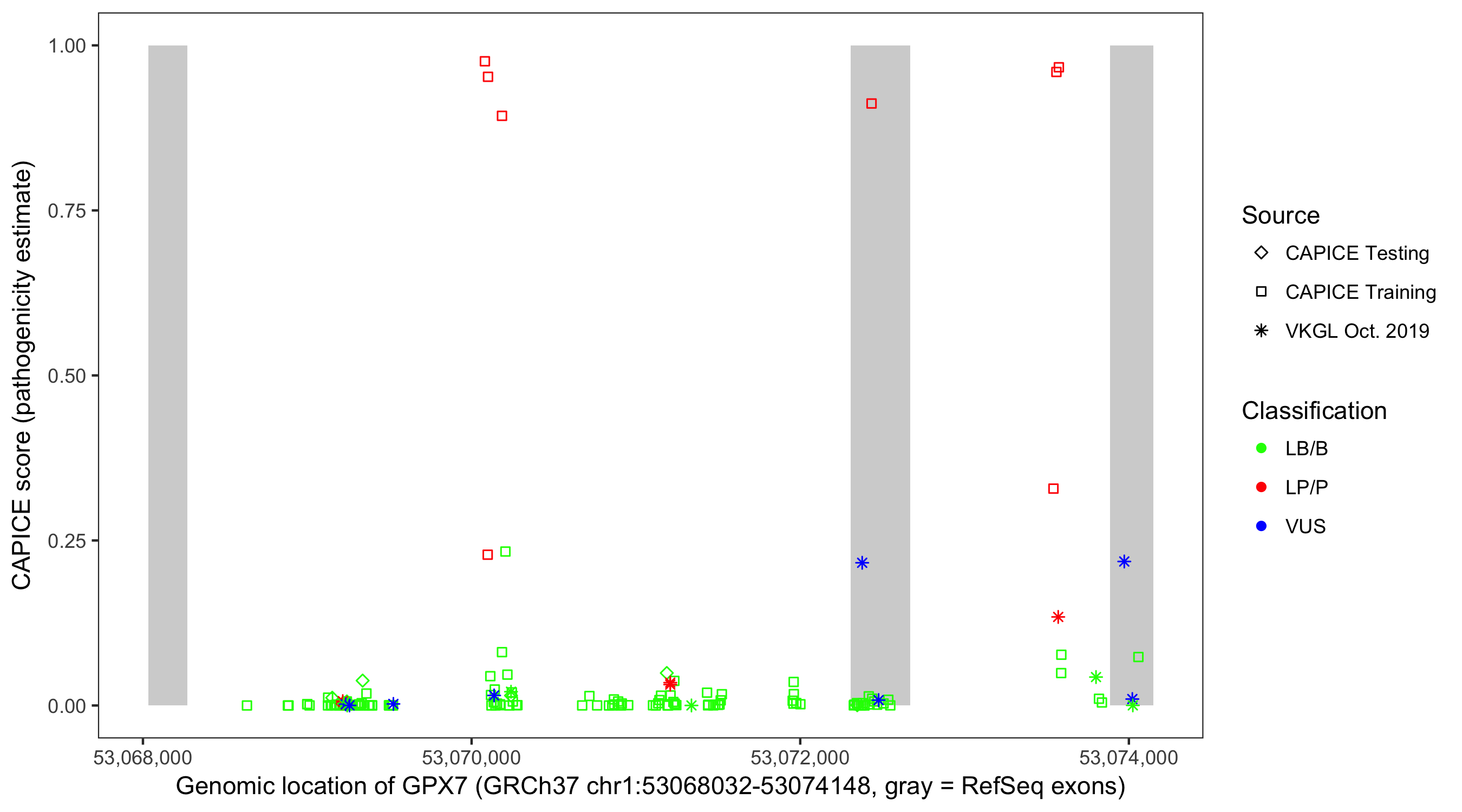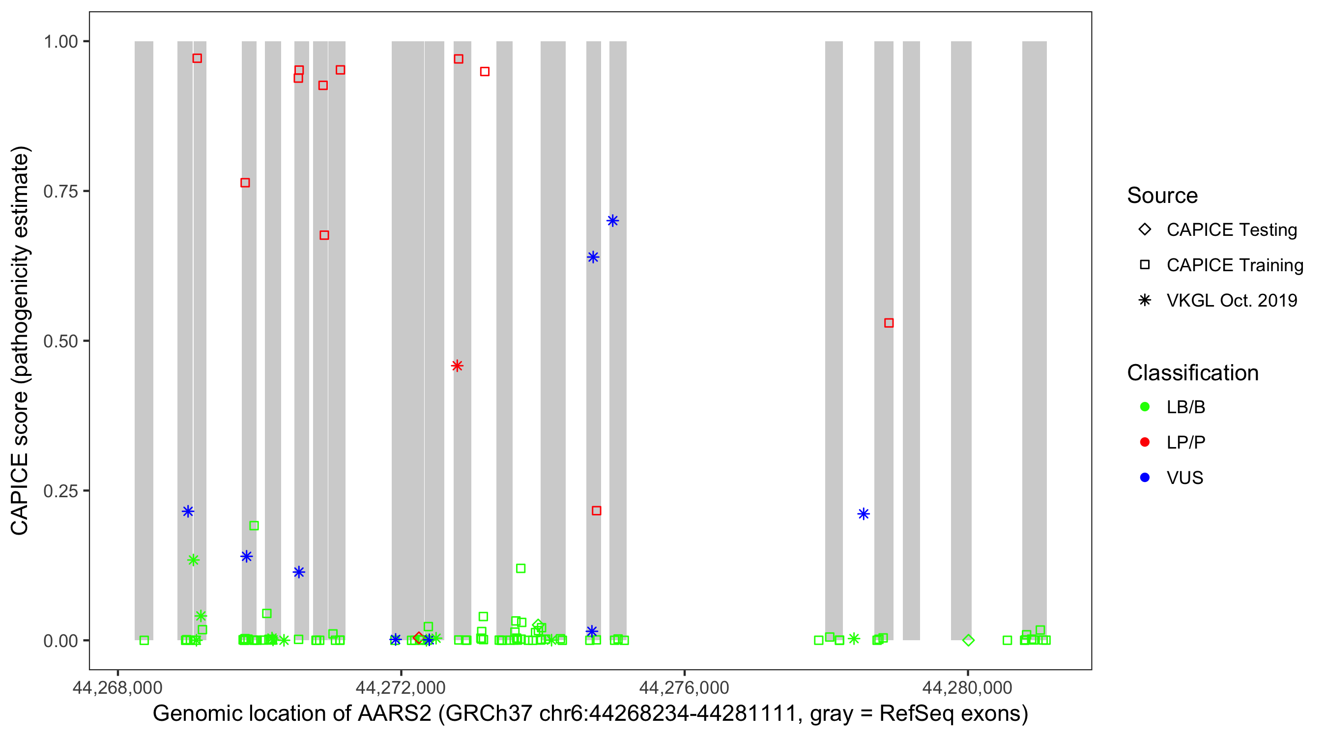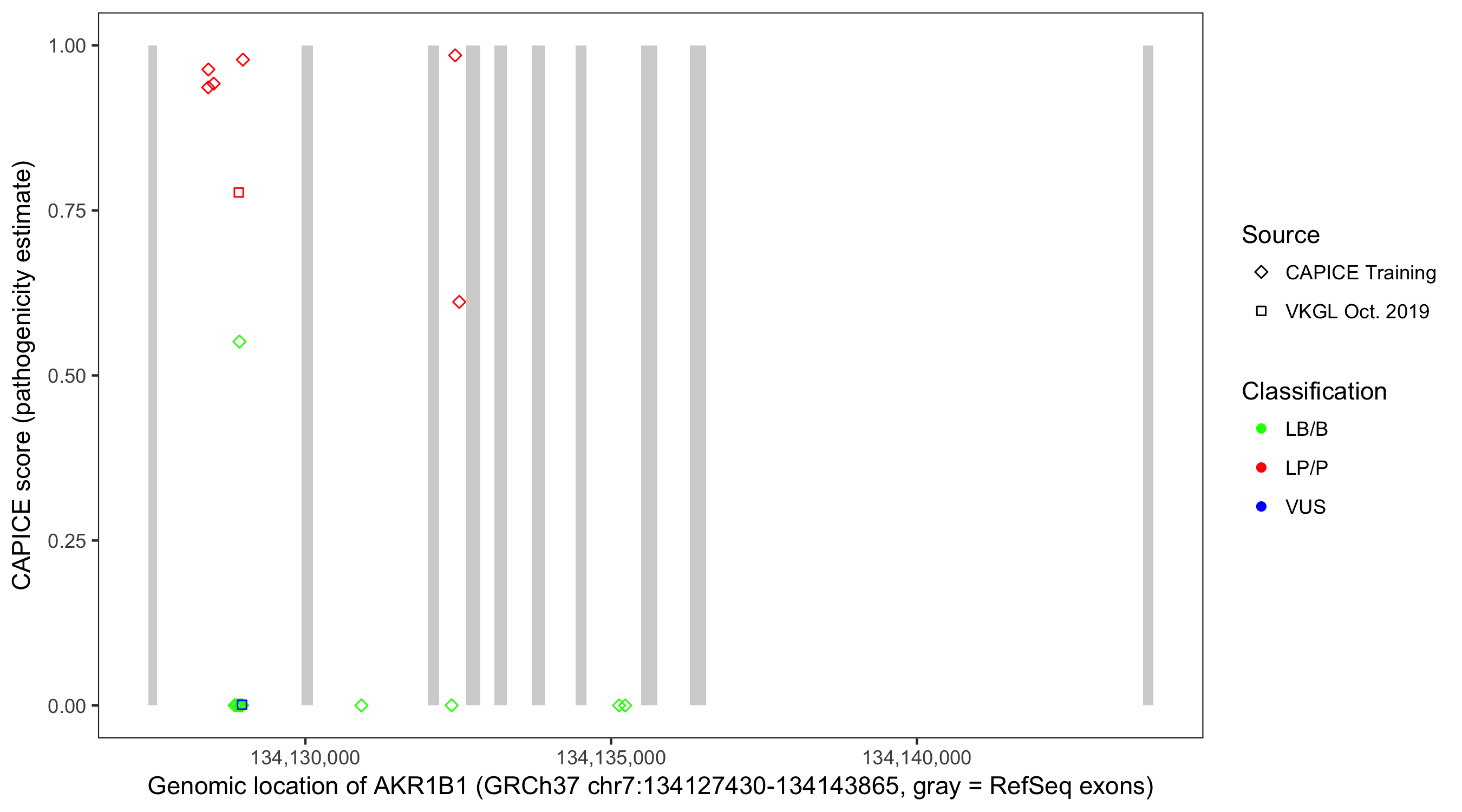 Shown are CAPICE train/test variants plus VKGL Oct 2019.