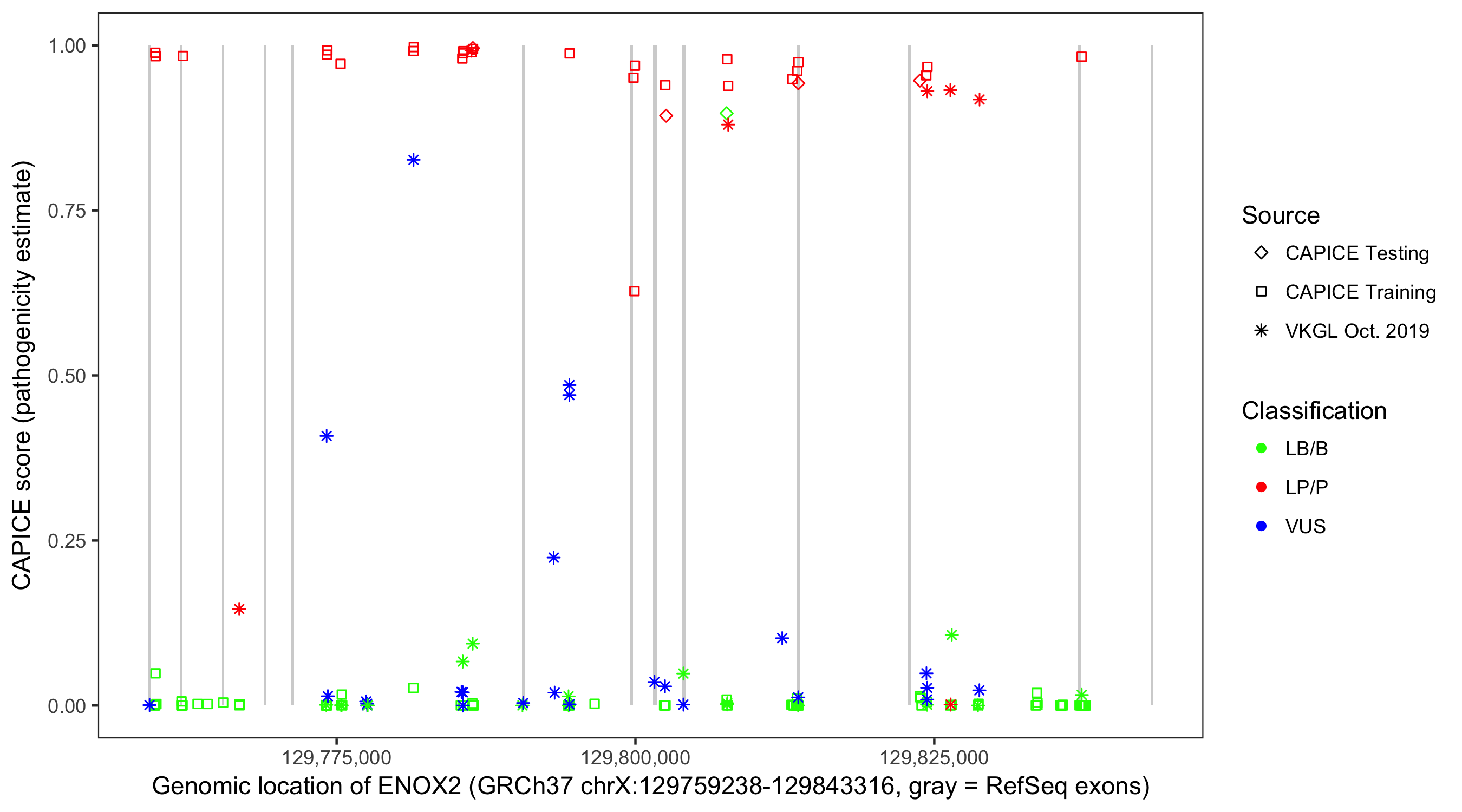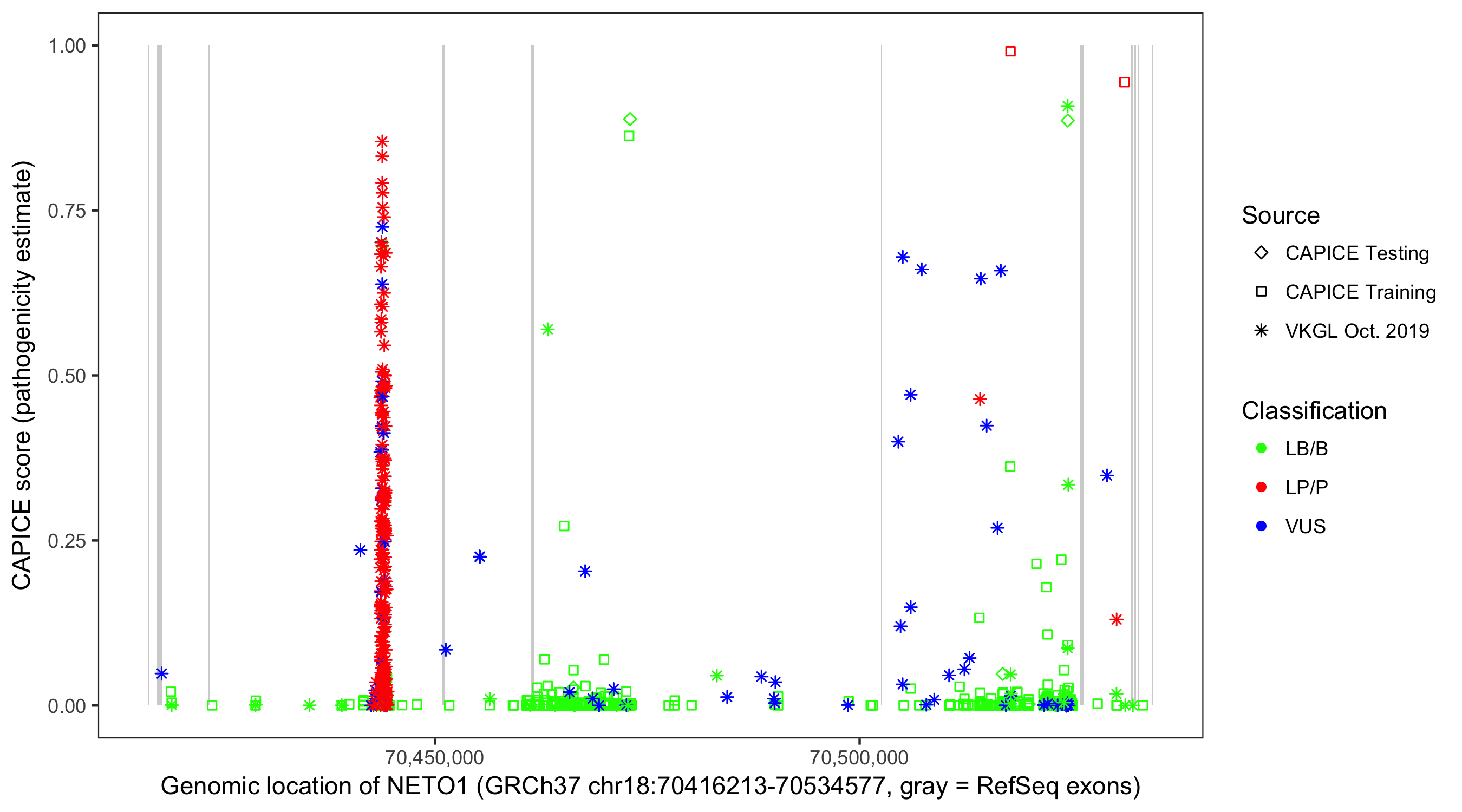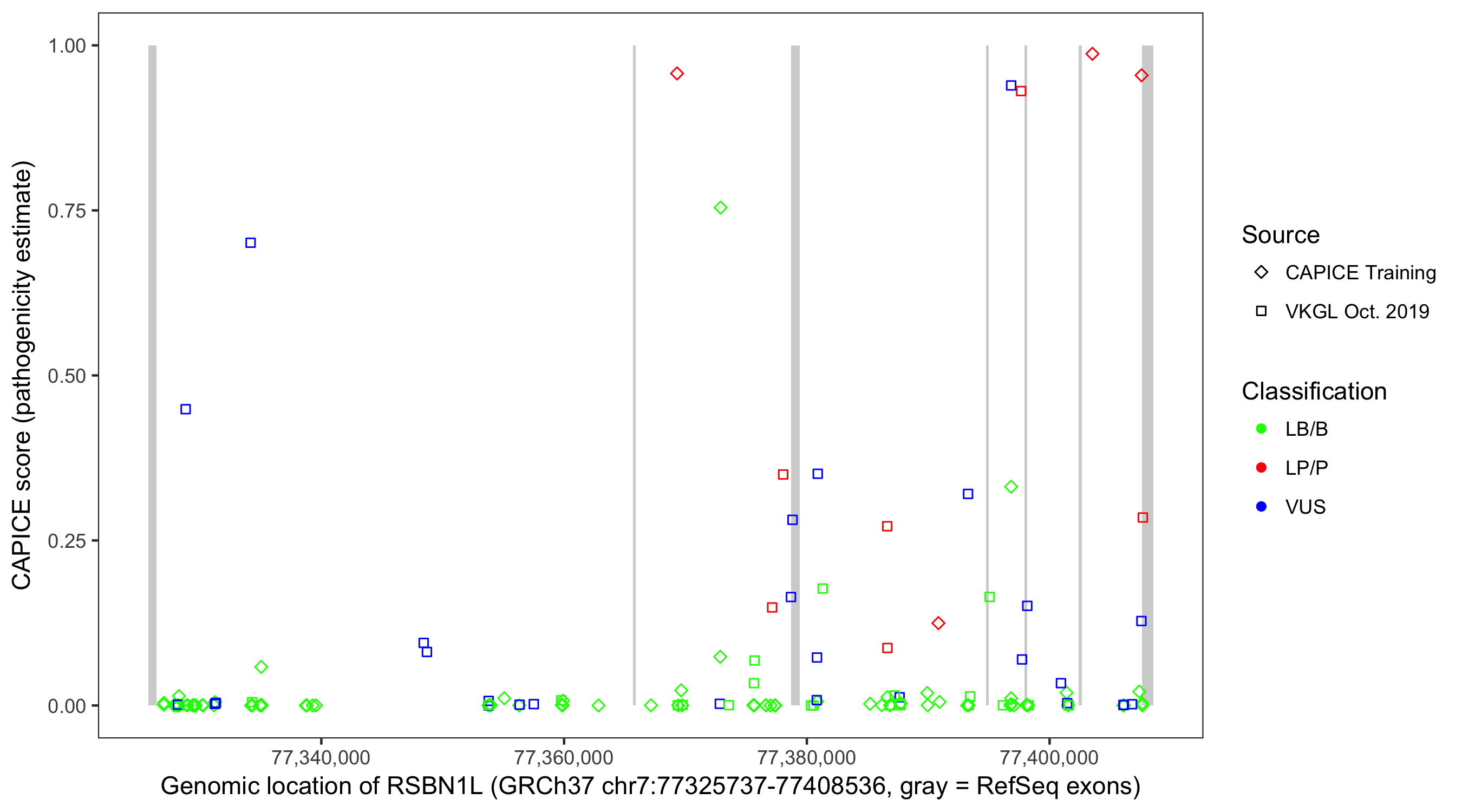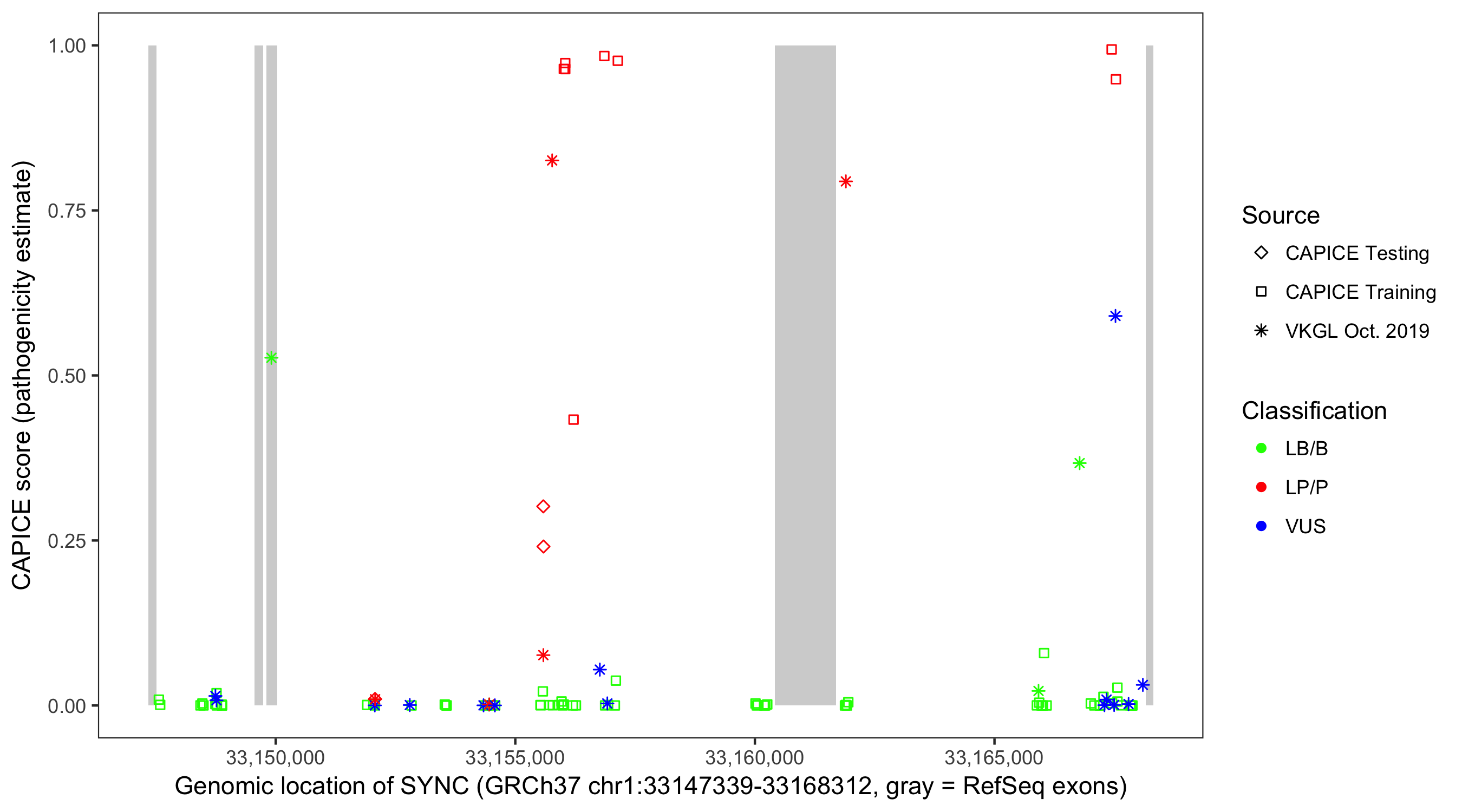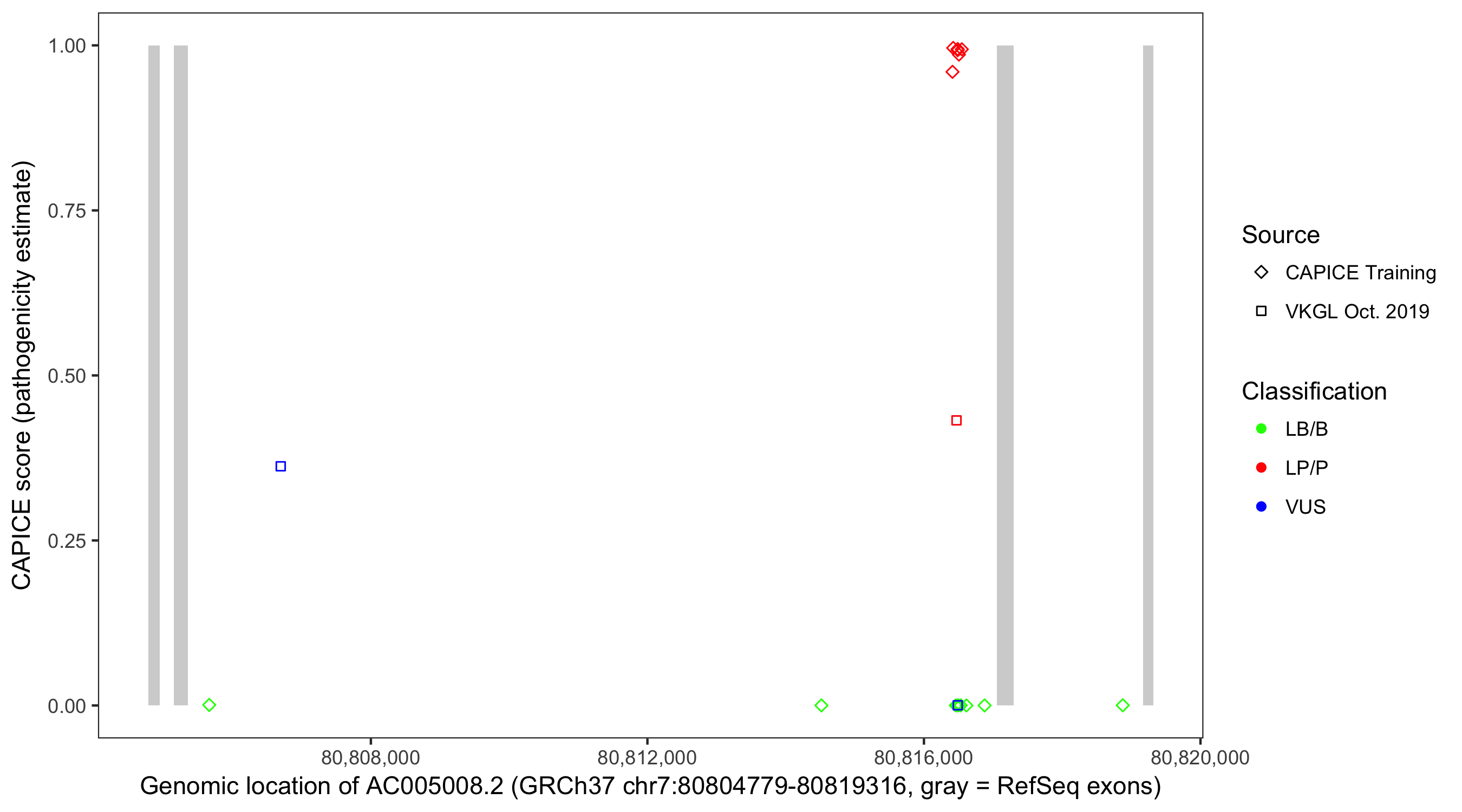 Shown are CAPICE train/test variants plus VKGL Oct 2019.