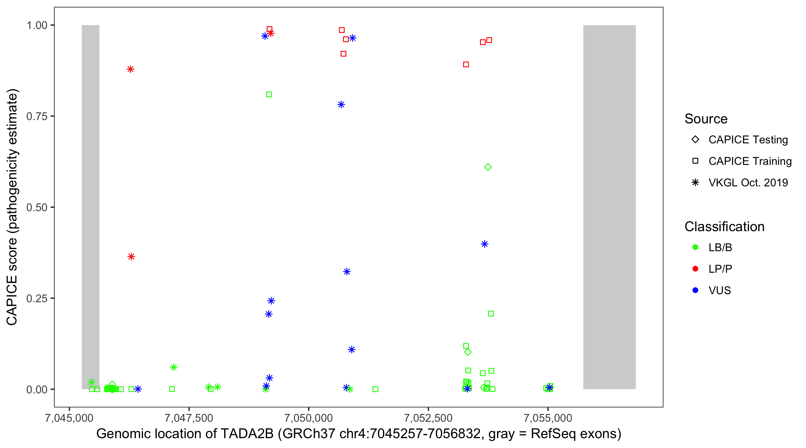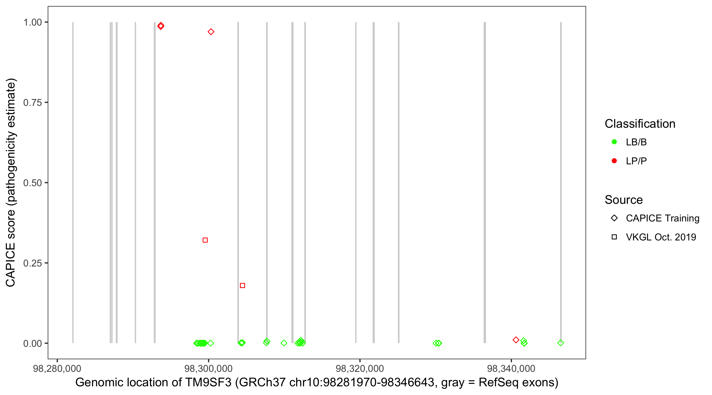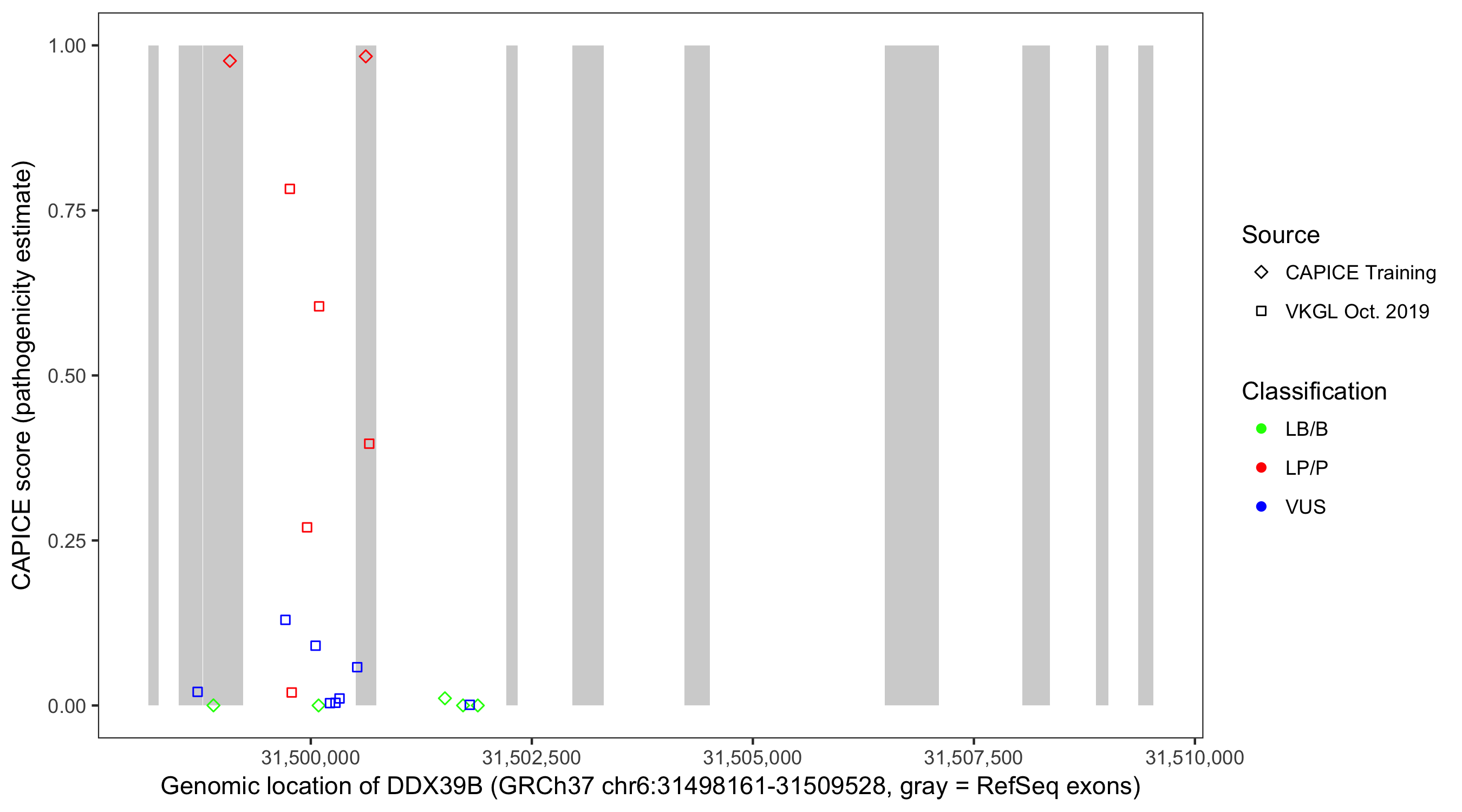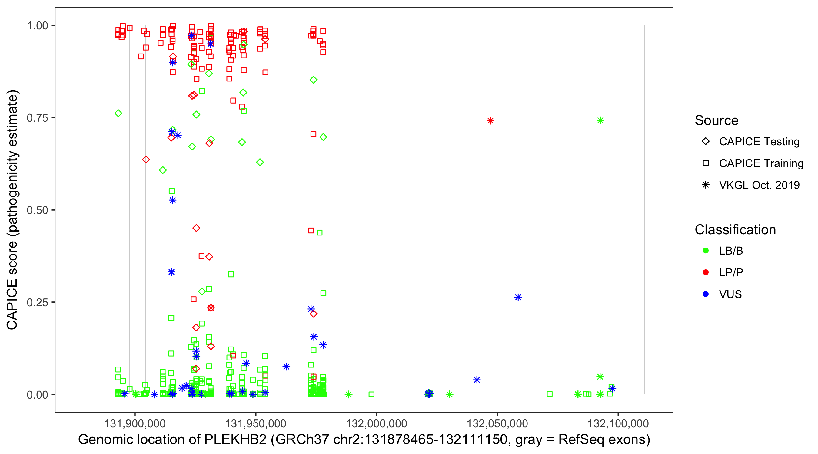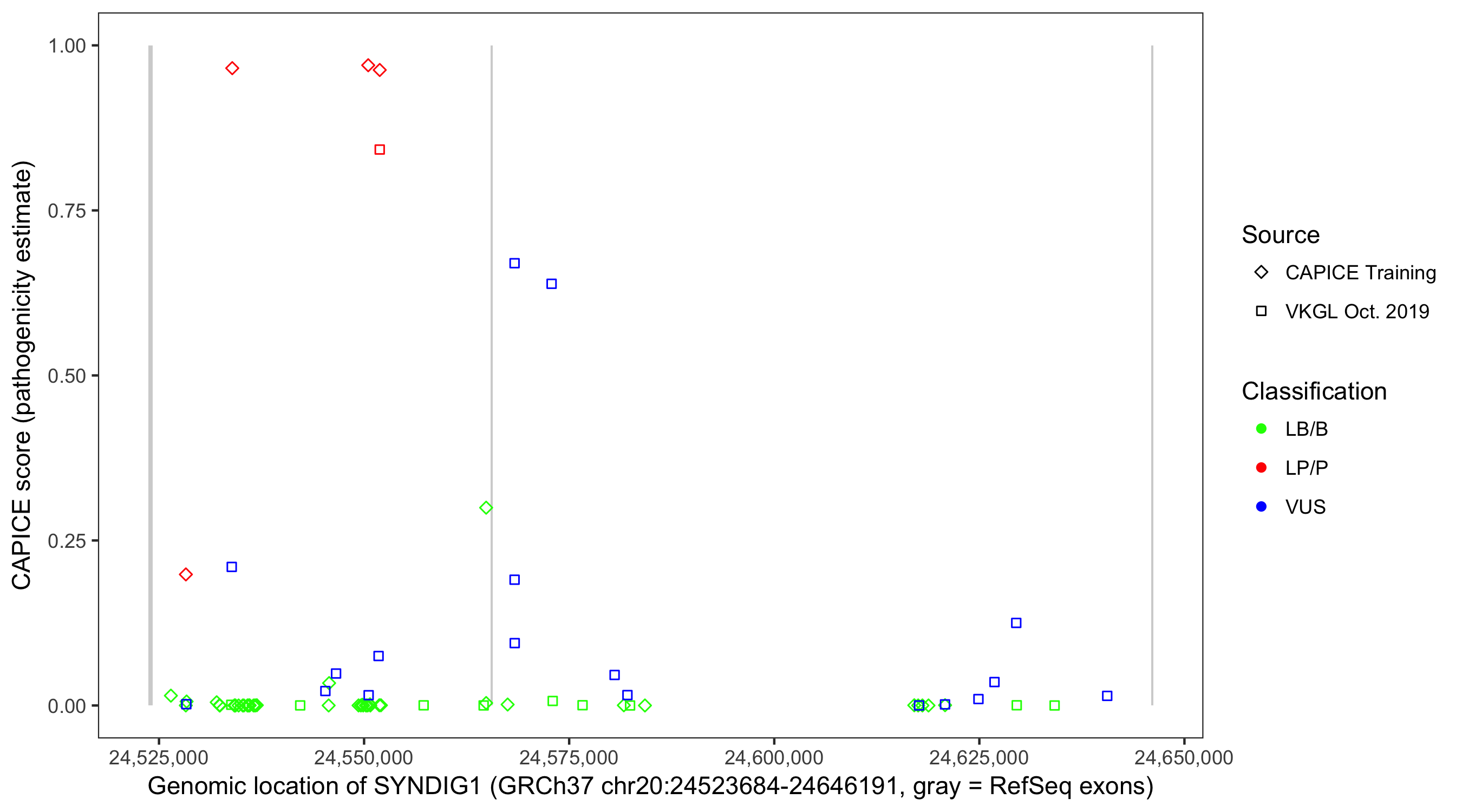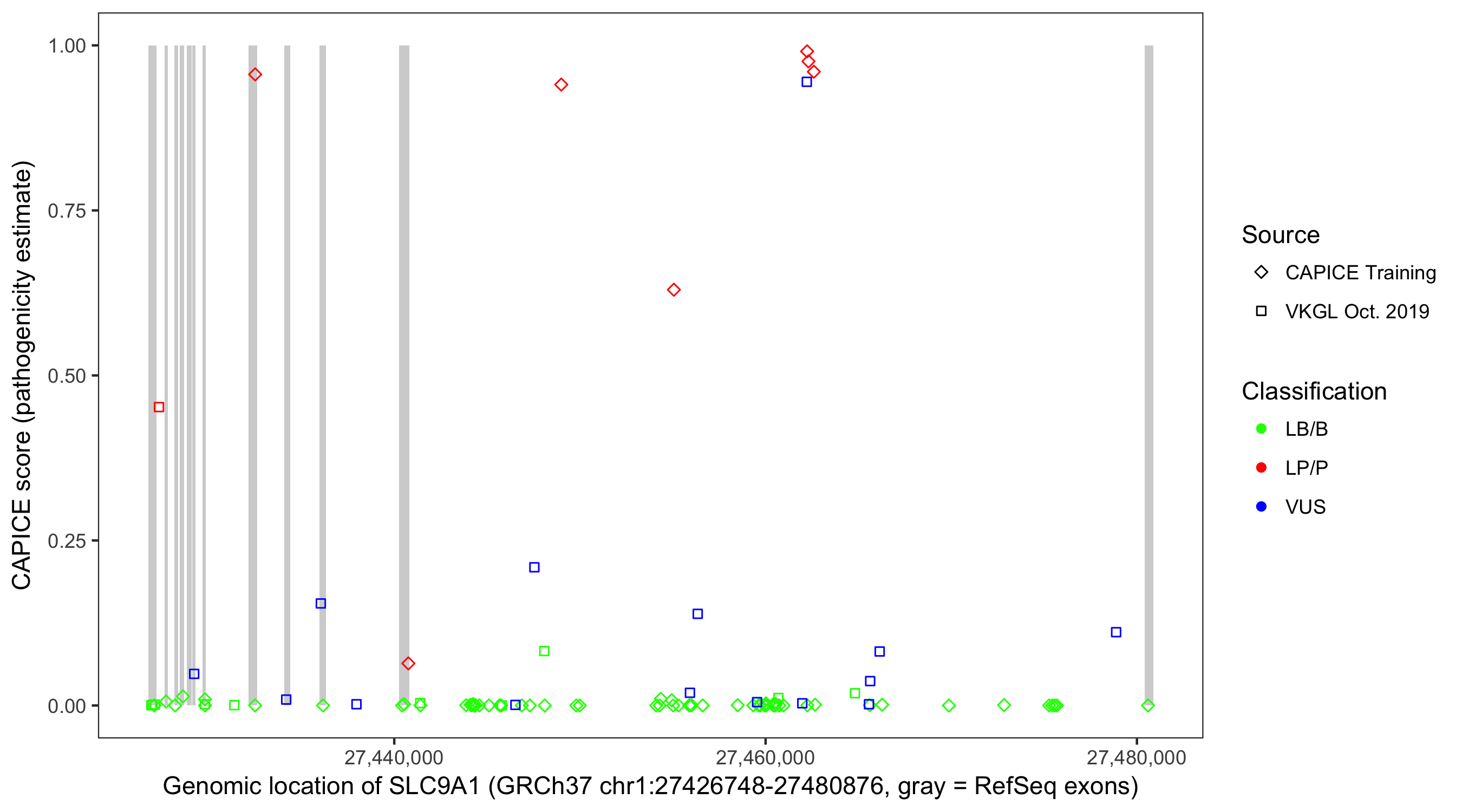 Shown are CAPICE train/test variants plus VKGL Oct 2019.