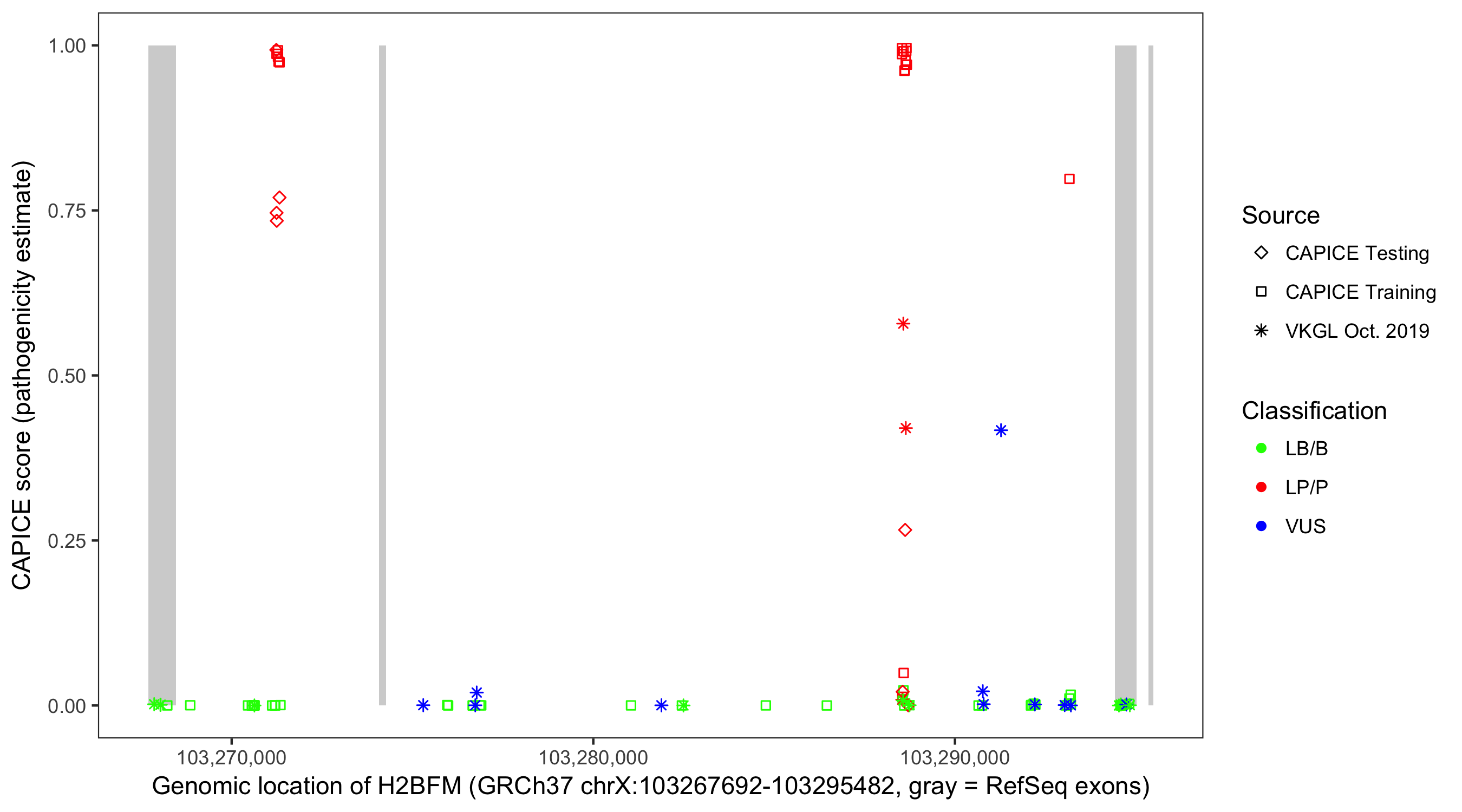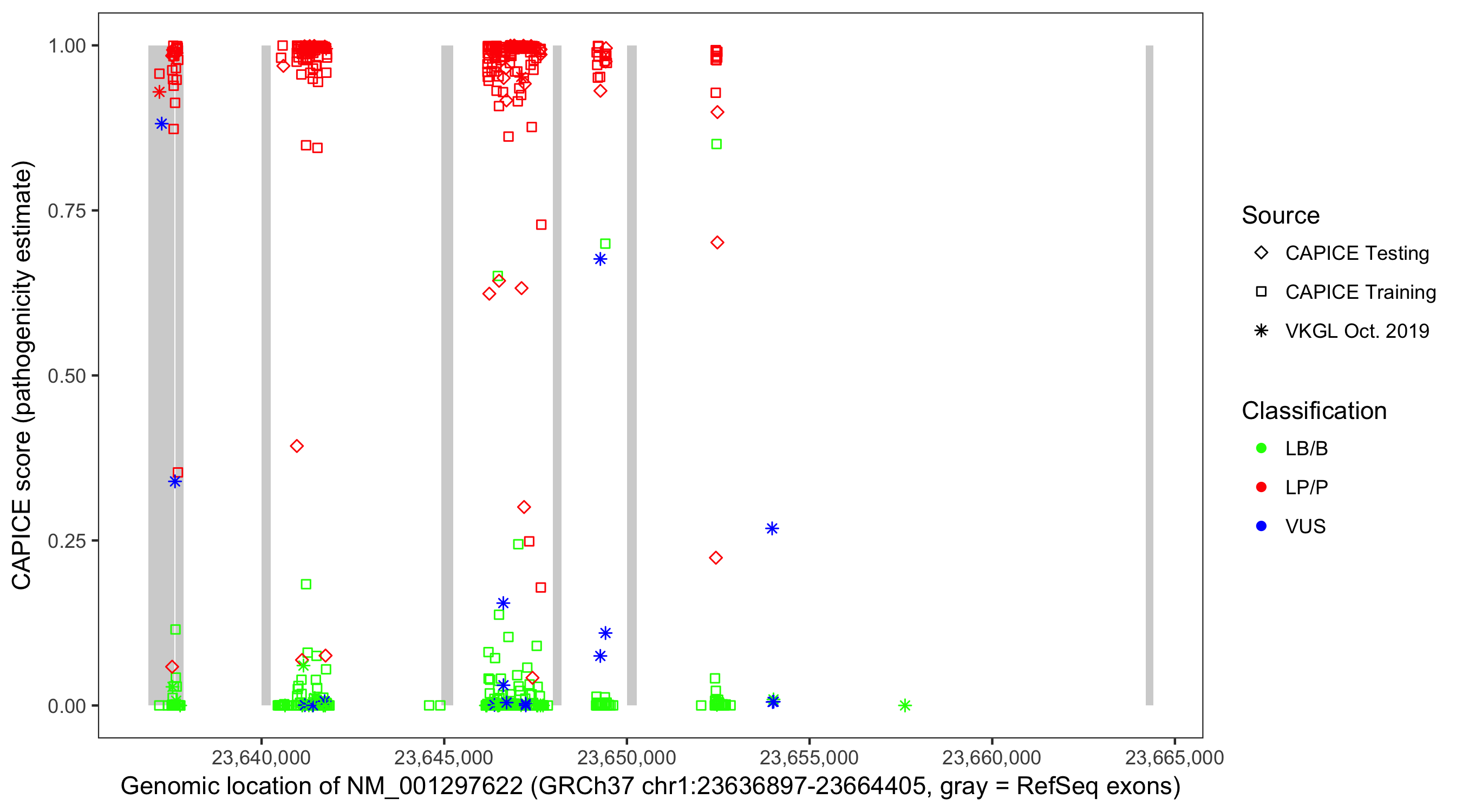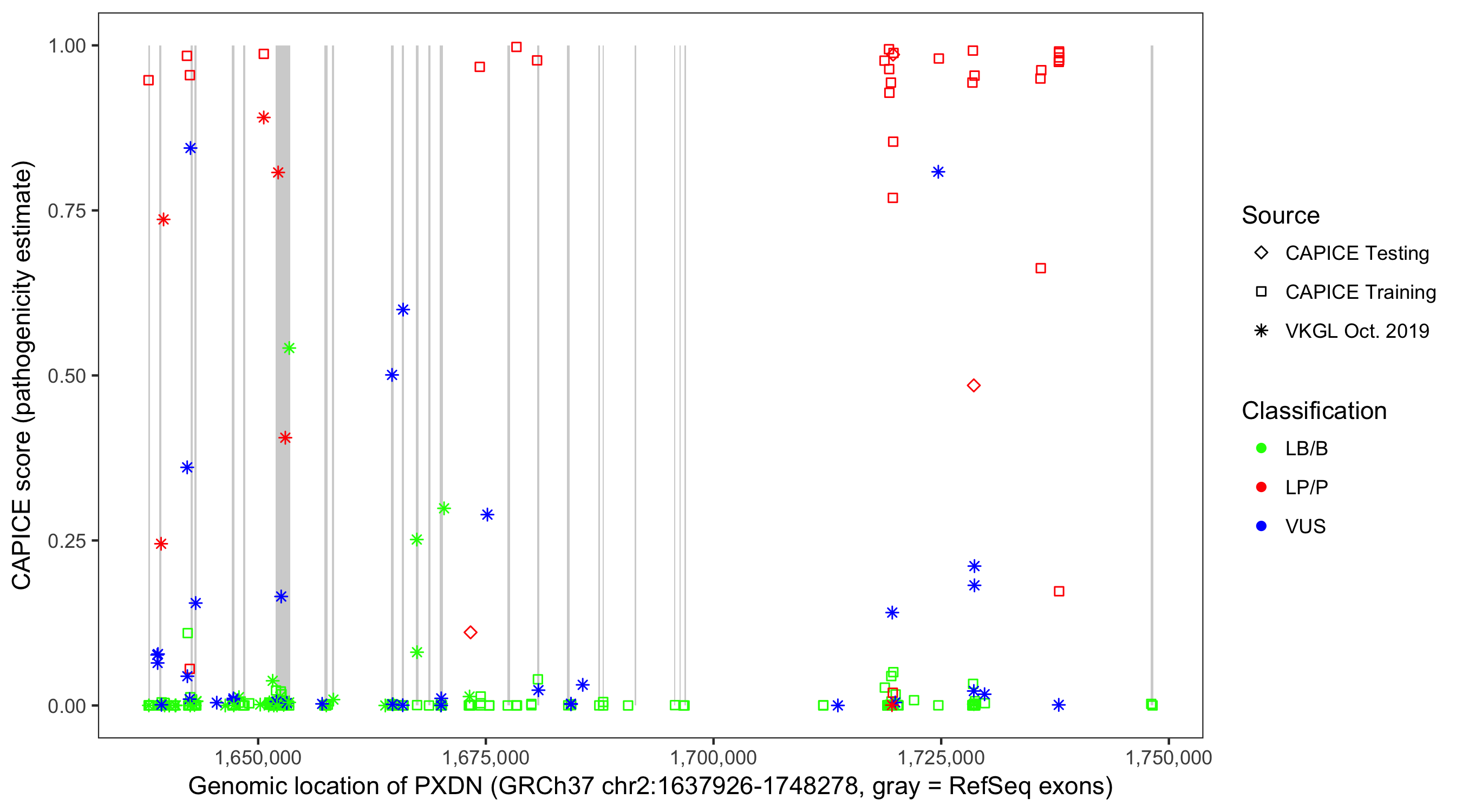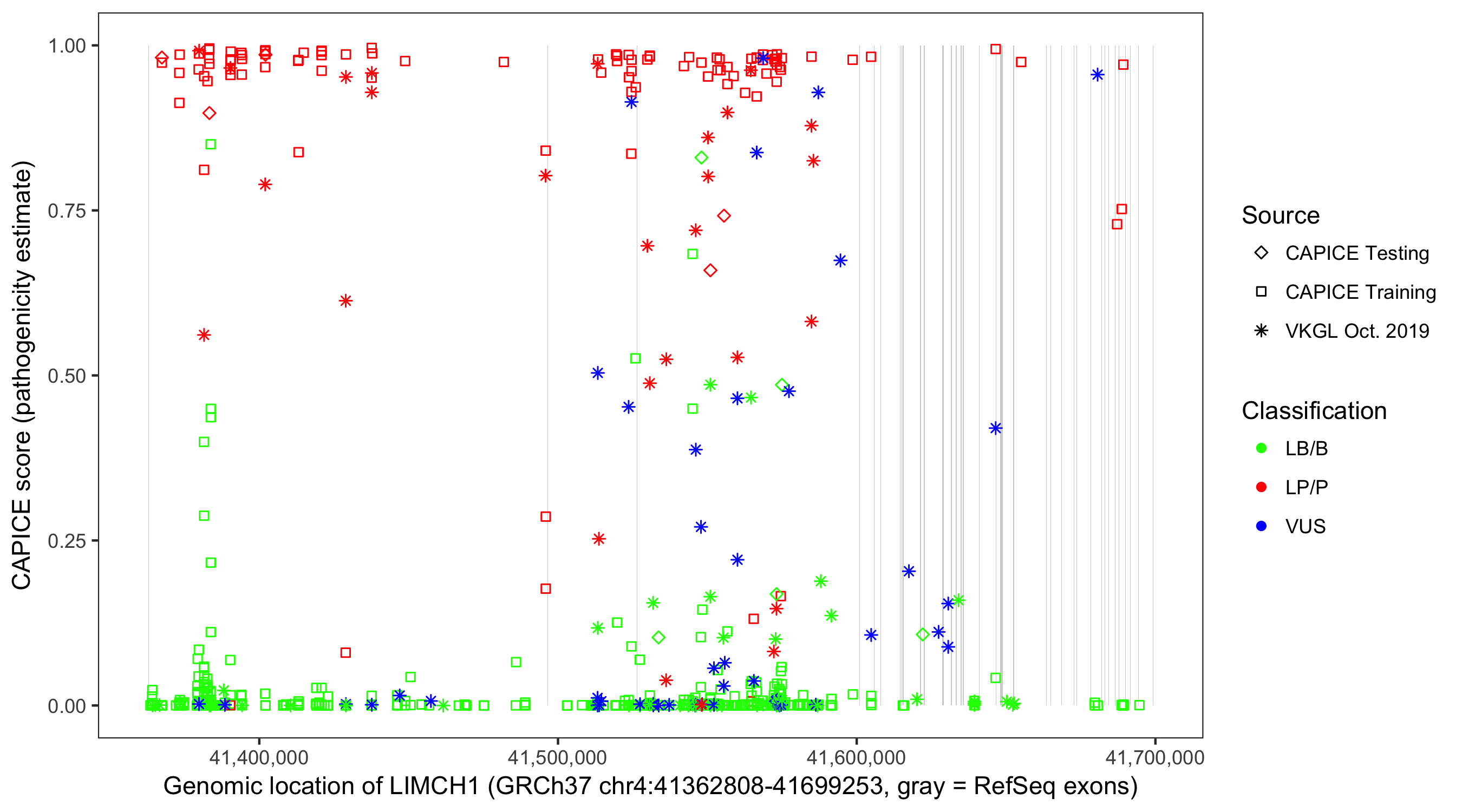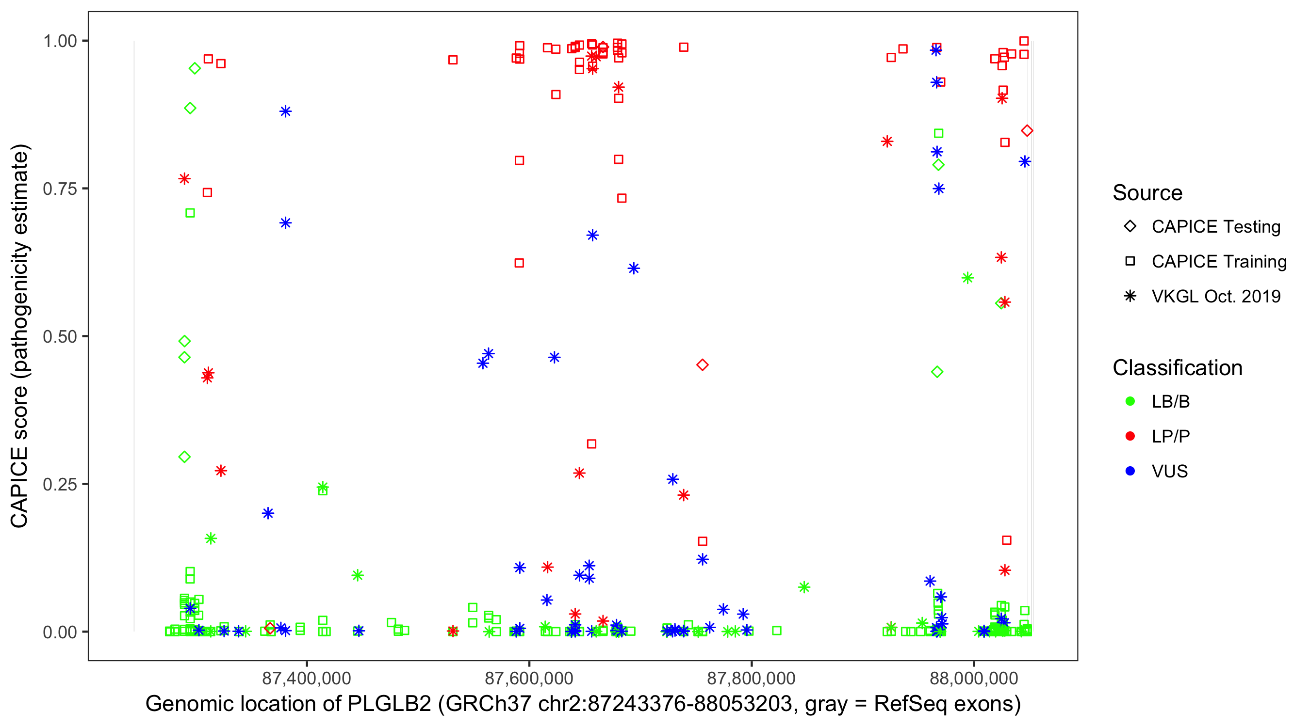 Shown are CAPICE train/test variants plus VKGL Oct 2019.