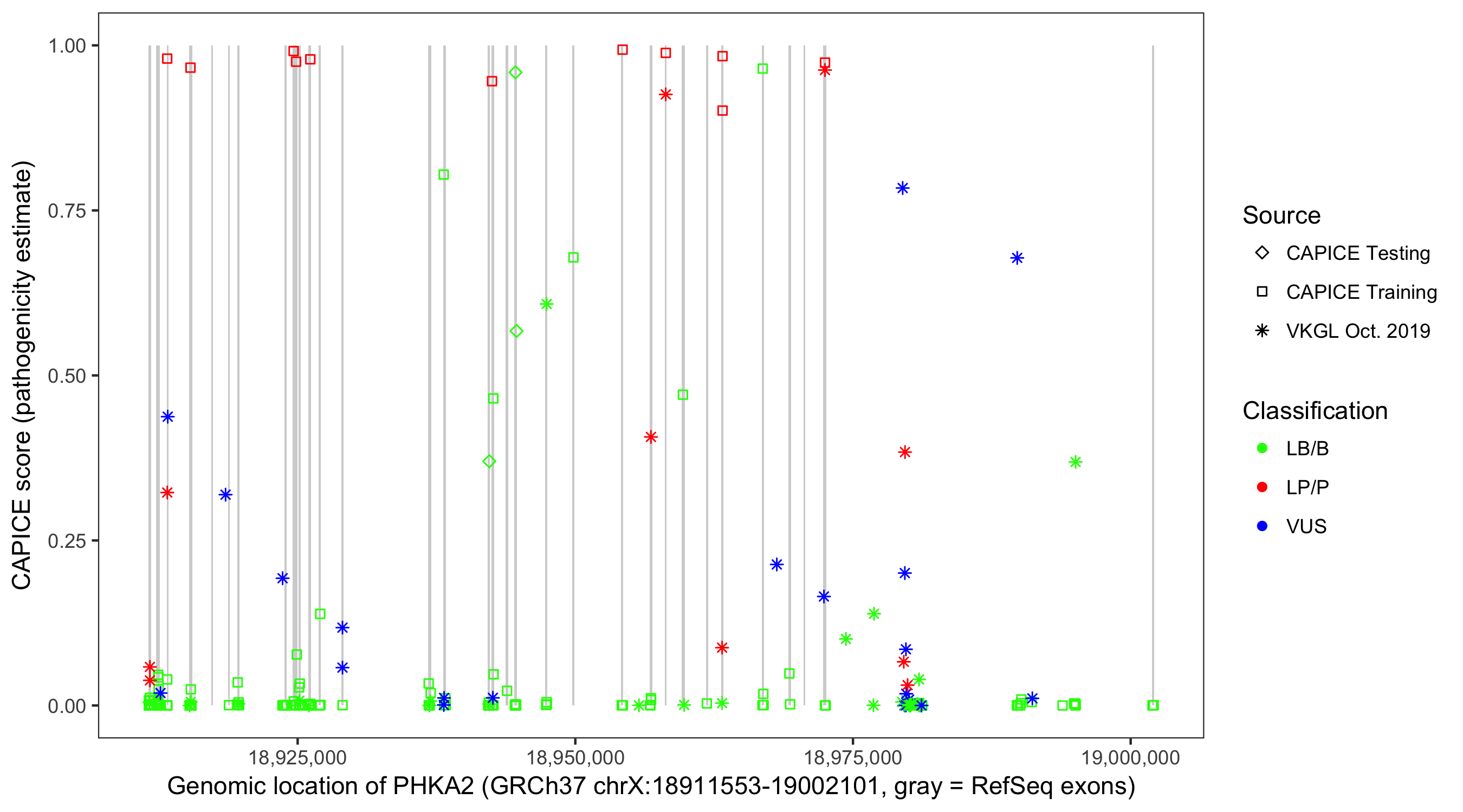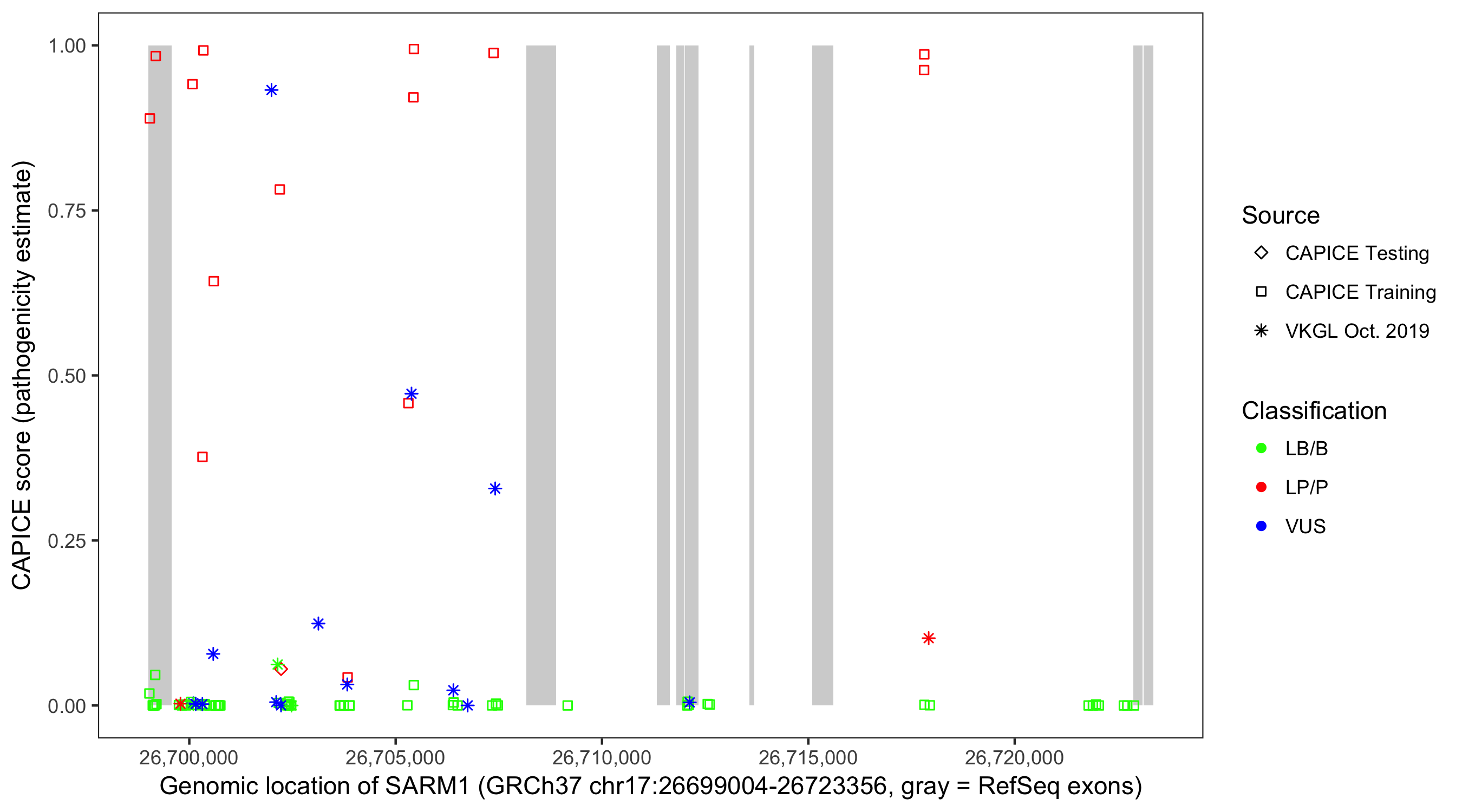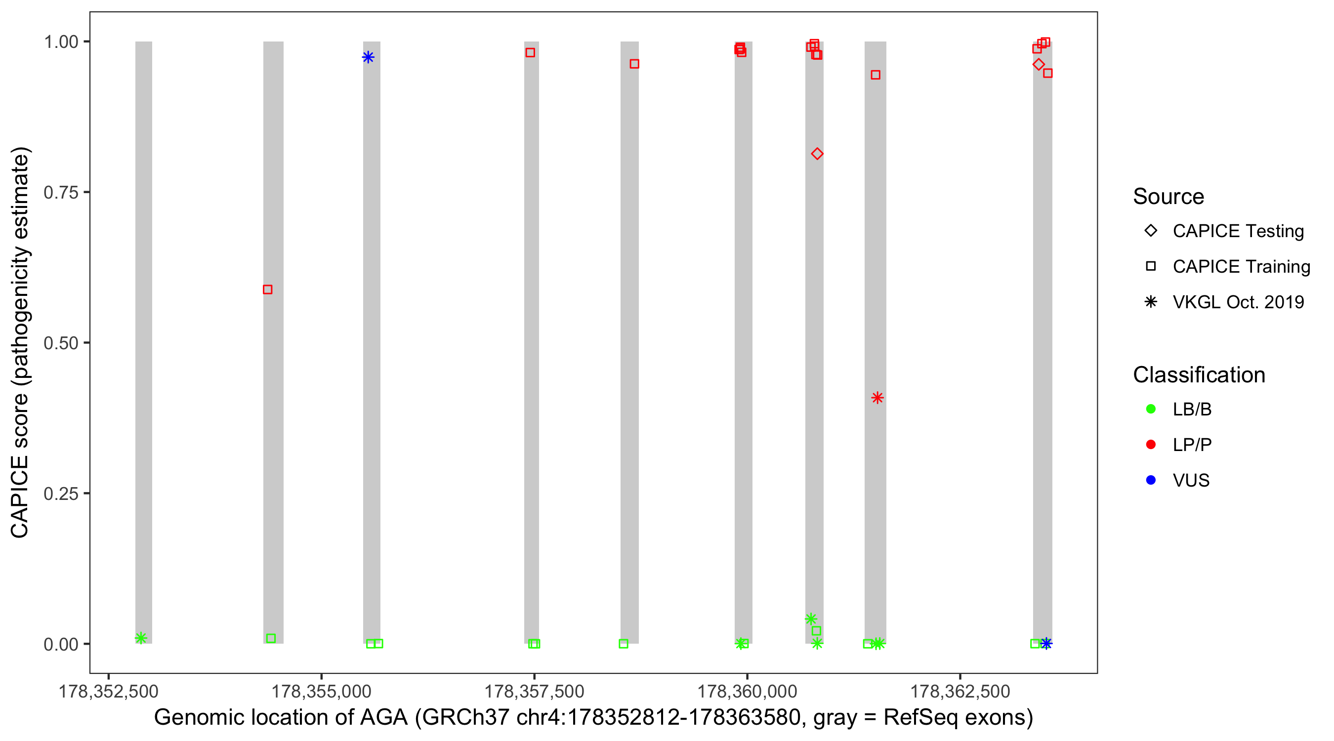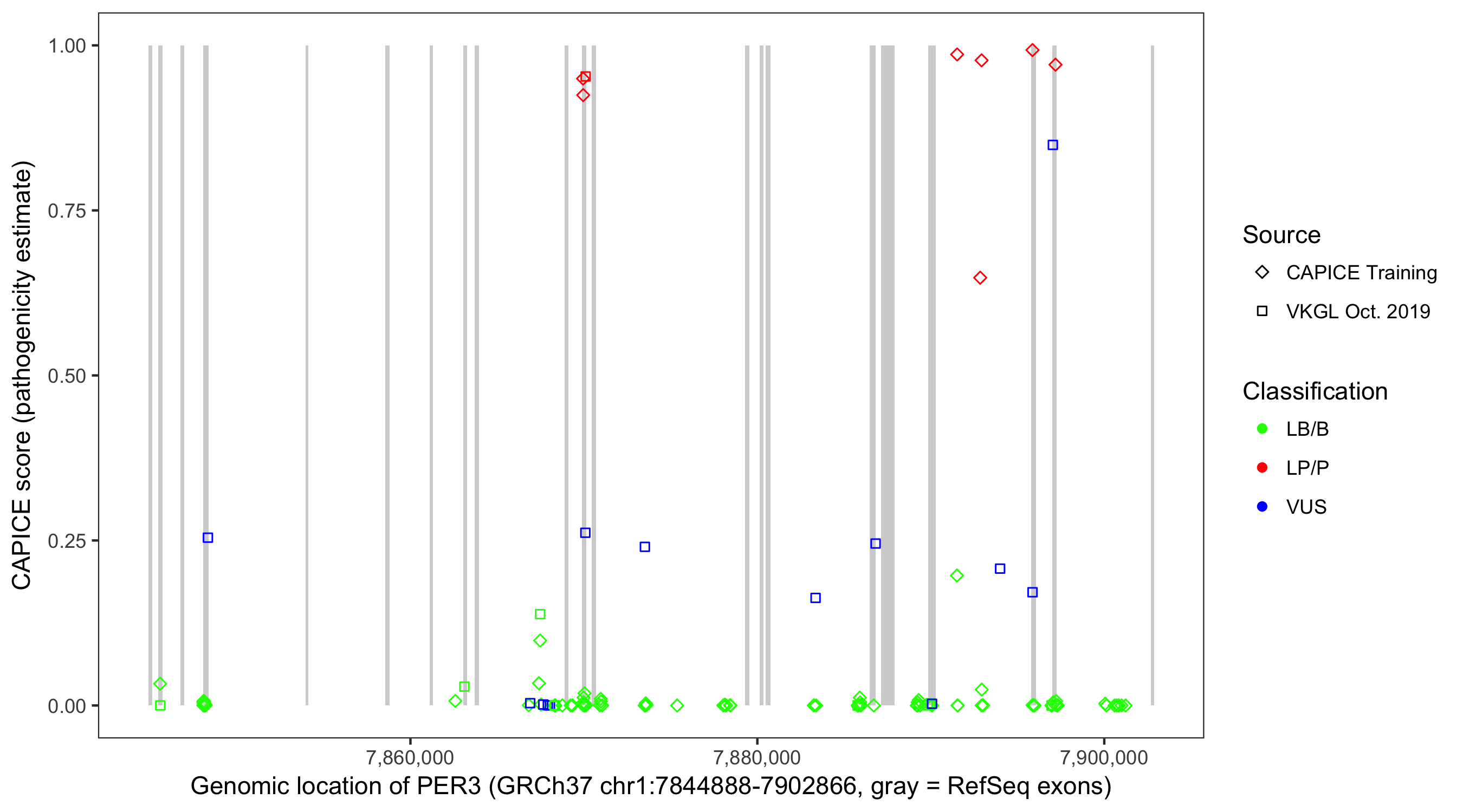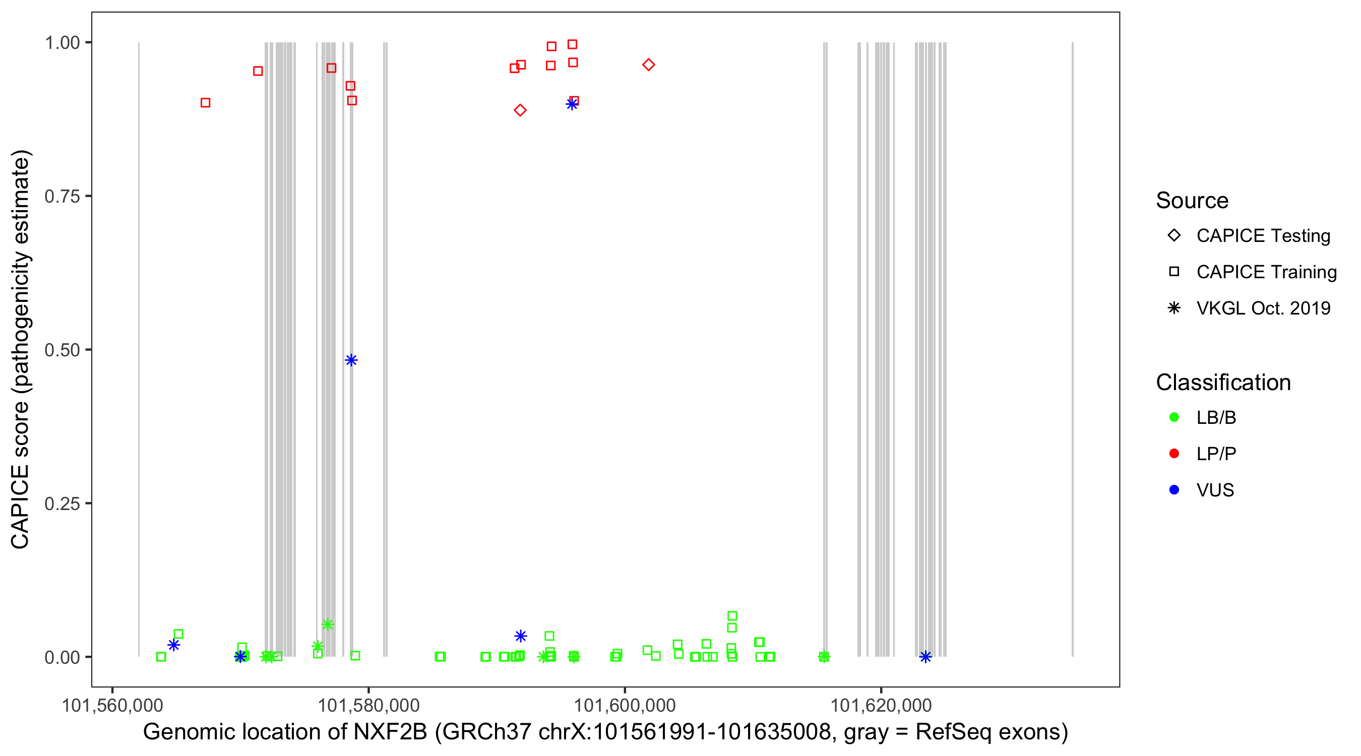 Shown are CAPICE train/test variants plus VKGL Oct 2019.