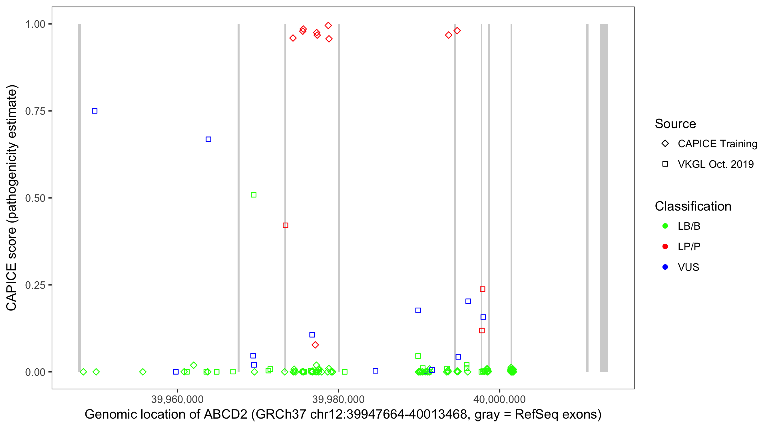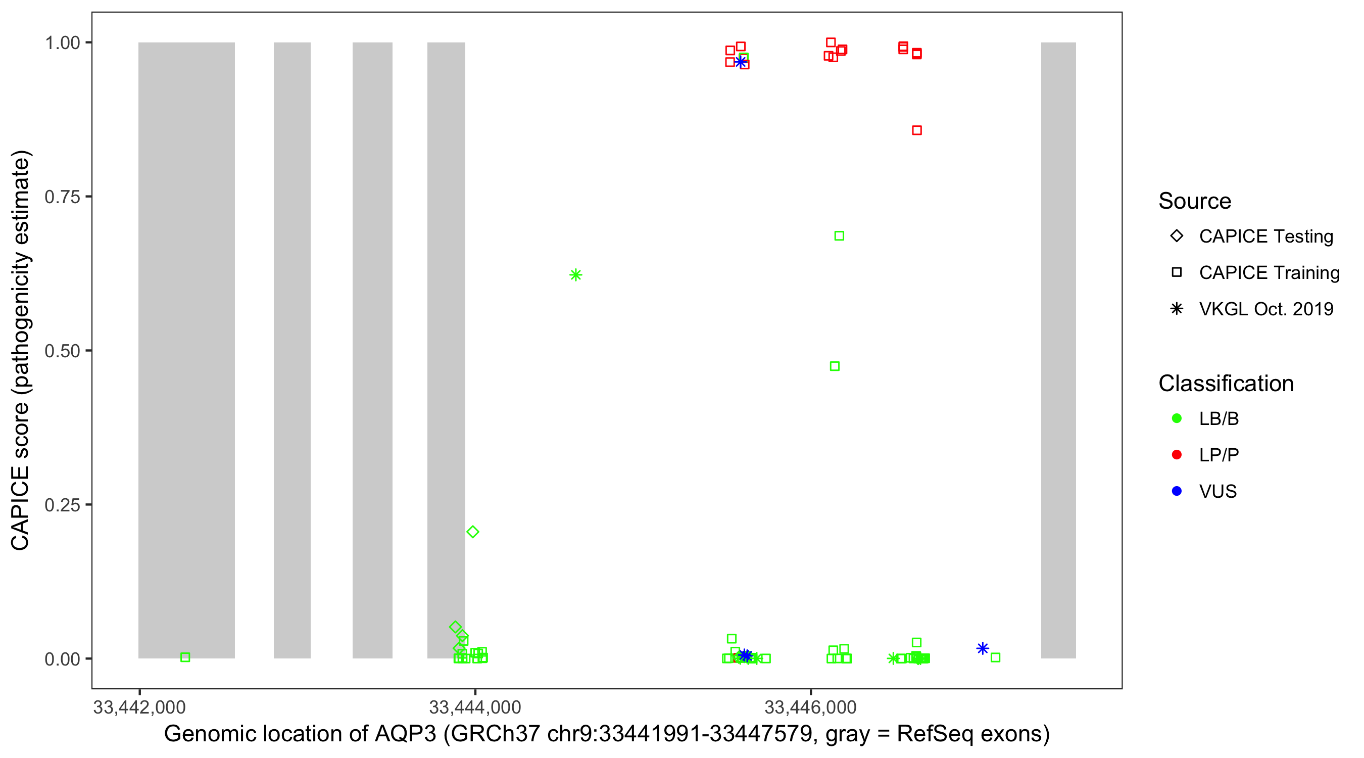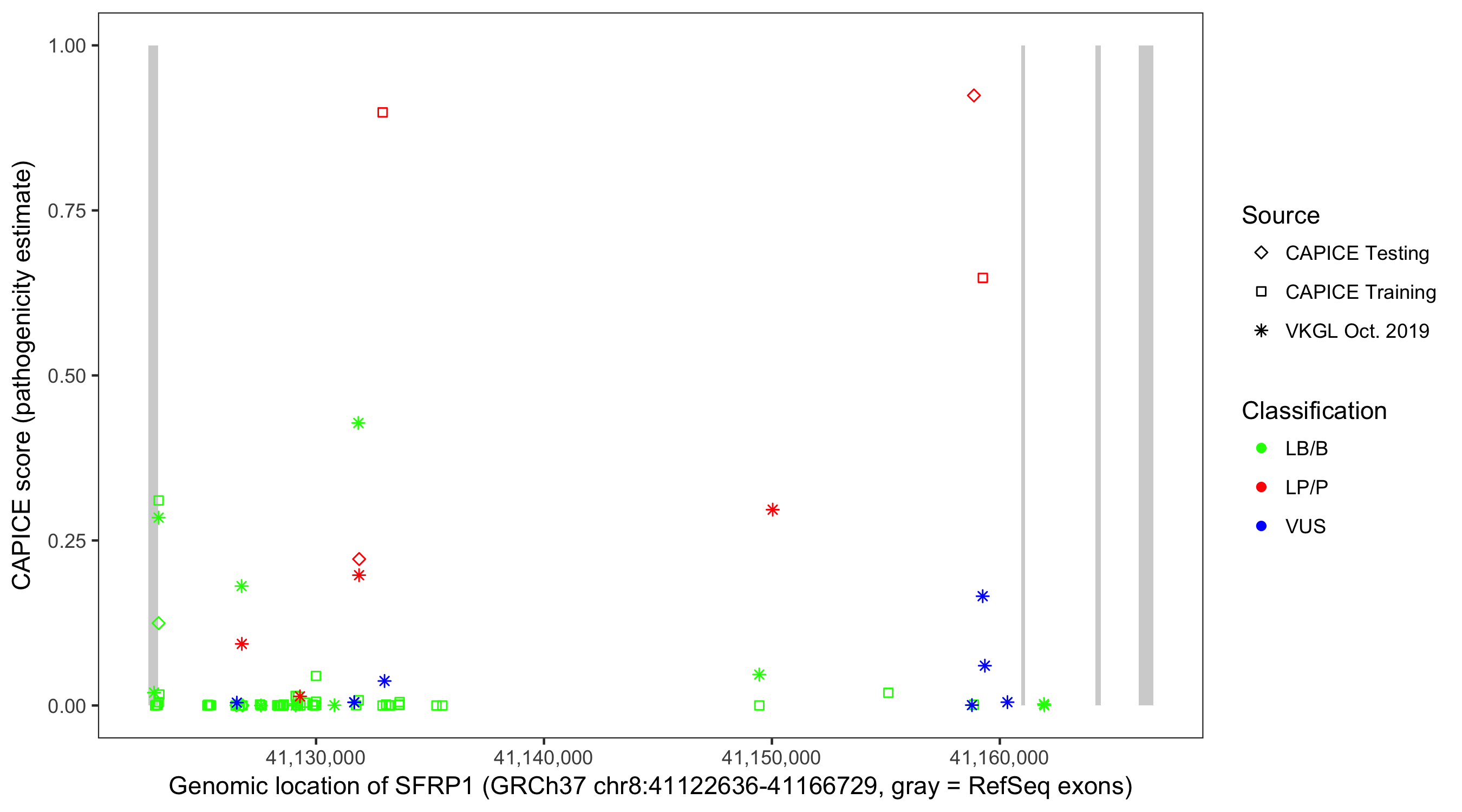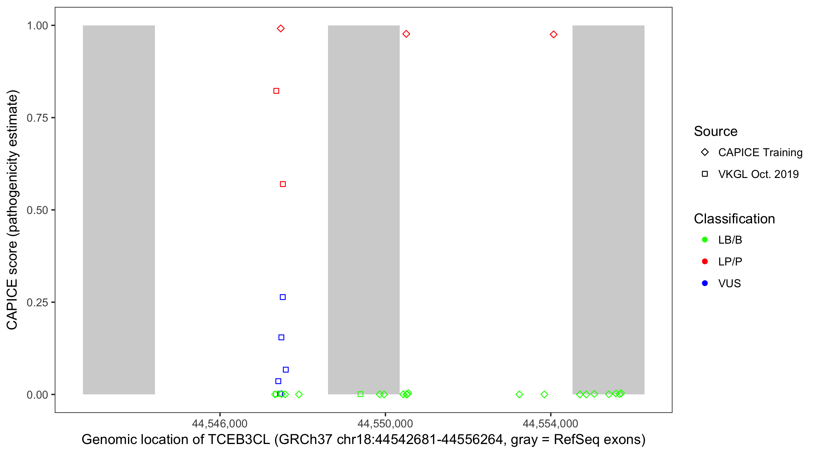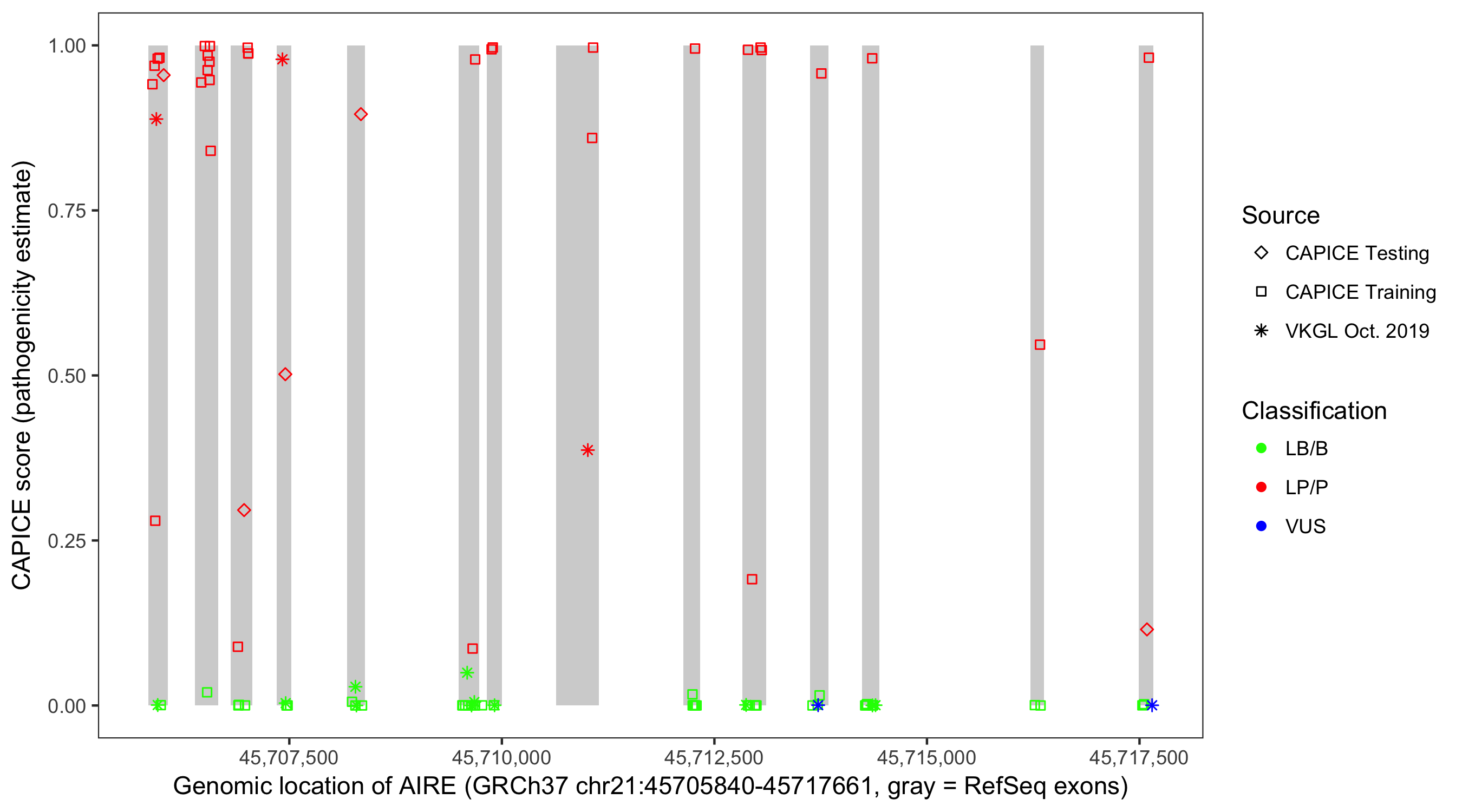 Shown are CAPICE train/test variants plus VKGL Oct 2019.