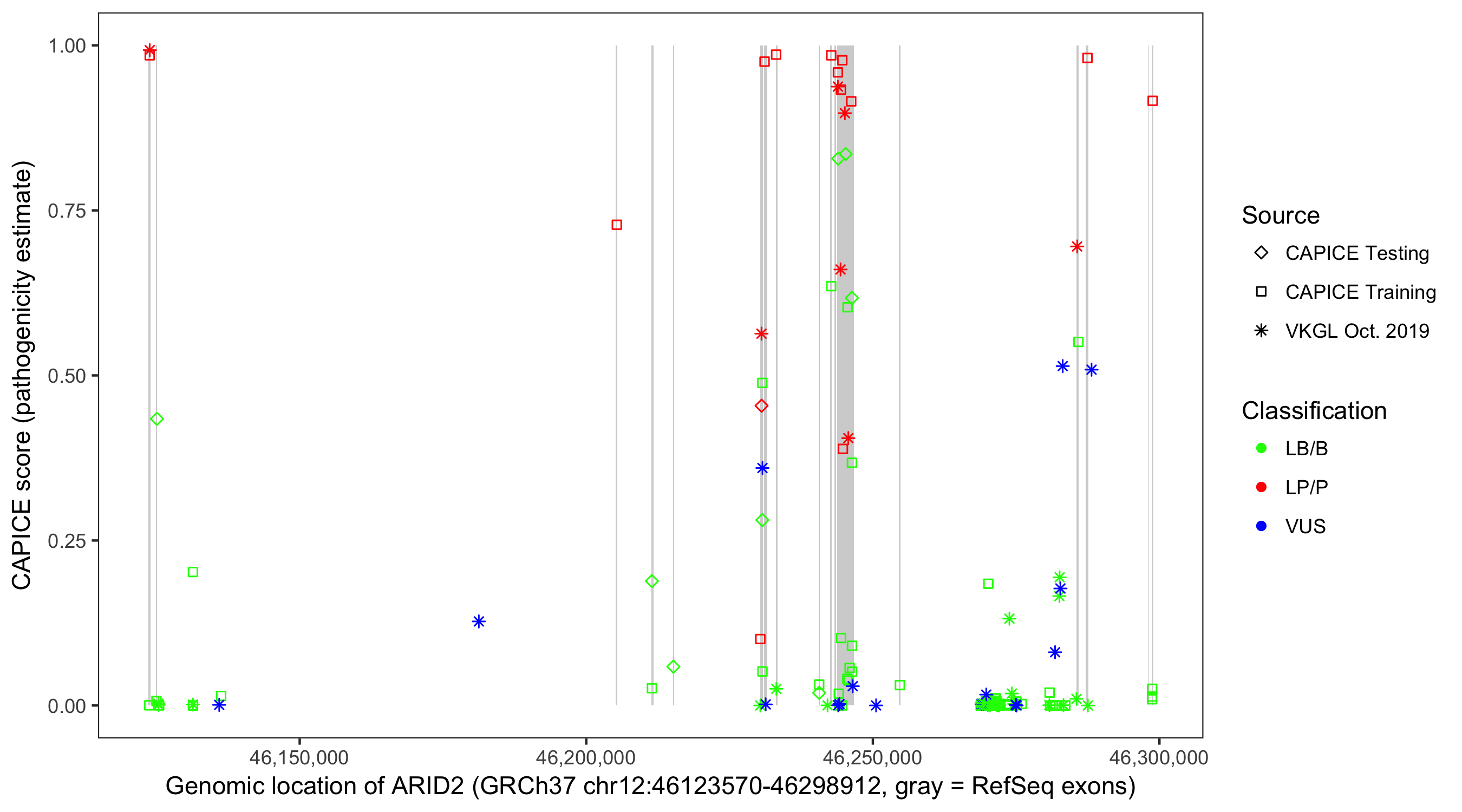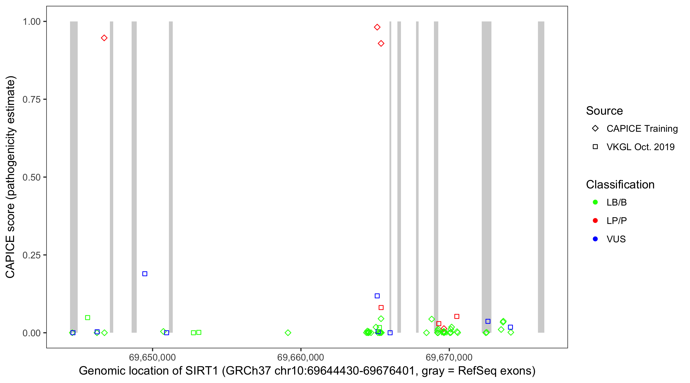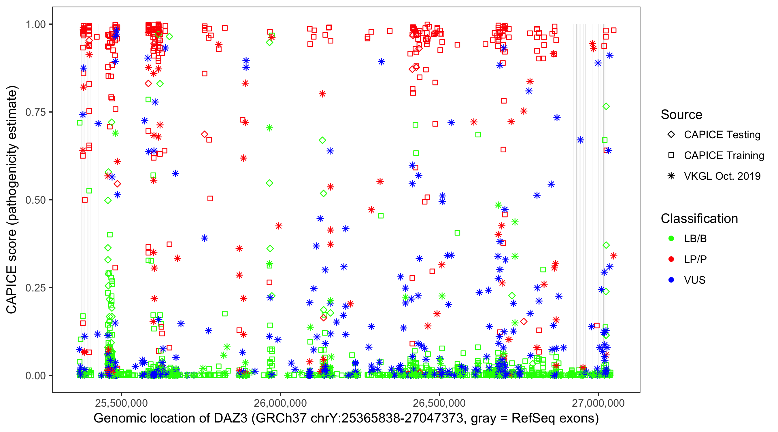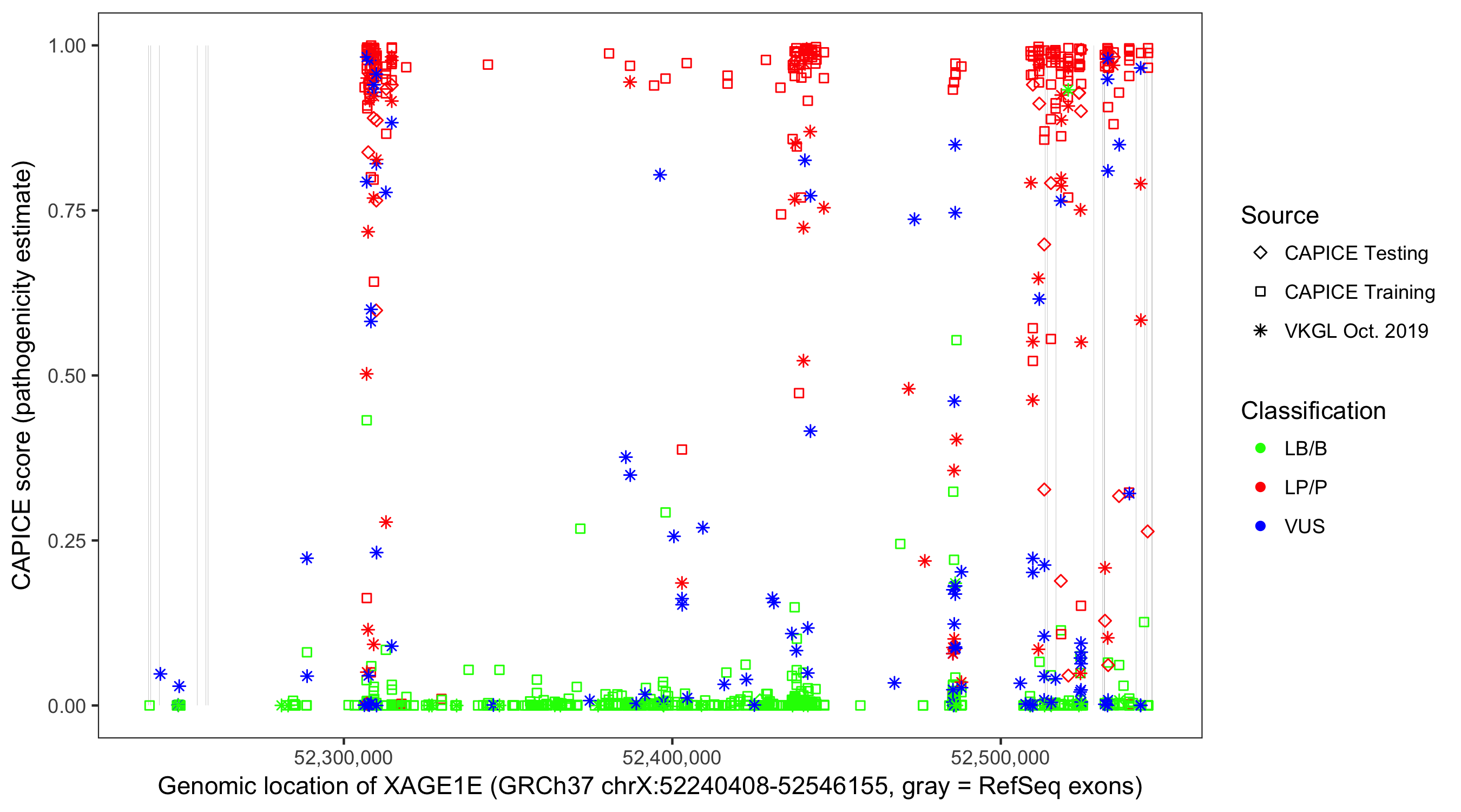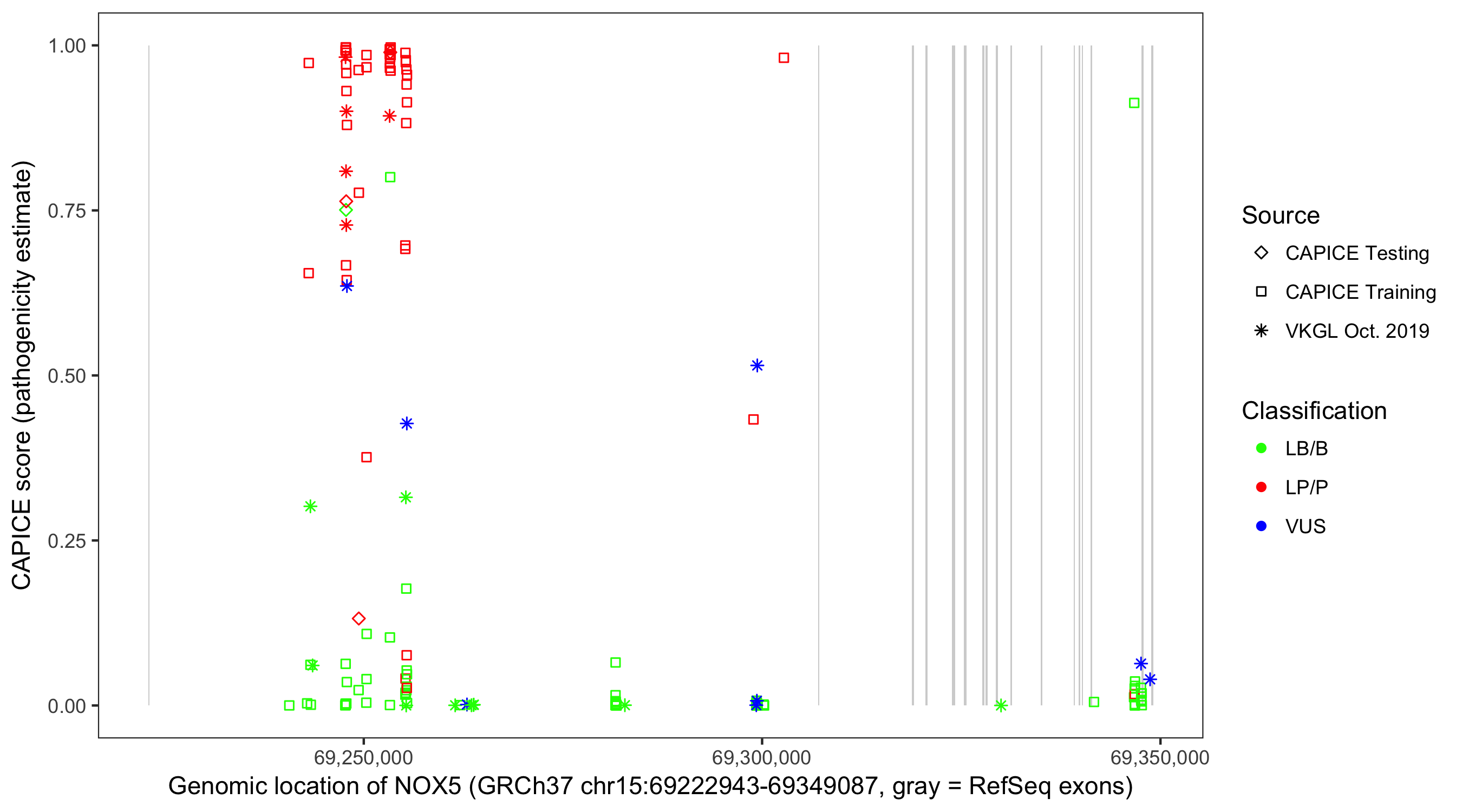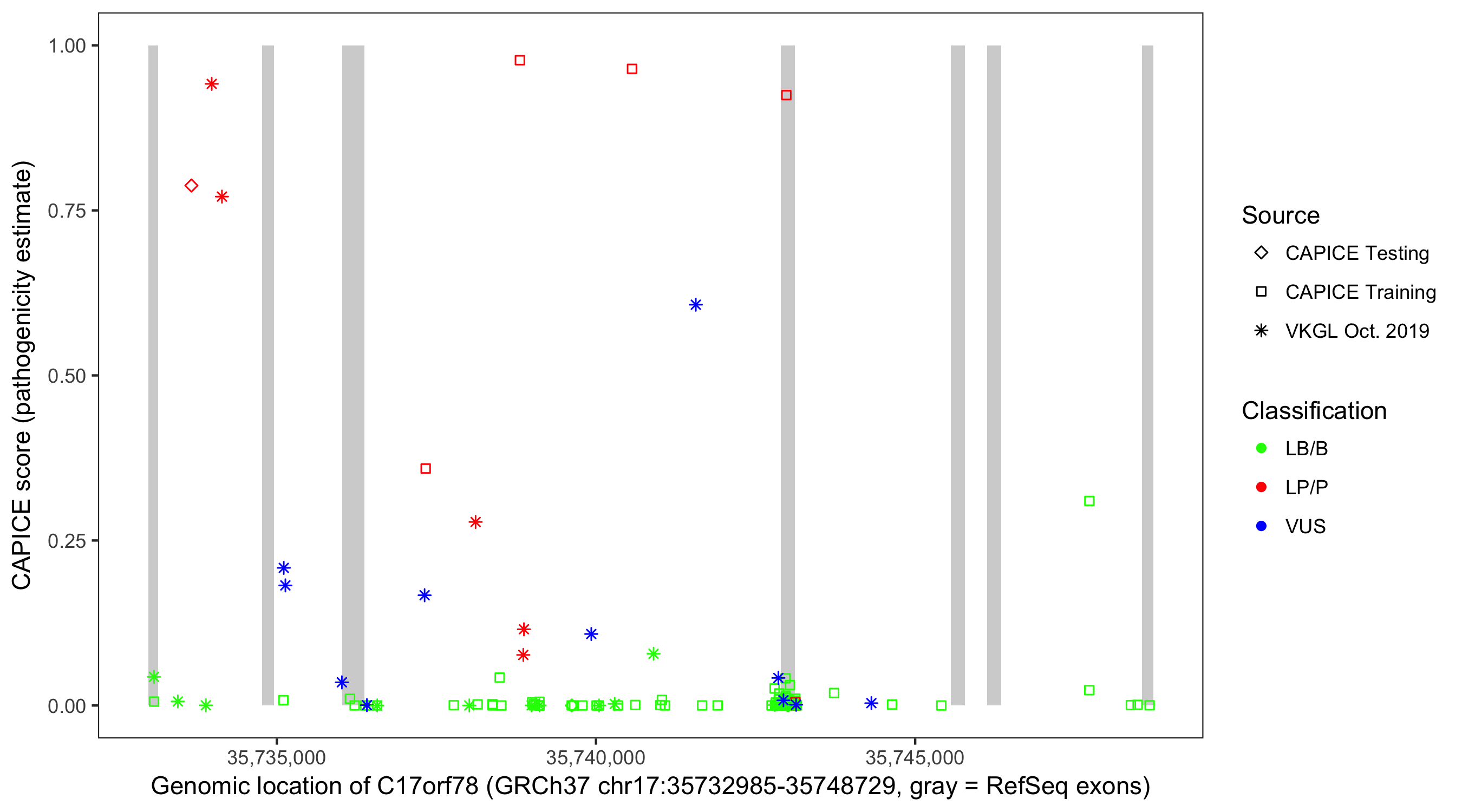Shown are CAPICE train/test variants plus VKGL Oct 2019.
