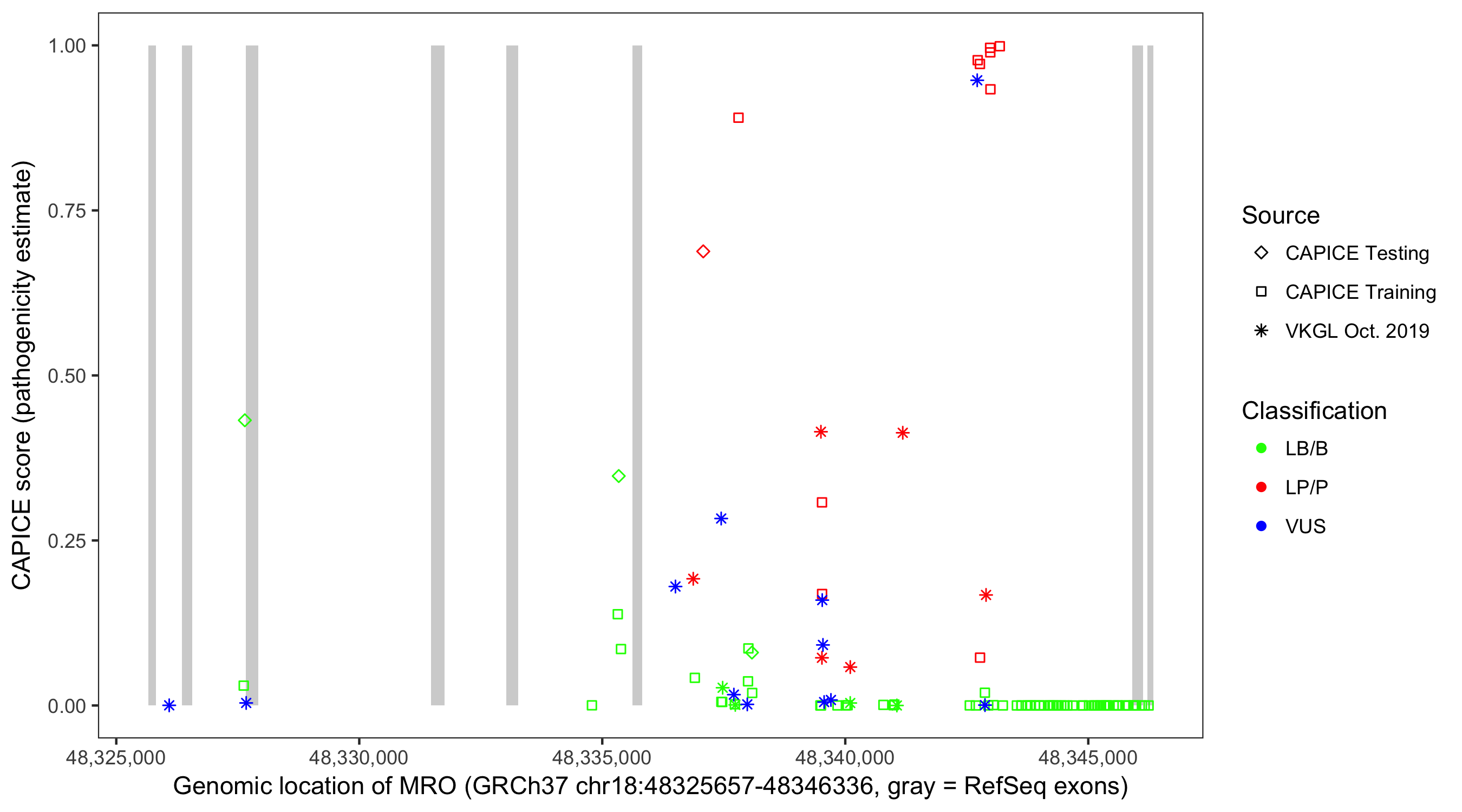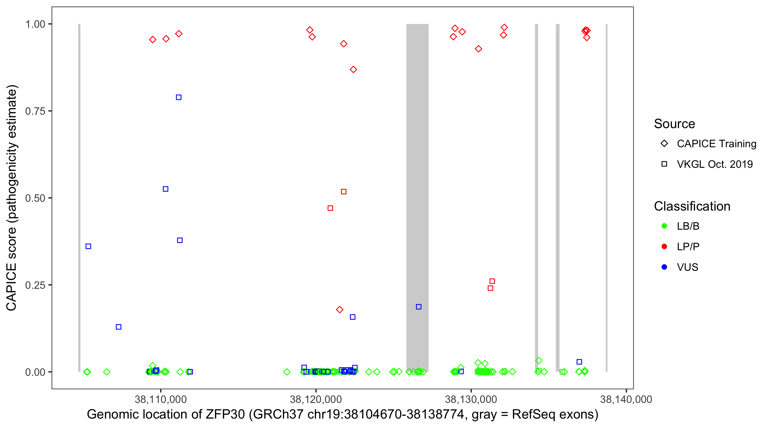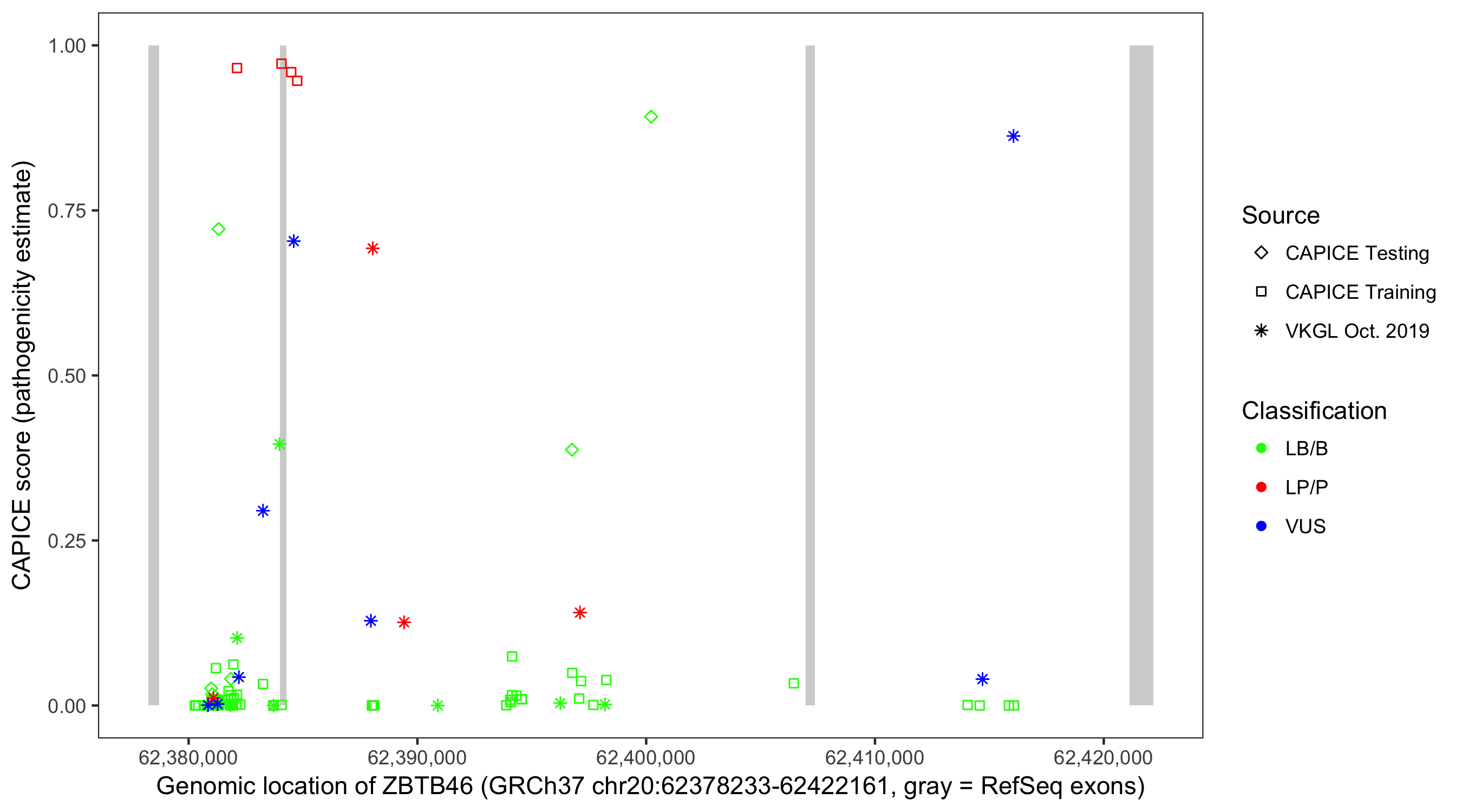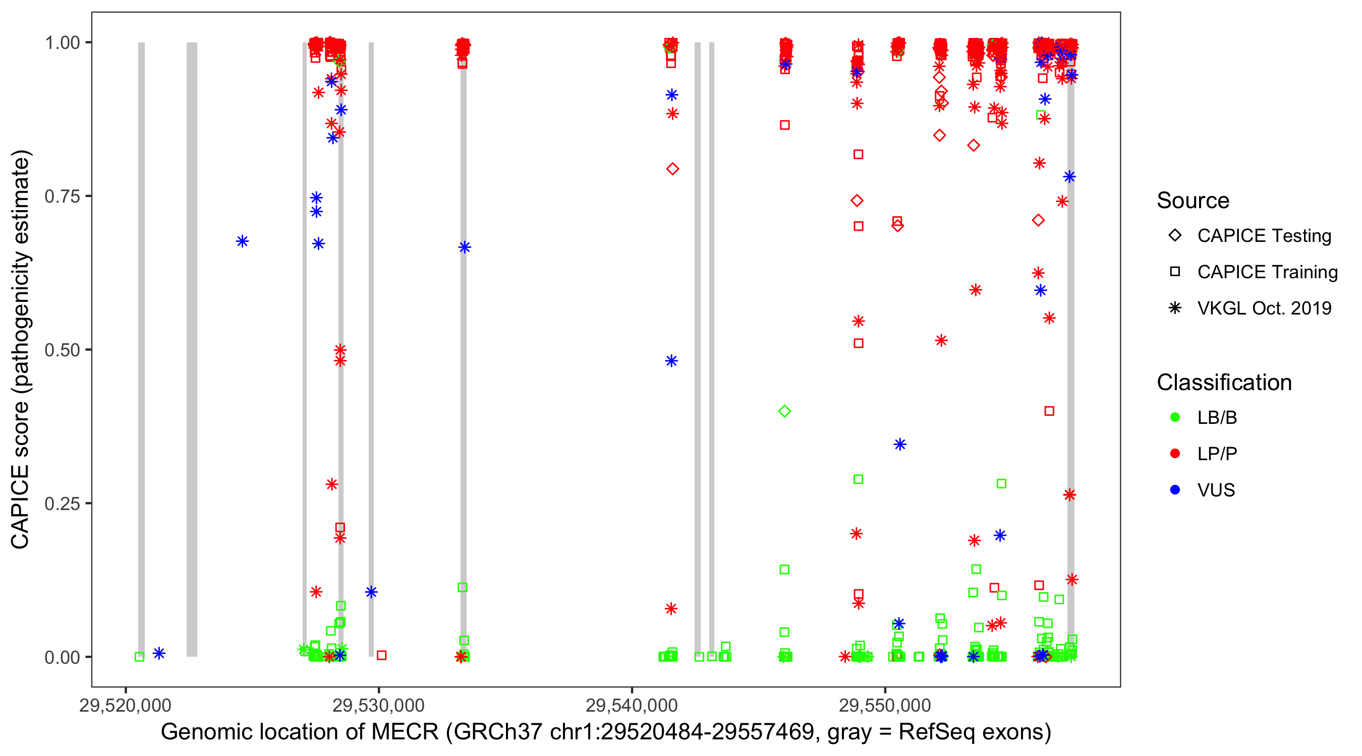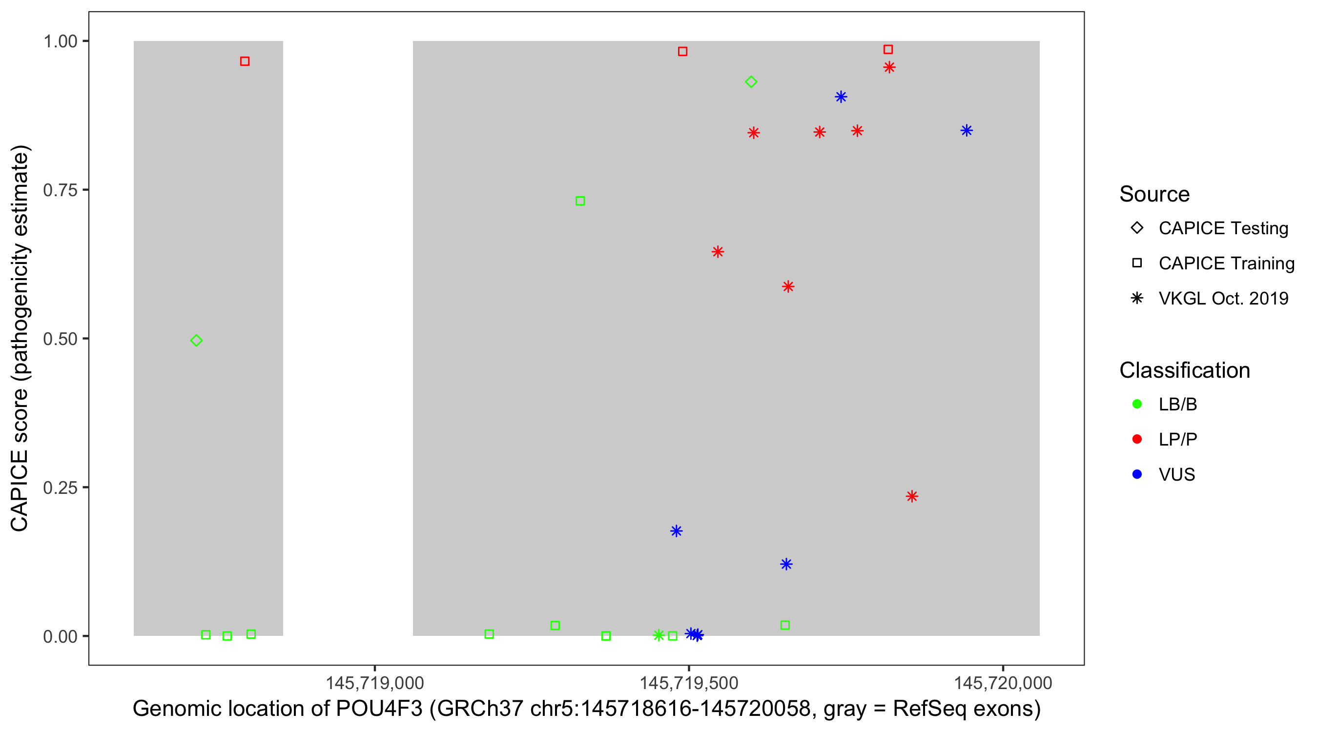 Shown are CAPICE train/test variants plus VKGL Oct 2019.