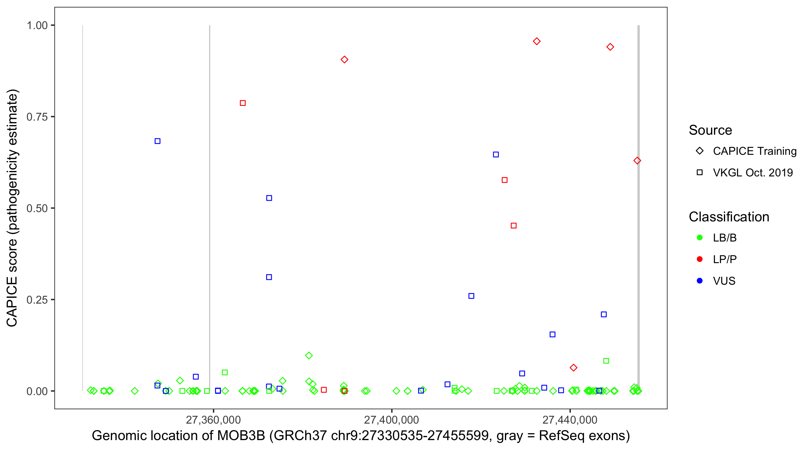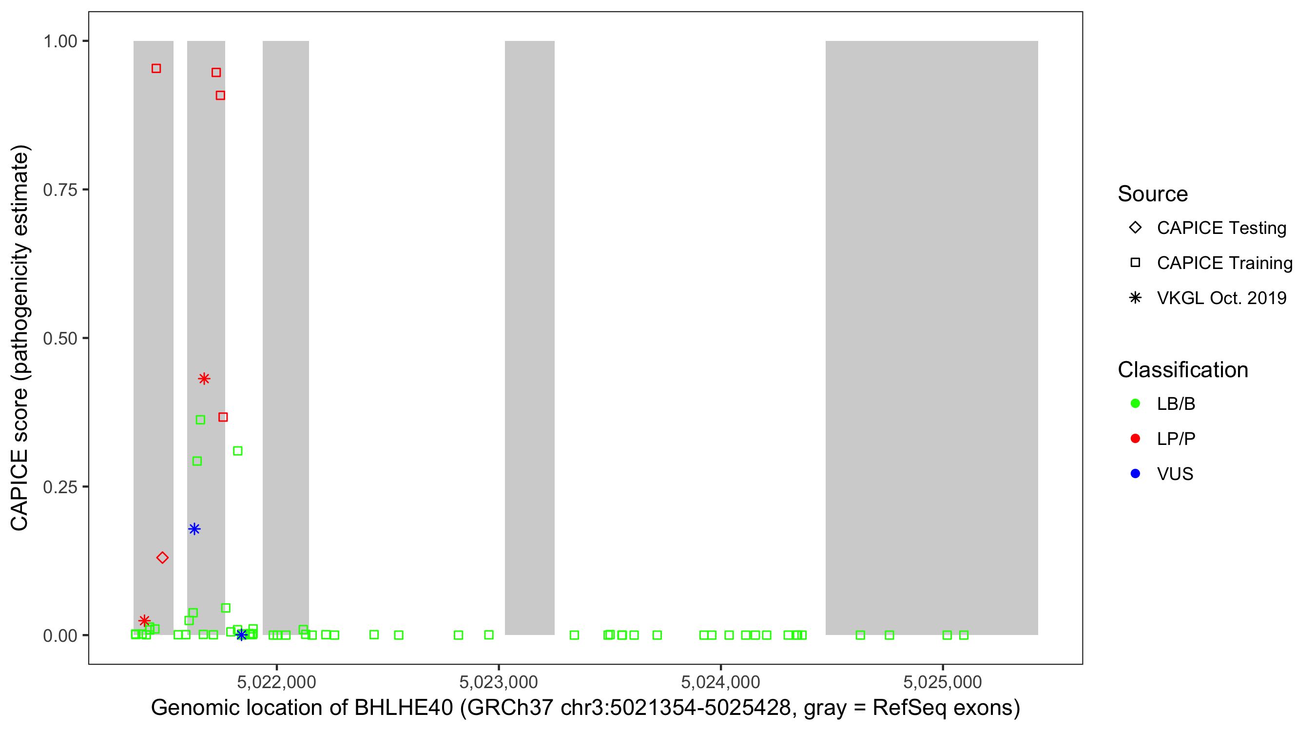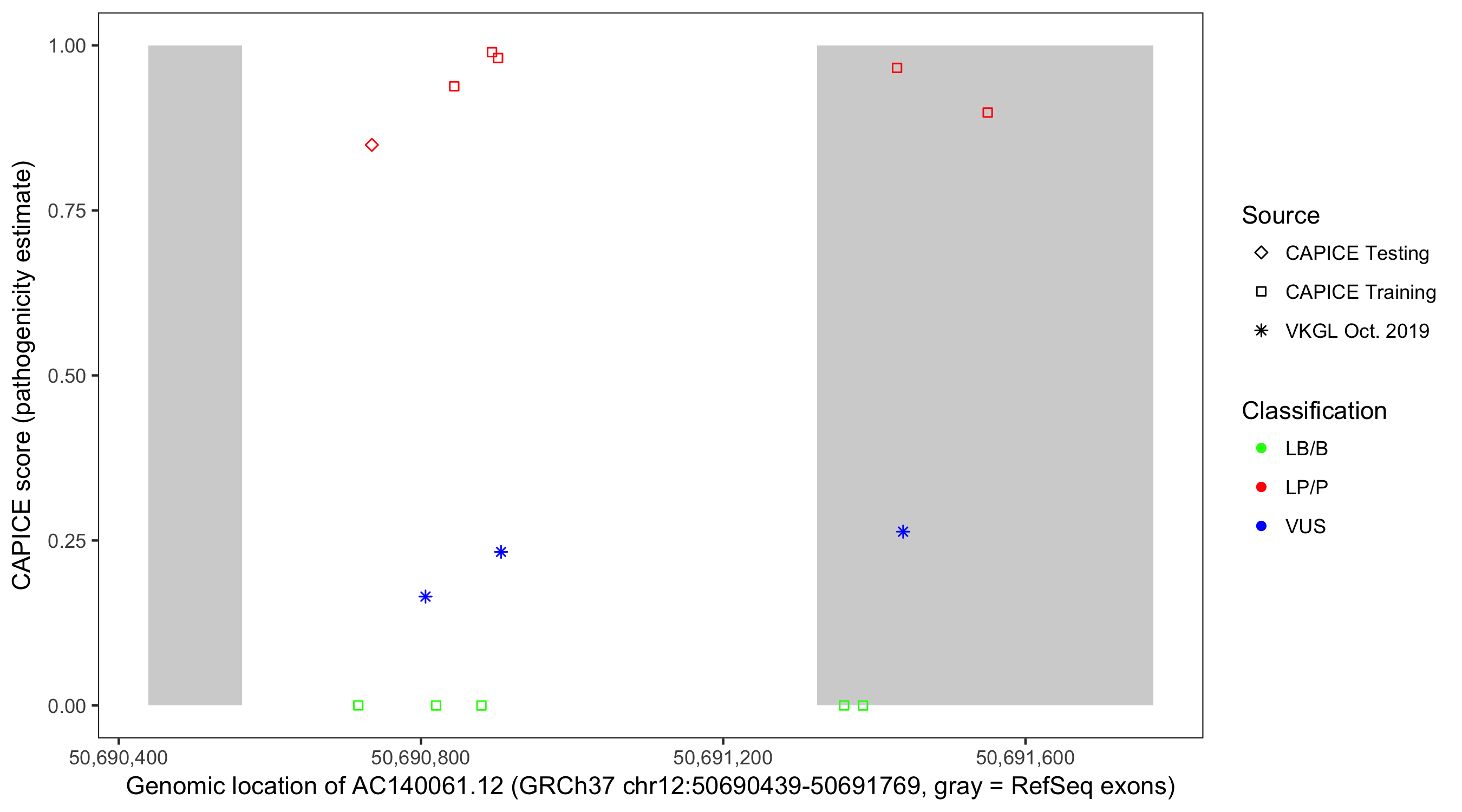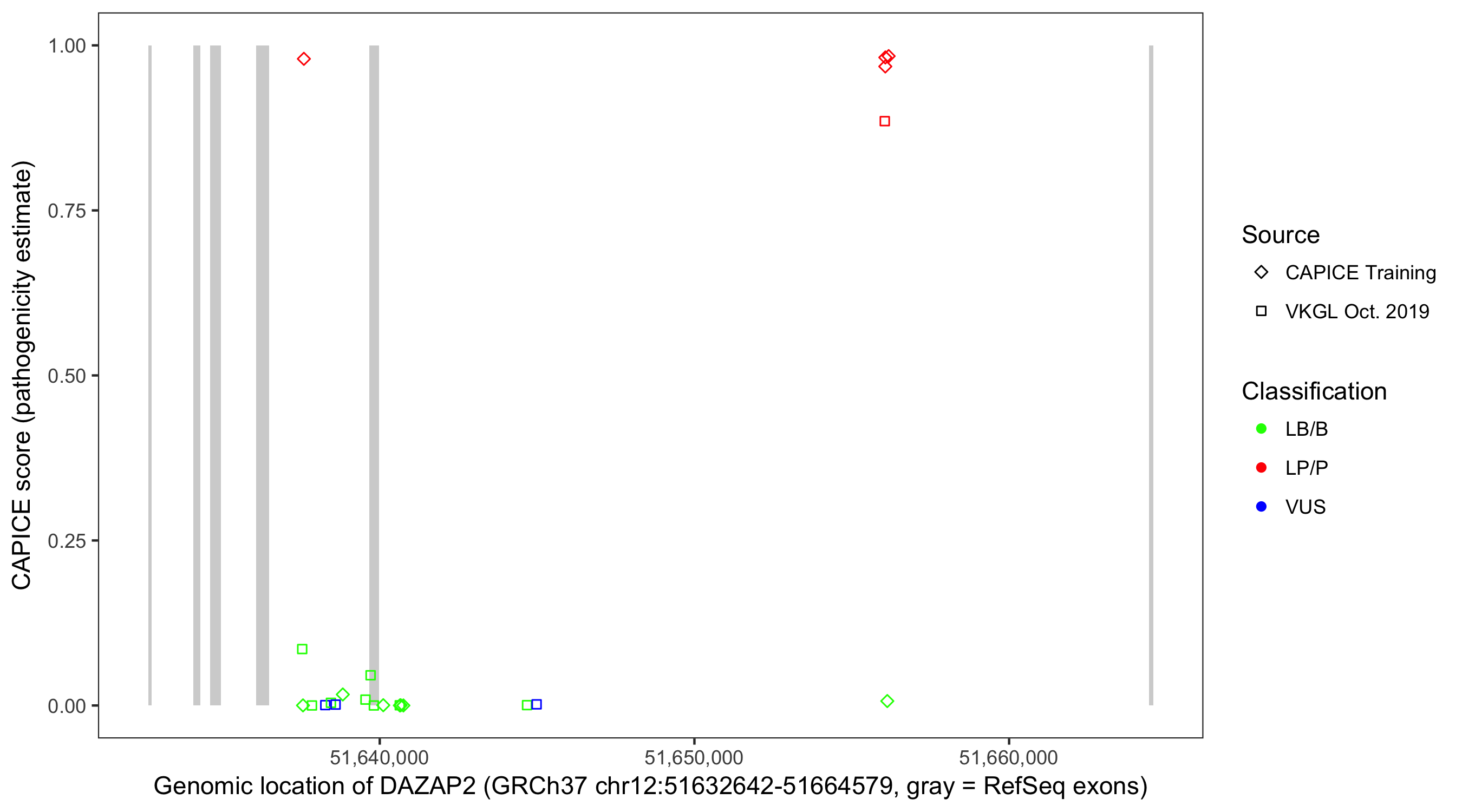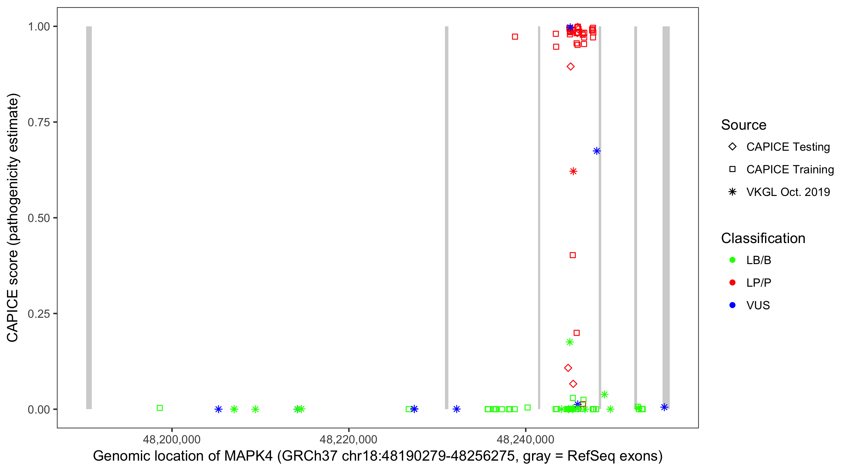 Shown are CAPICE train/test variants plus VKGL Oct 2019.