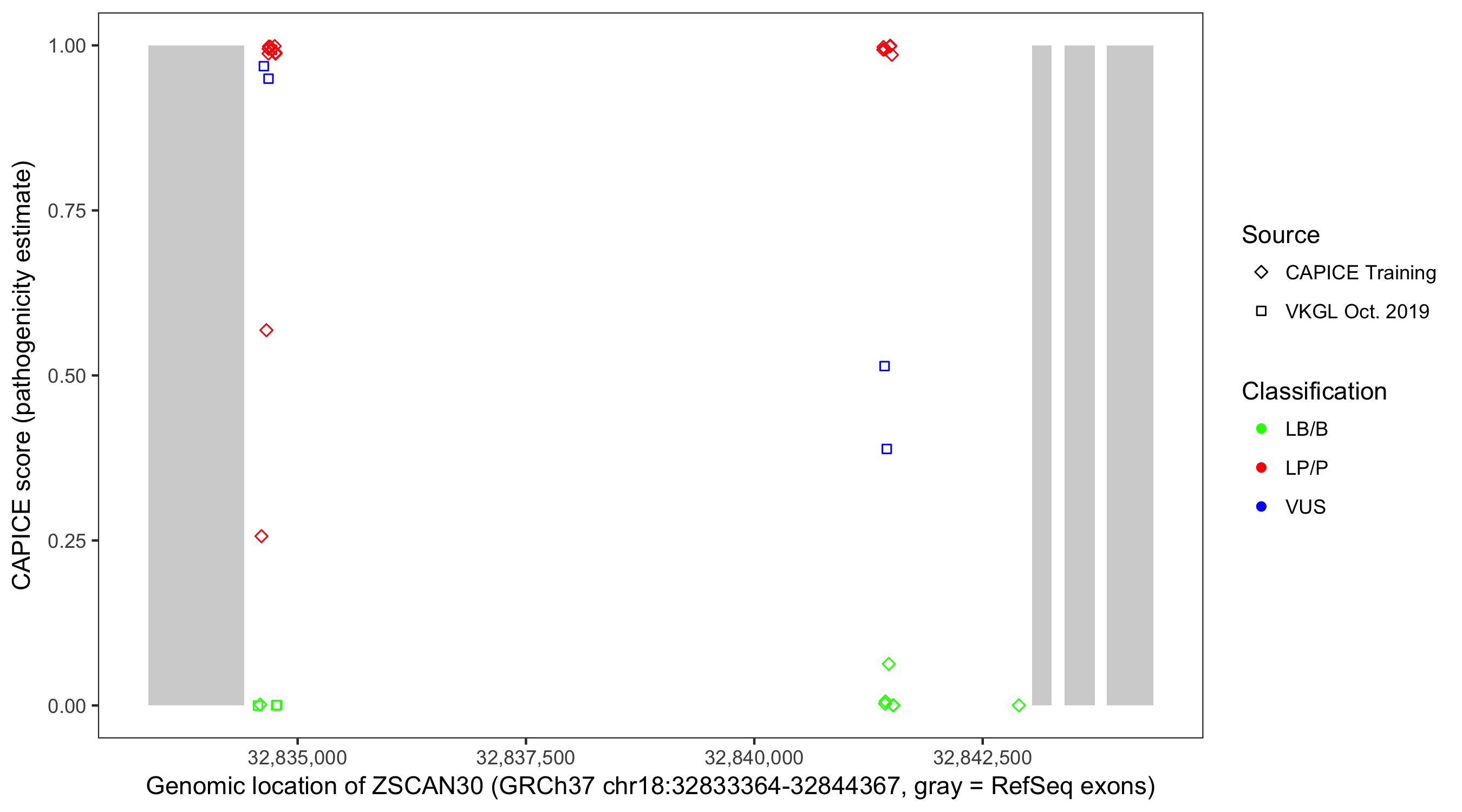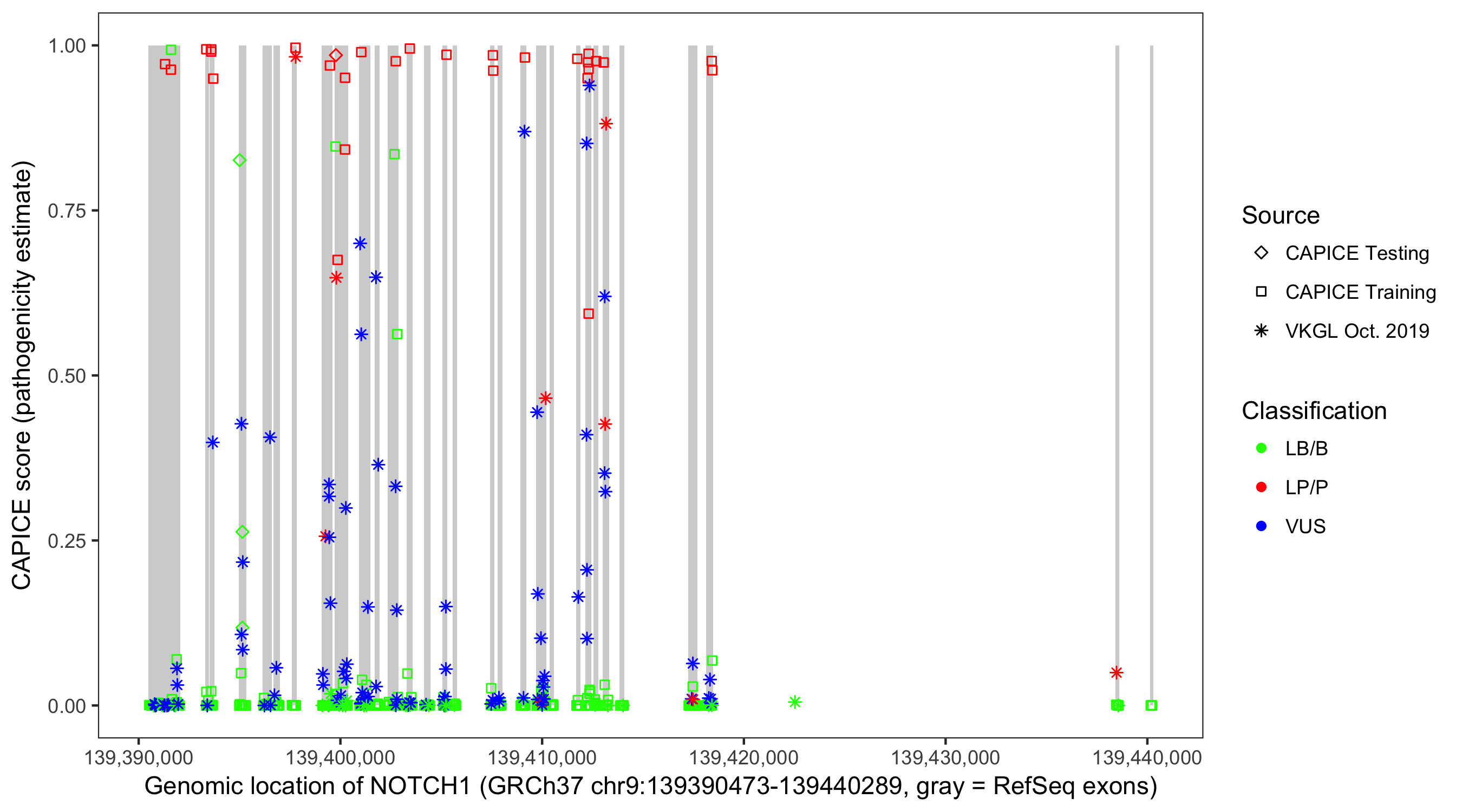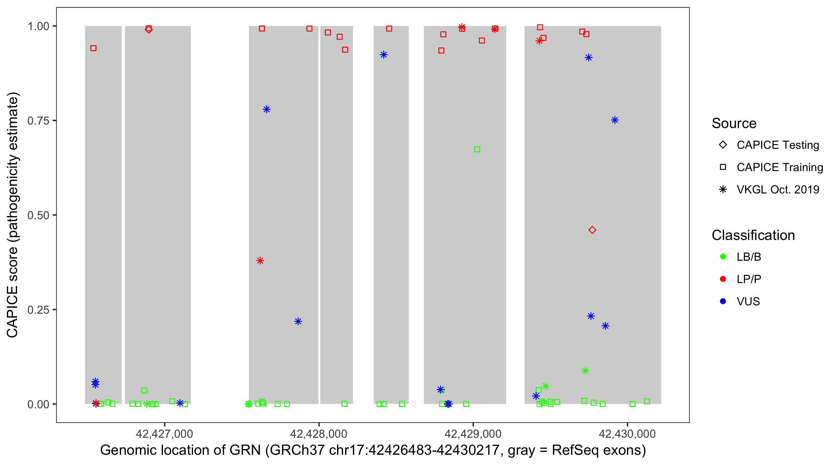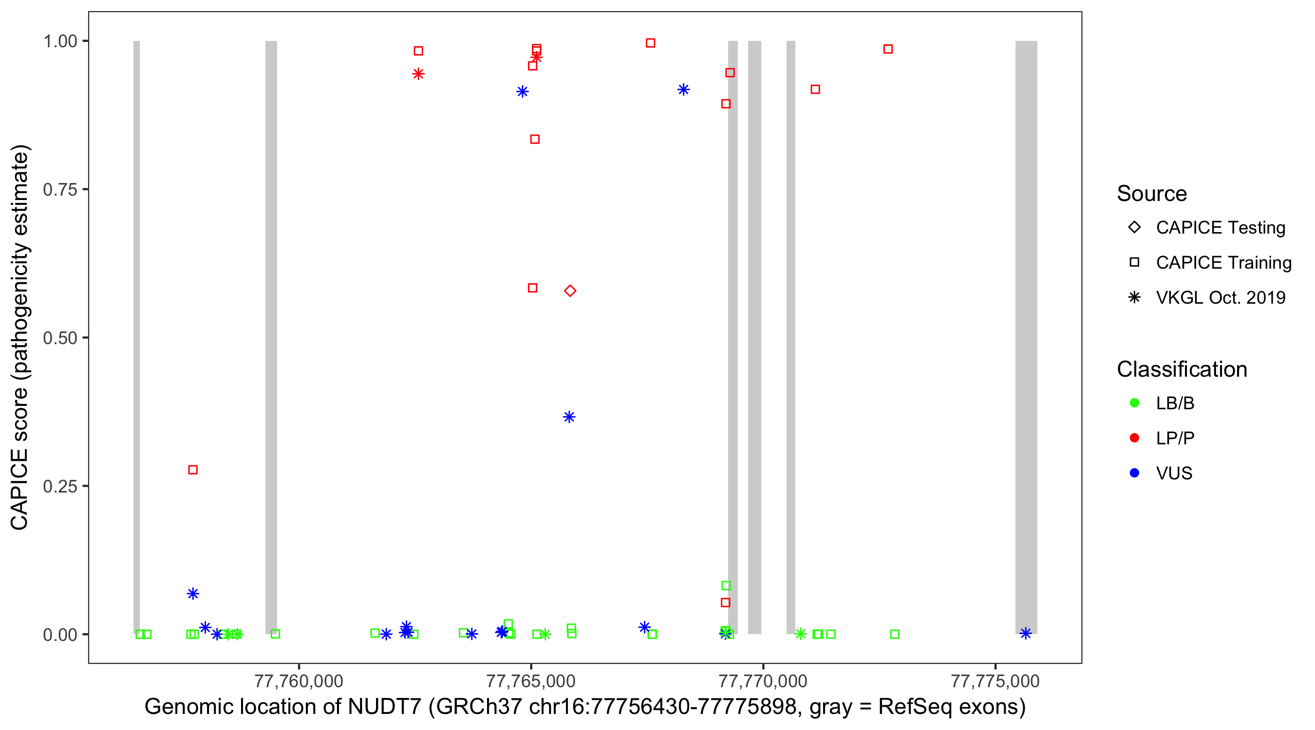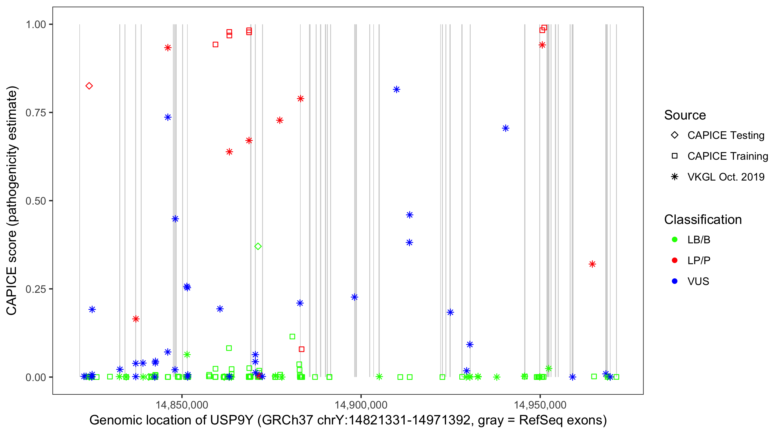 Shown are CAPICE train/test variants plus VKGL Oct 2019.