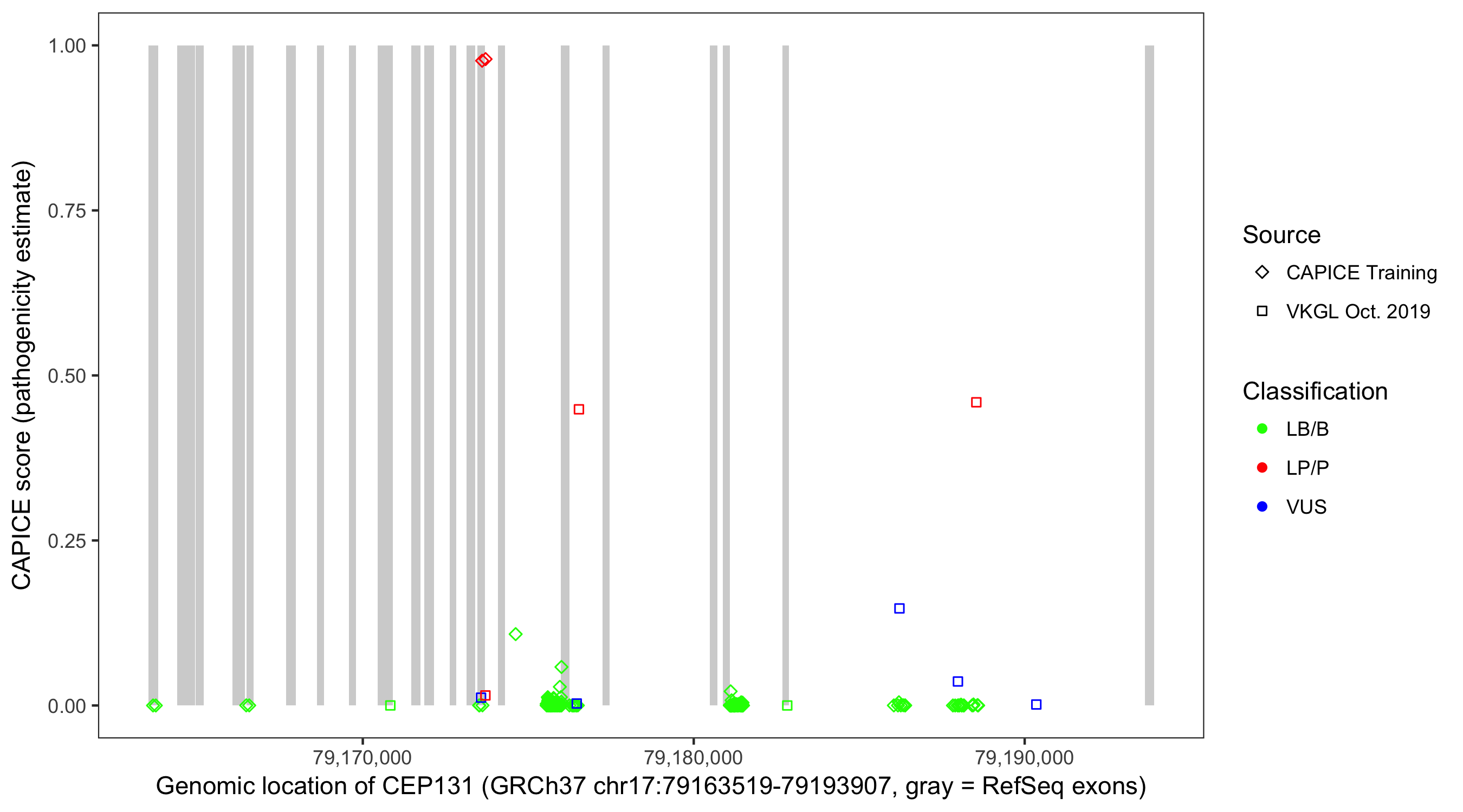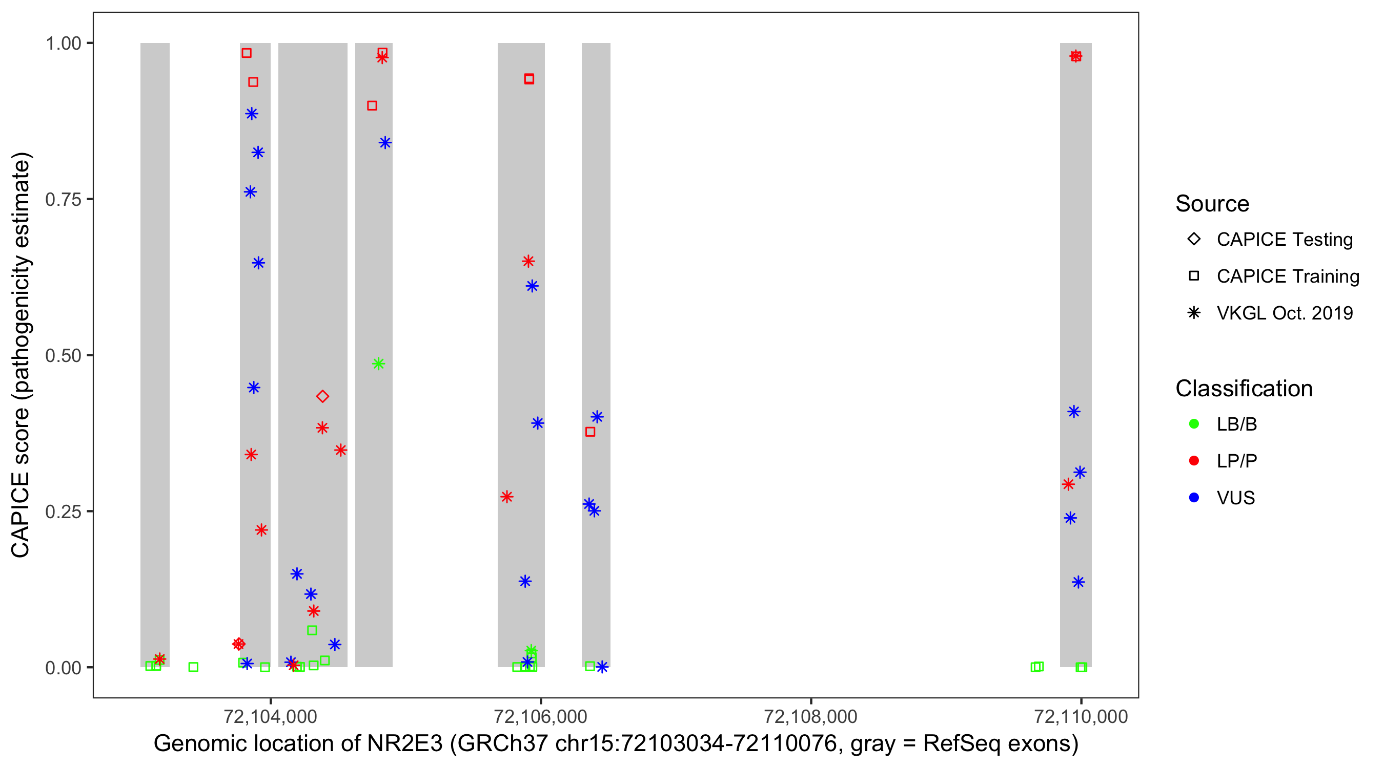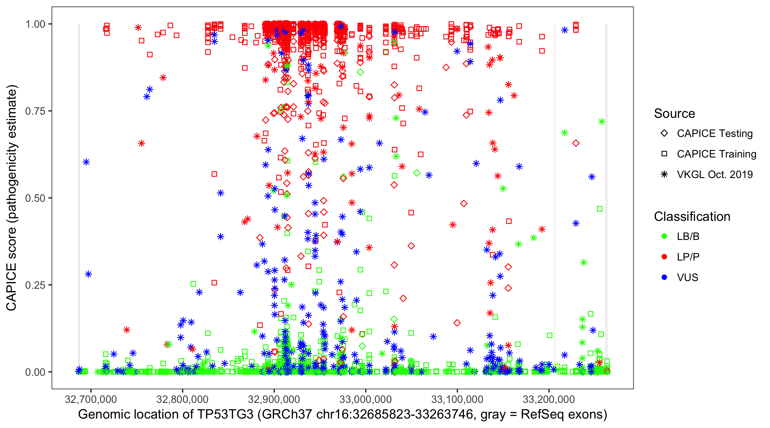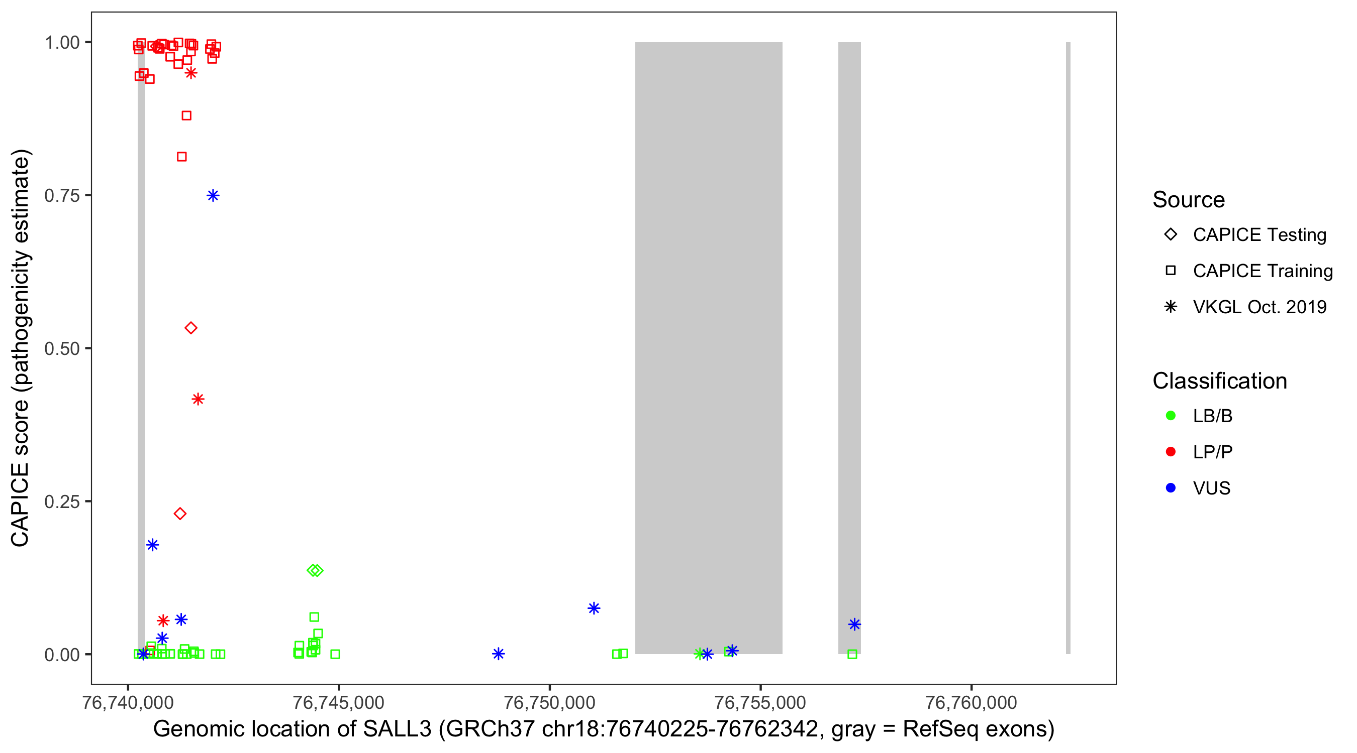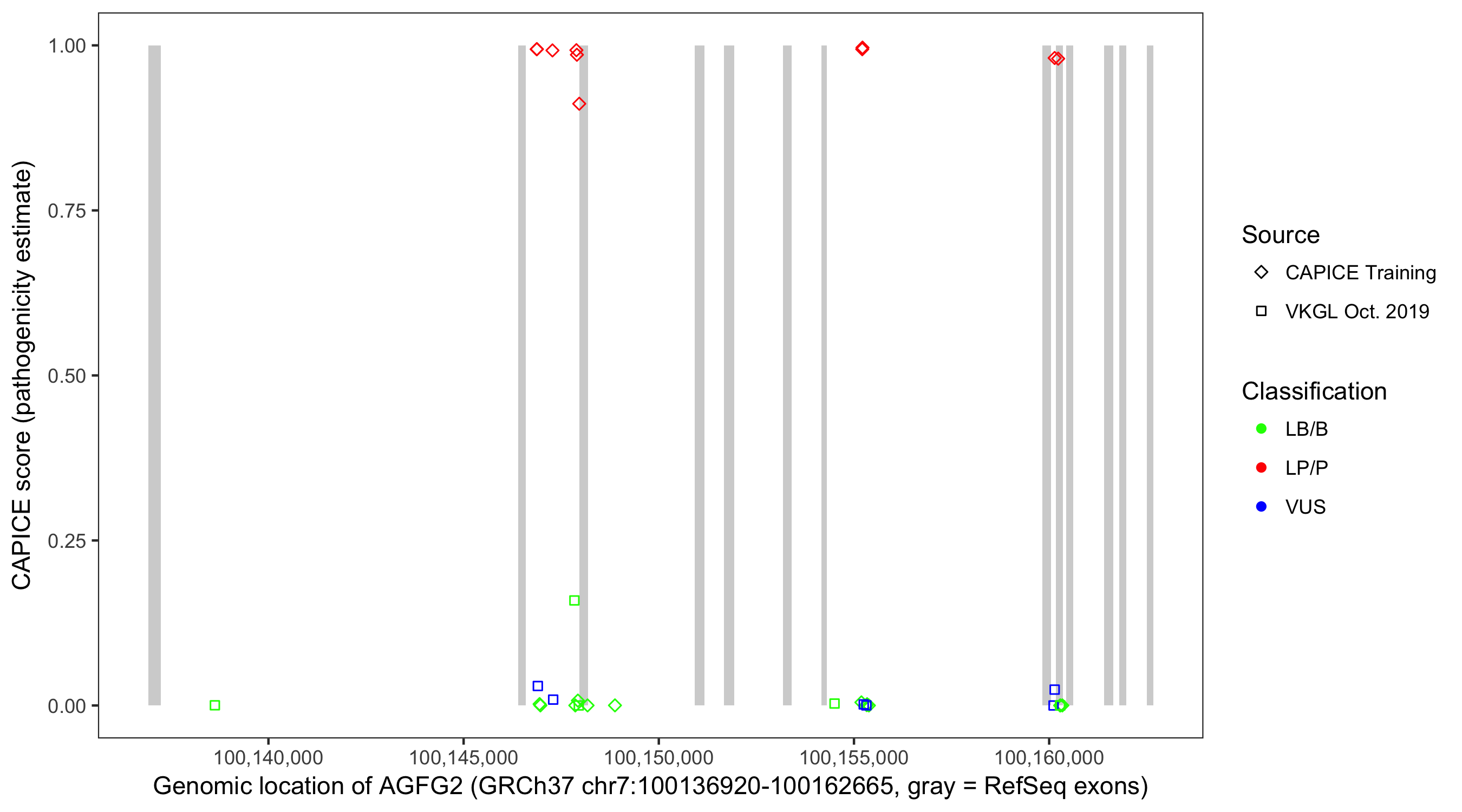 Shown are CAPICE train/test variants plus VKGL Oct 2019.