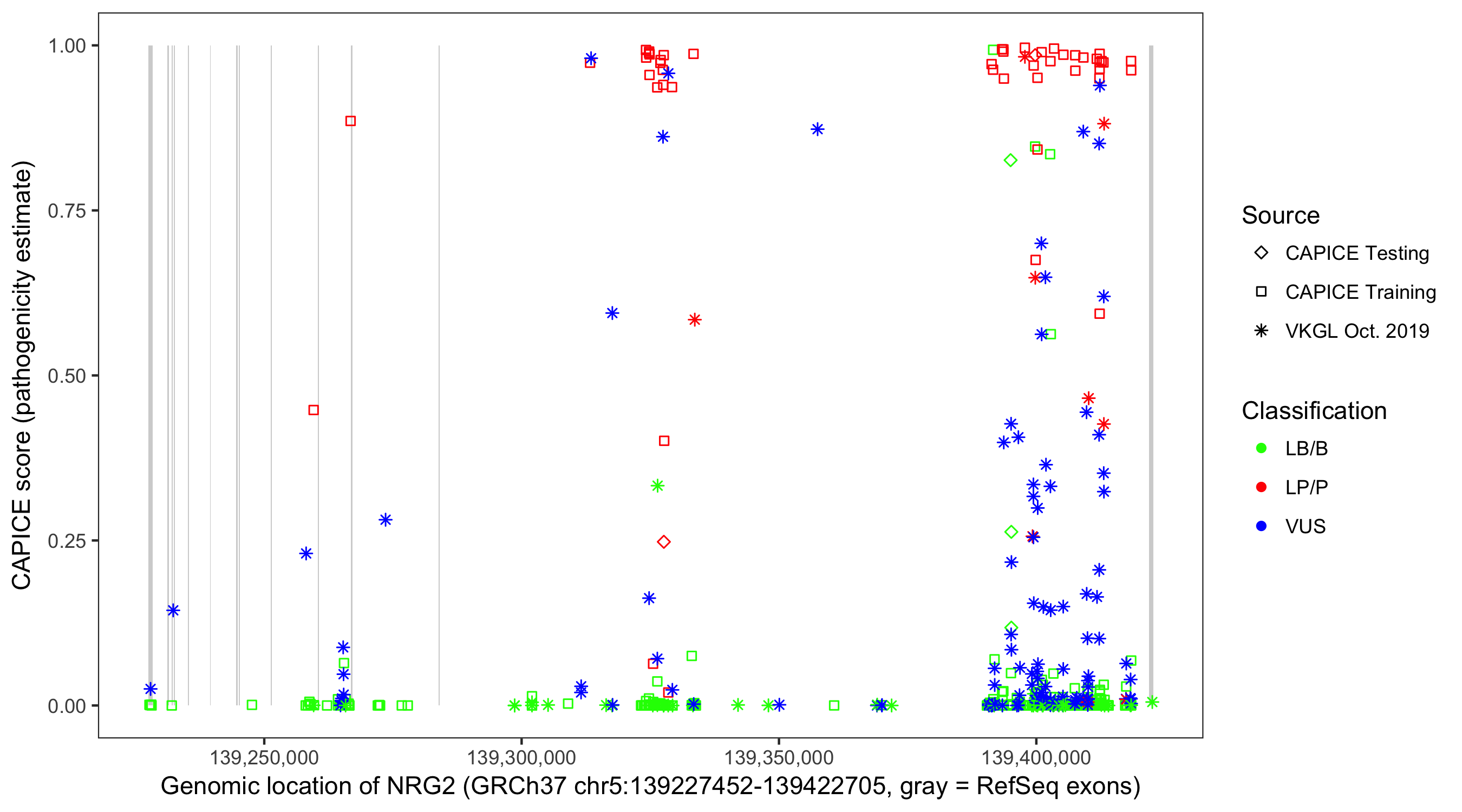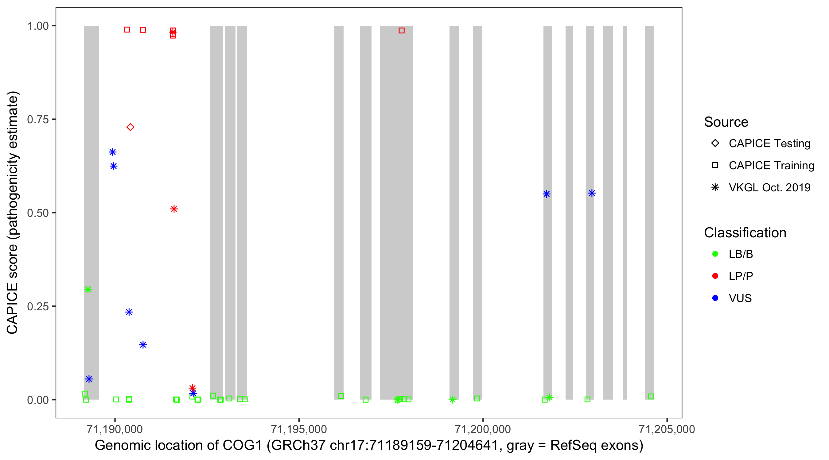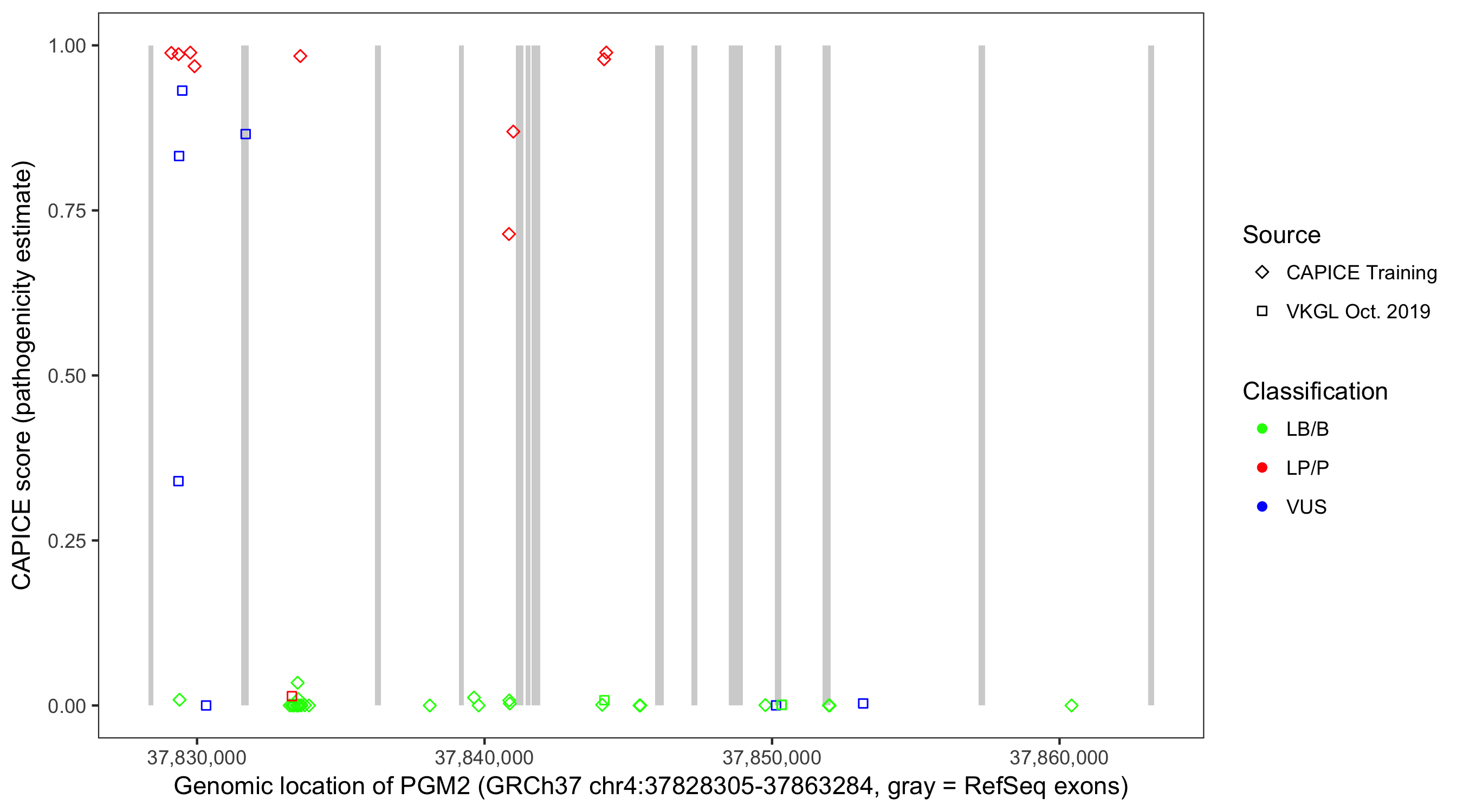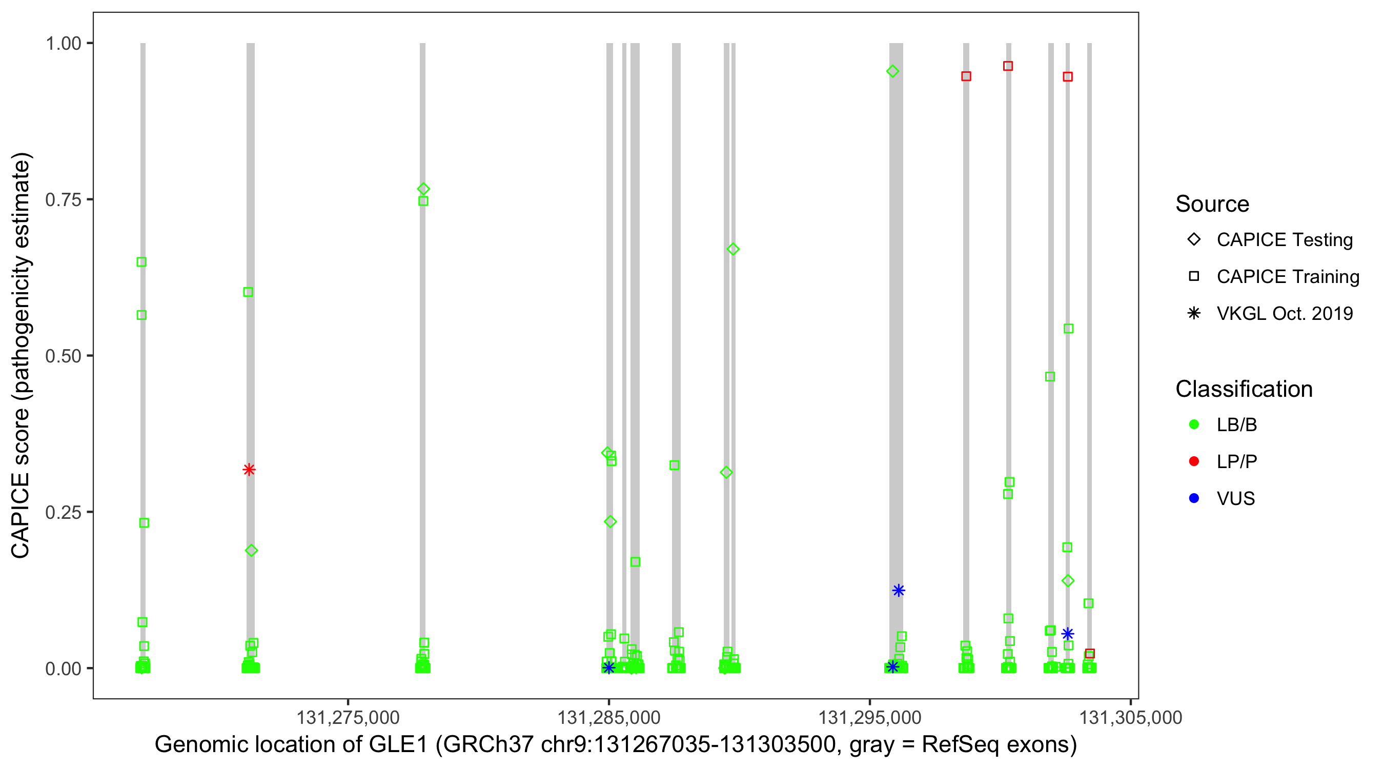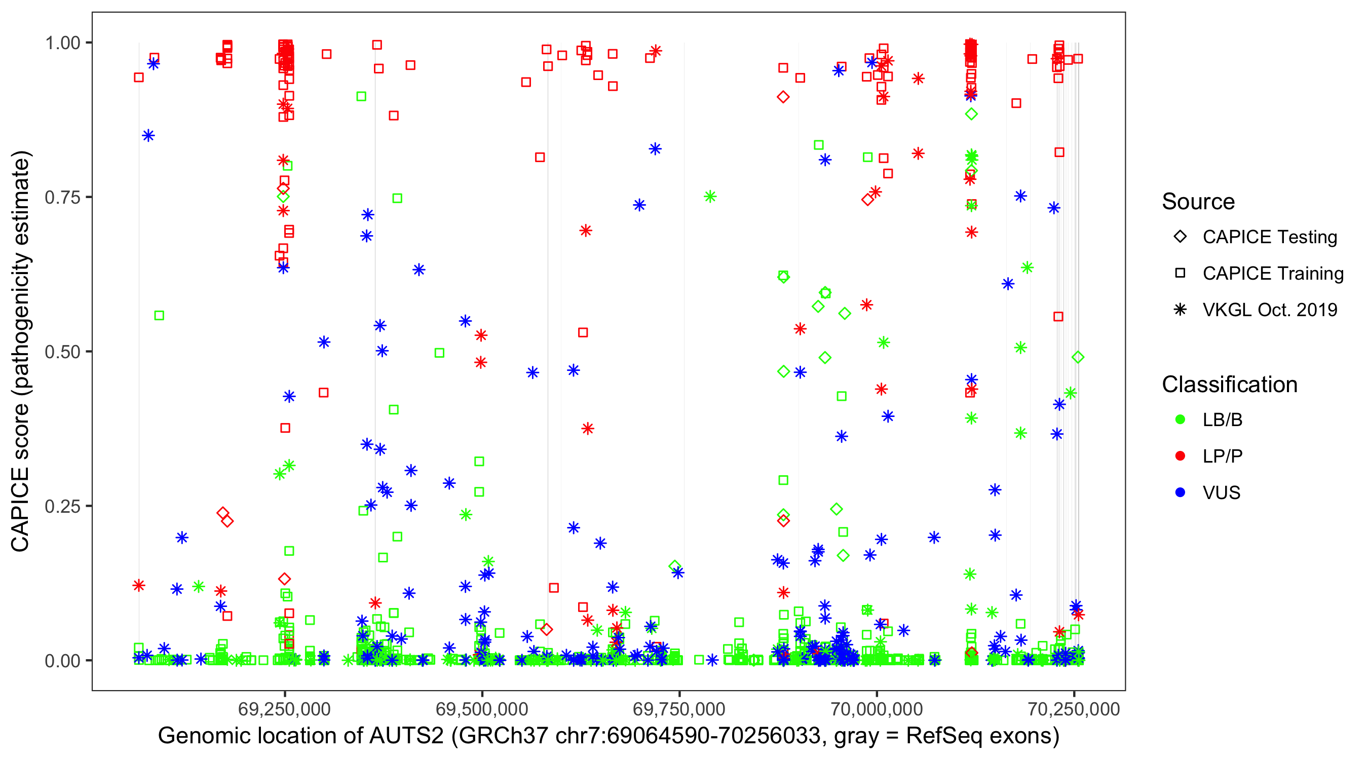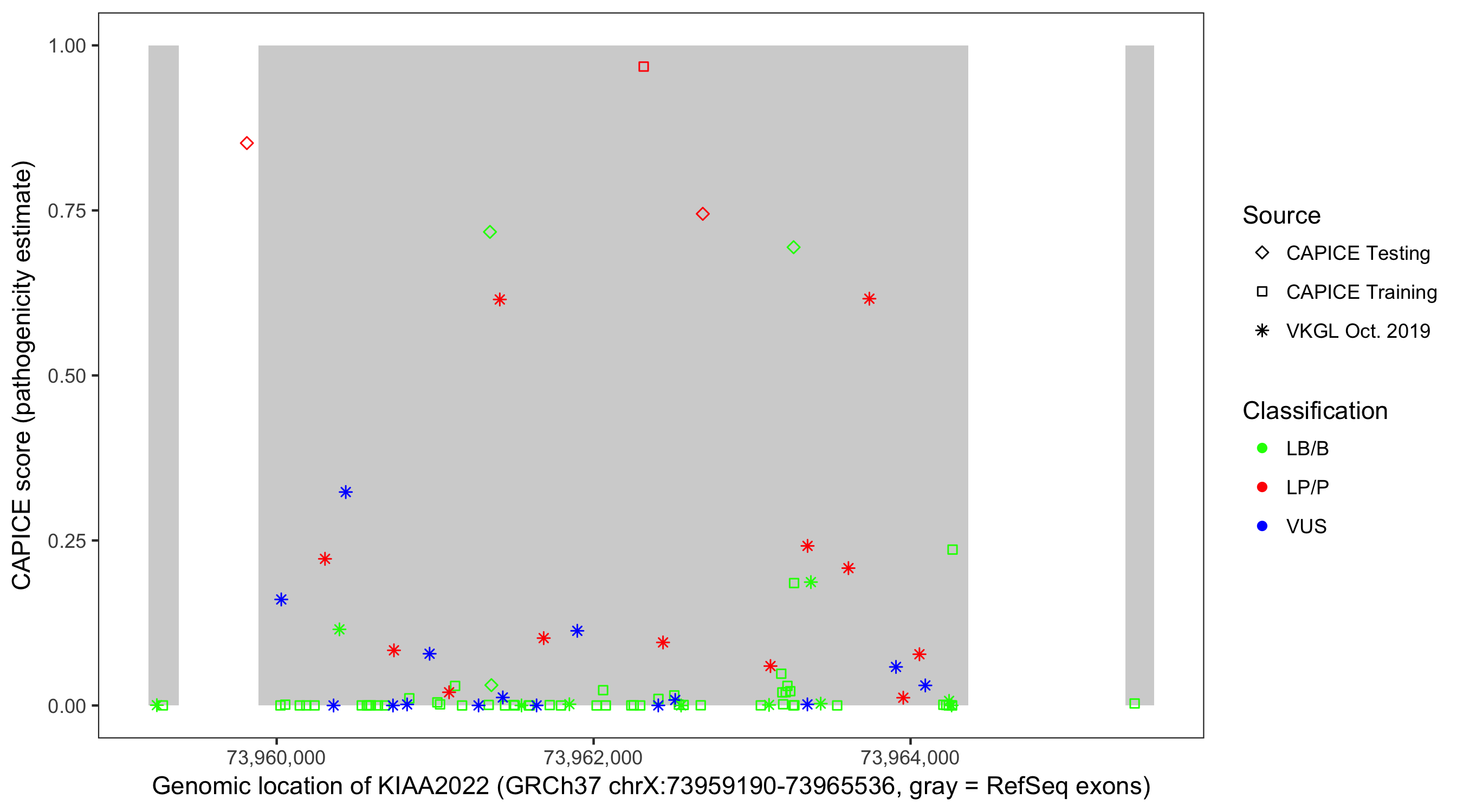 Shown are CAPICE train/test variants plus VKGL Oct 2019.