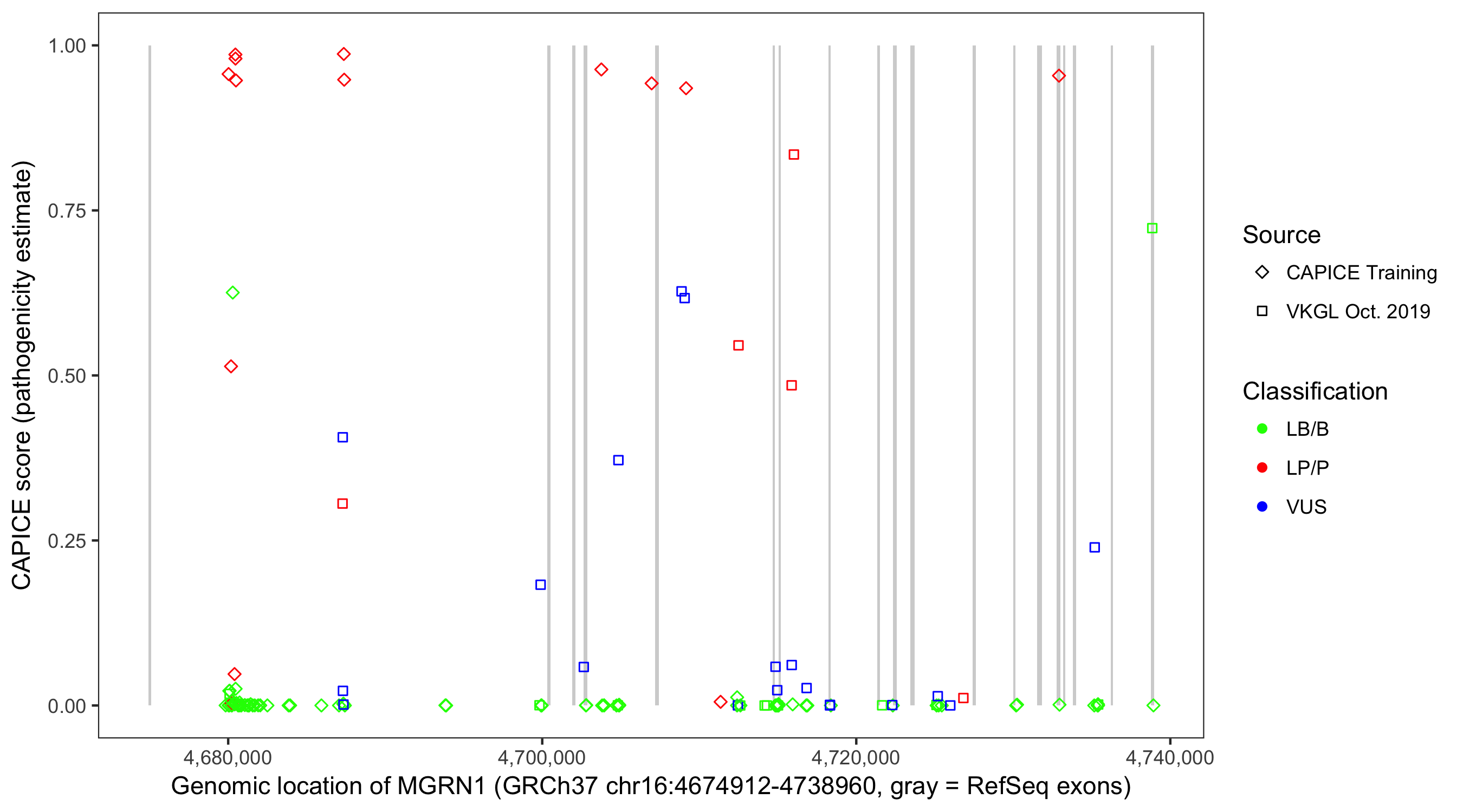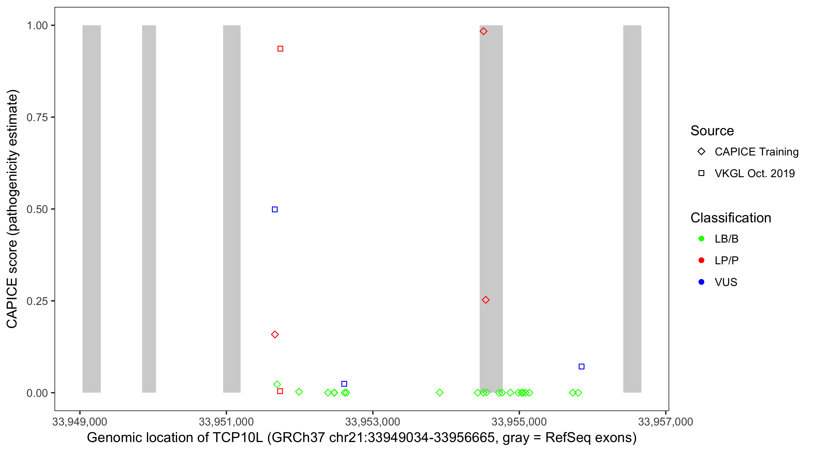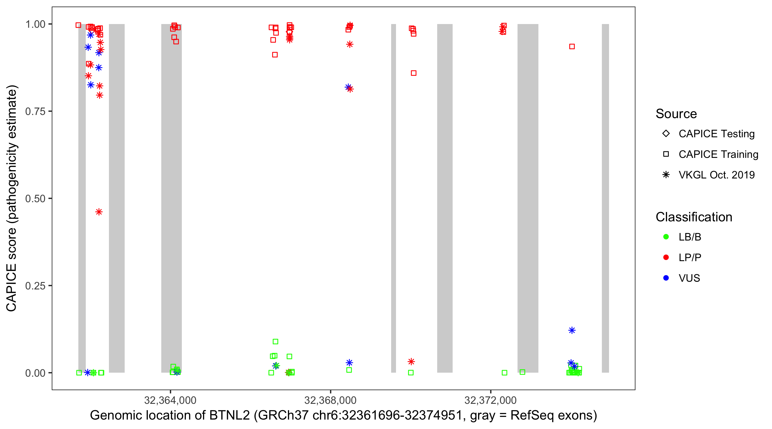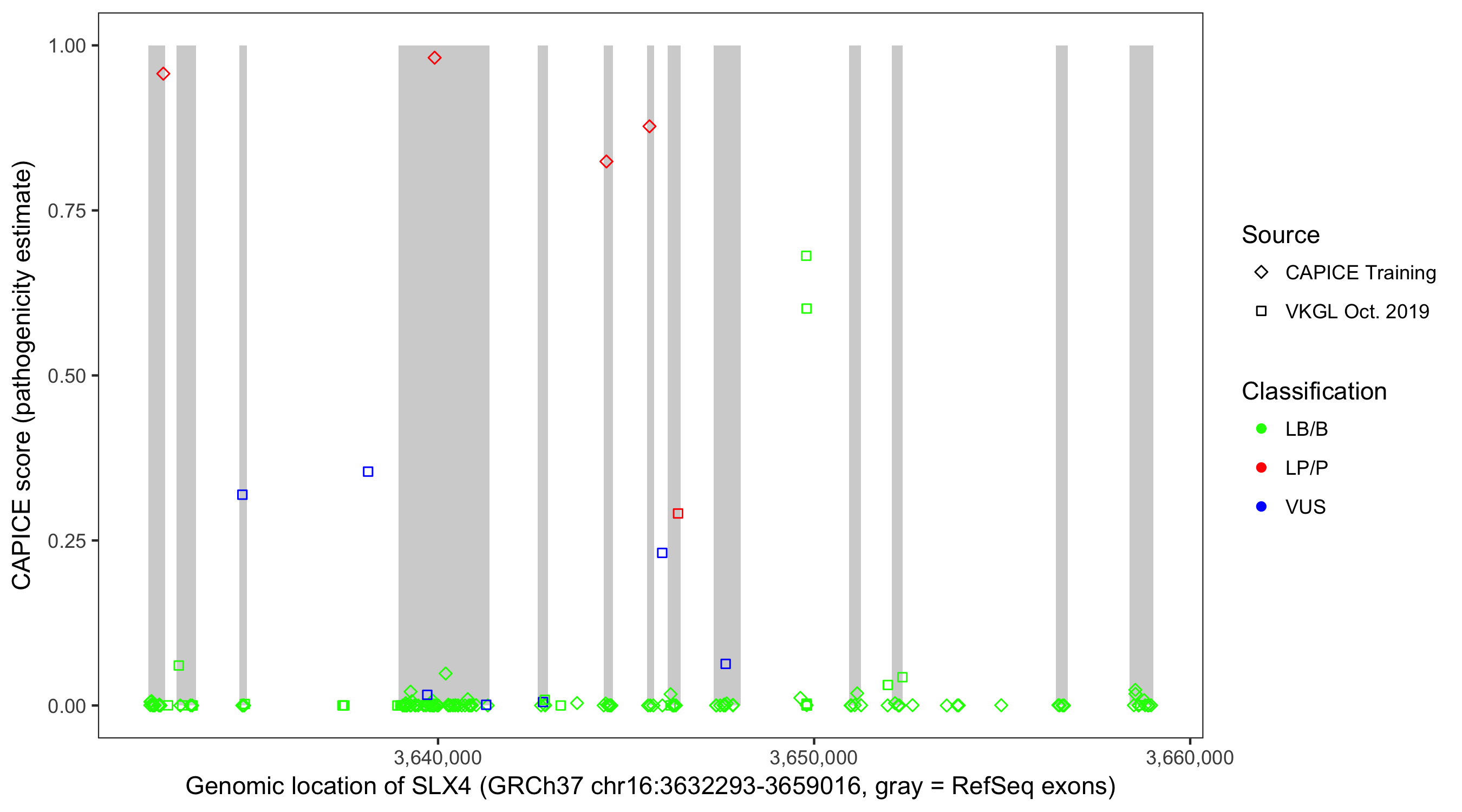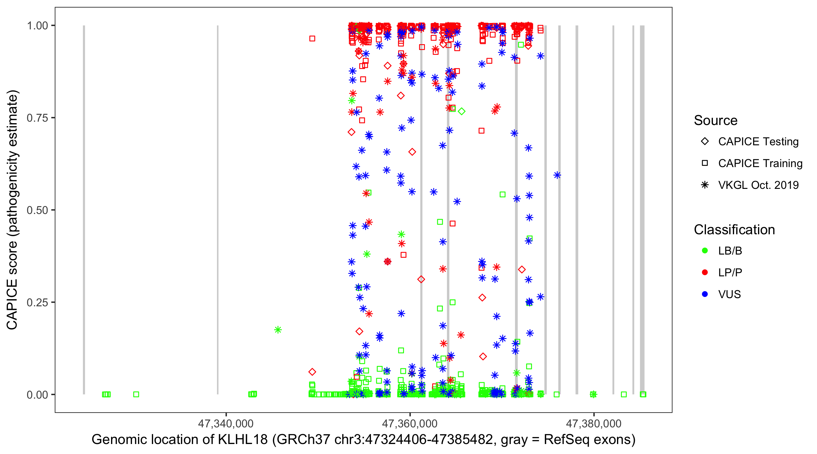 Shown are CAPICE train/test variants plus VKGL Oct 2019.
