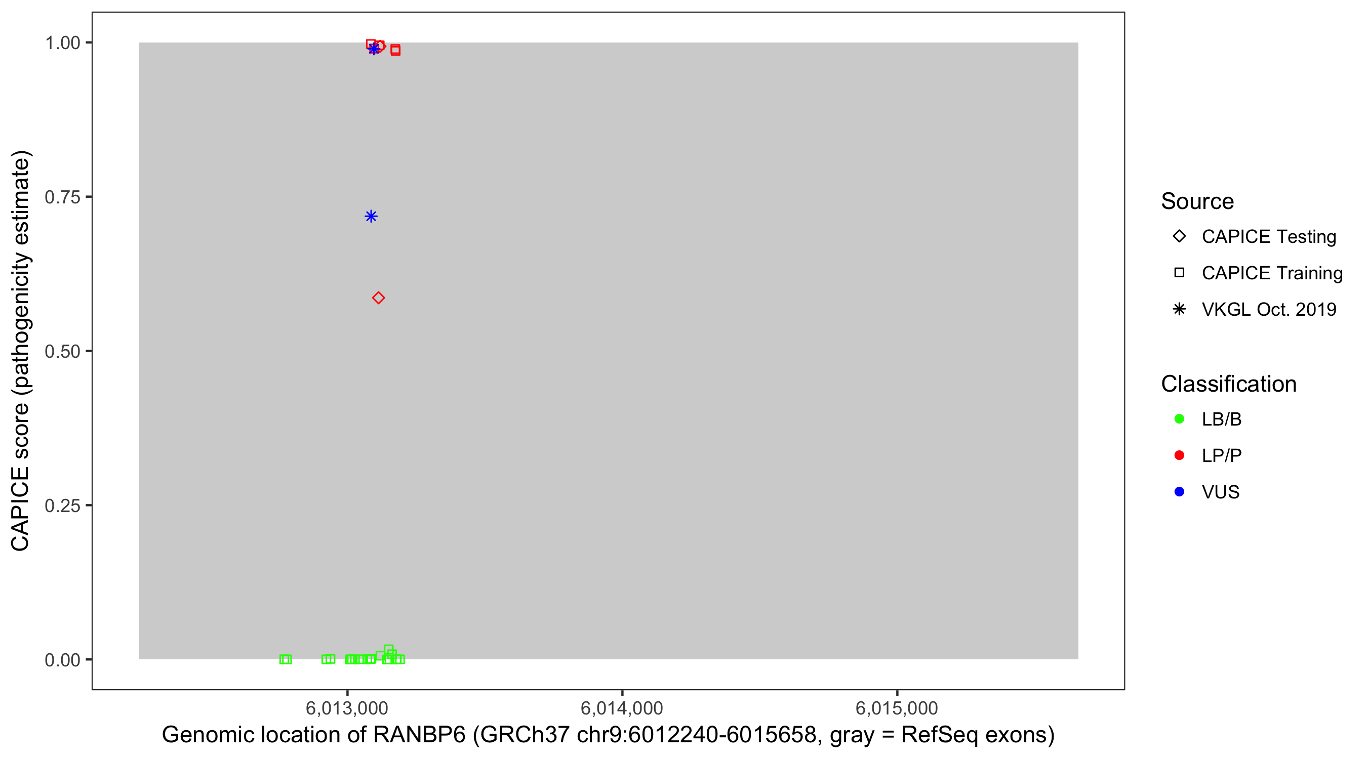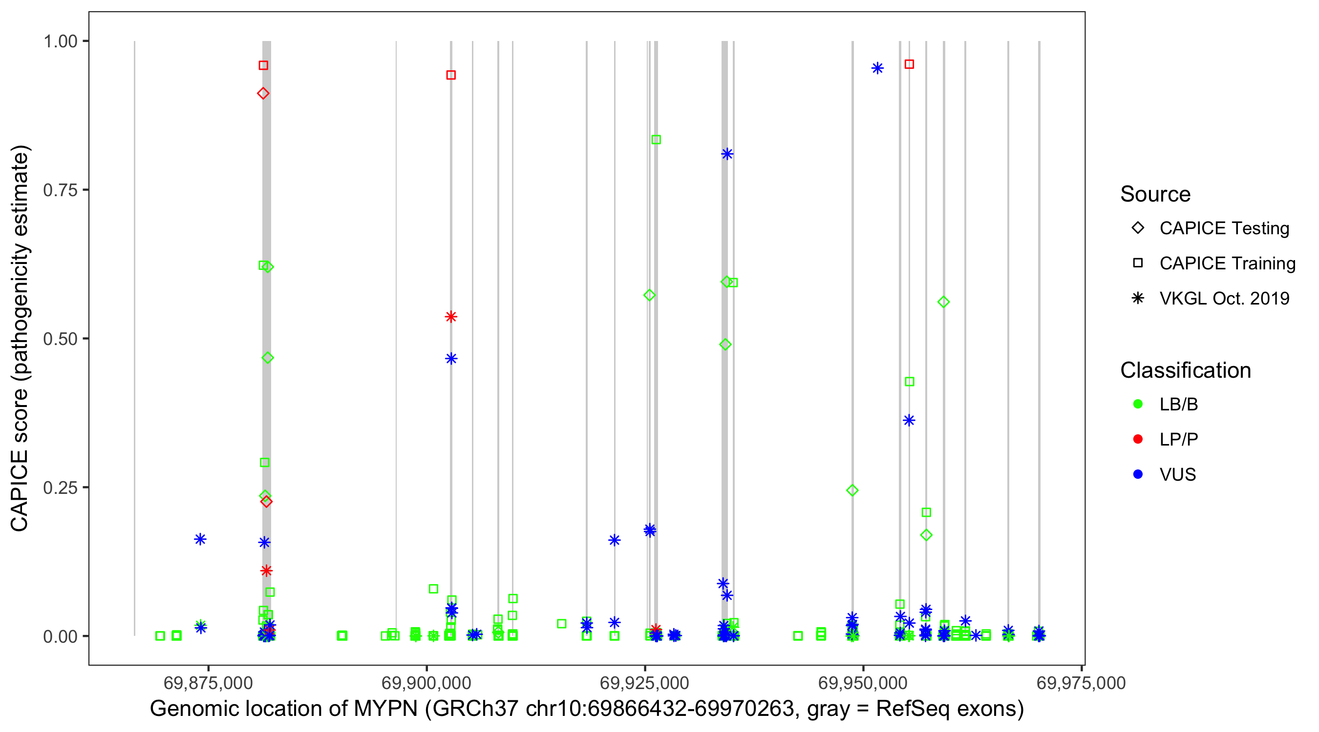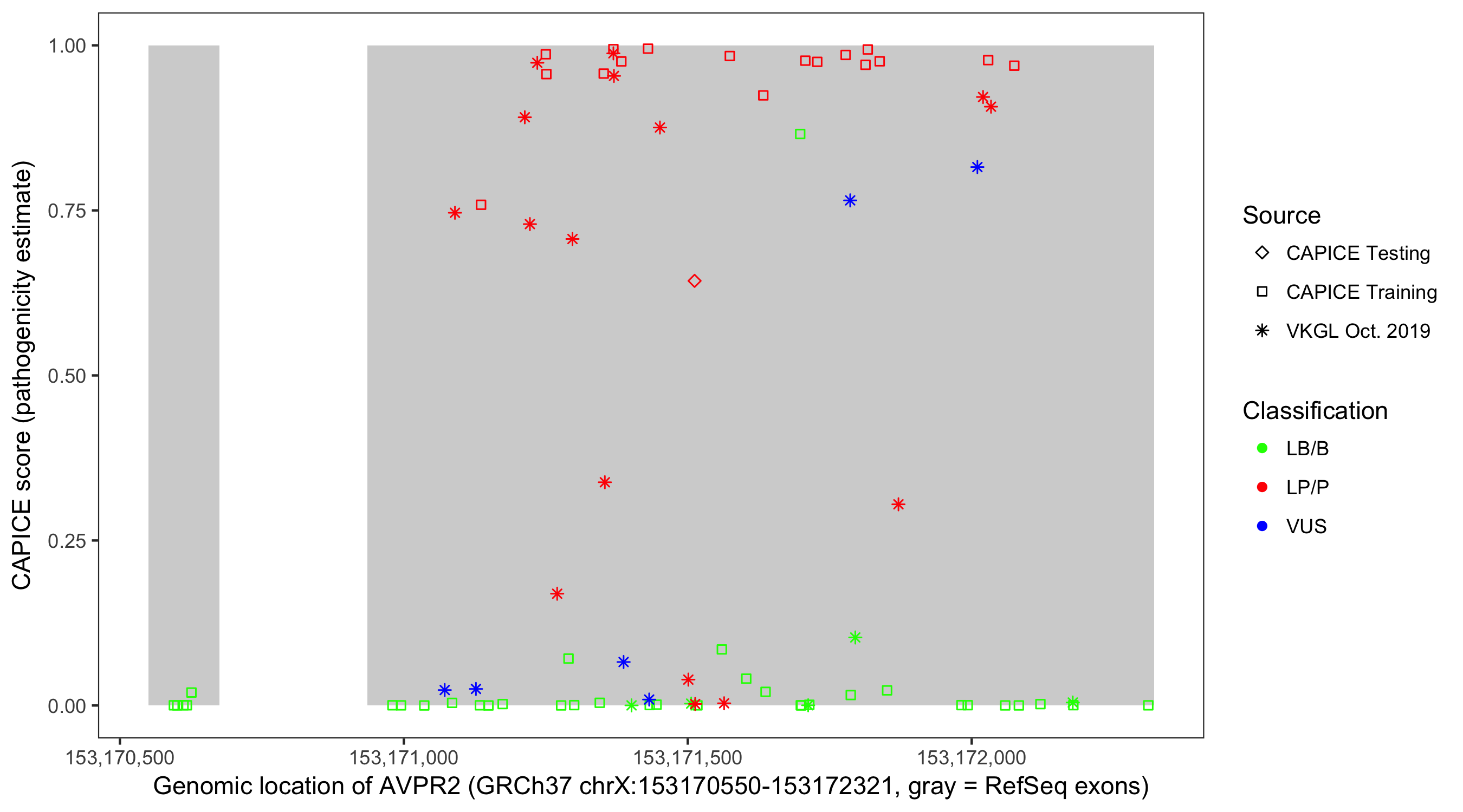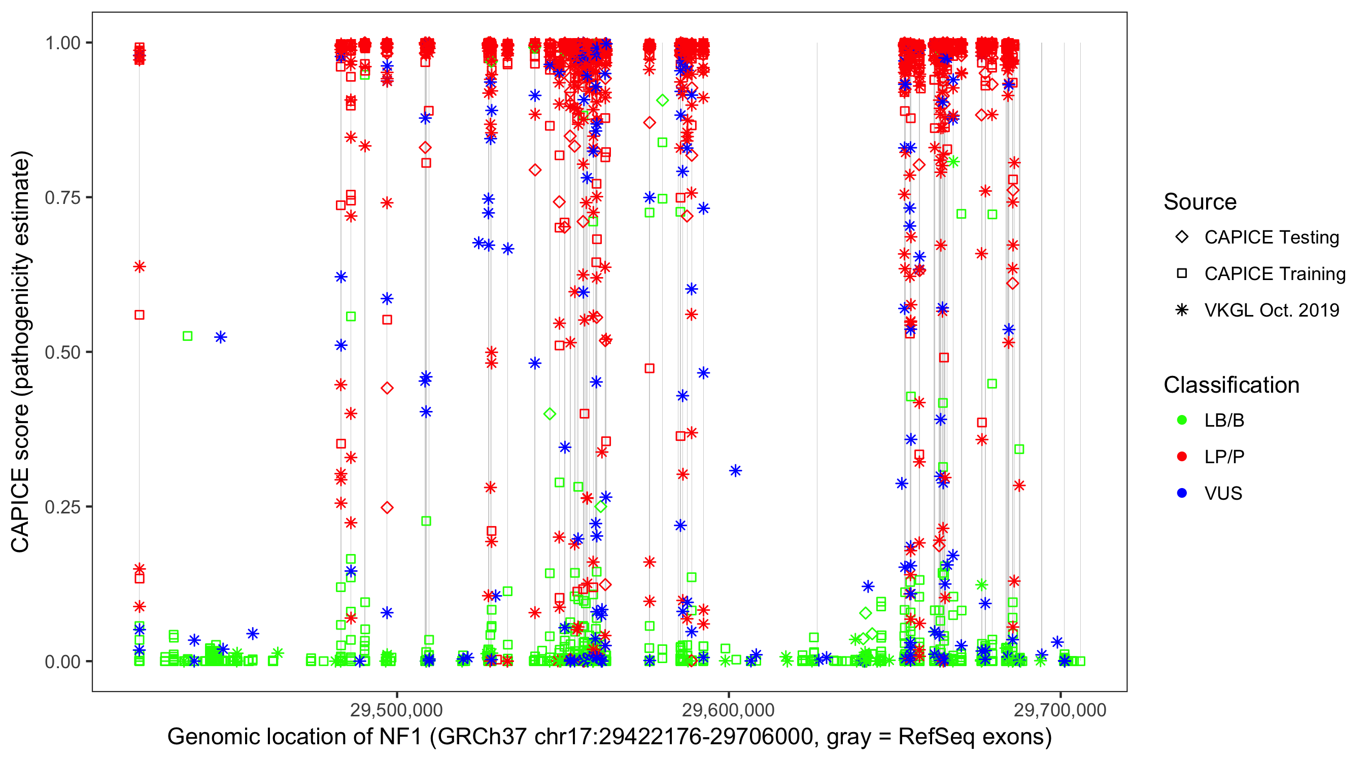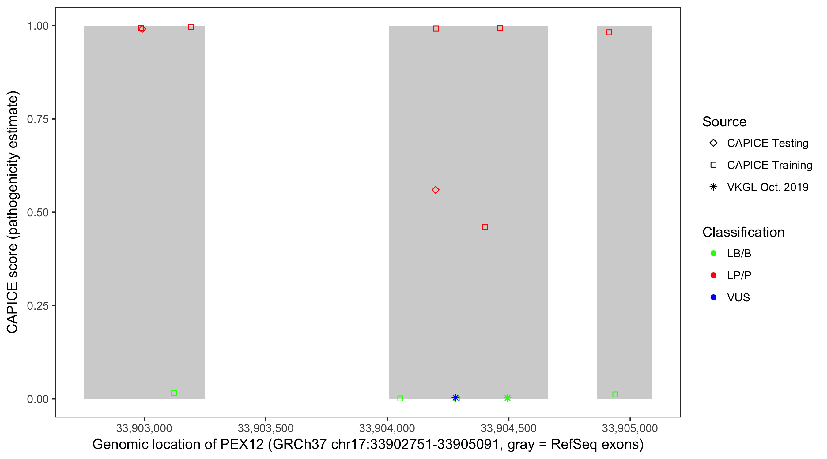 Shown are CAPICE train/test variants plus VKGL Oct 2019.