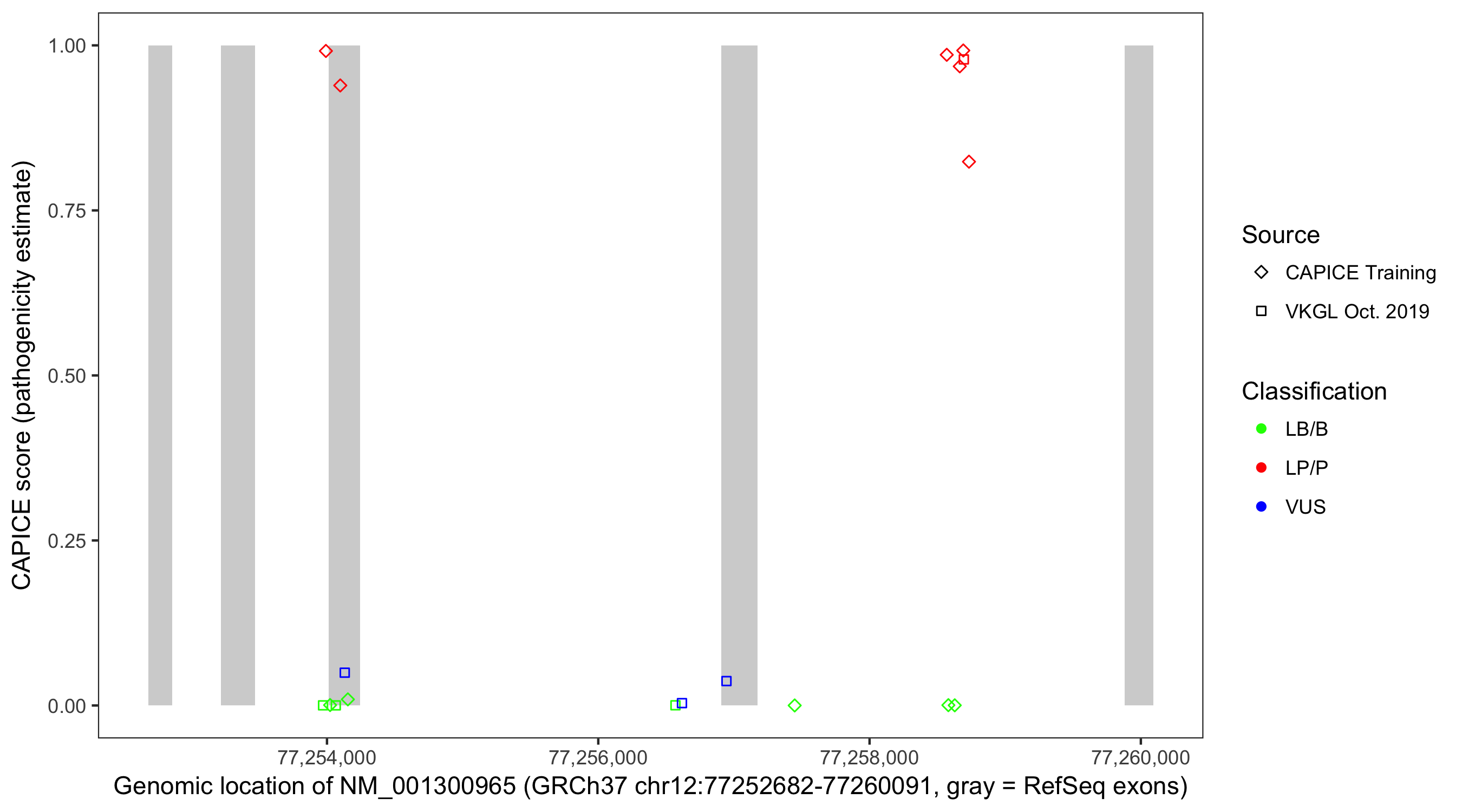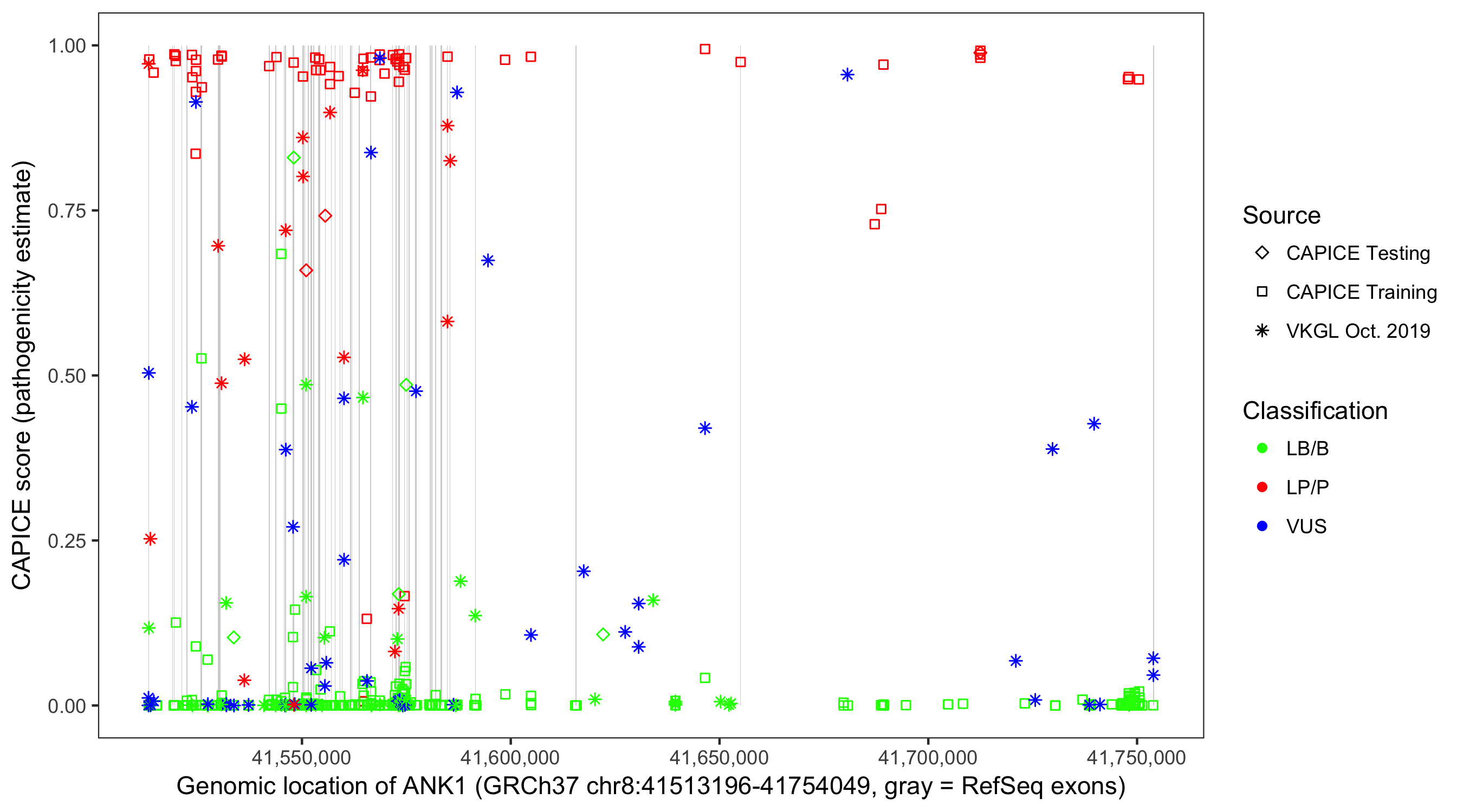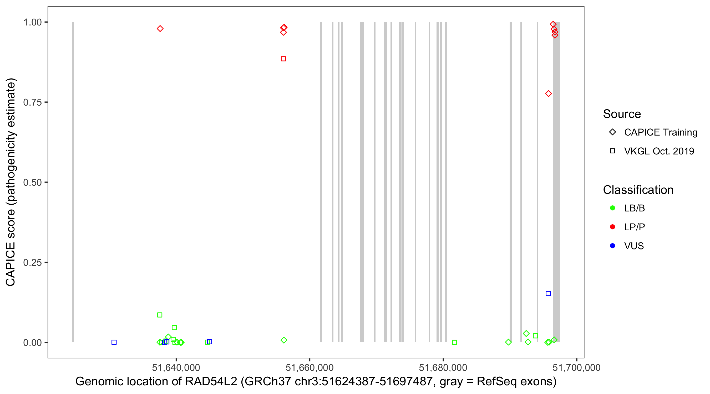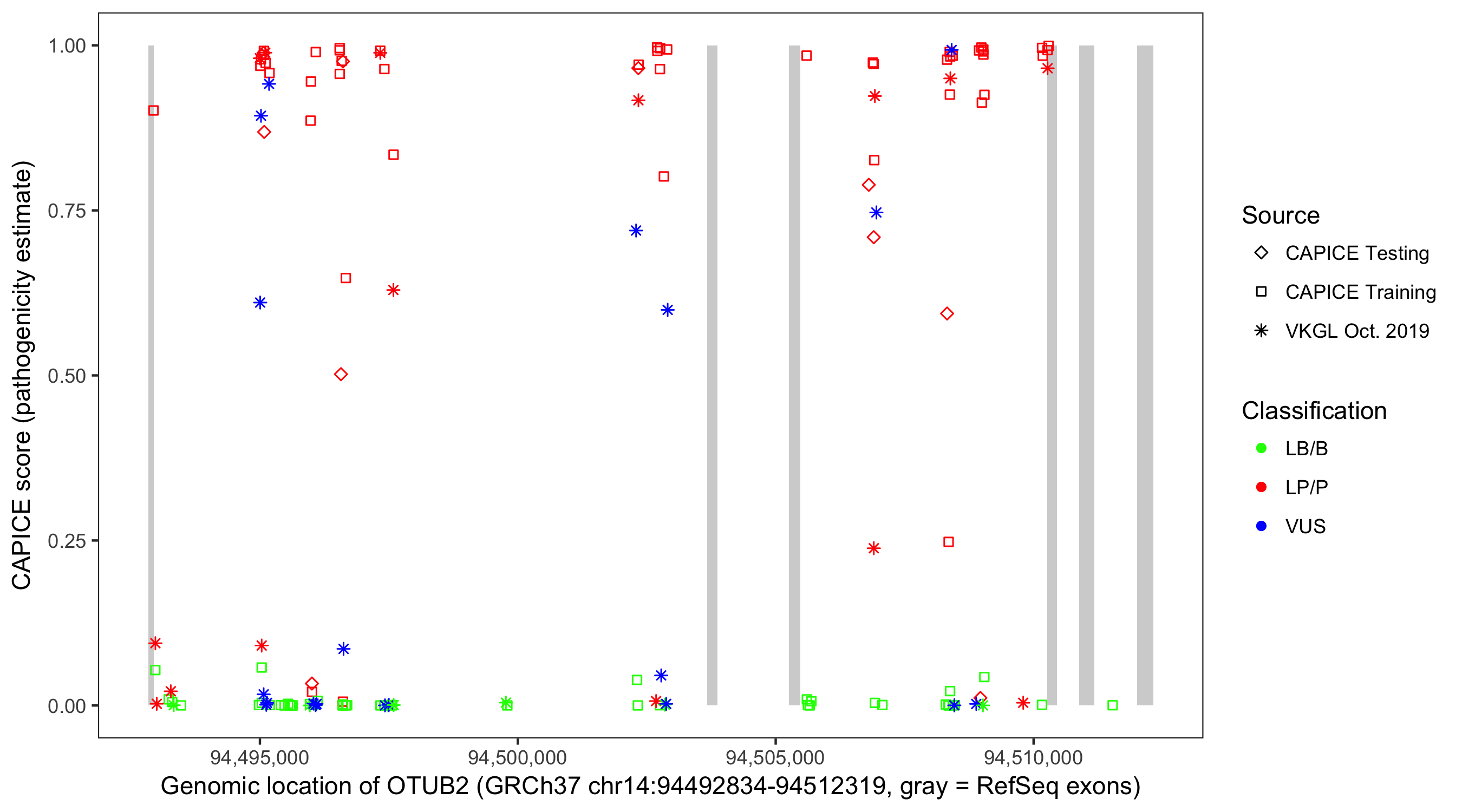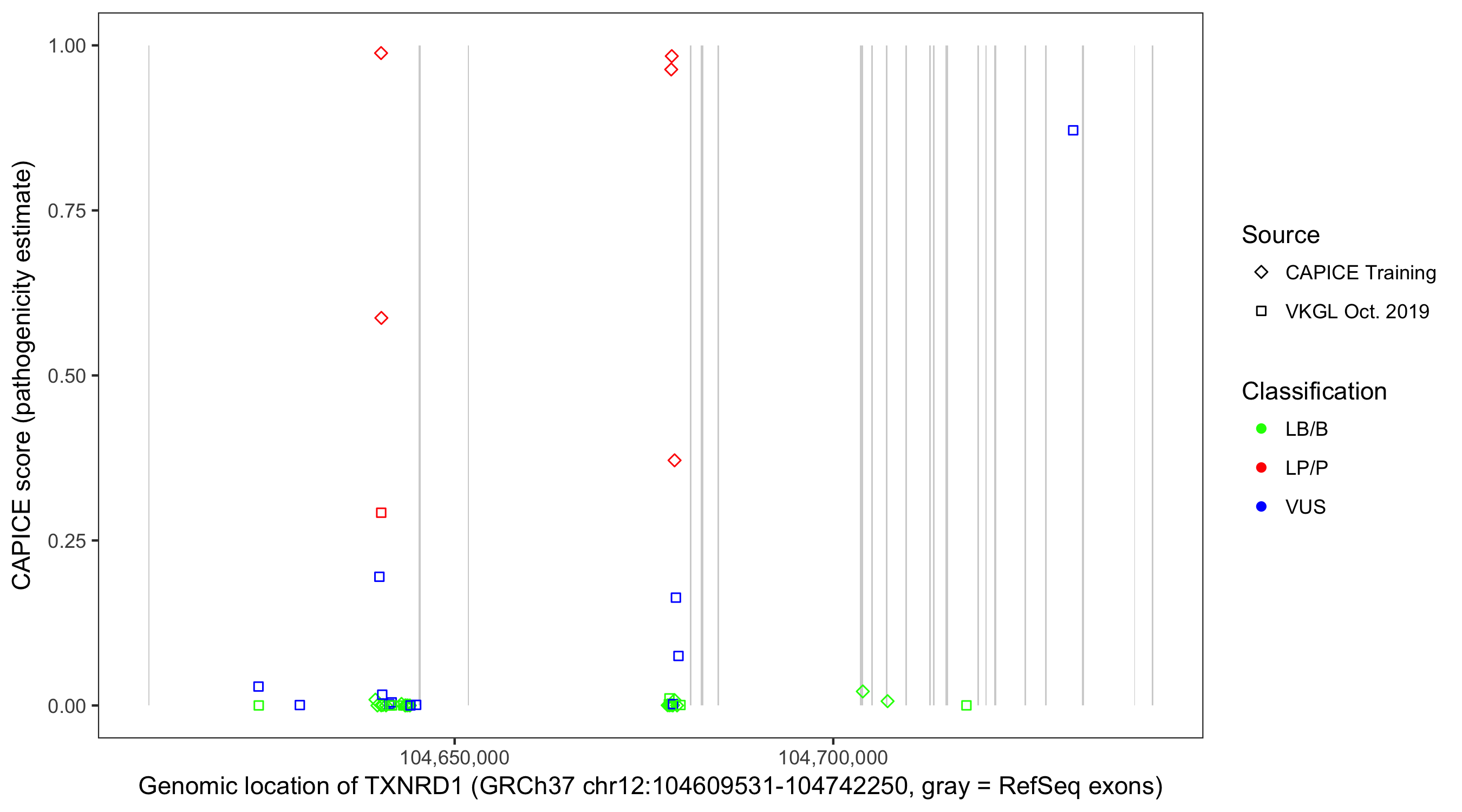 Shown are CAPICE train/test variants plus VKGL Oct 2019.