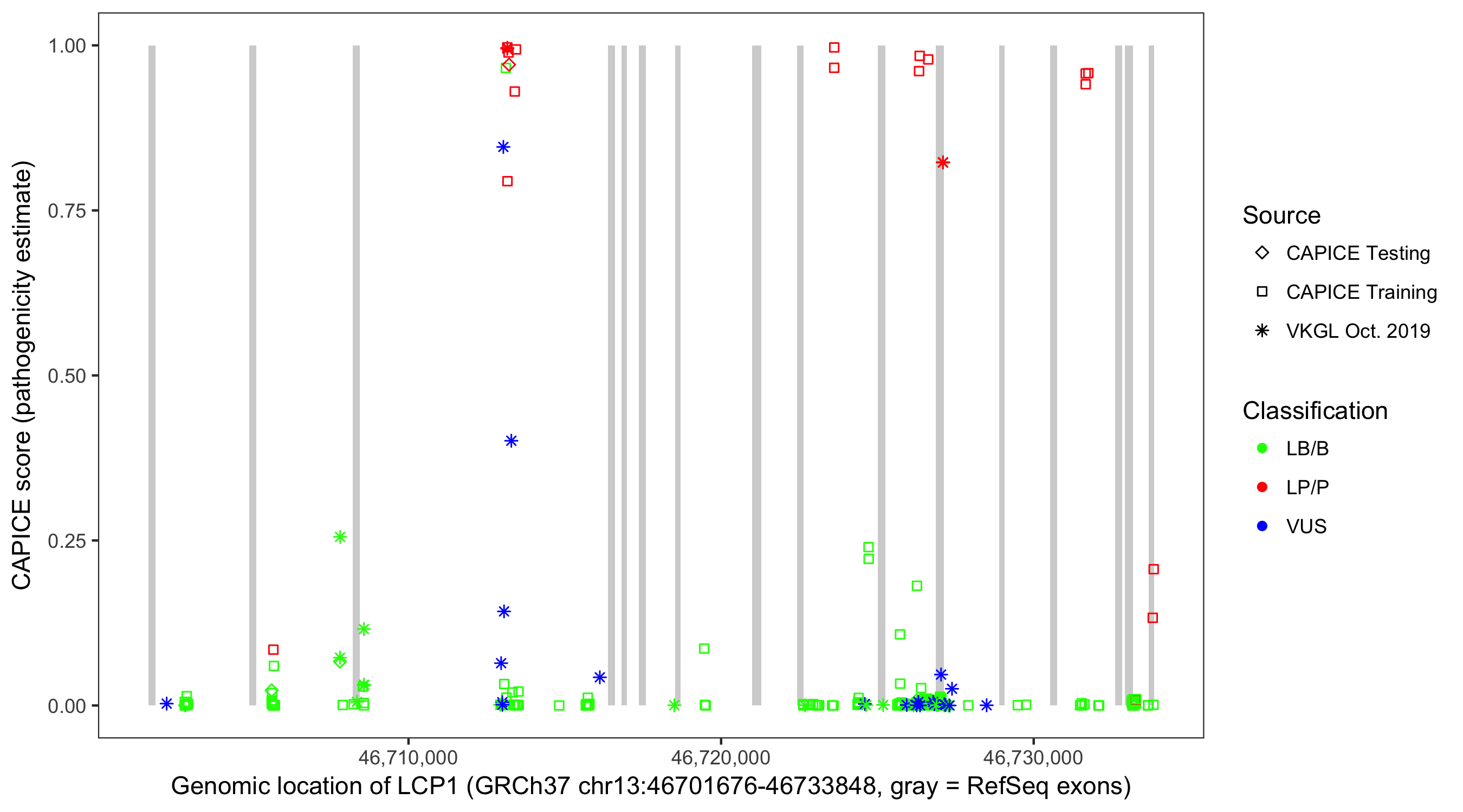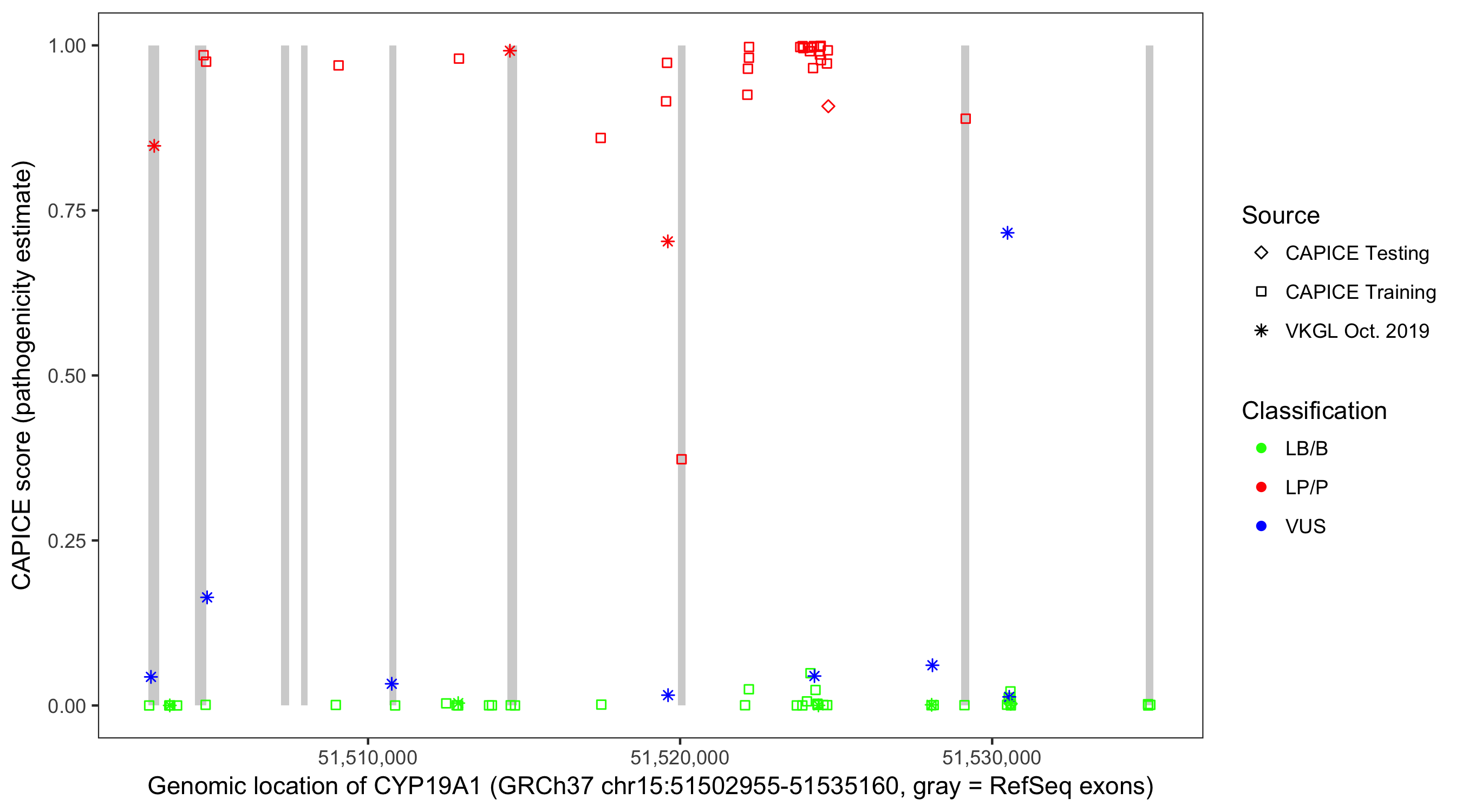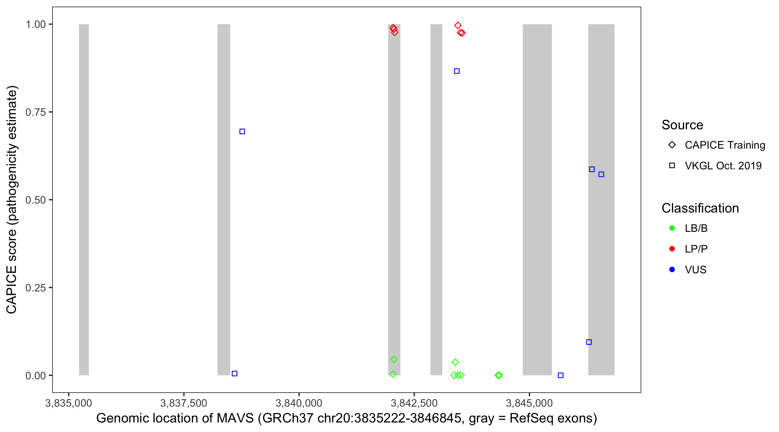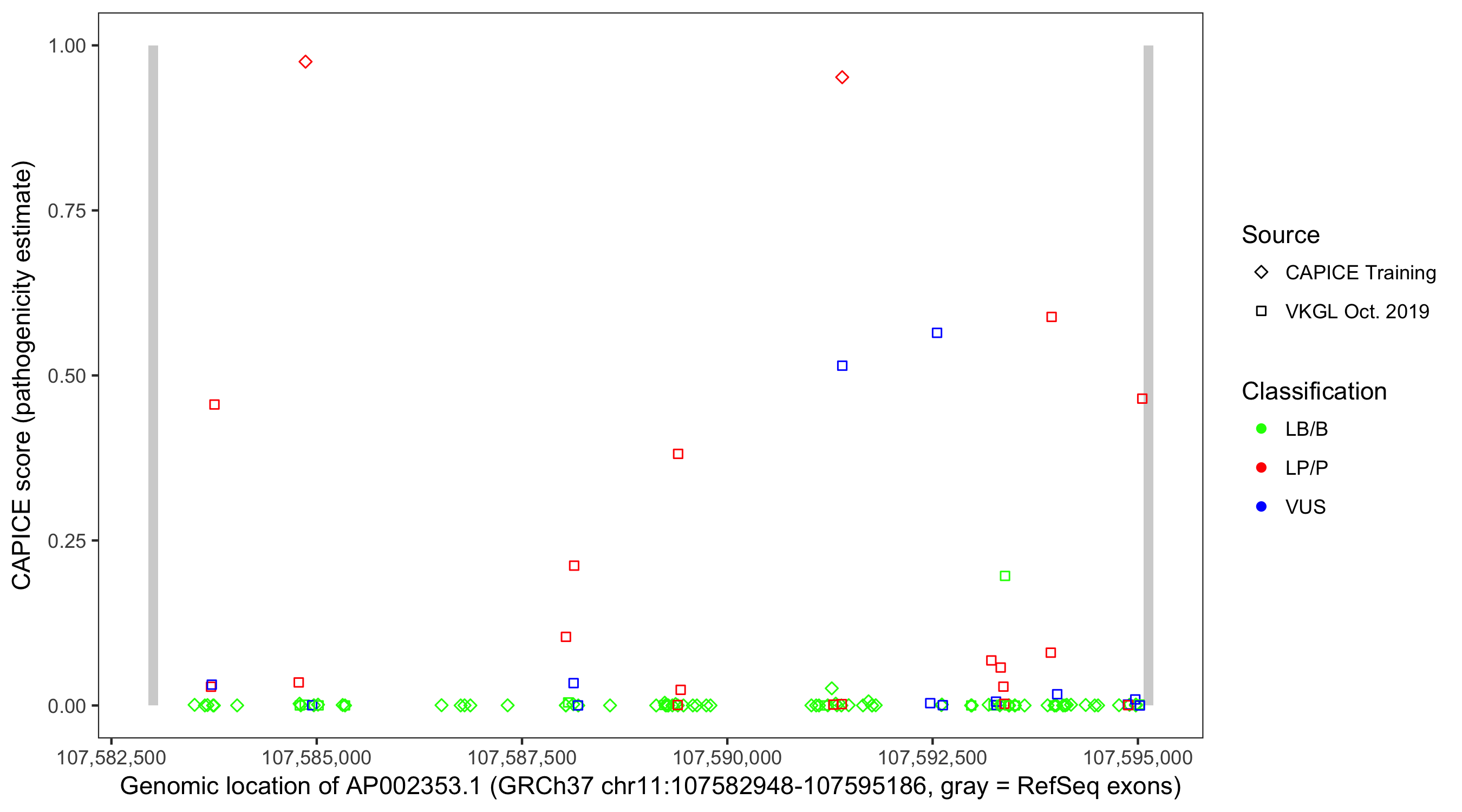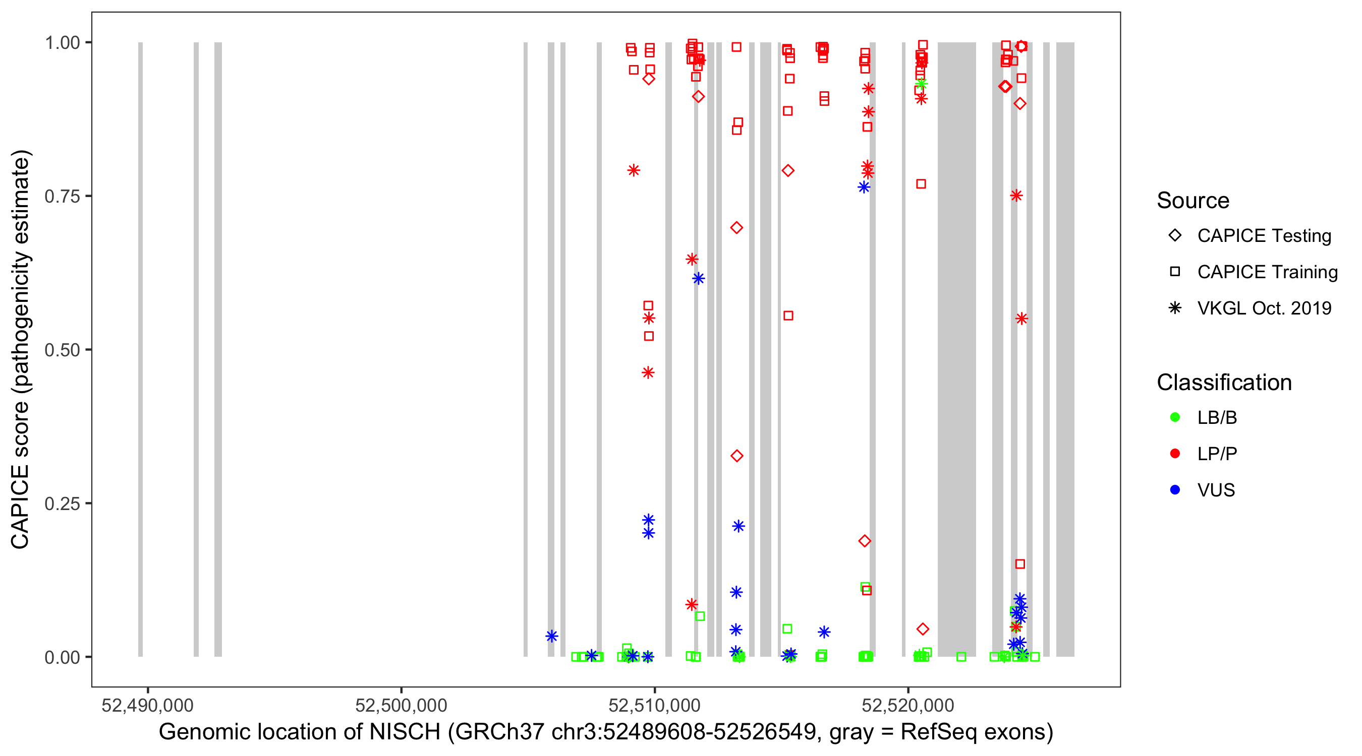 Shown are CAPICE train/test variants plus VKGL Oct 2019.