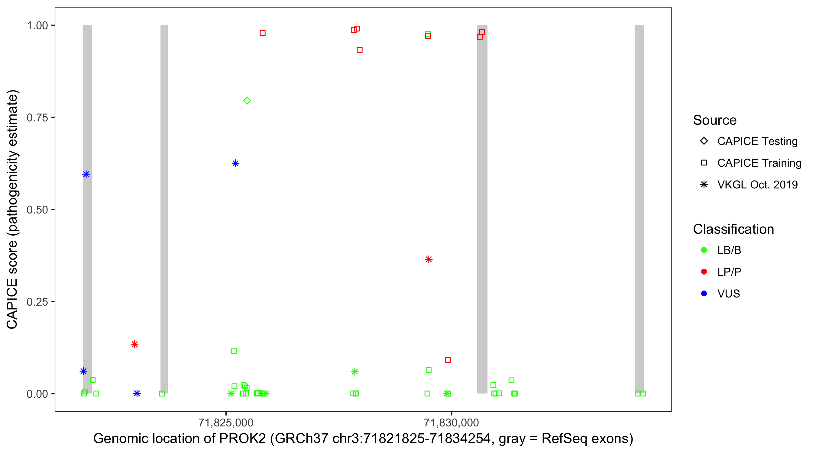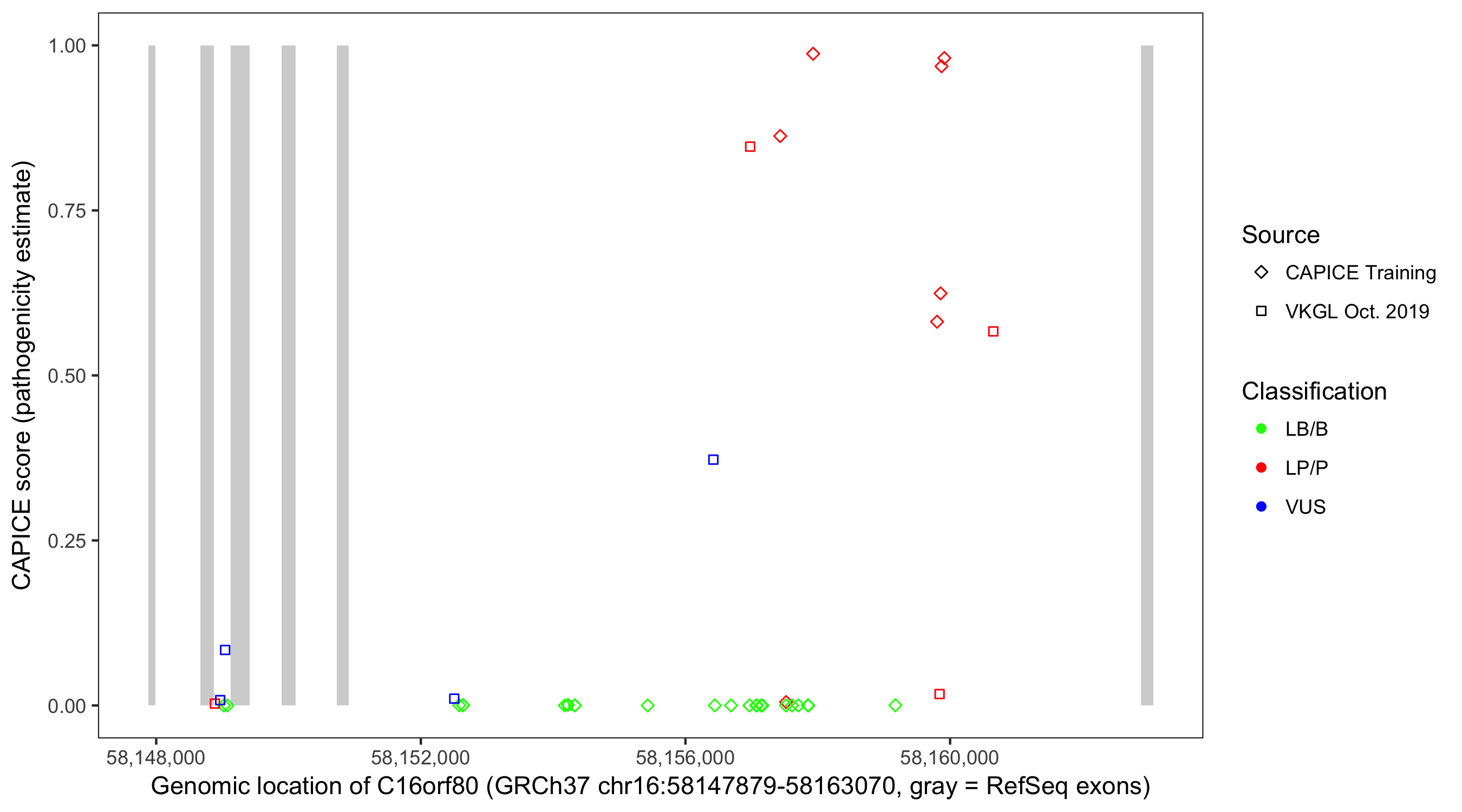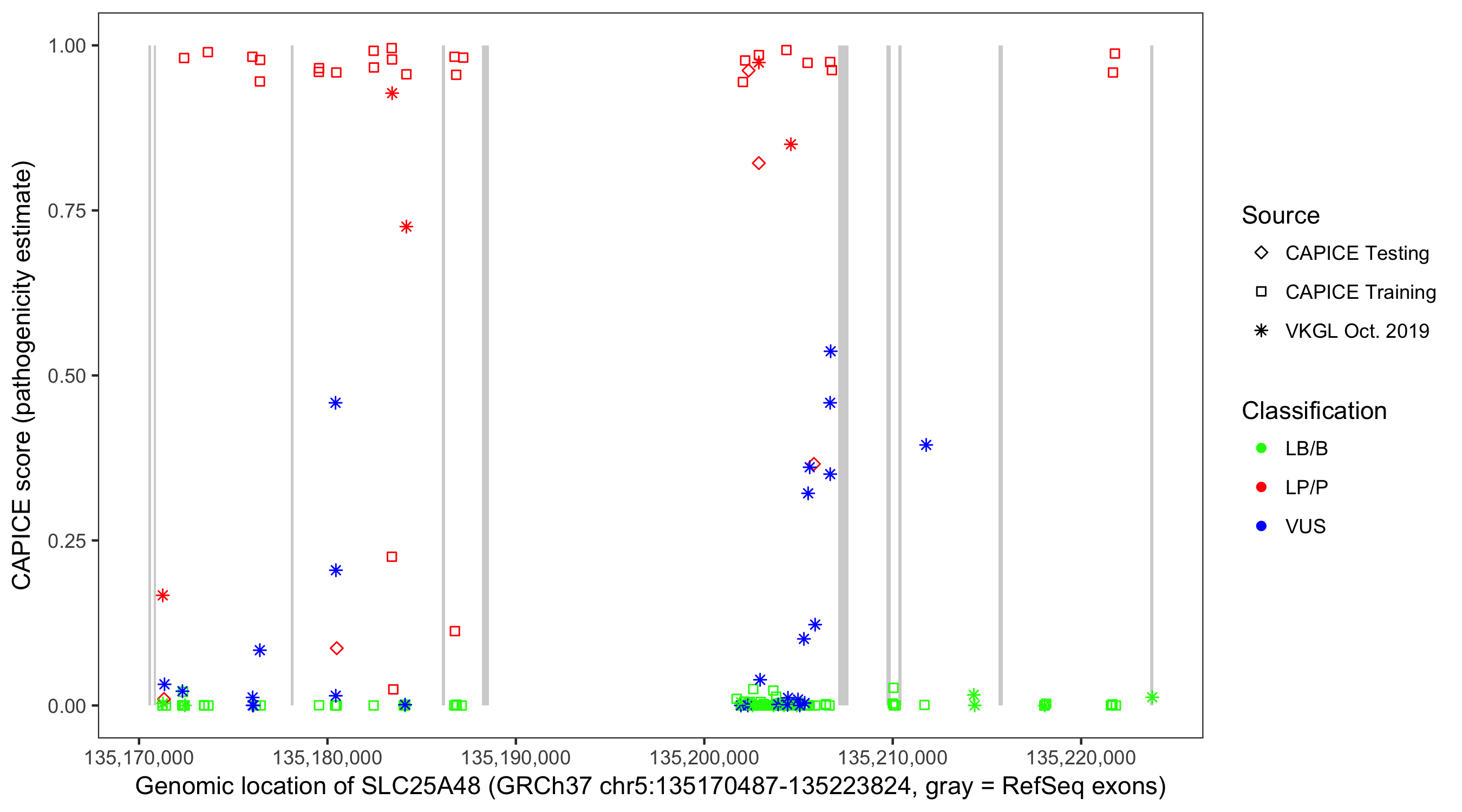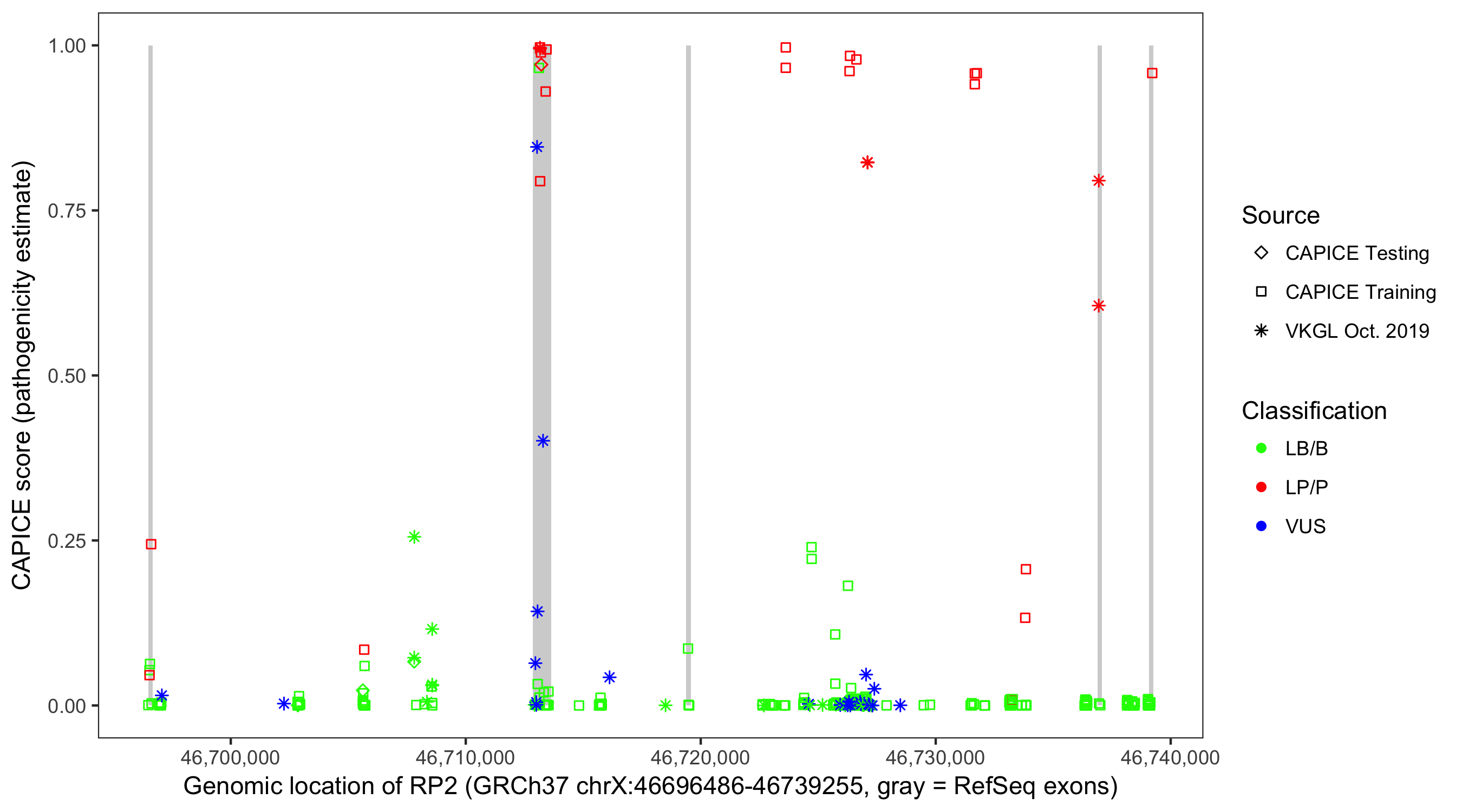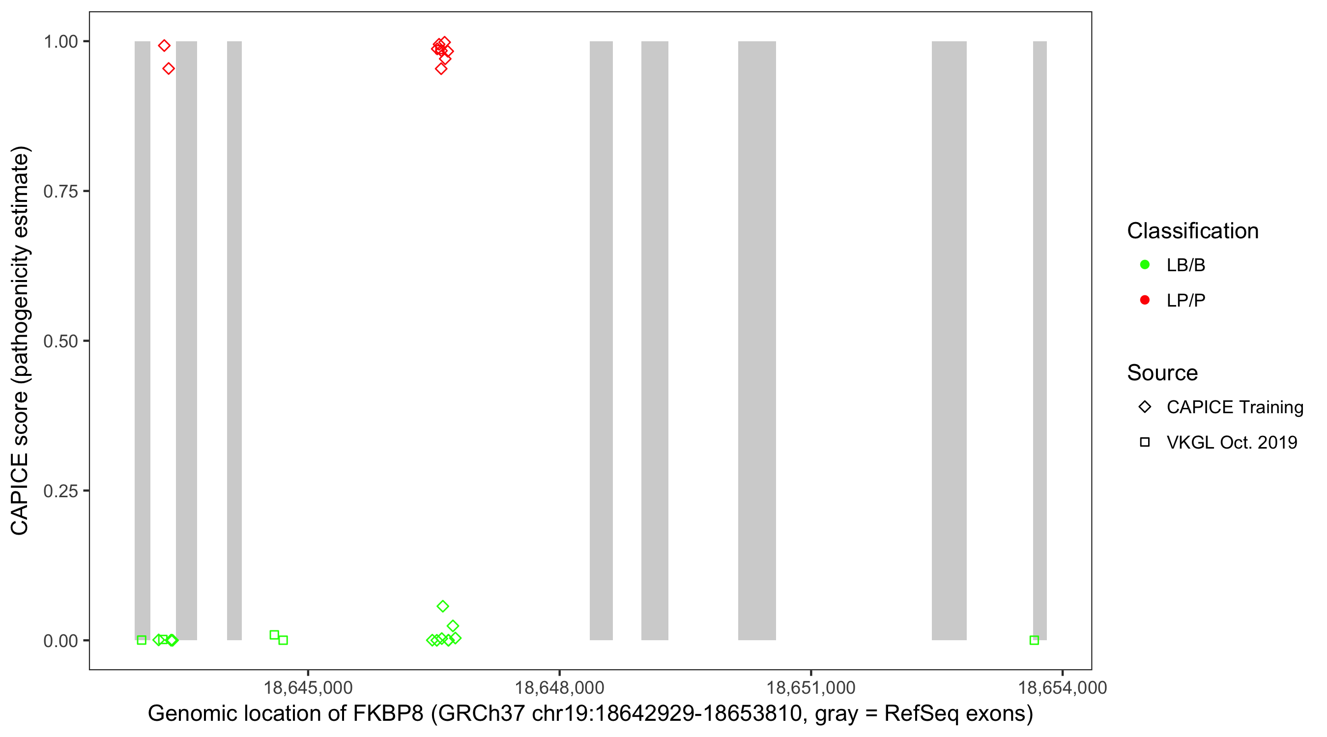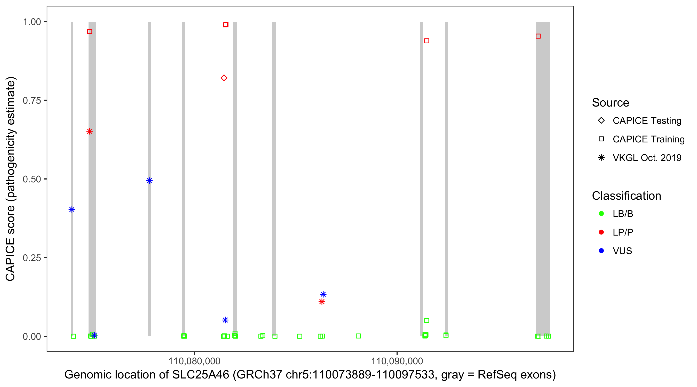 Shown are CAPICE train/test variants plus VKGL Oct 2019.