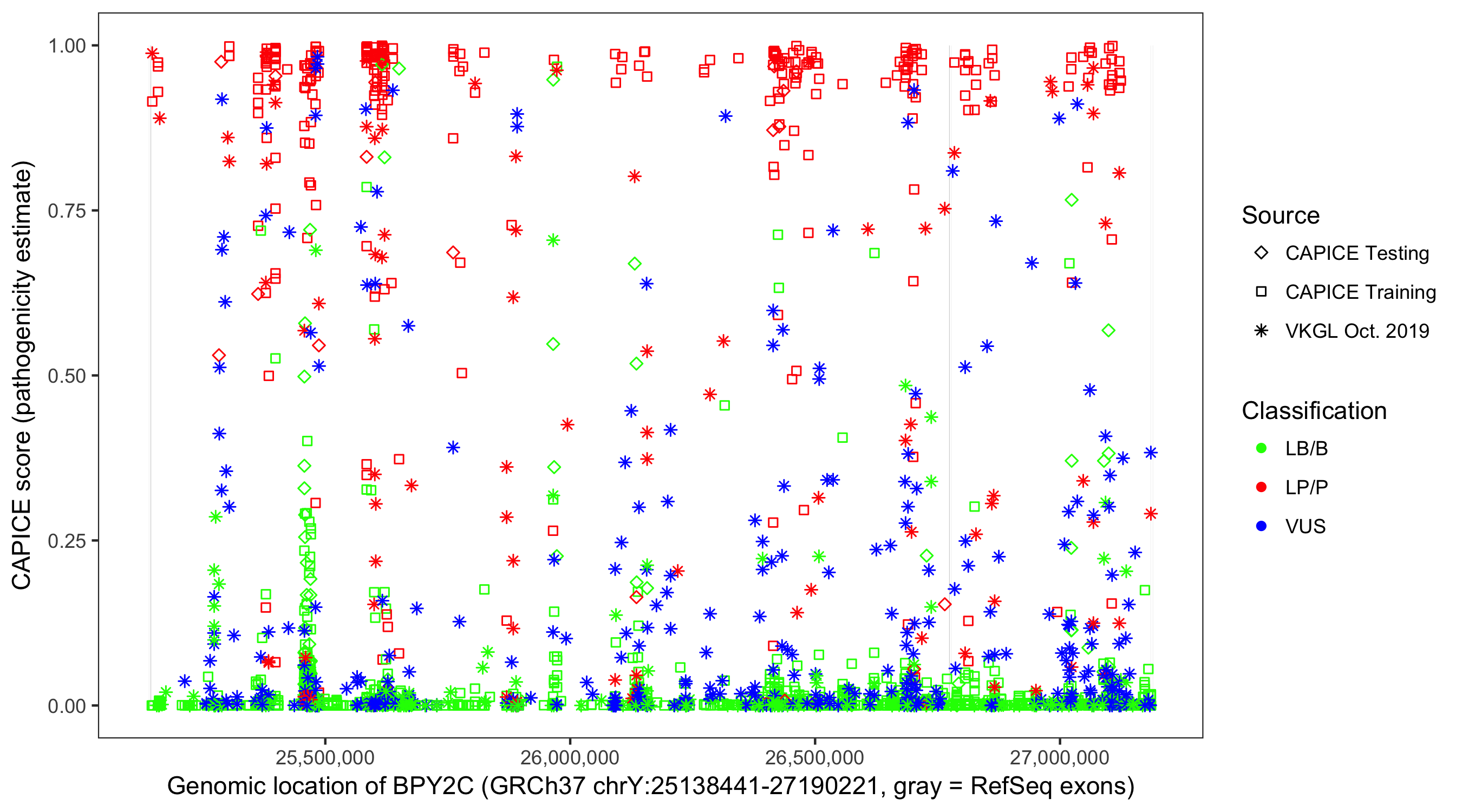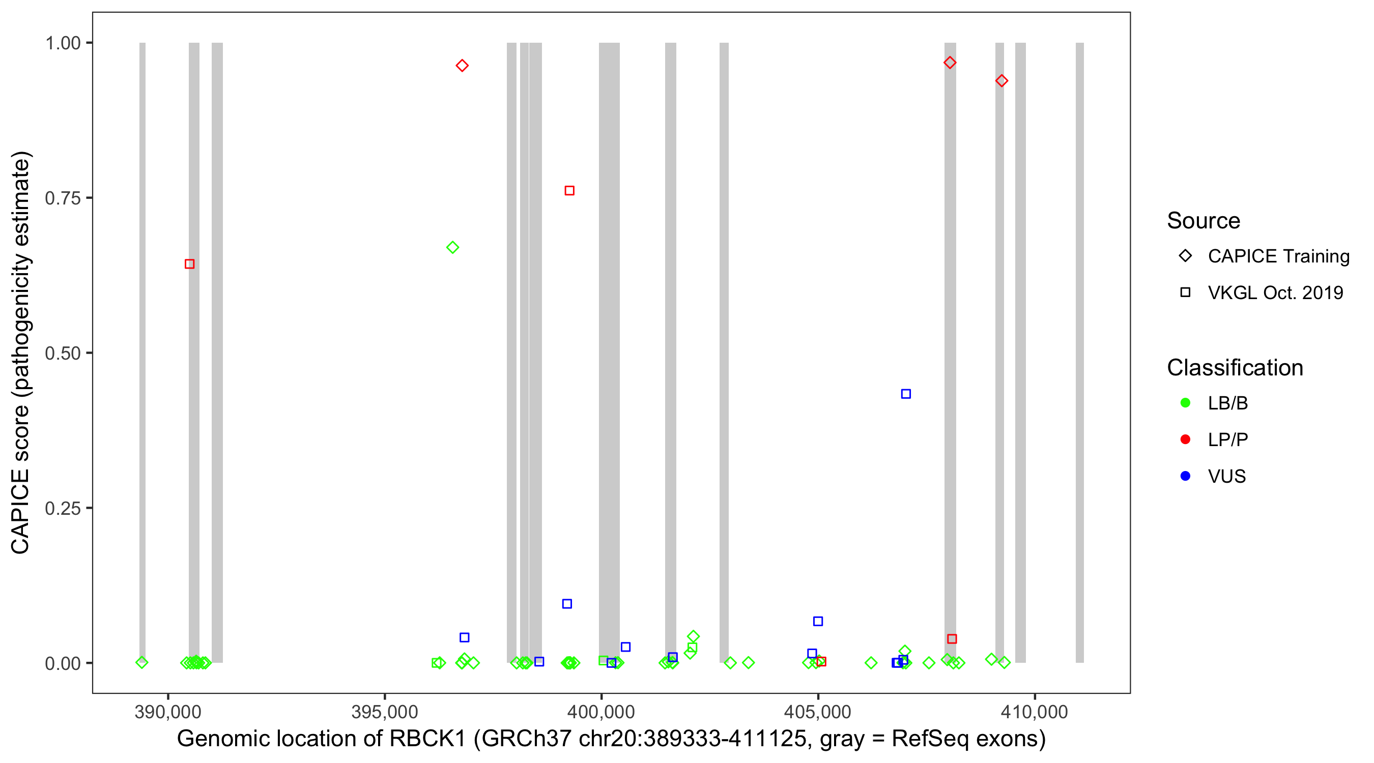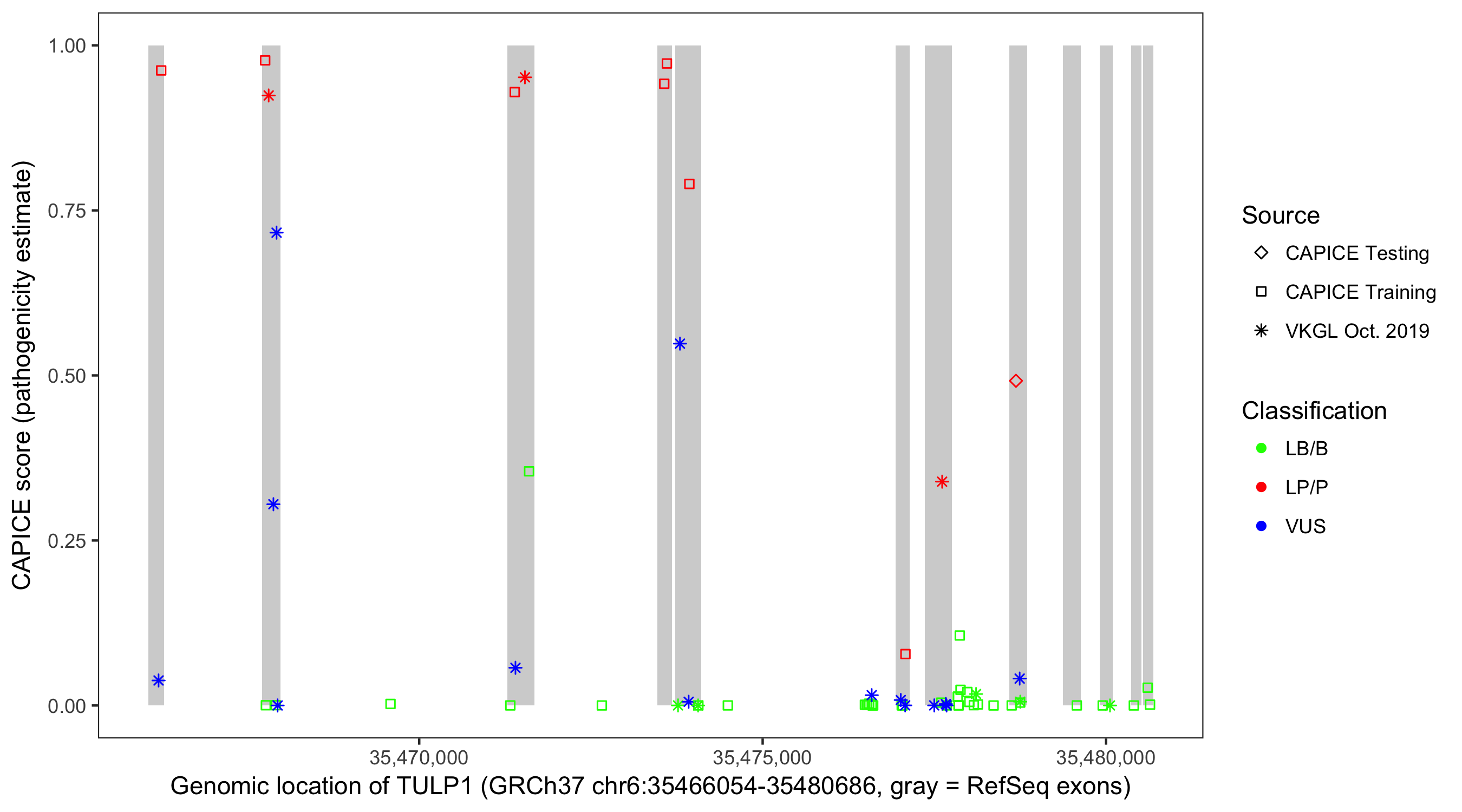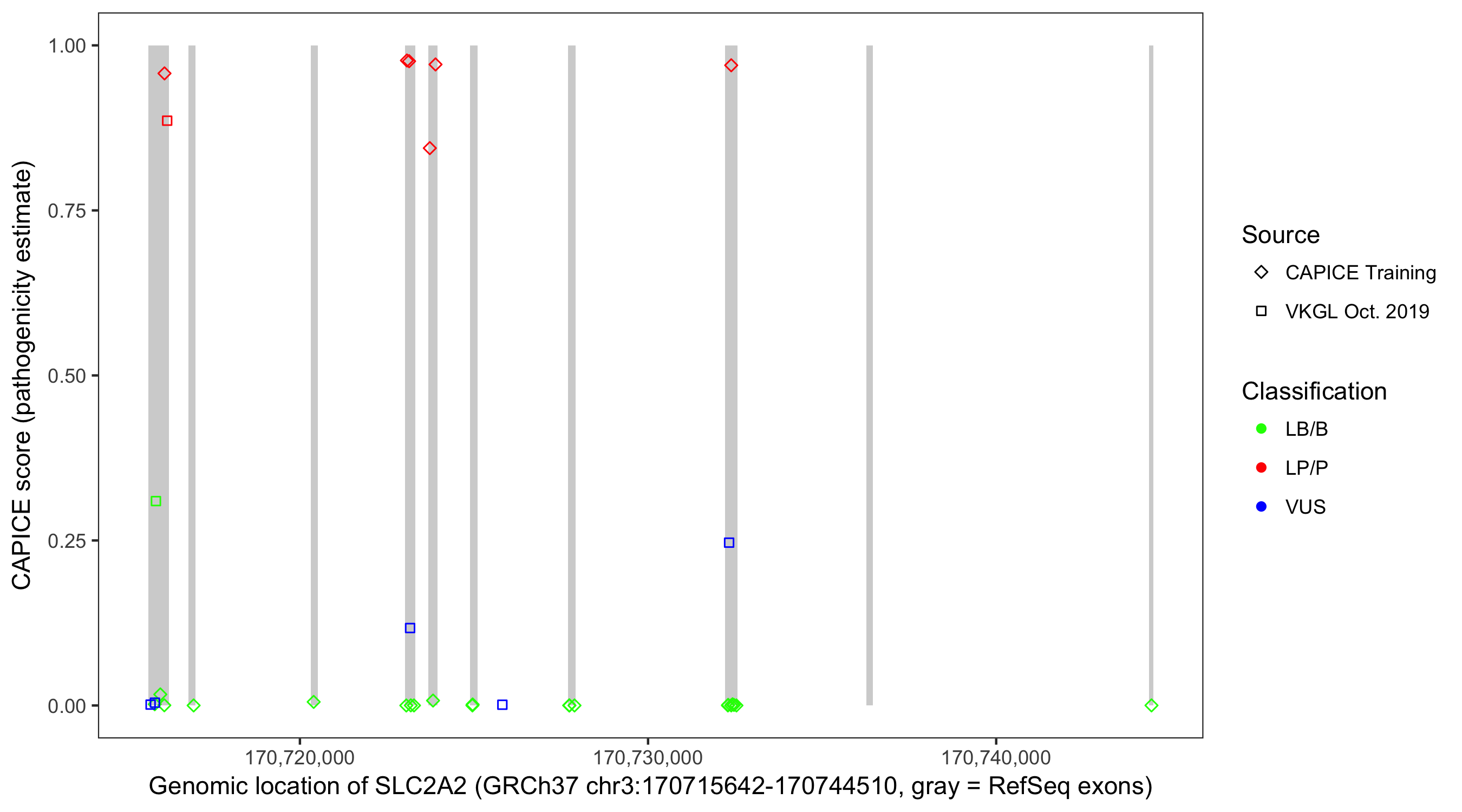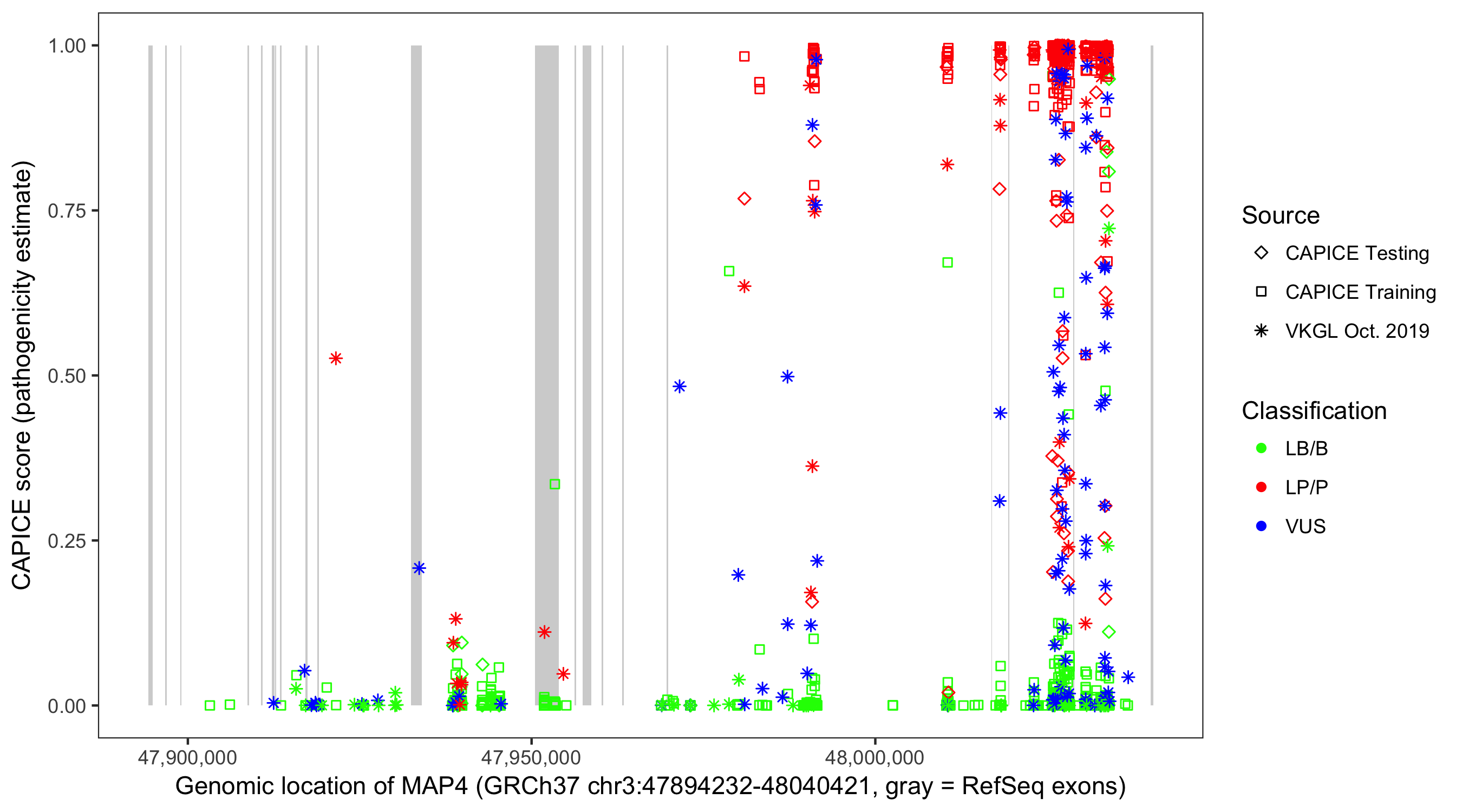Shown are CAPICE train/test variants plus VKGL Oct 2019.