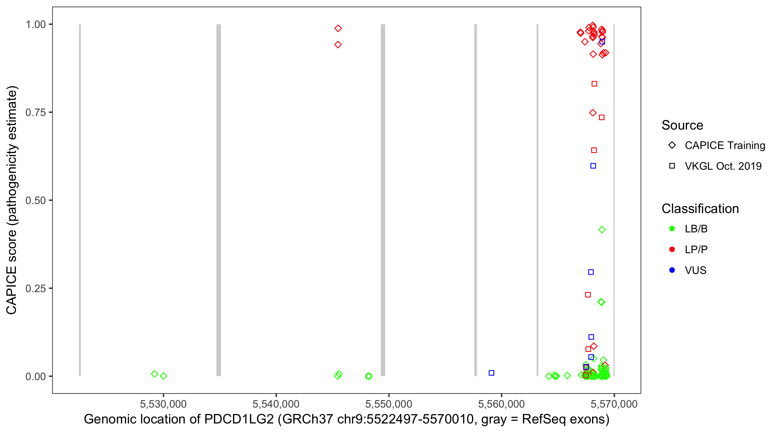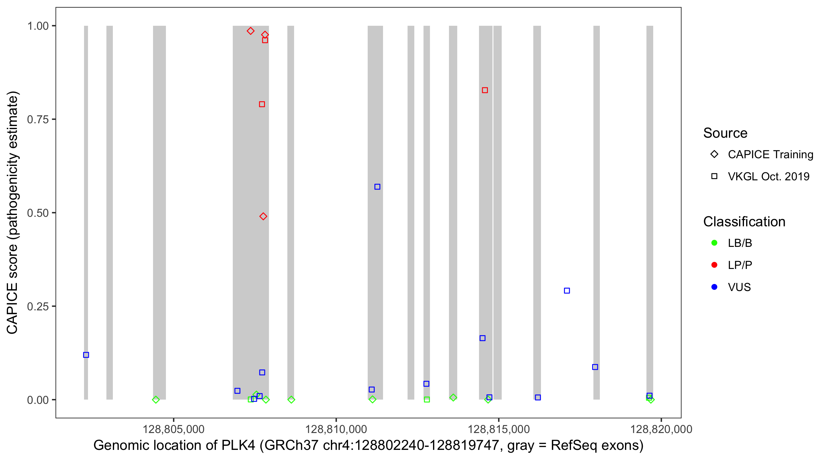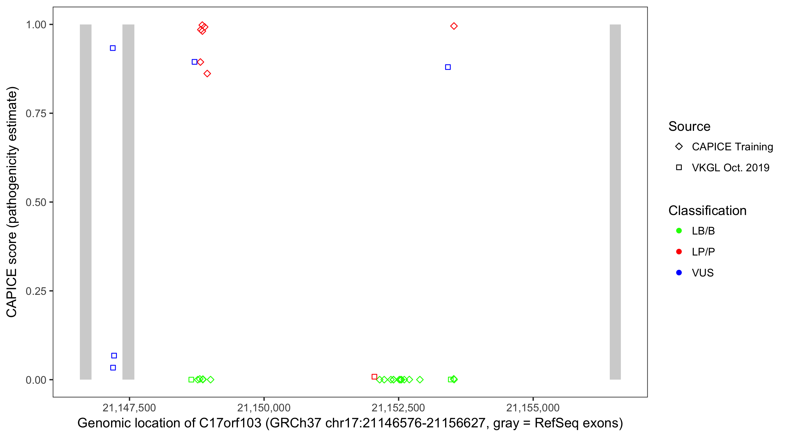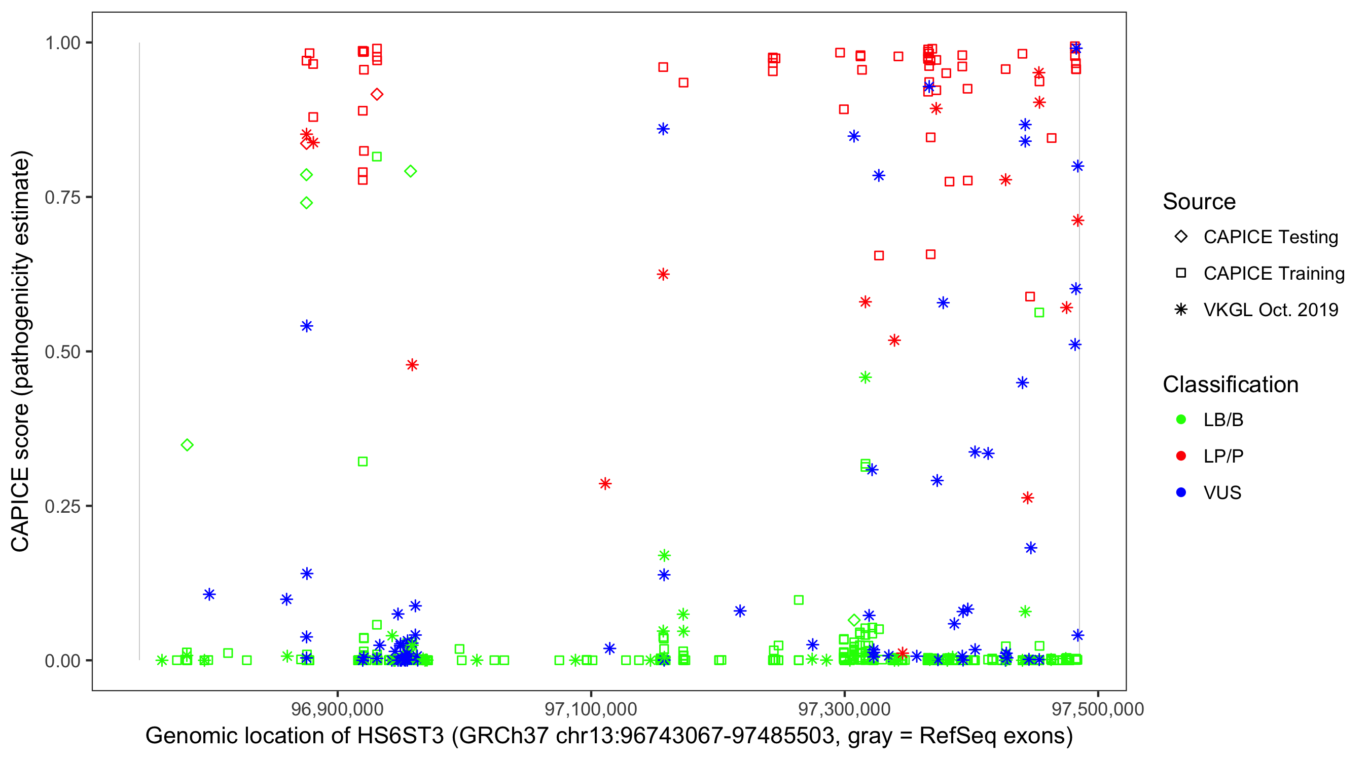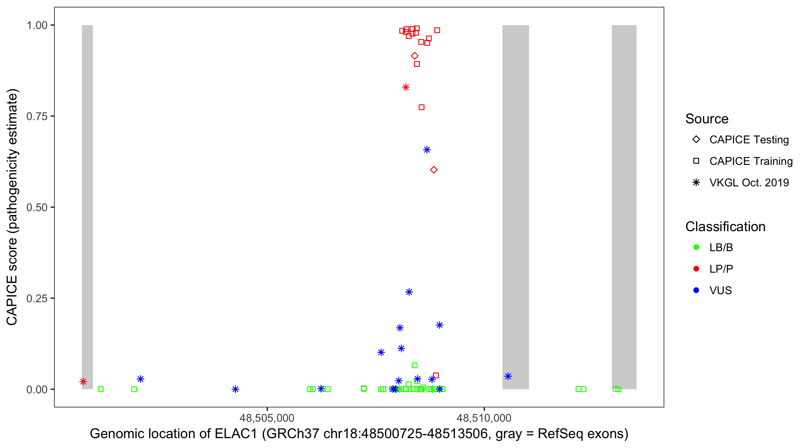 Shown are CAPICE train/test variants plus VKGL Oct 2019.