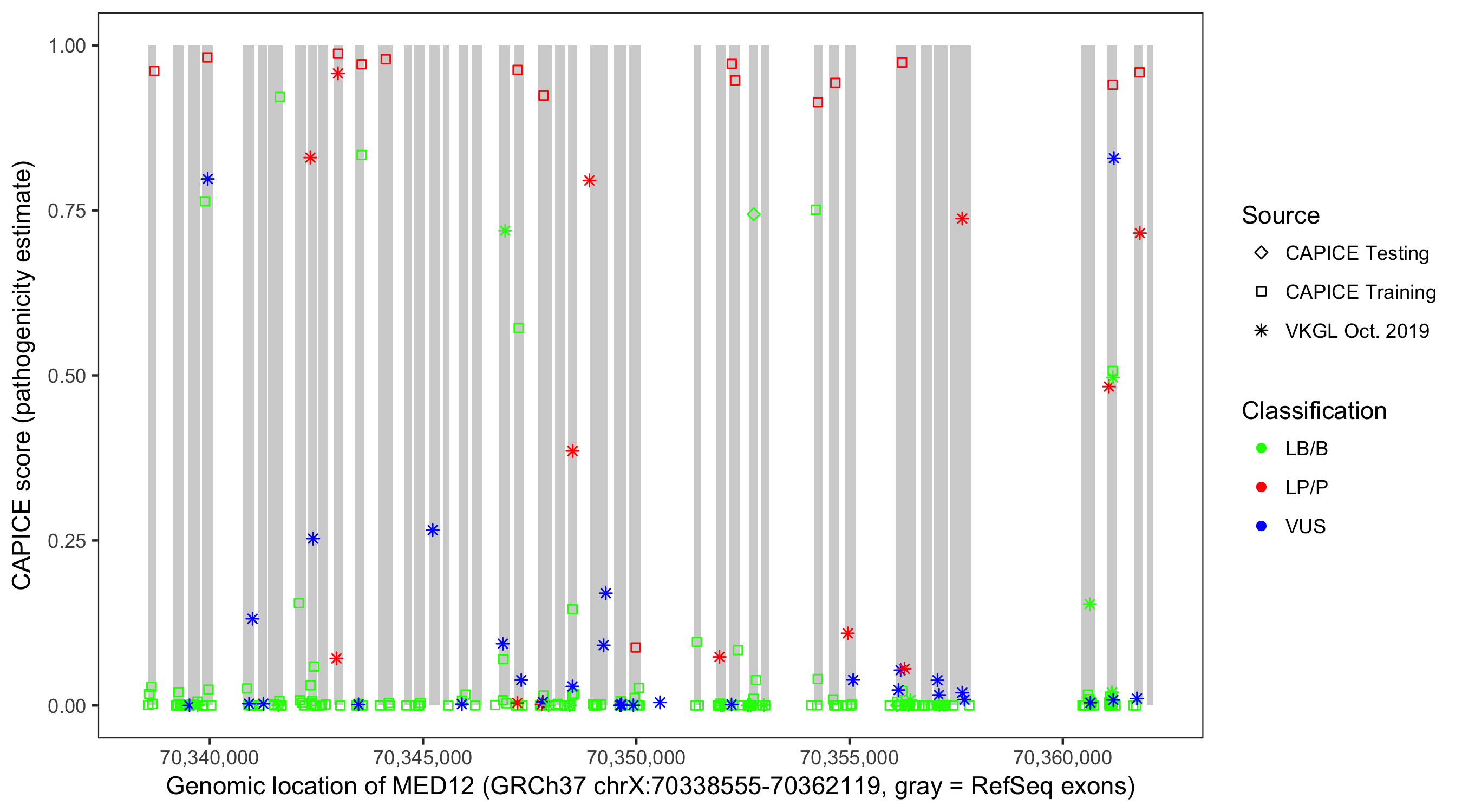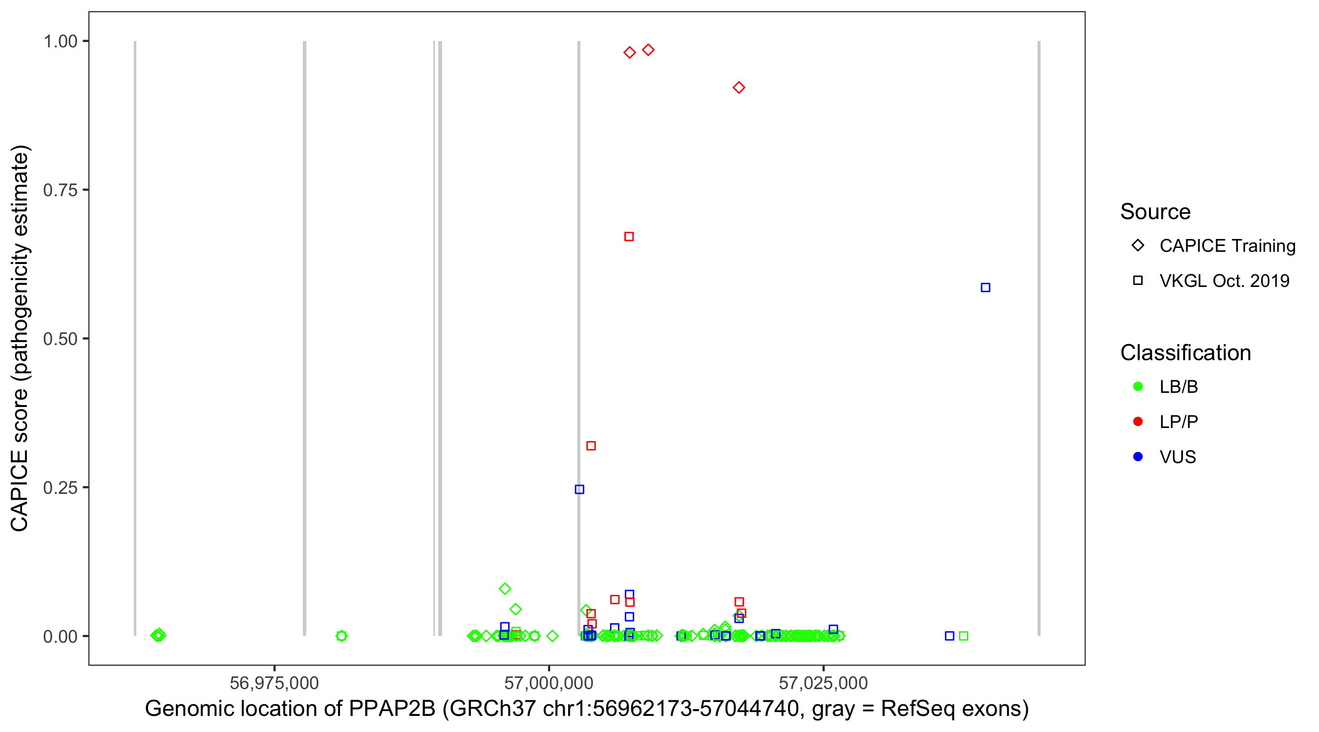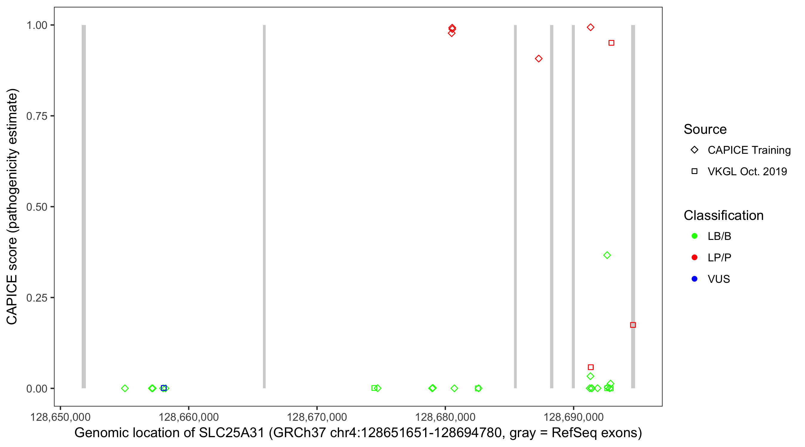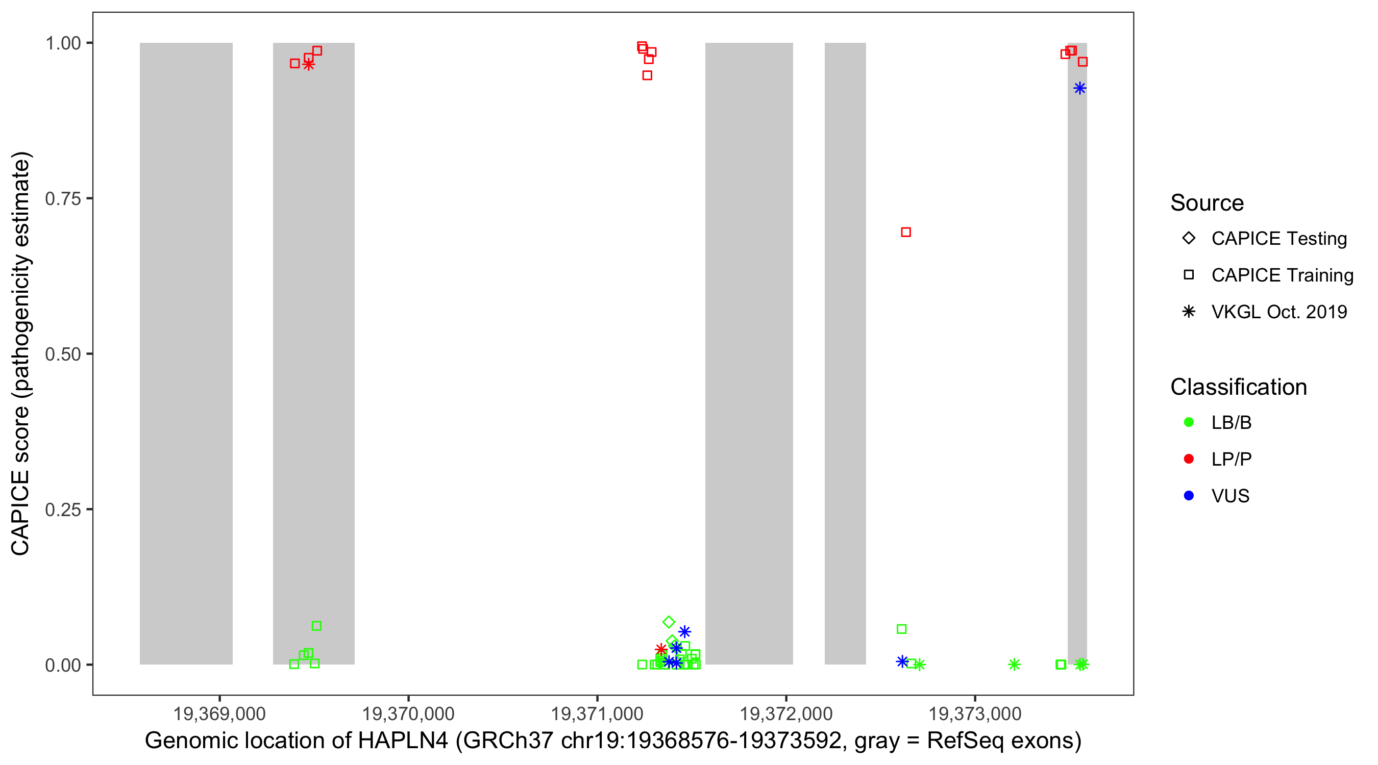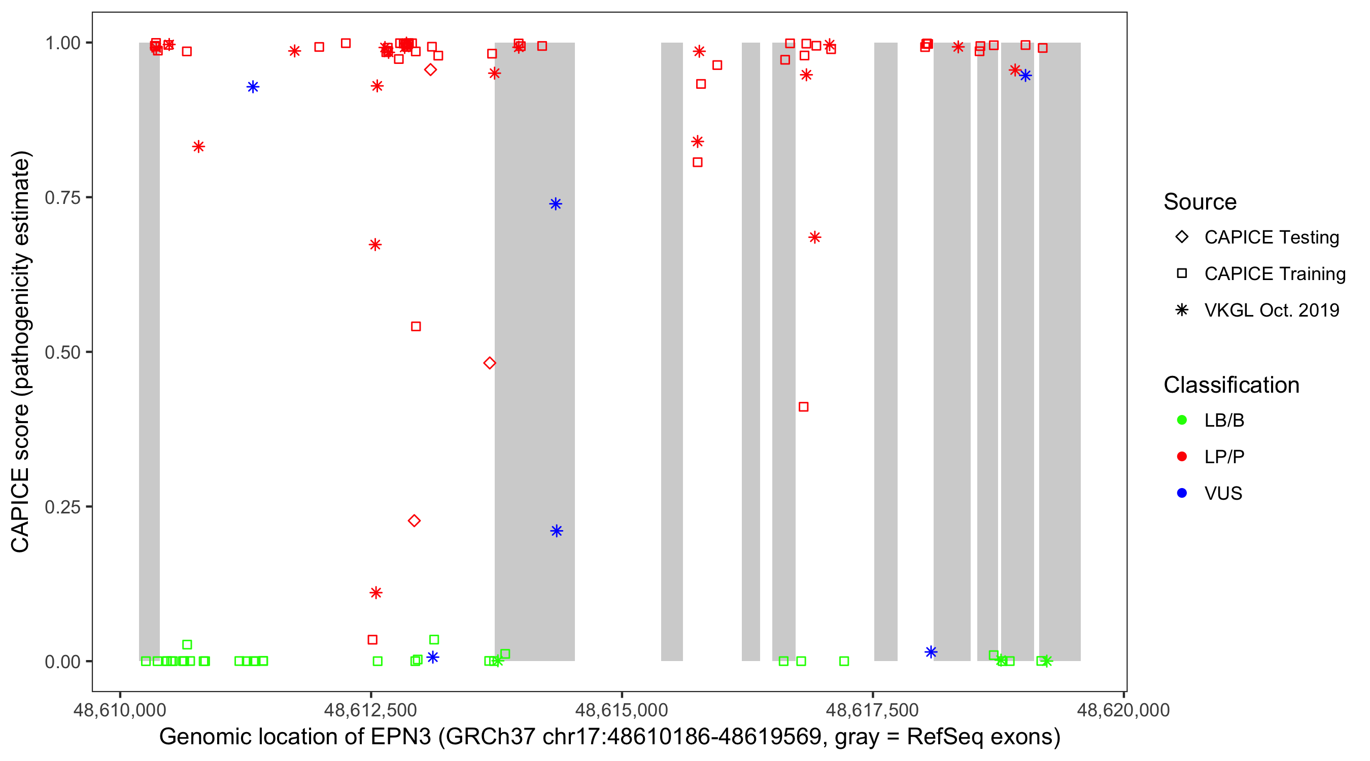 Shown are CAPICE train/test variants plus VKGL Oct 2019.