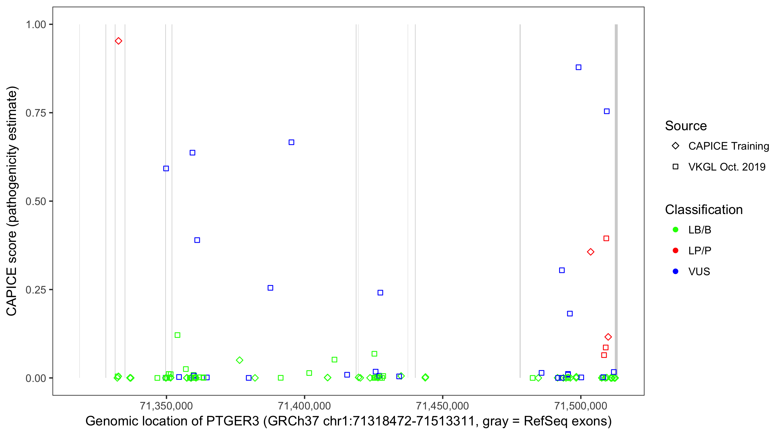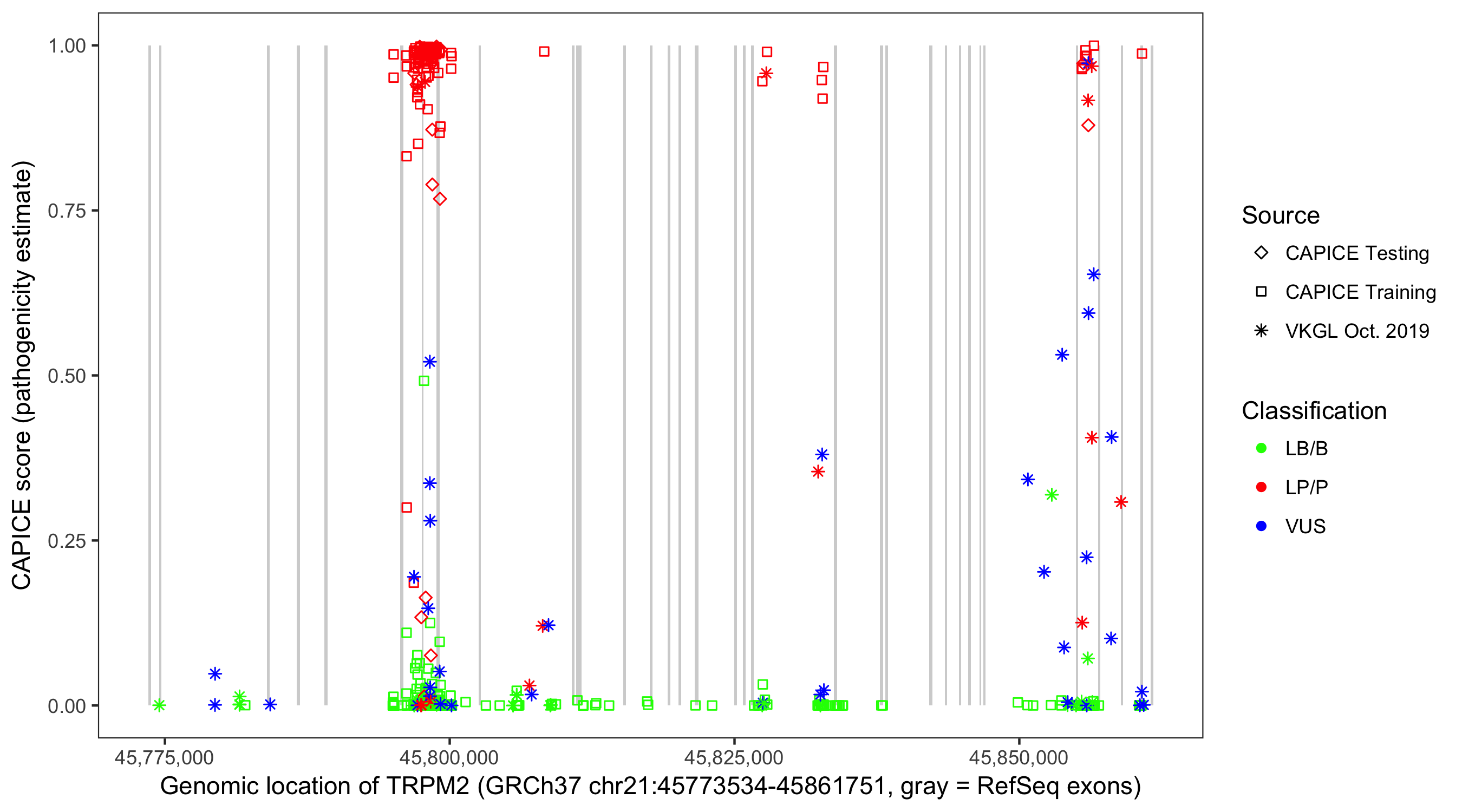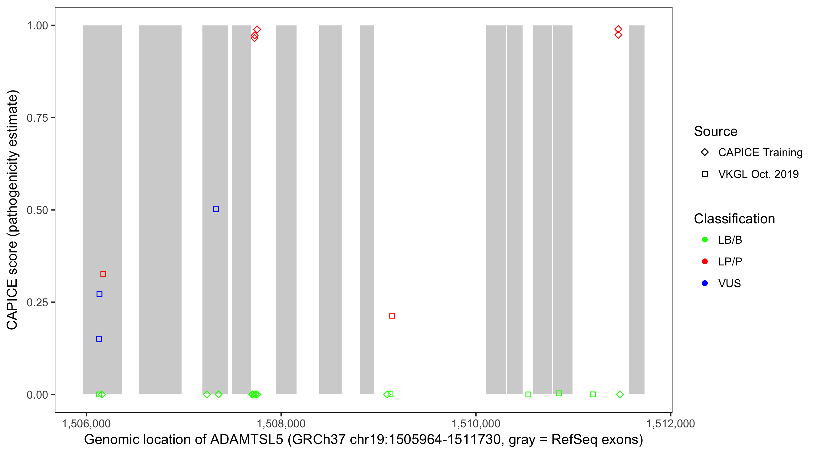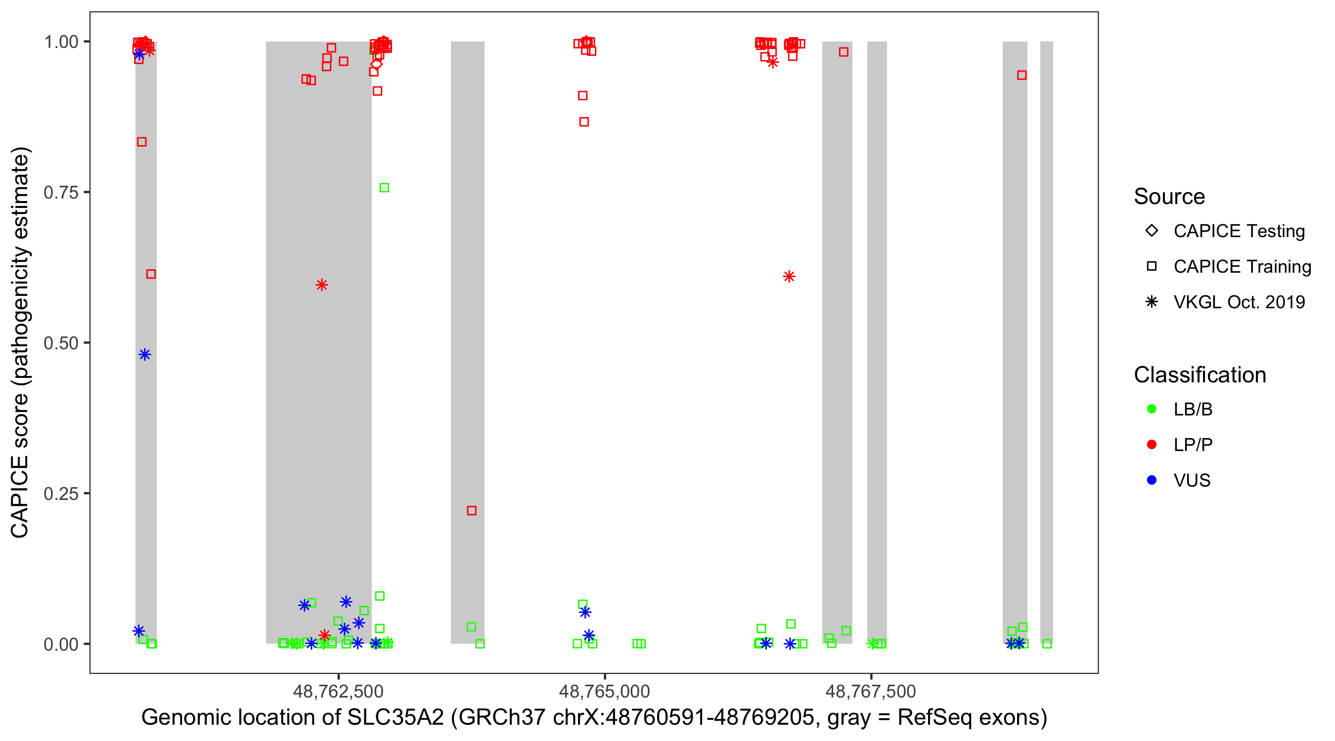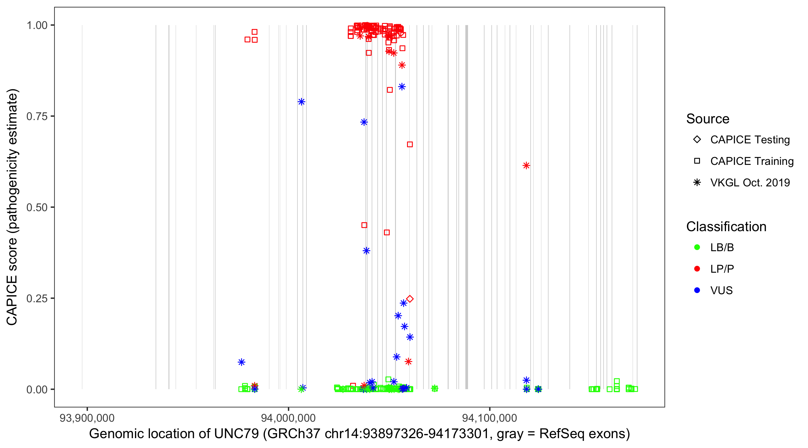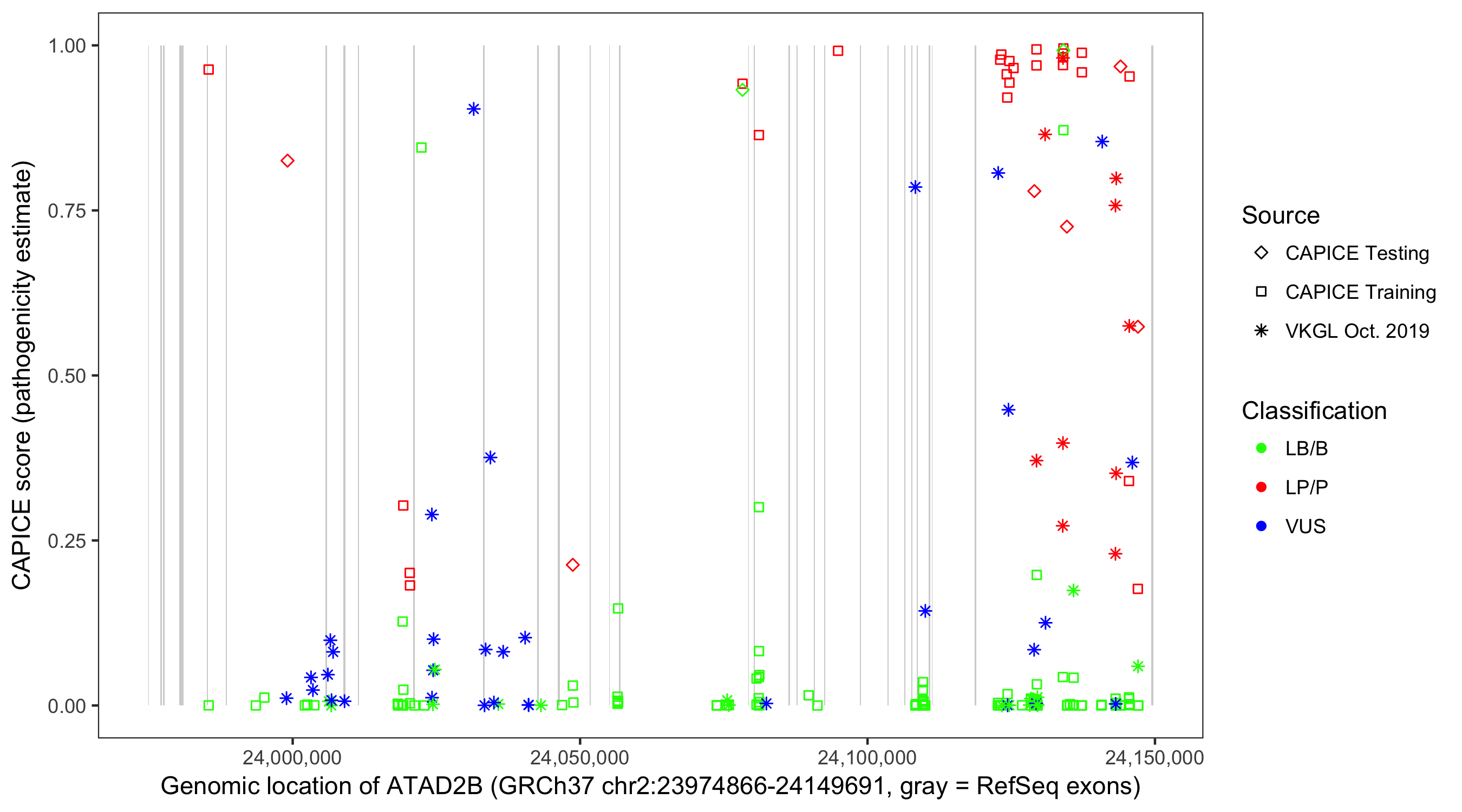 Shown are CAPICE train/test variants plus VKGL Oct 2019.