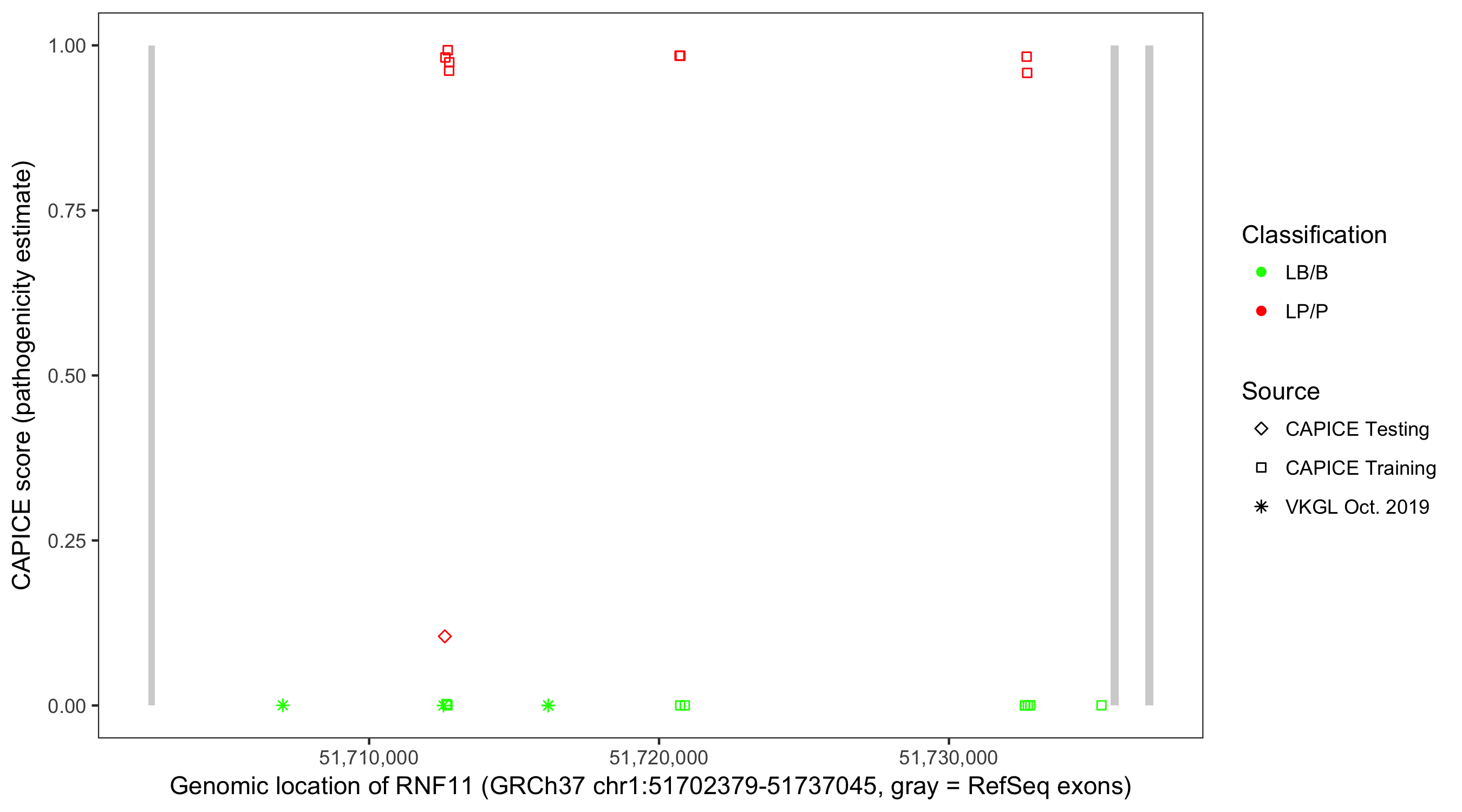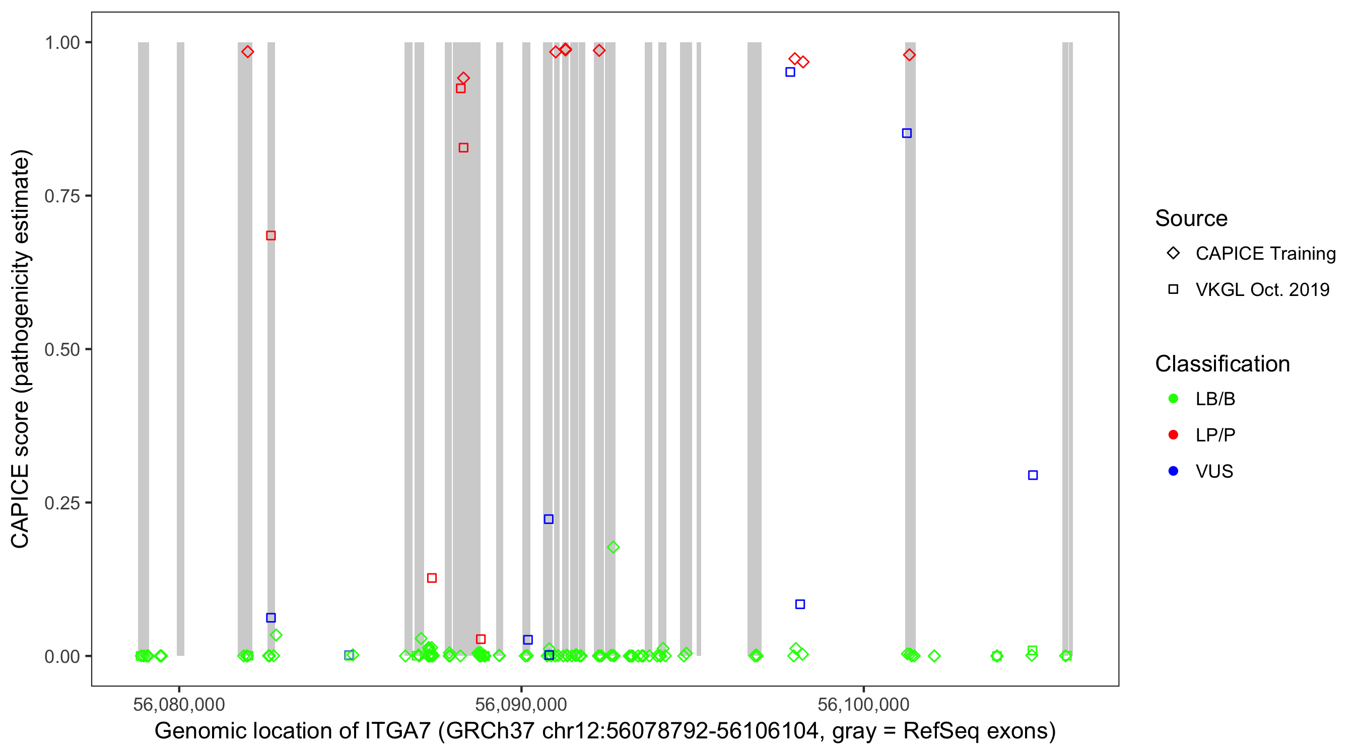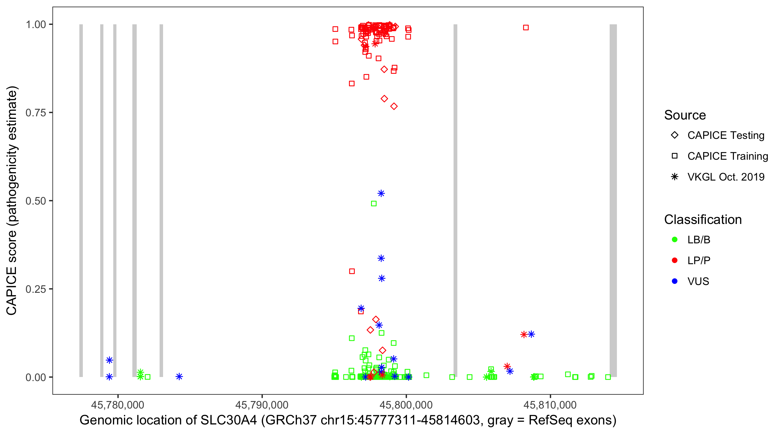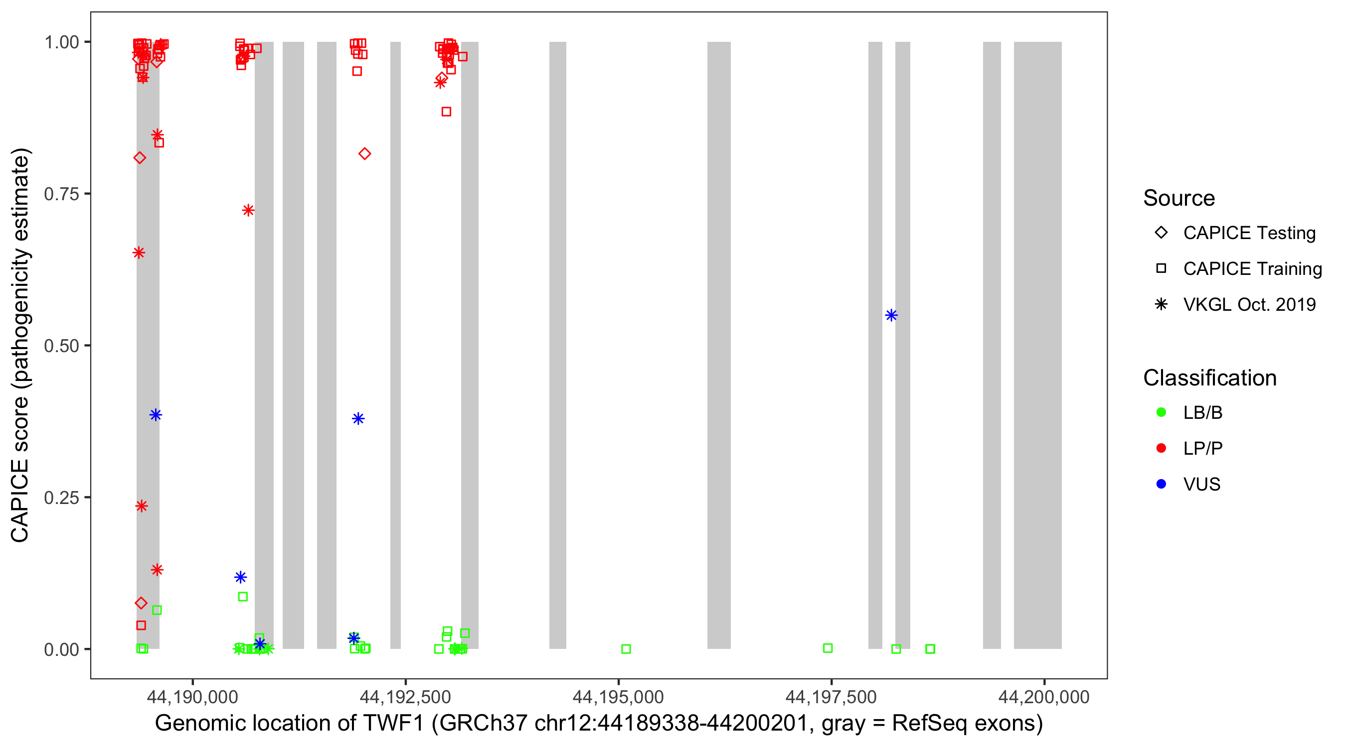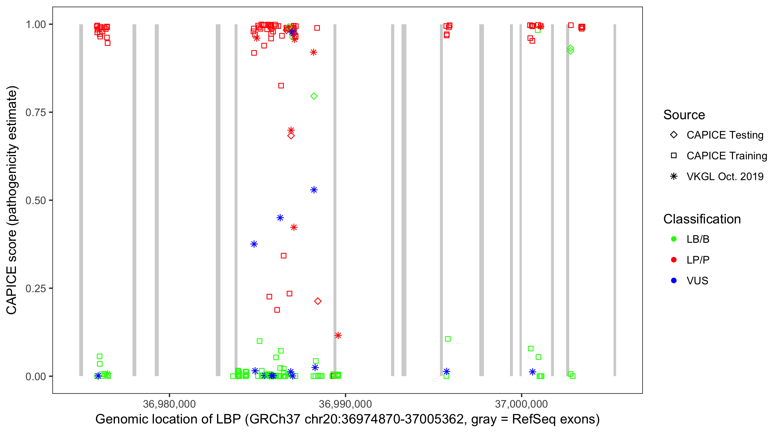 Shown are CAPICE train/test variants plus VKGL Oct 2019.