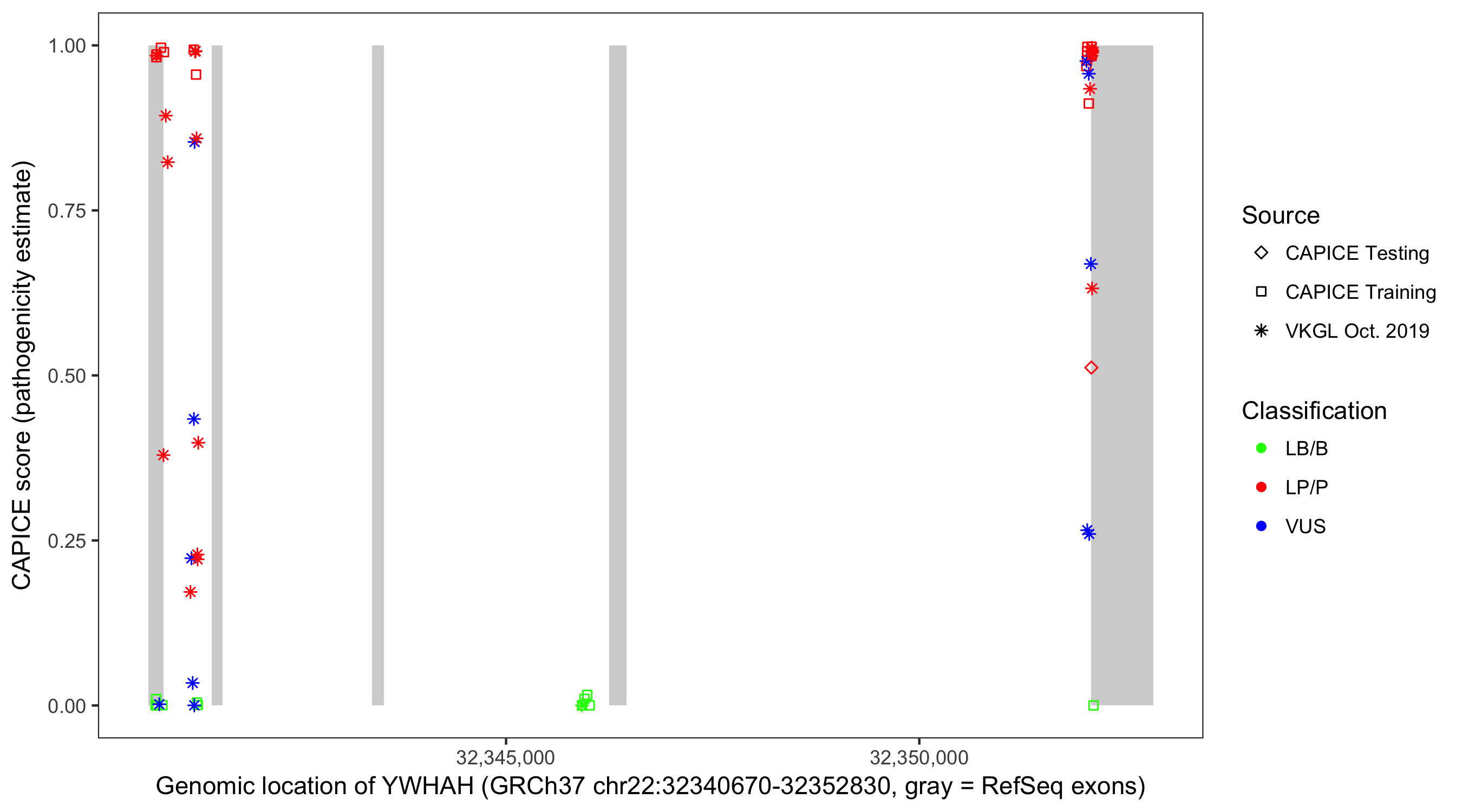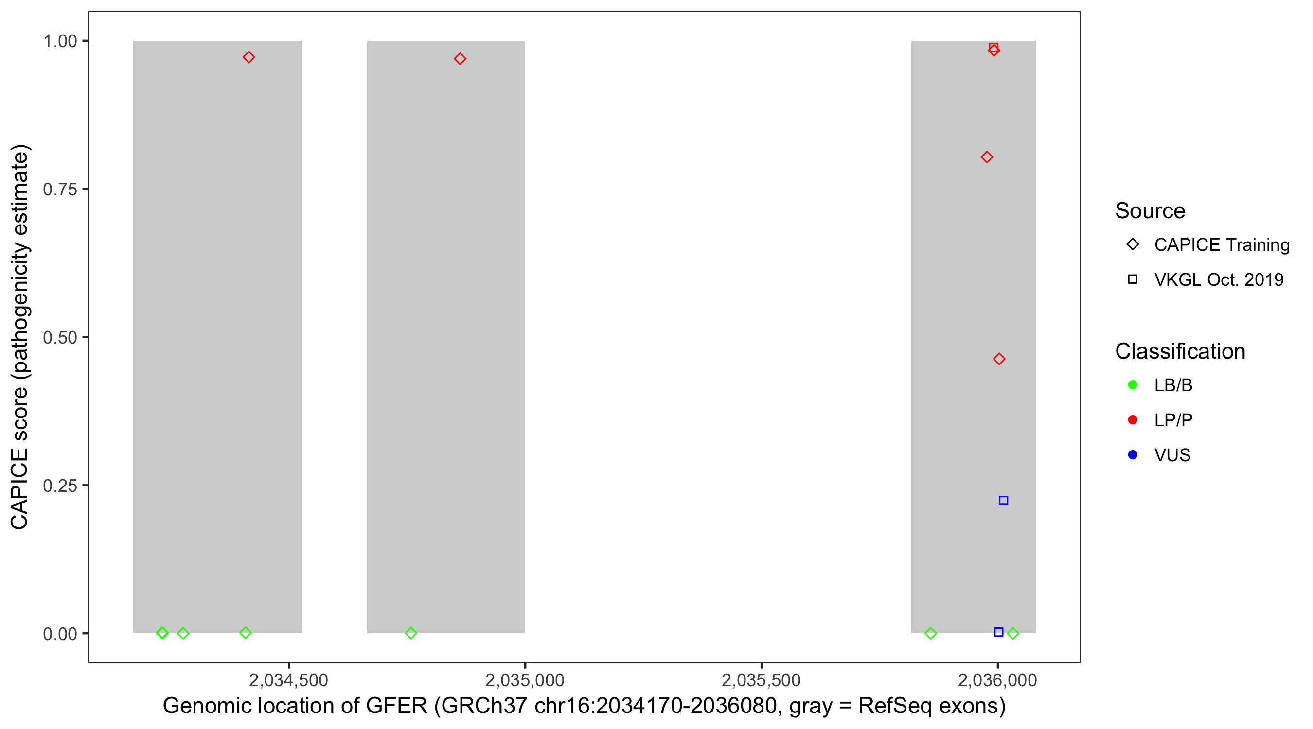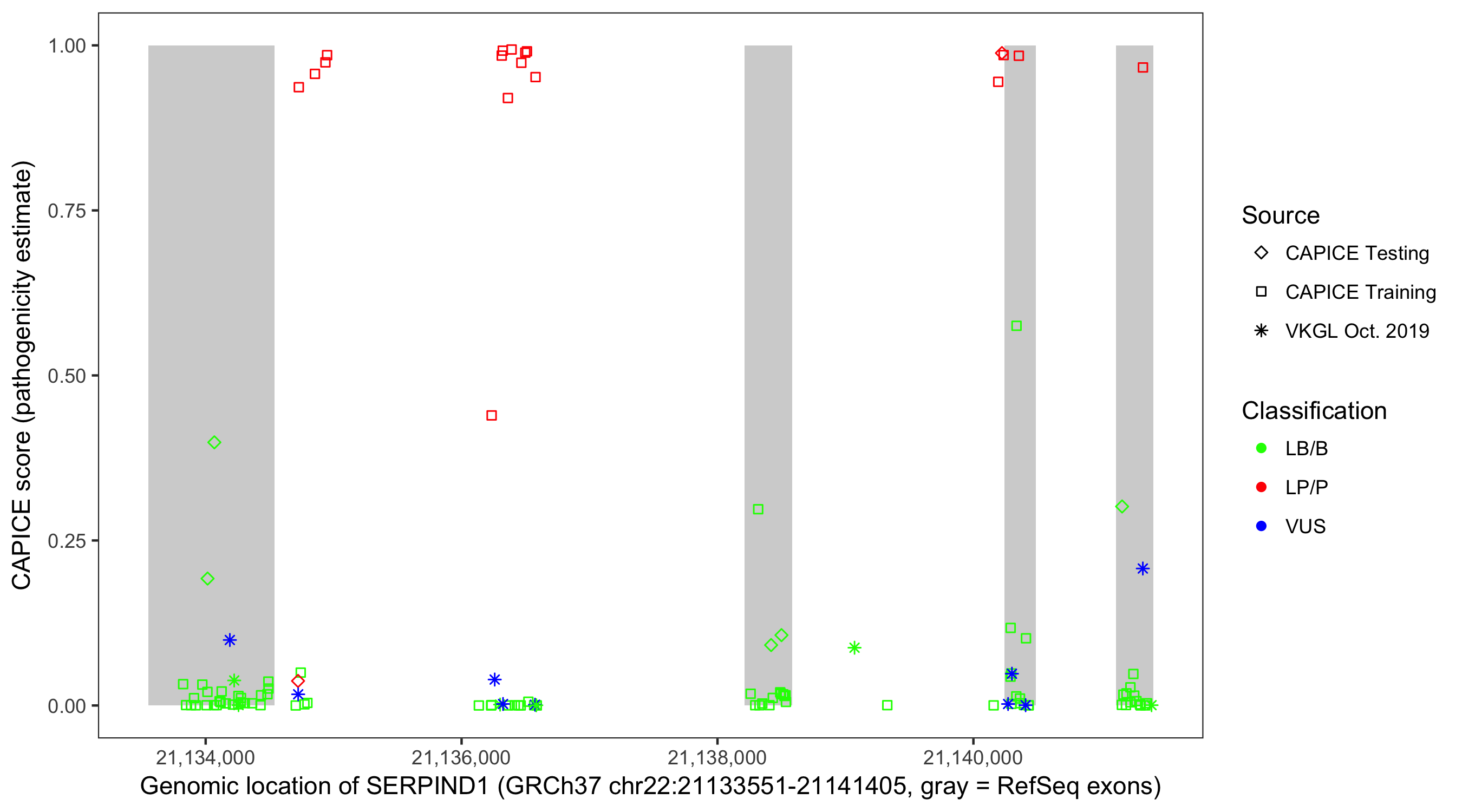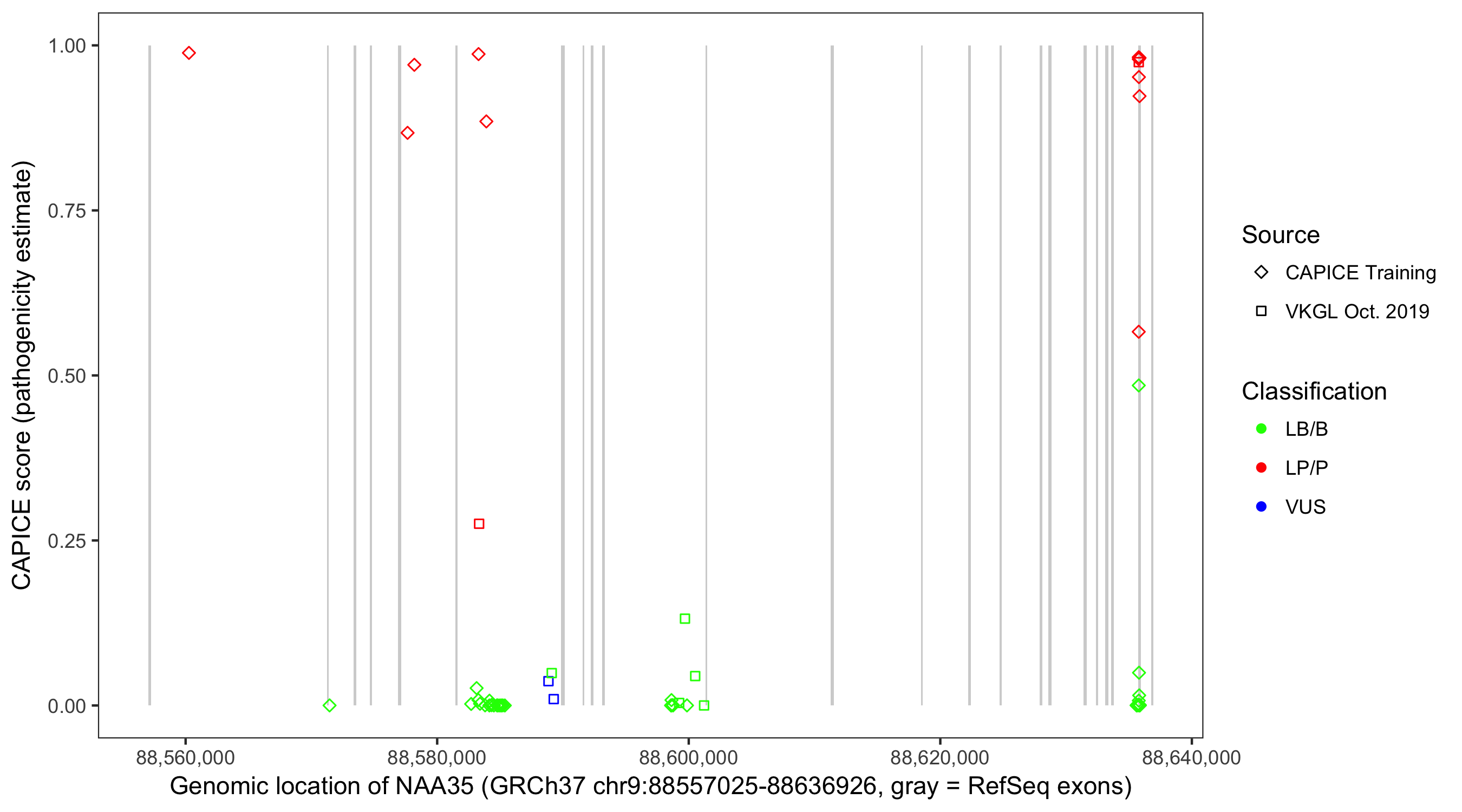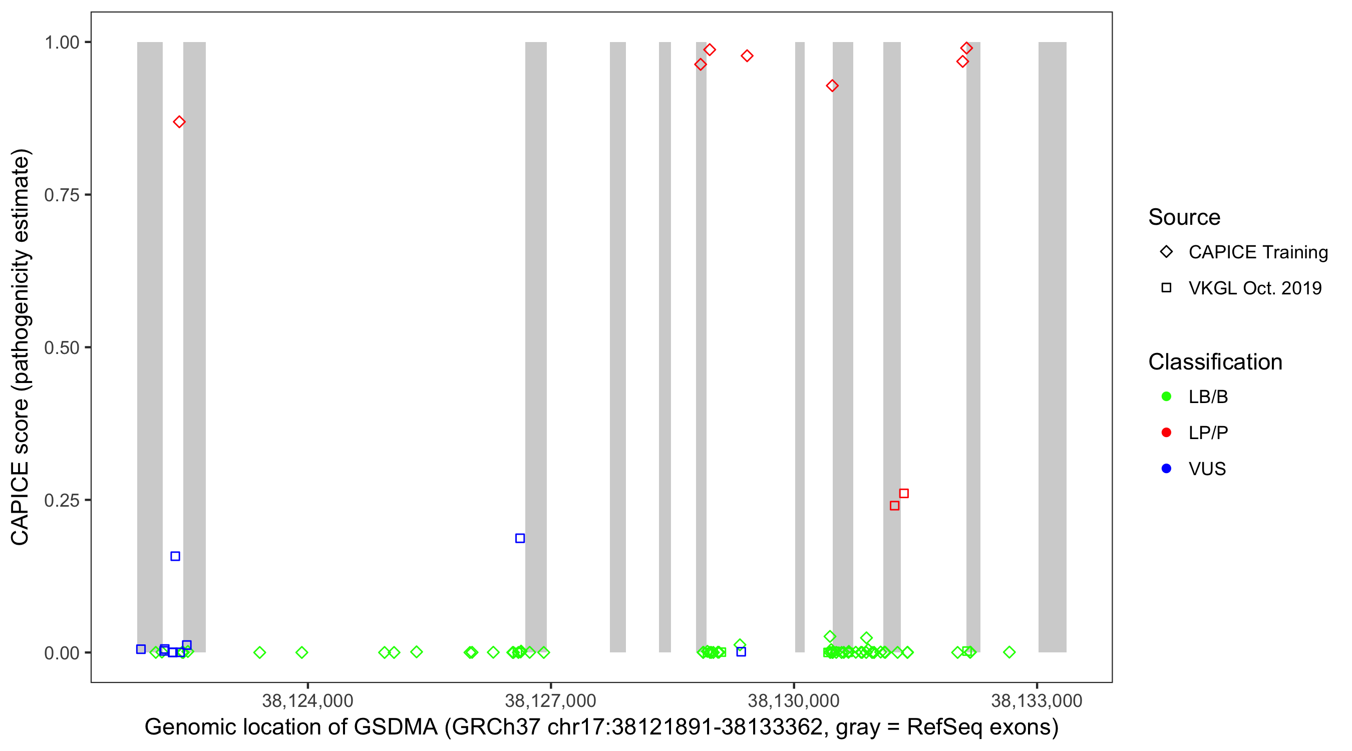 Shown are CAPICE train/test variants plus VKGL Oct 2019.