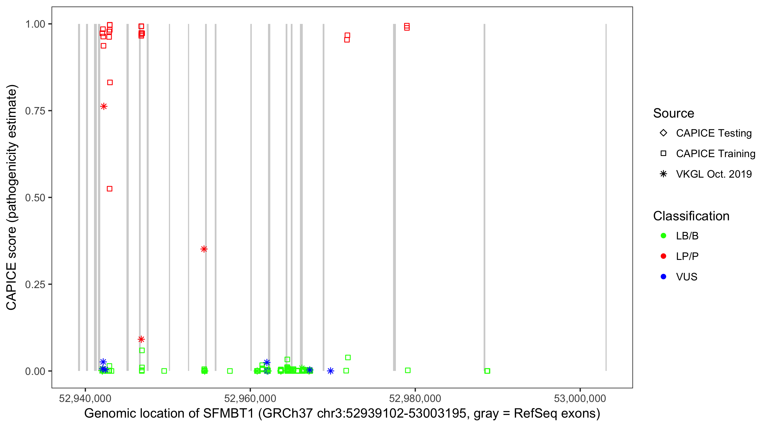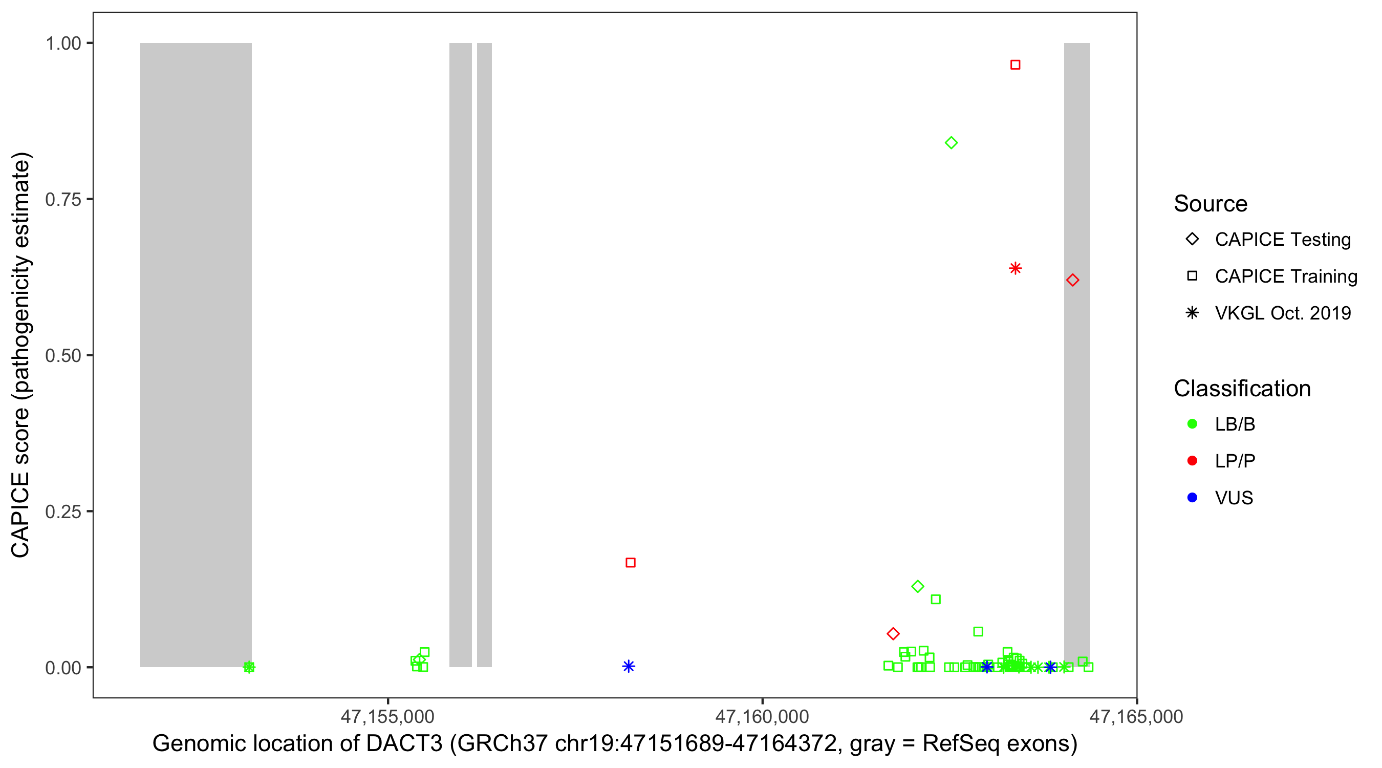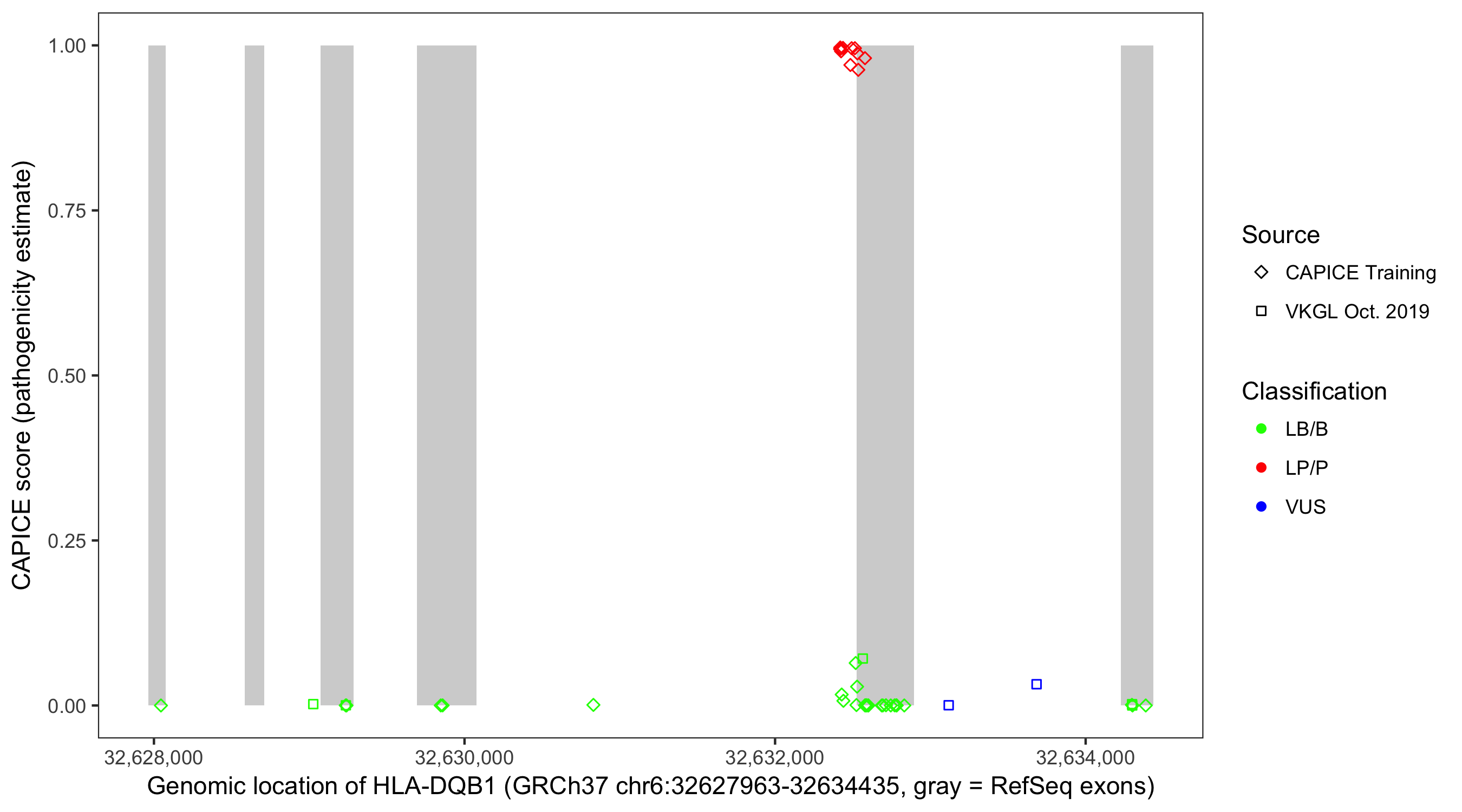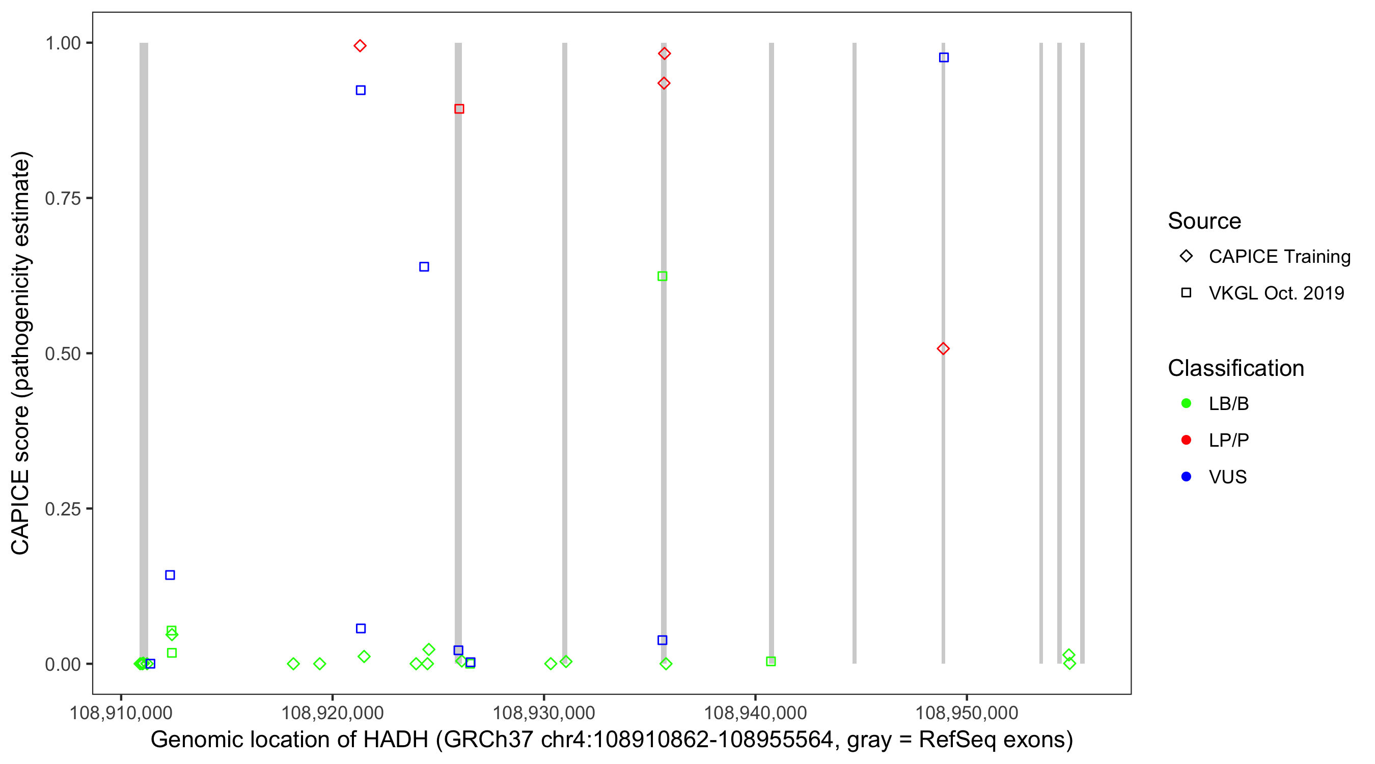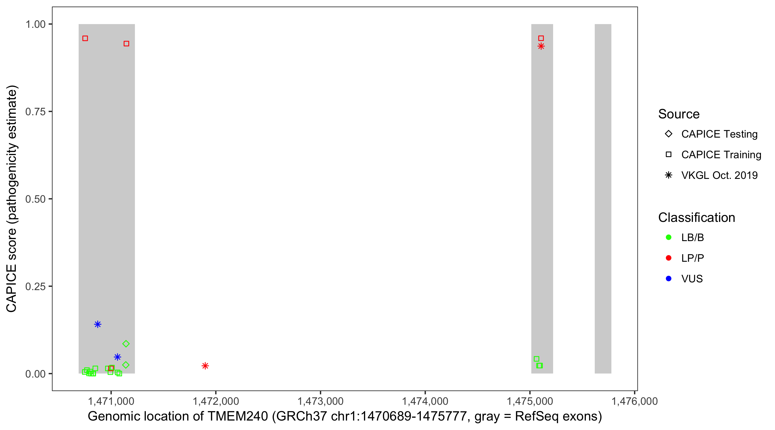 Shown are CAPICE train/test variants plus VKGL Oct 2019.