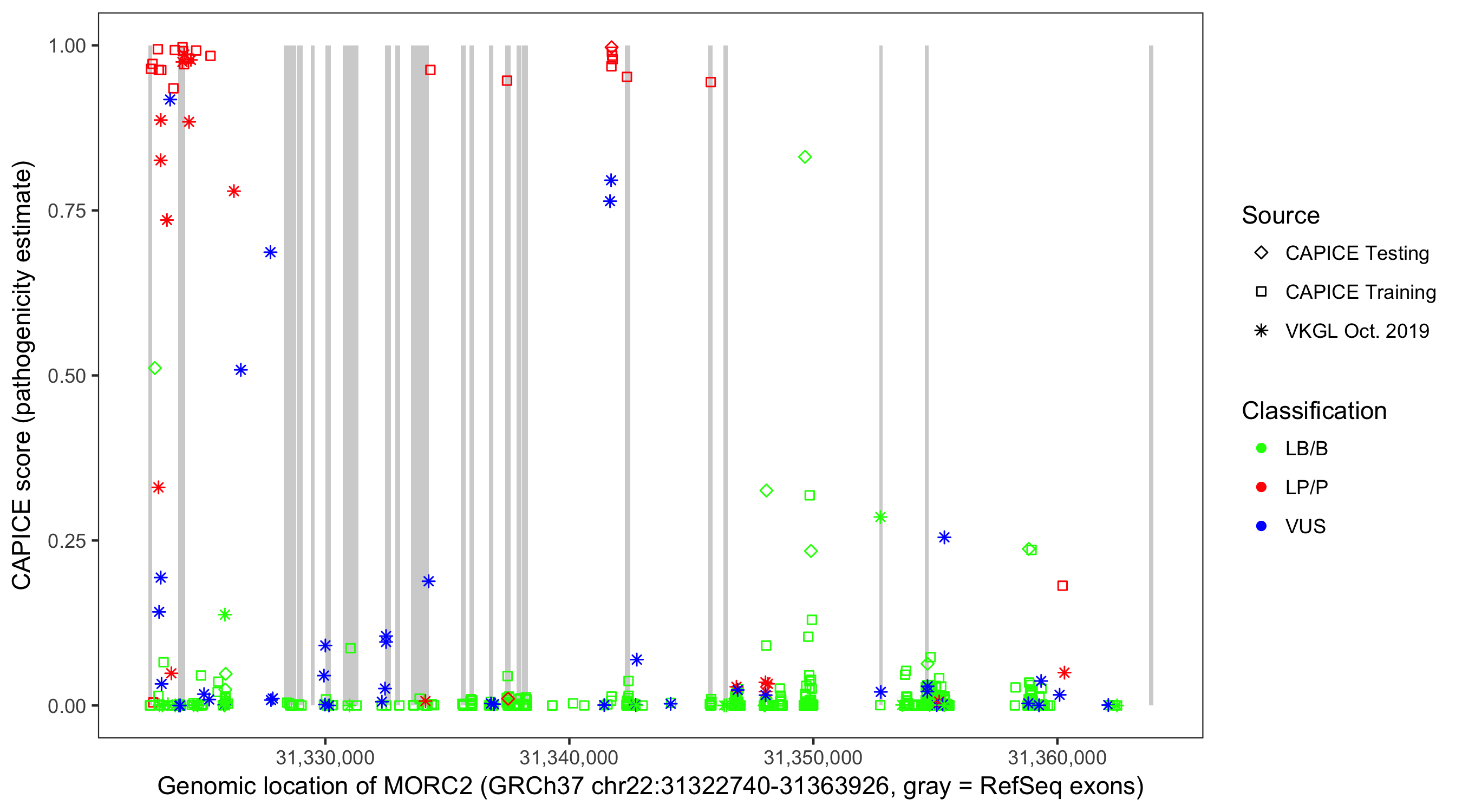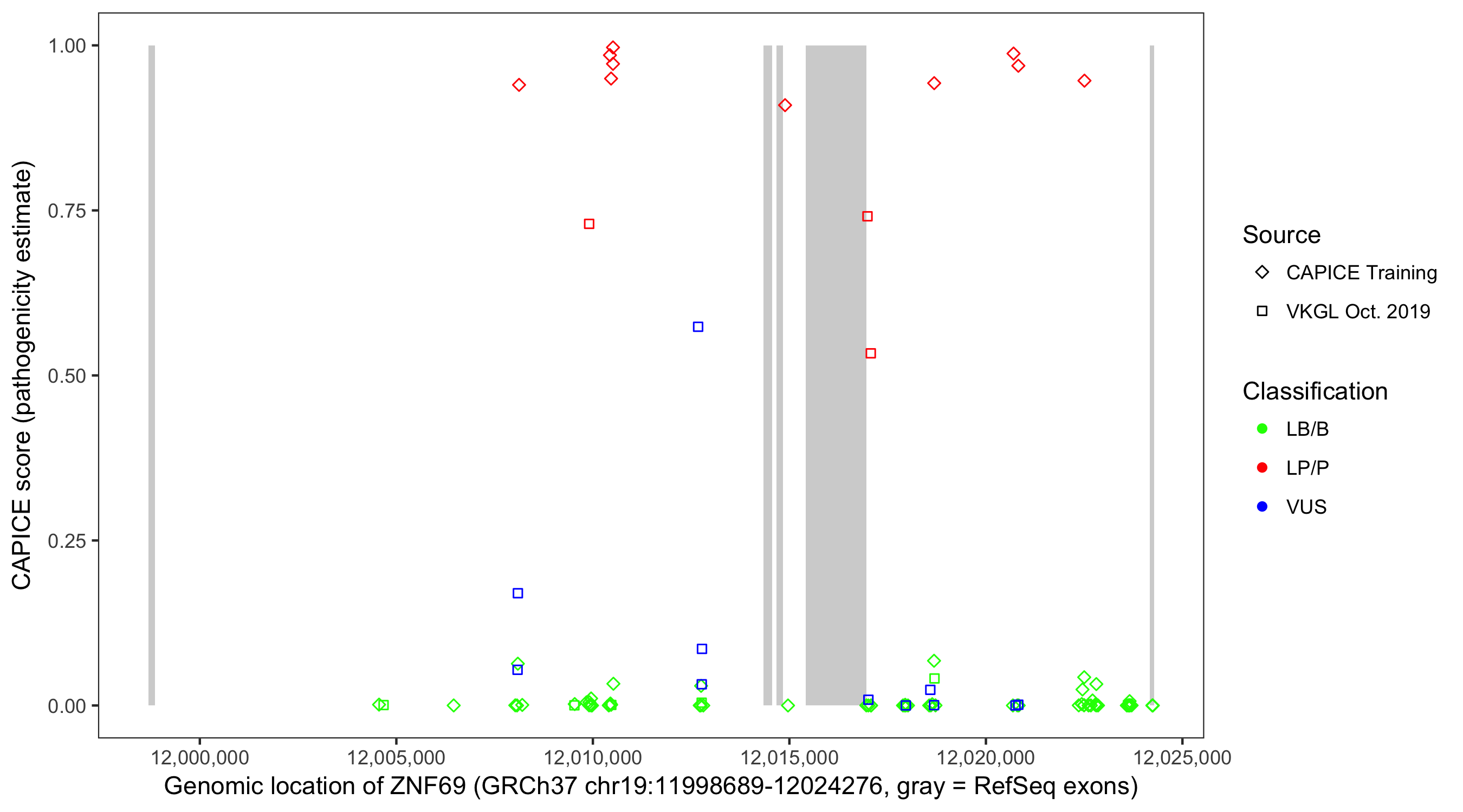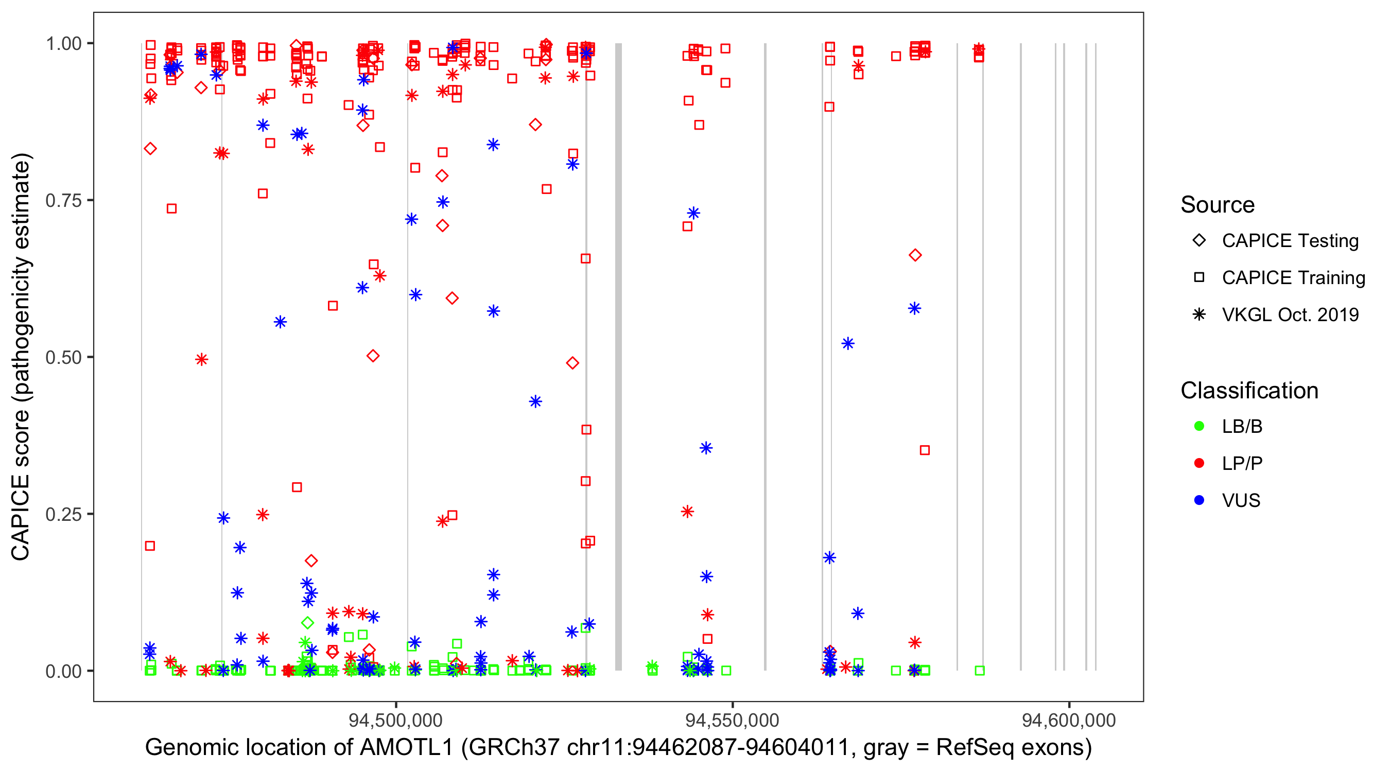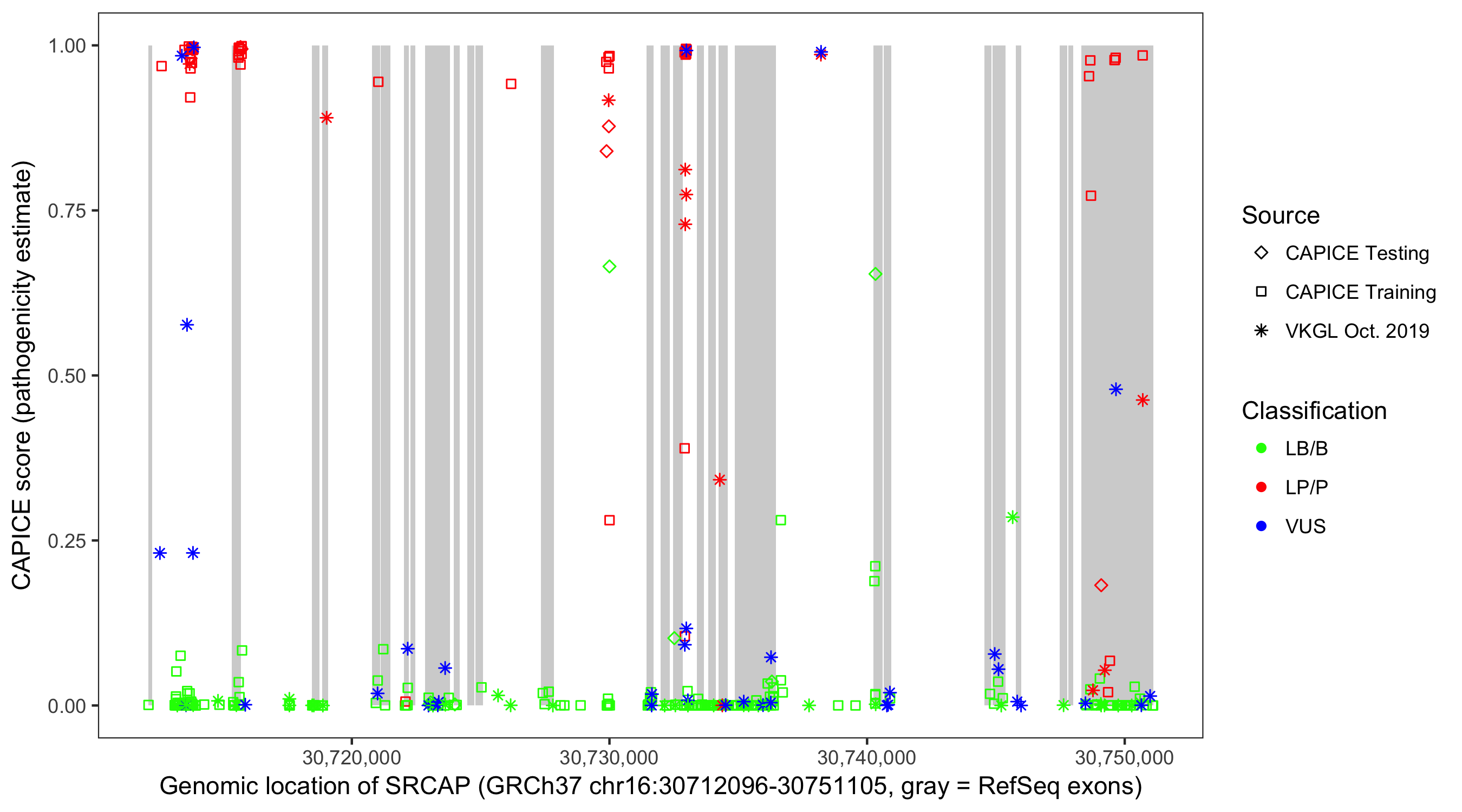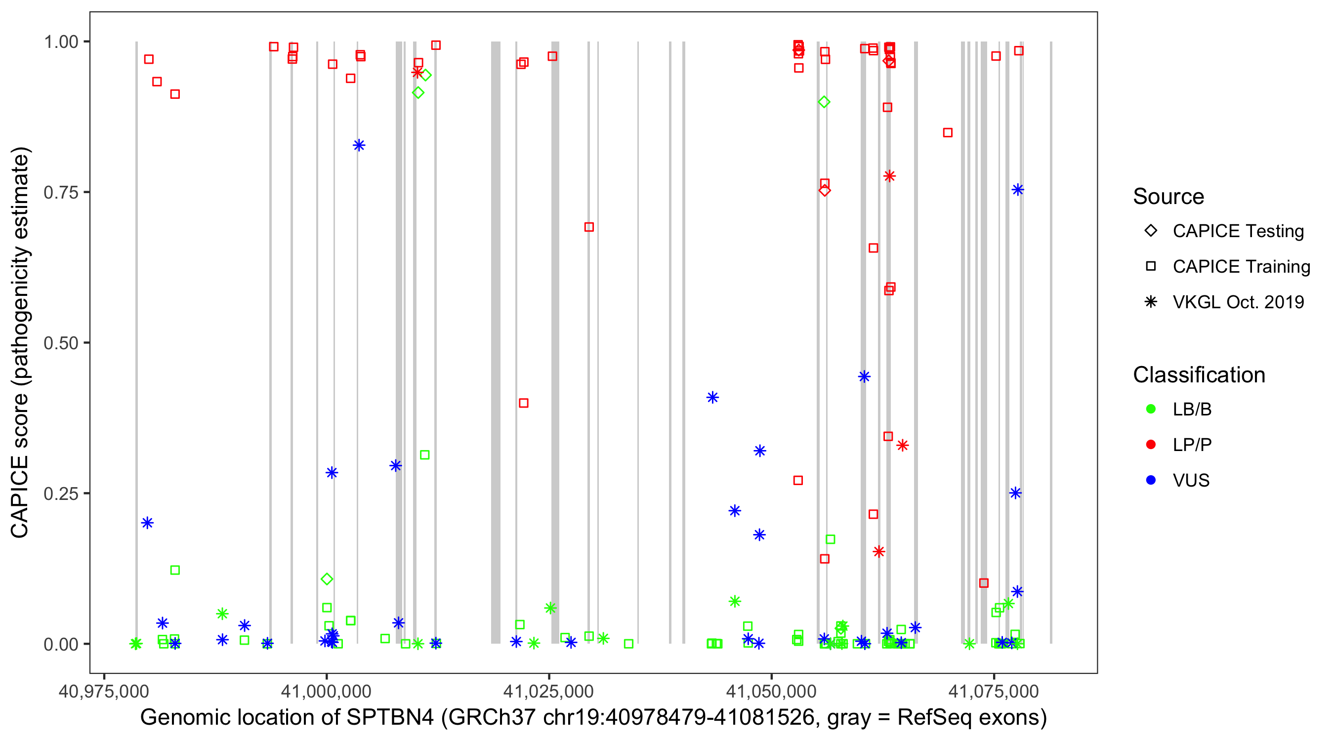 Shown are CAPICE train/test variants plus VKGL Oct 2019.