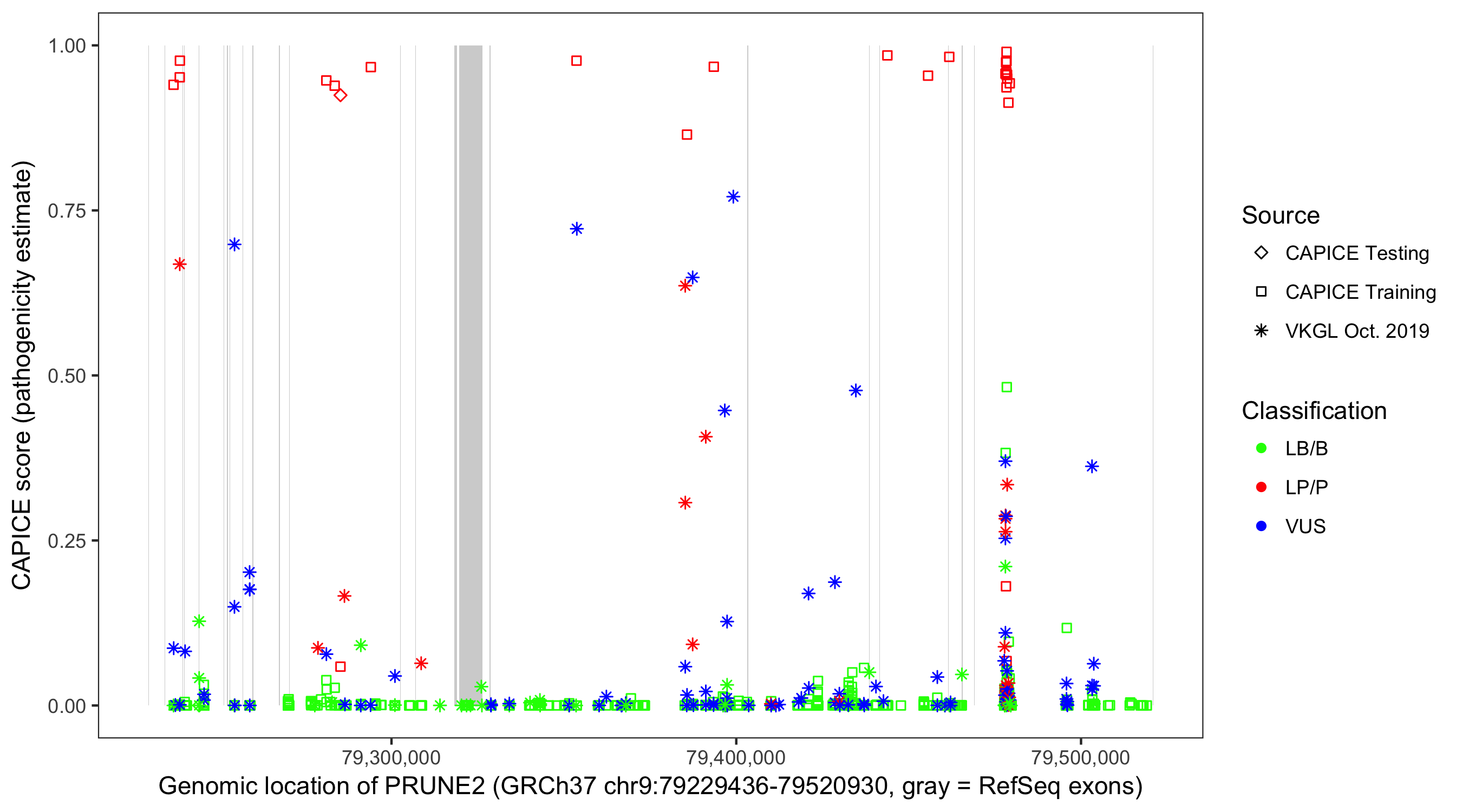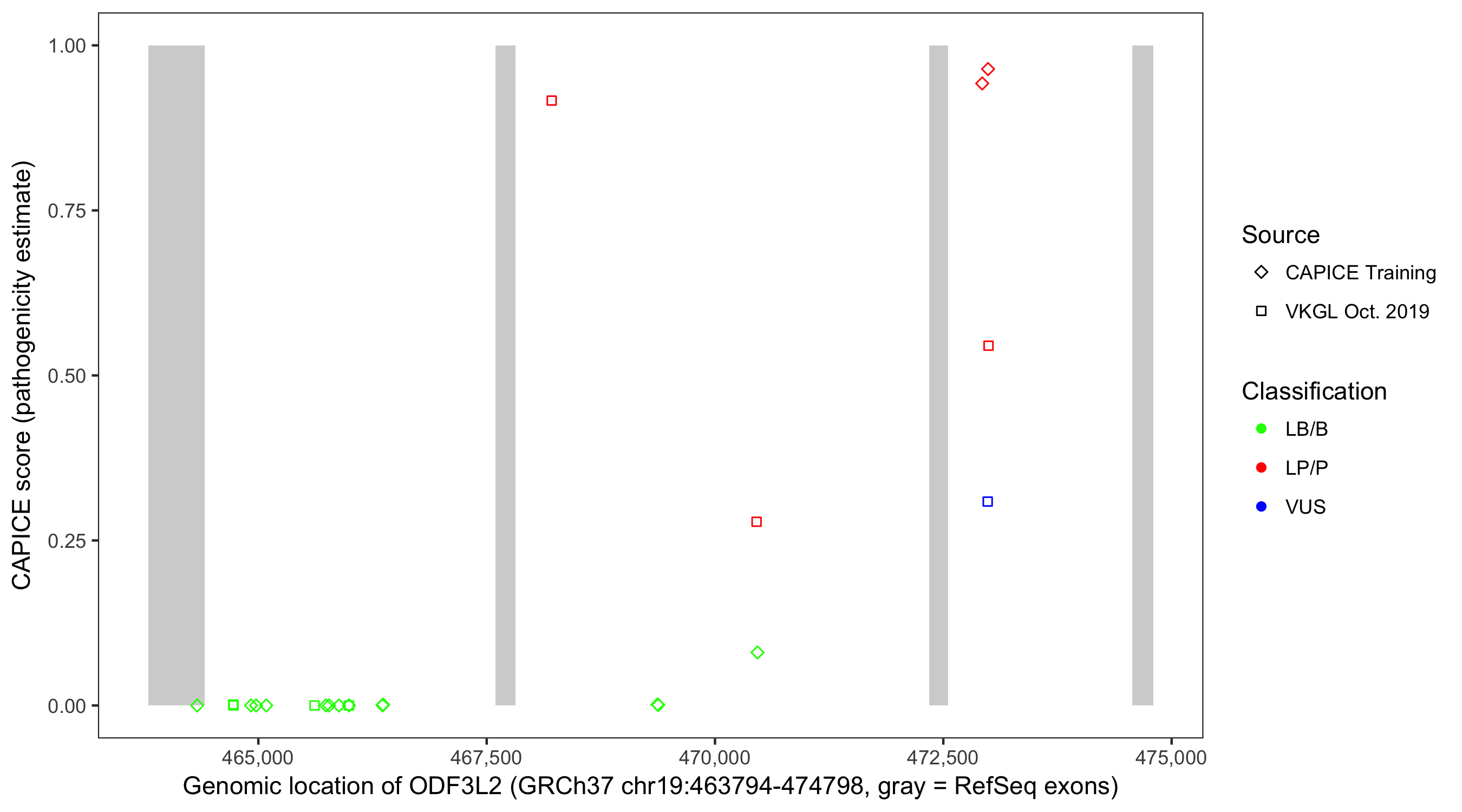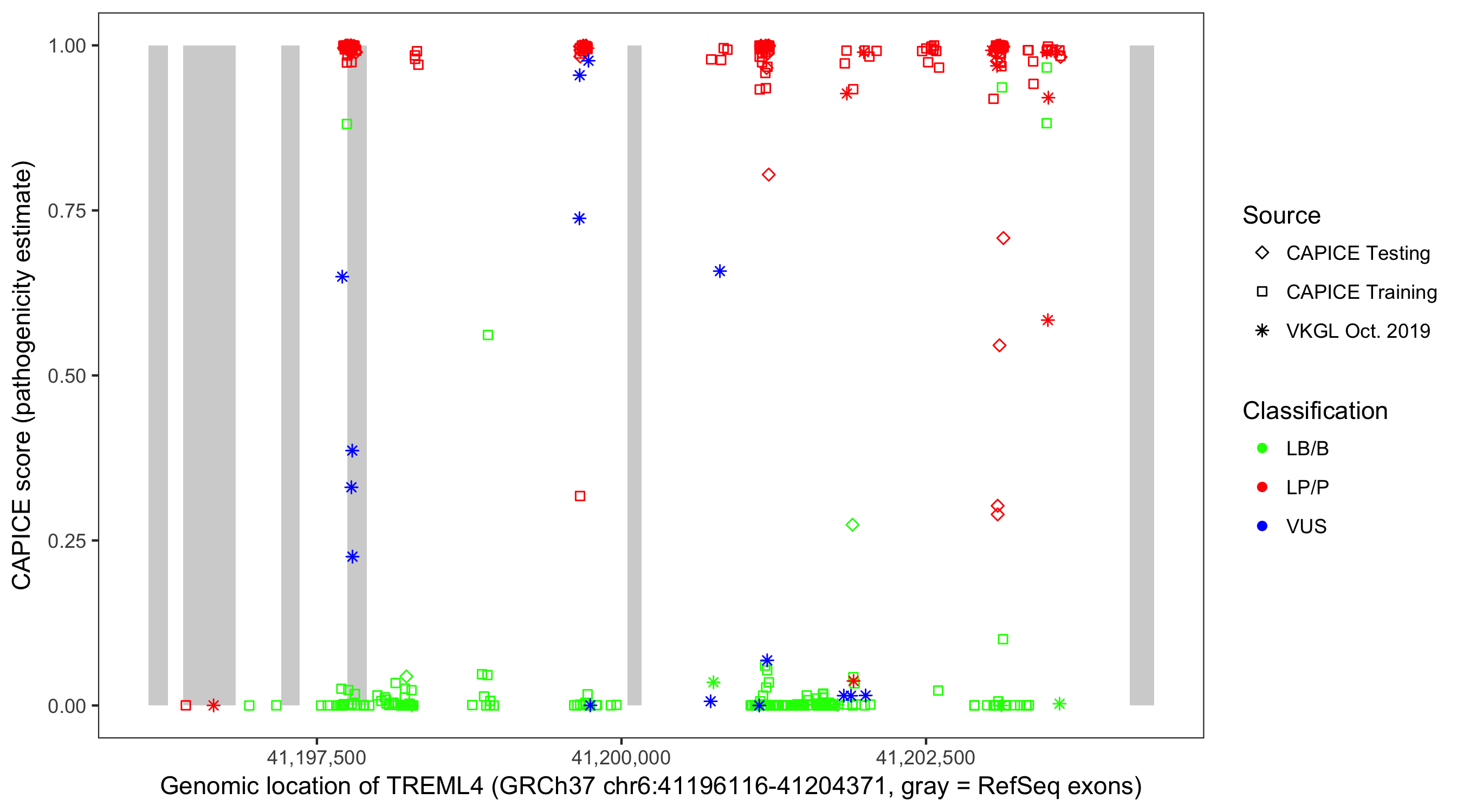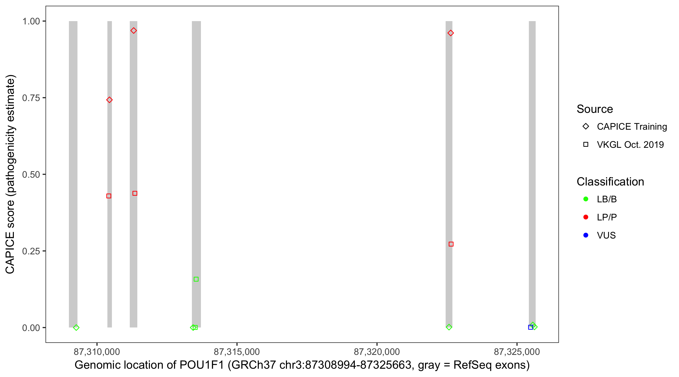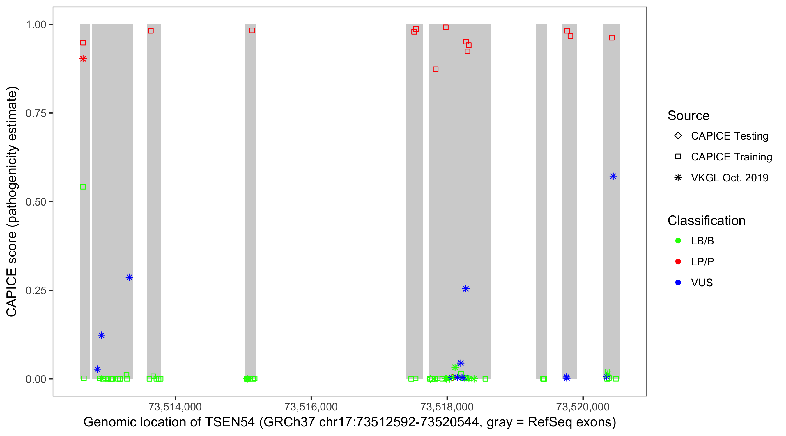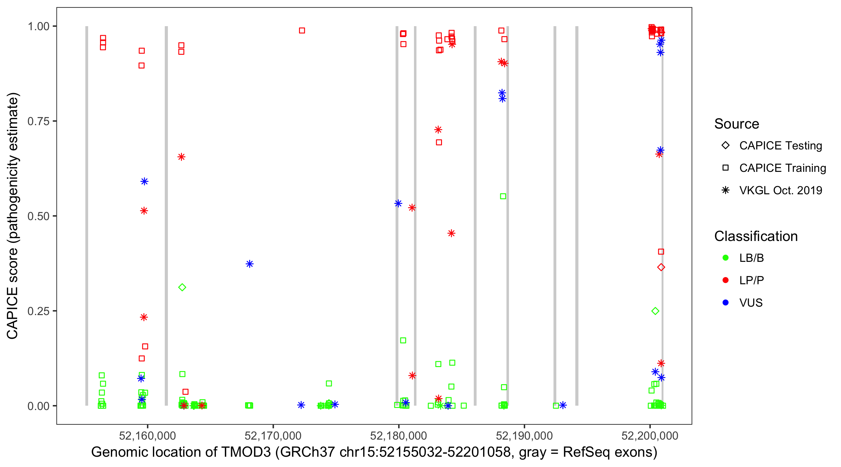 Shown are CAPICE train/test variants plus VKGL Oct 2019.