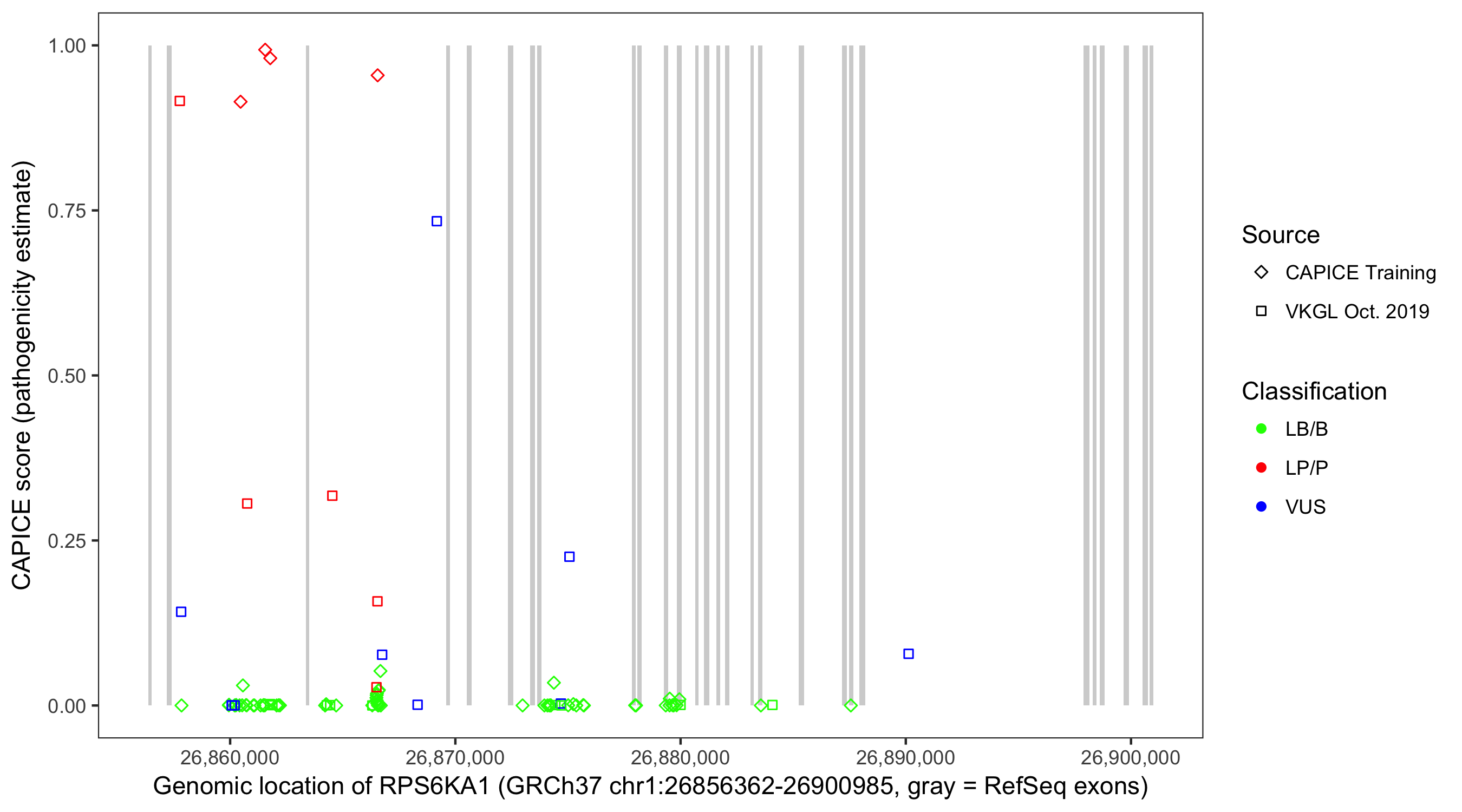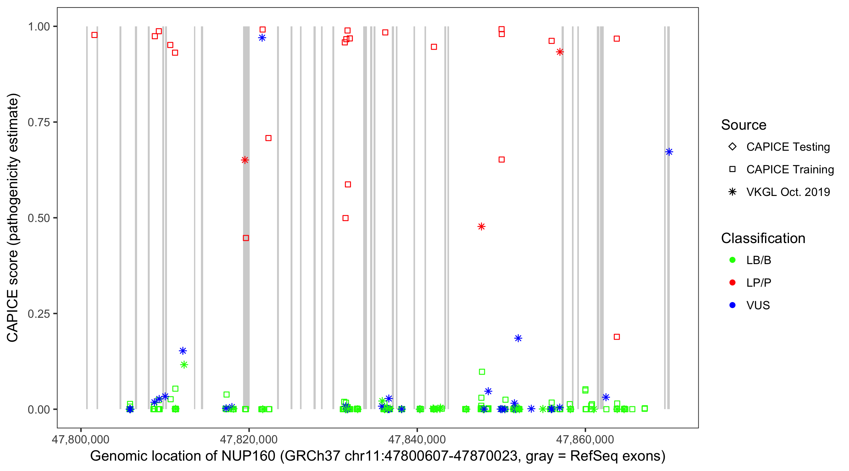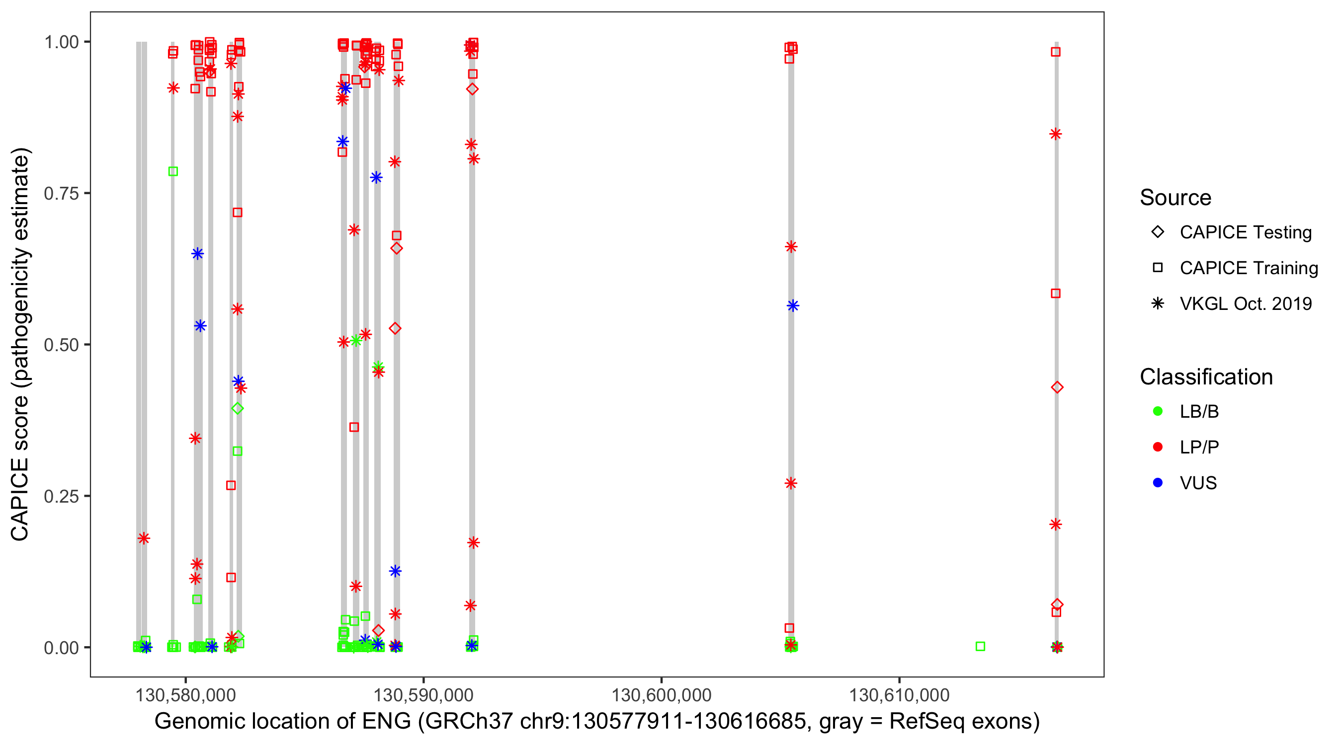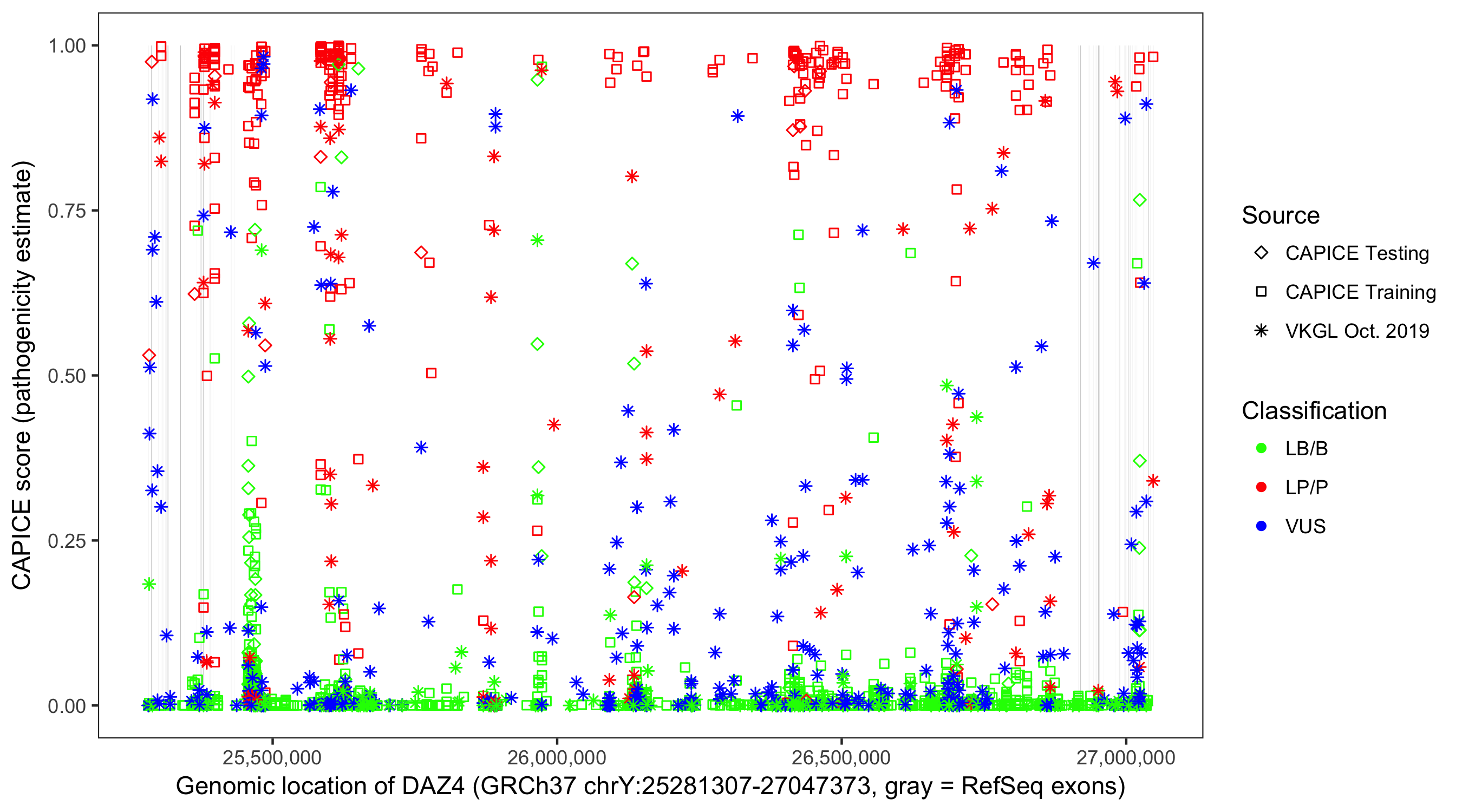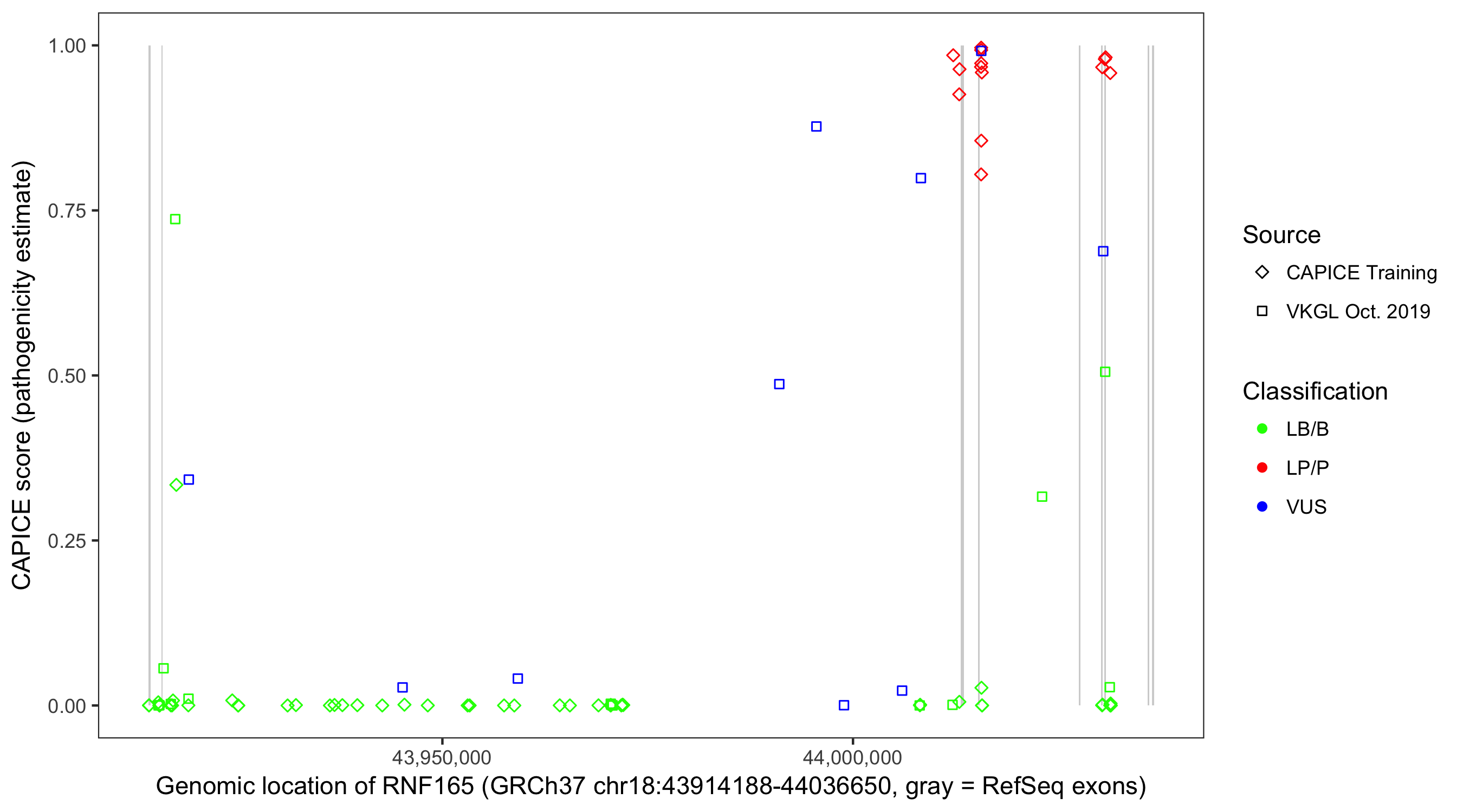 Shown are CAPICE train/test variants plus VKGL Oct 2019.