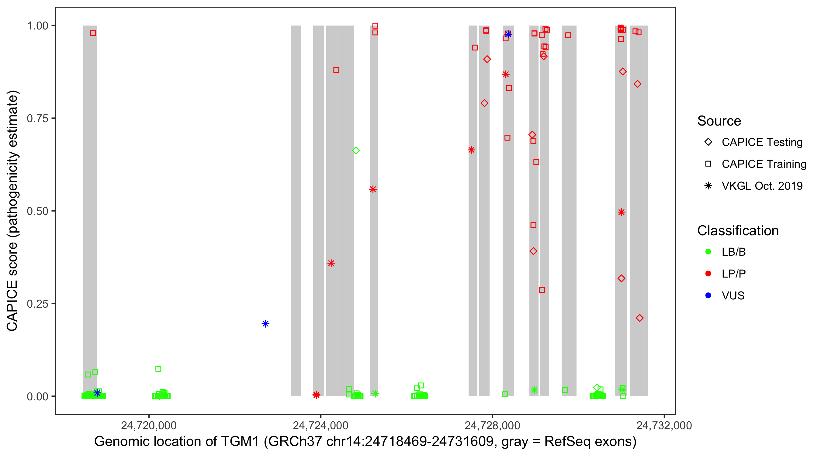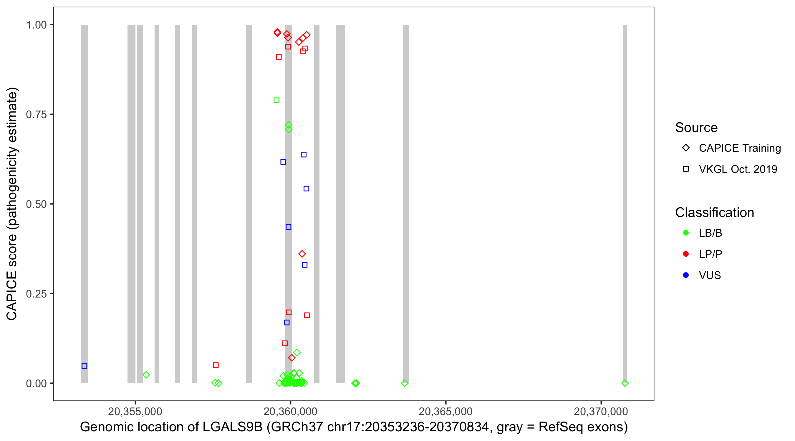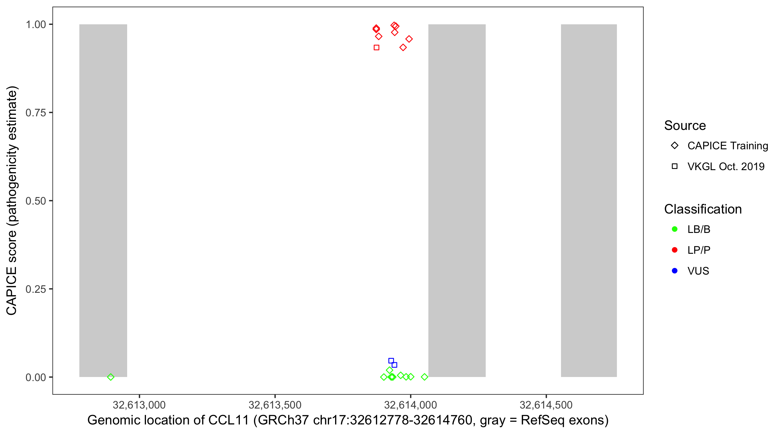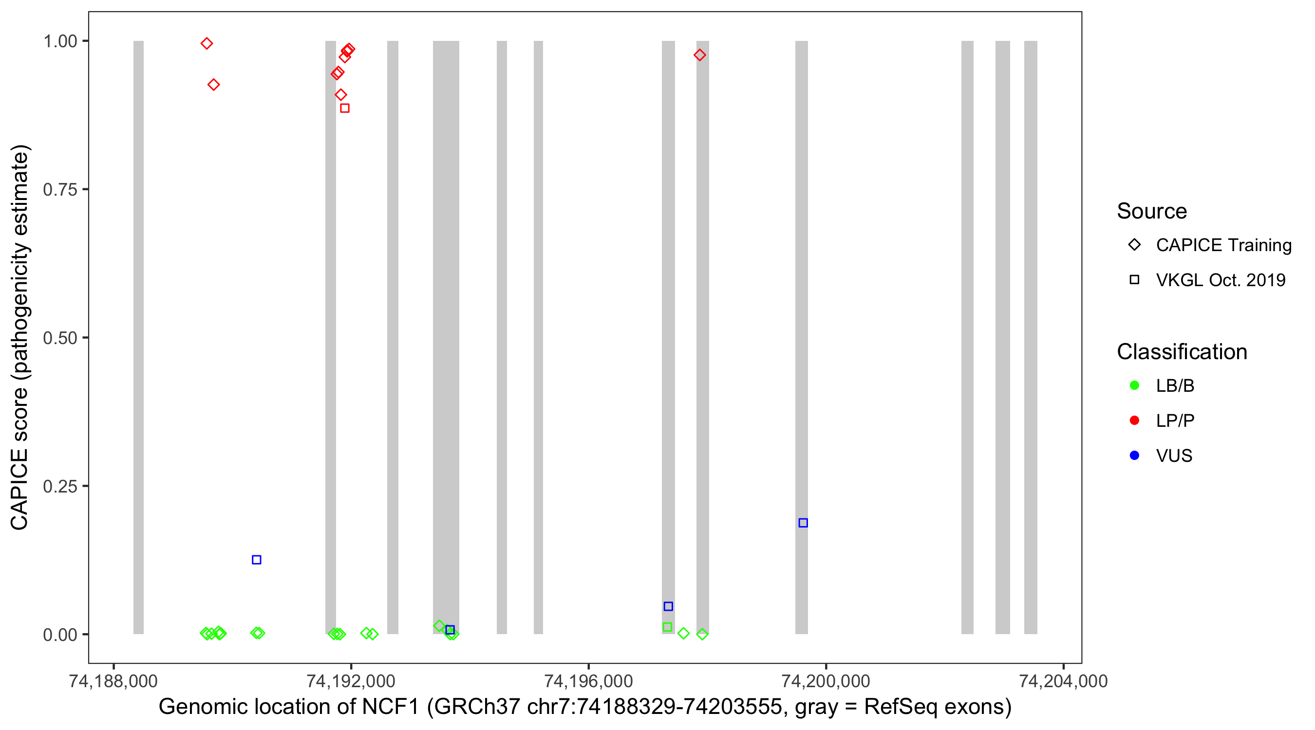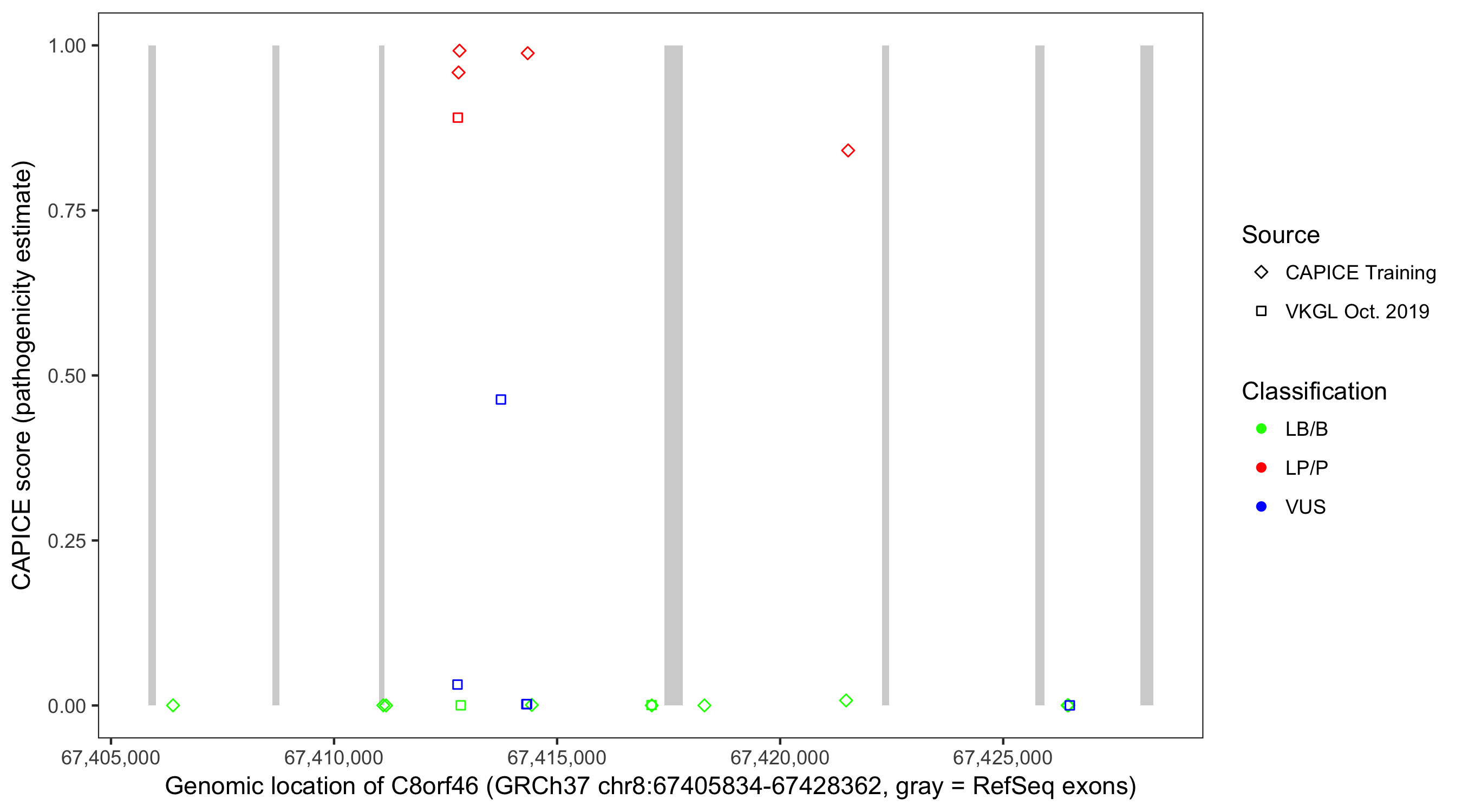 Shown are CAPICE train/test variants plus VKGL Oct 2019.
