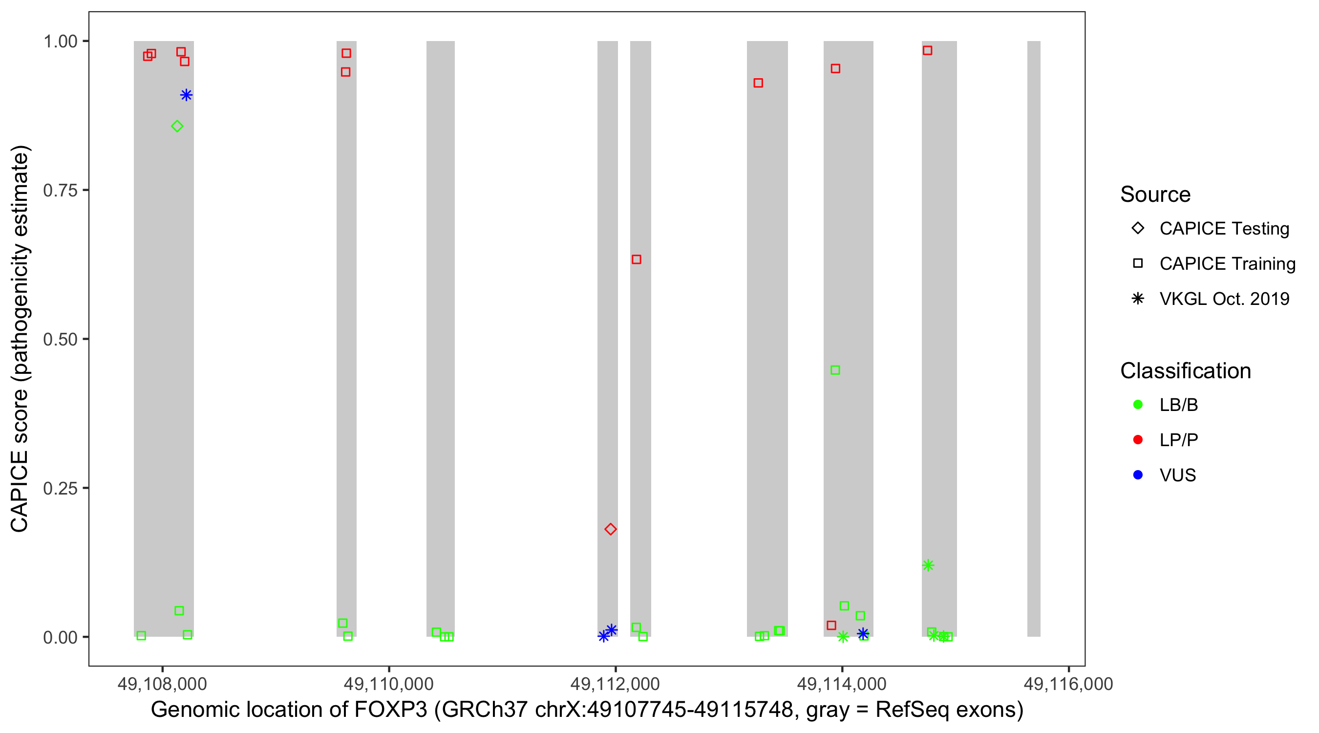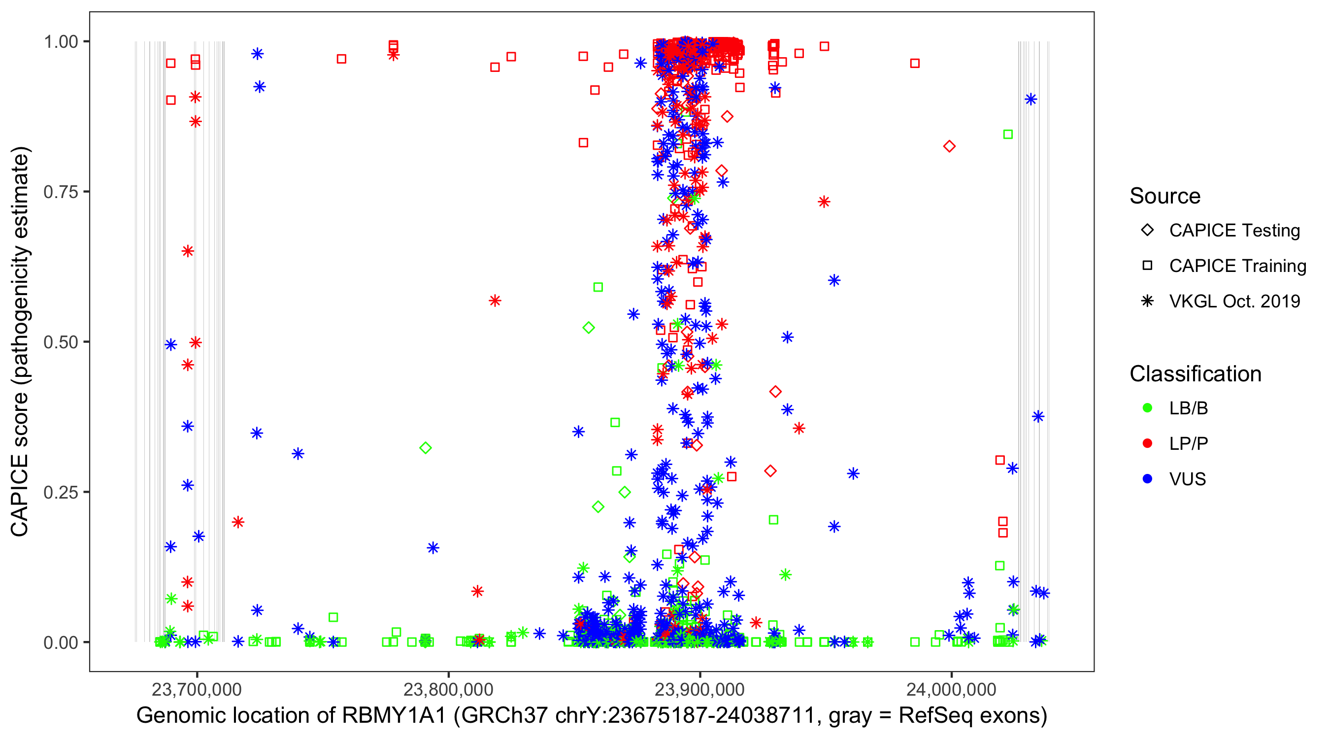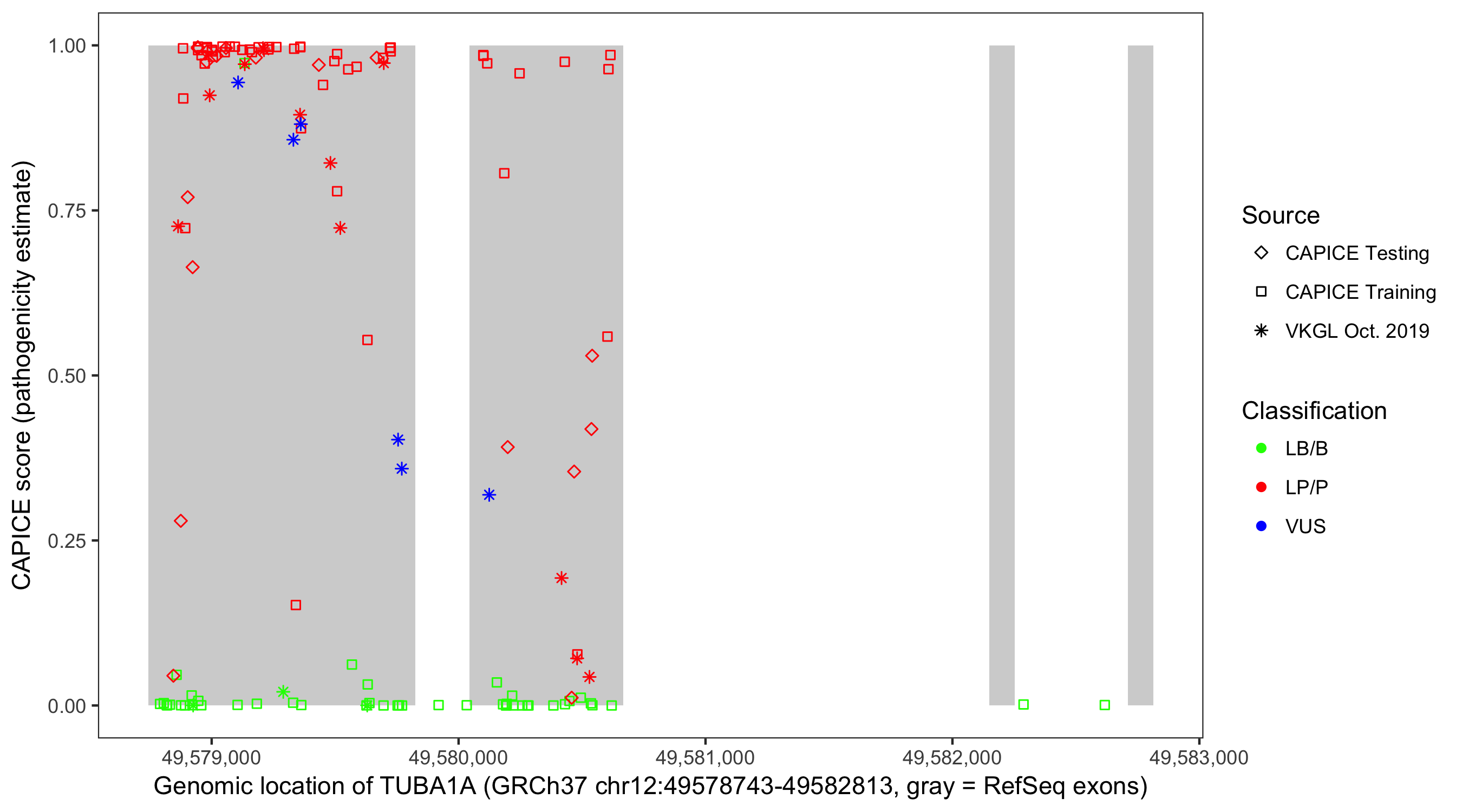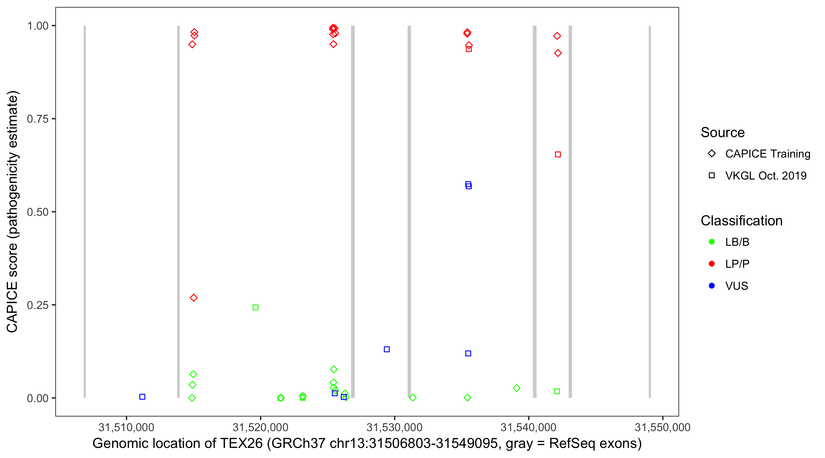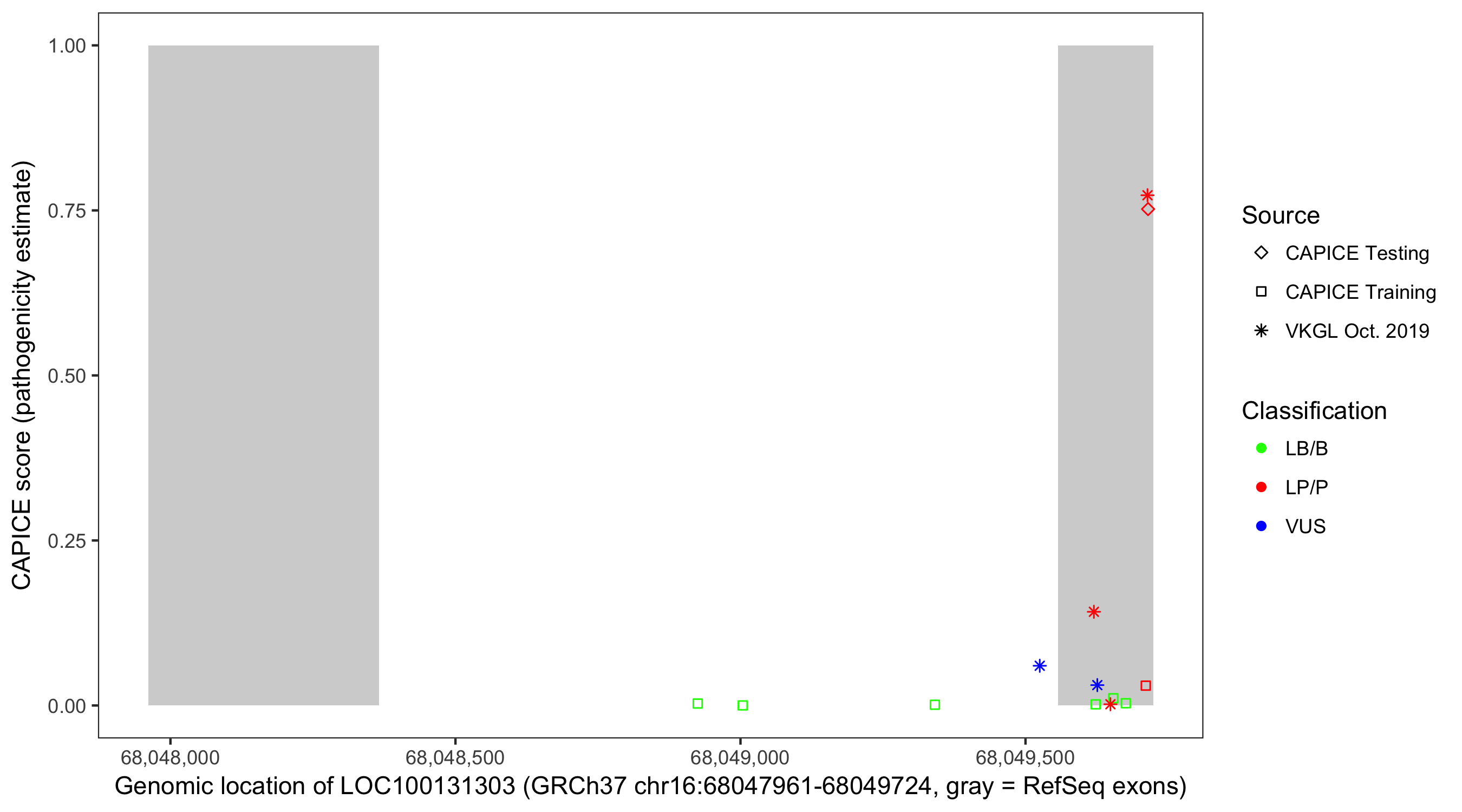 Shown are CAPICE train/test variants plus VKGL Oct 2019.