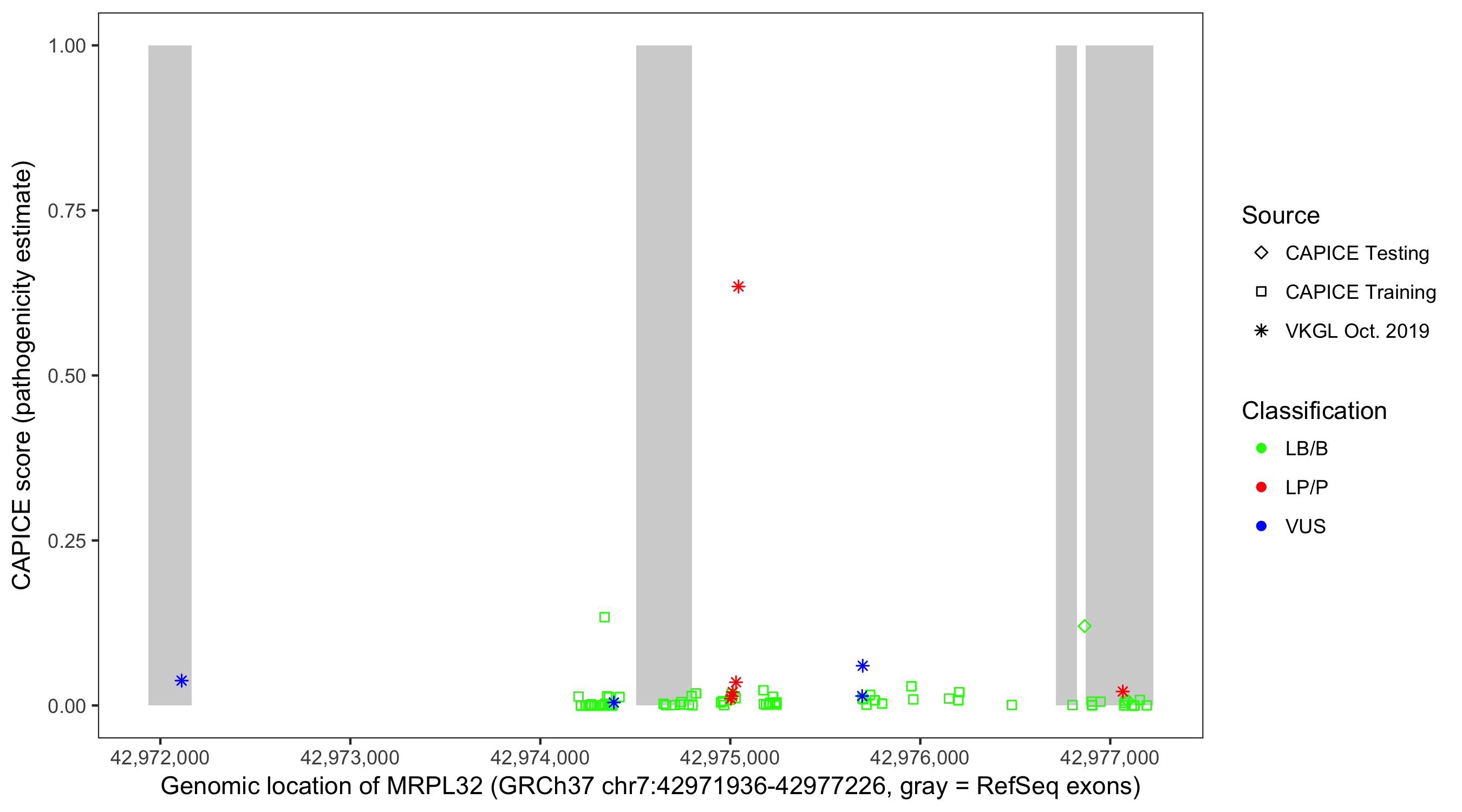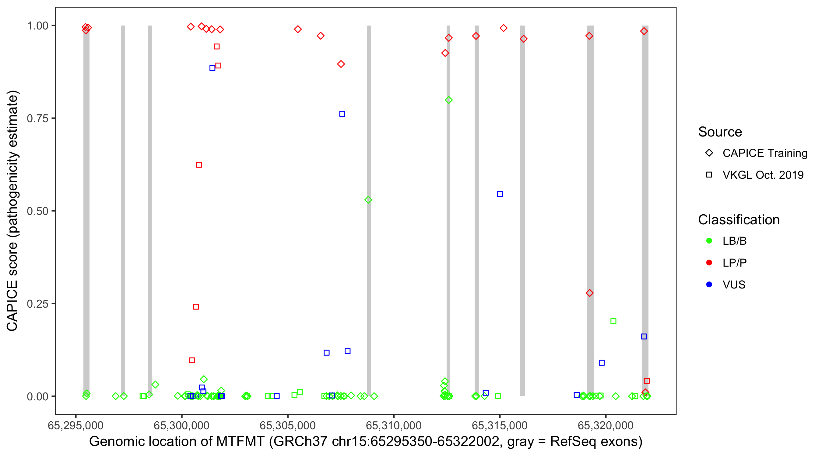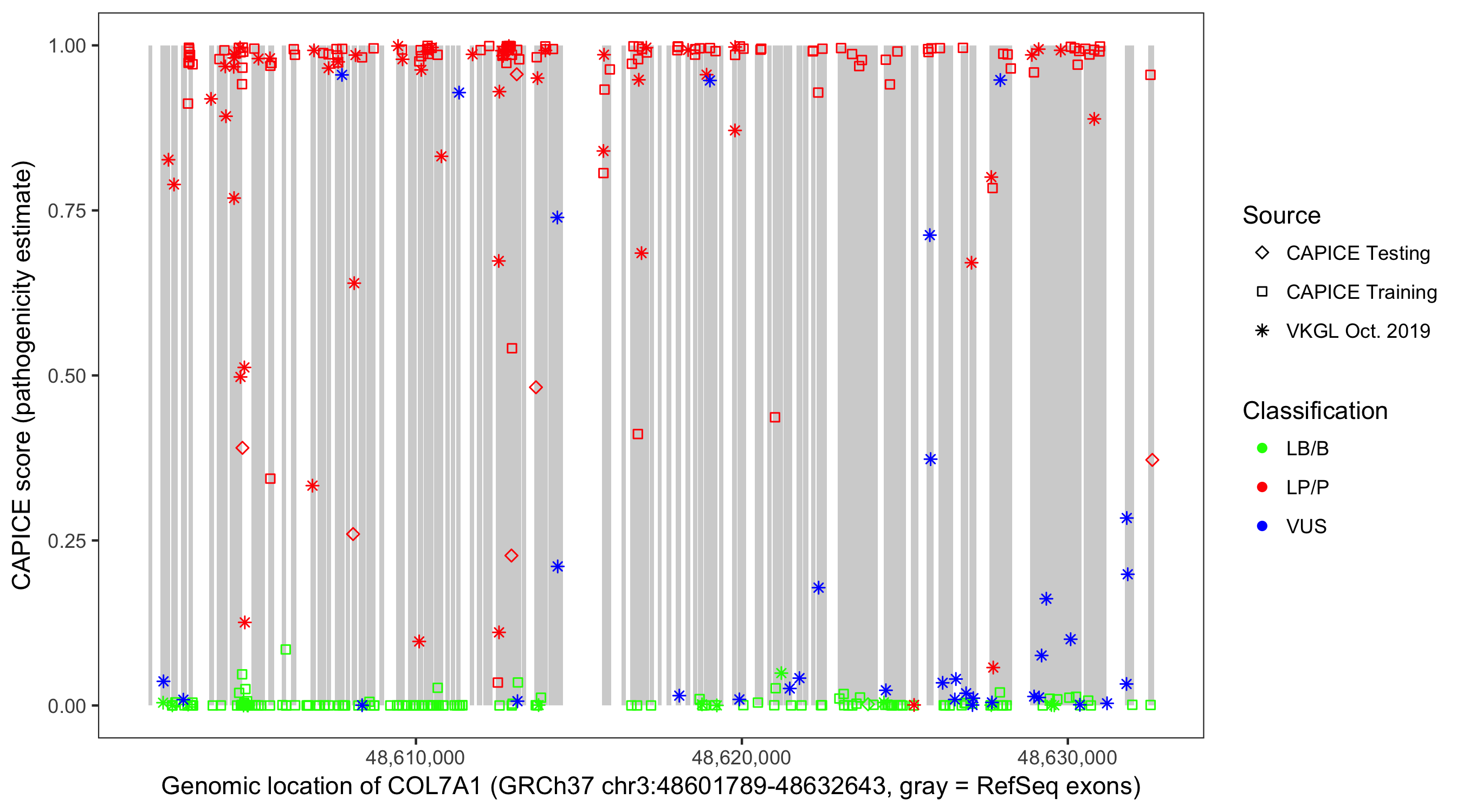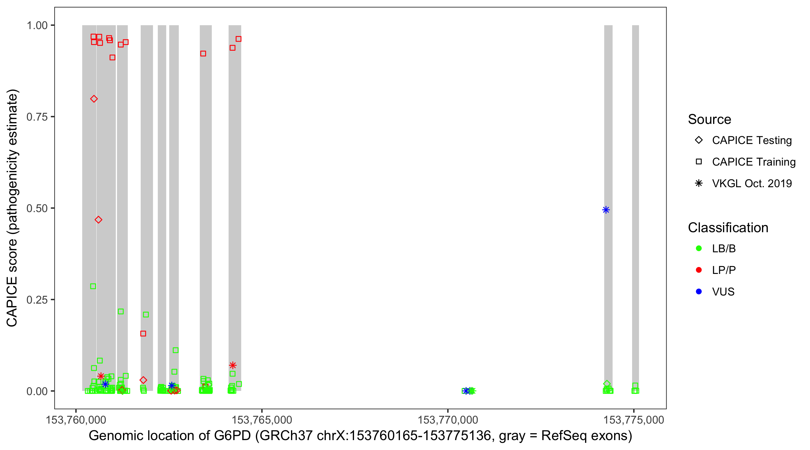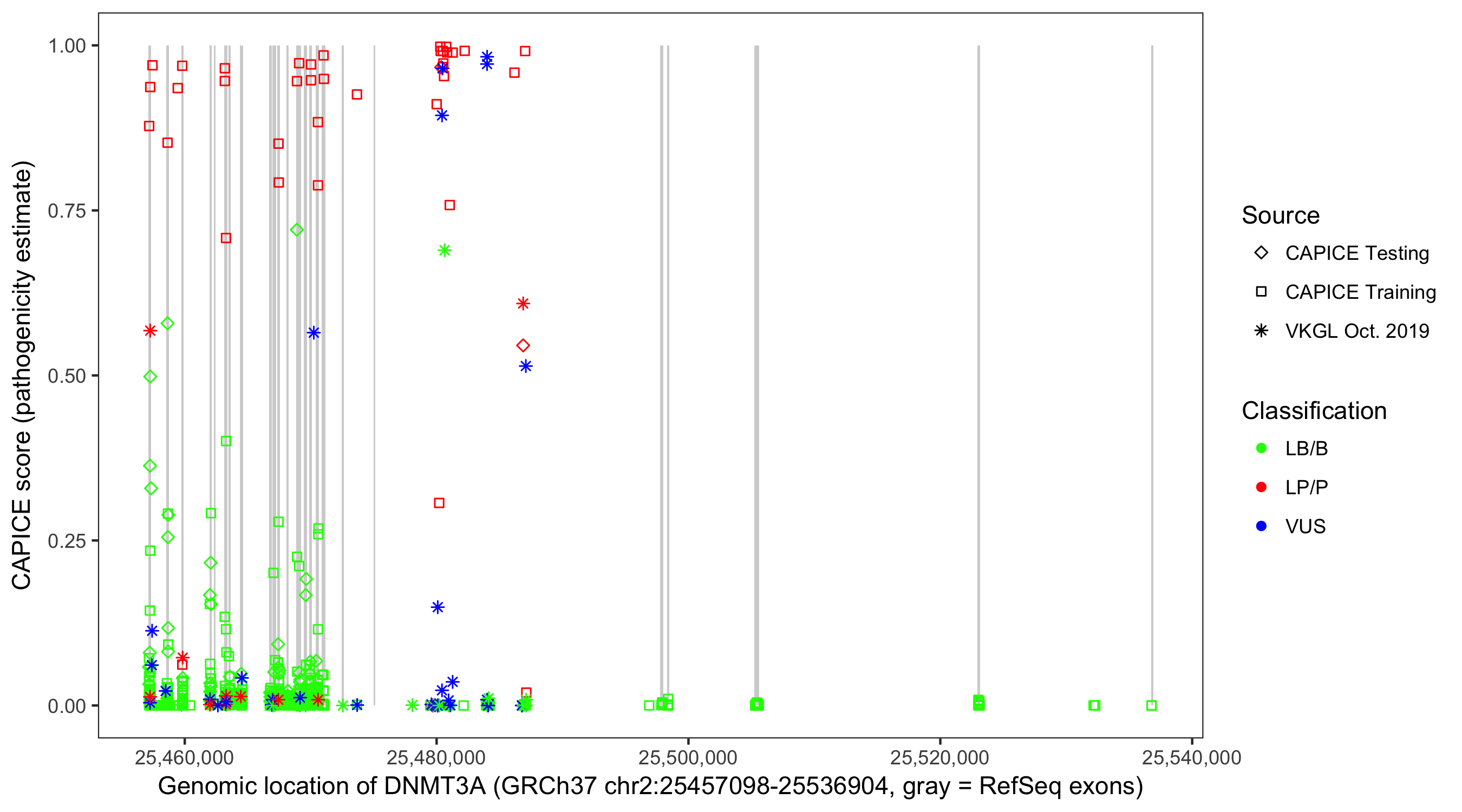 Shown are CAPICE train/test variants plus VKGL Oct 2019.