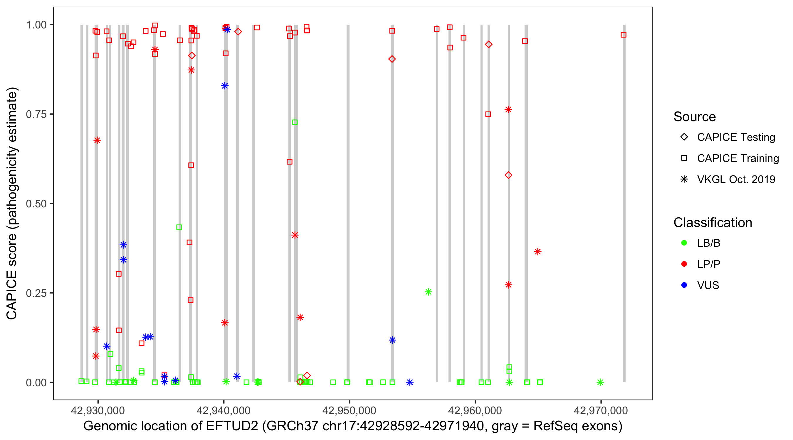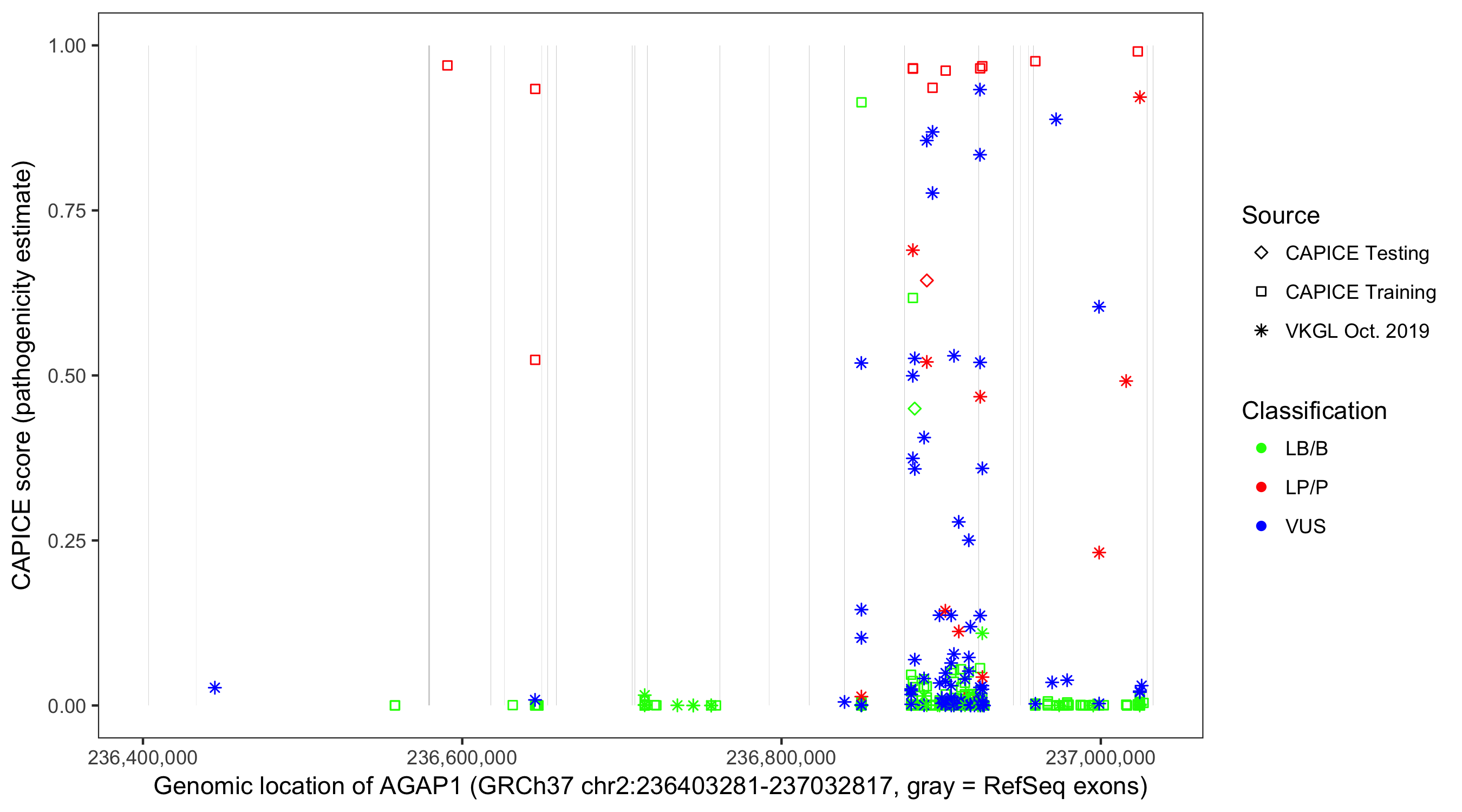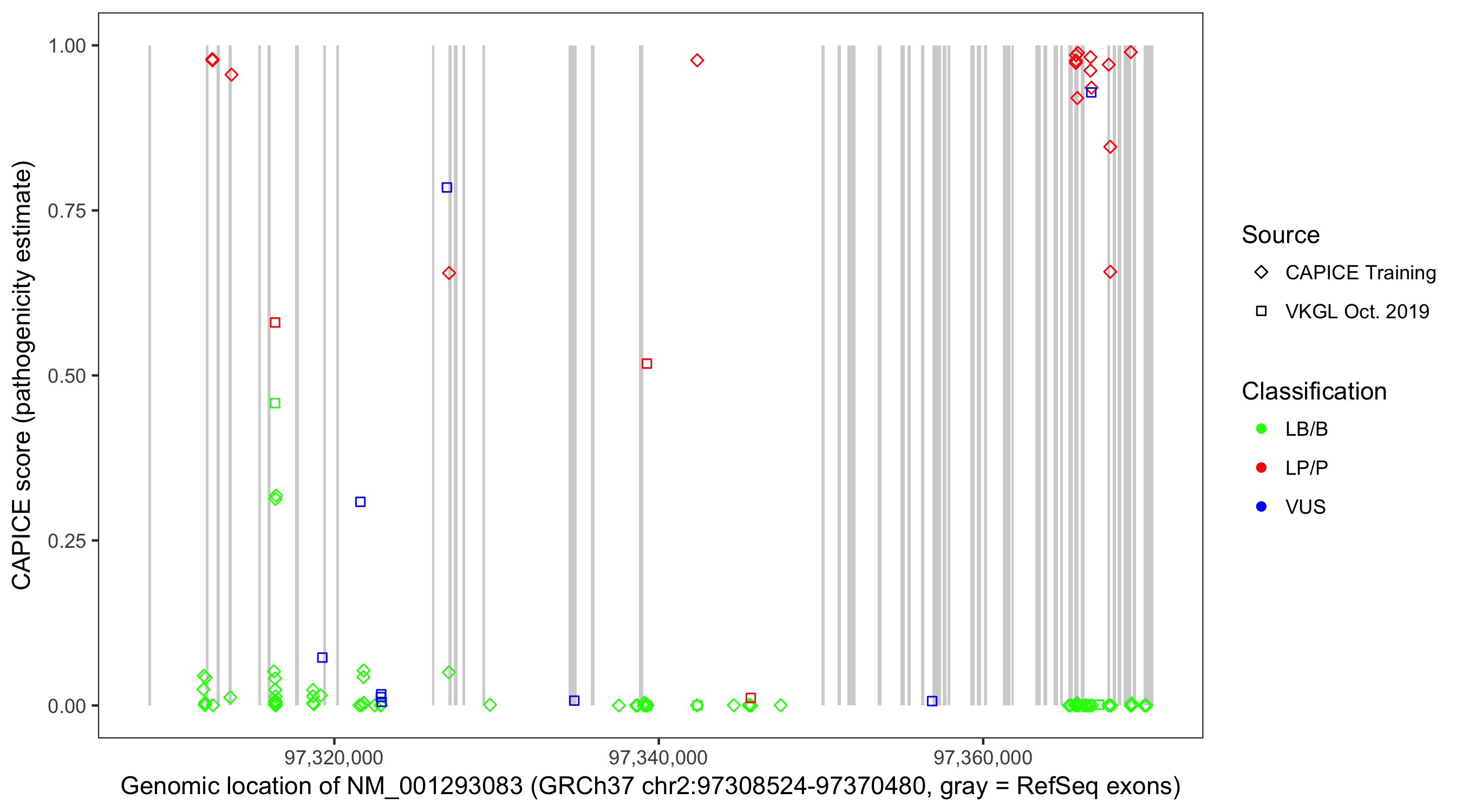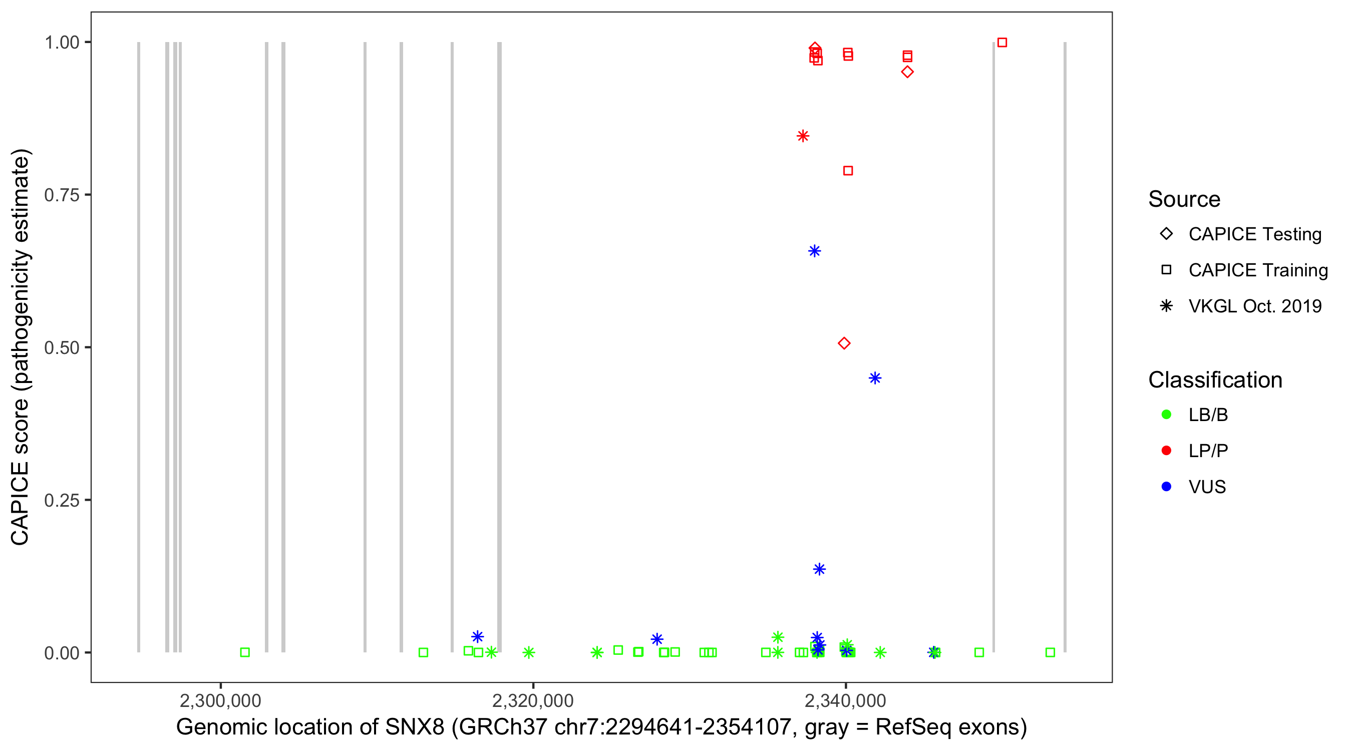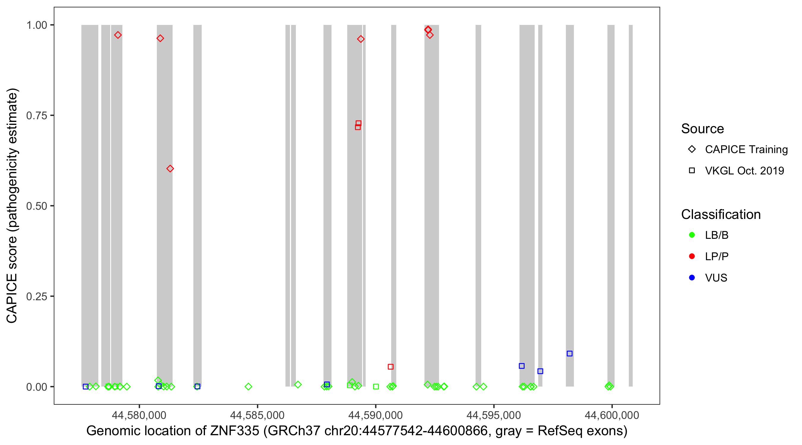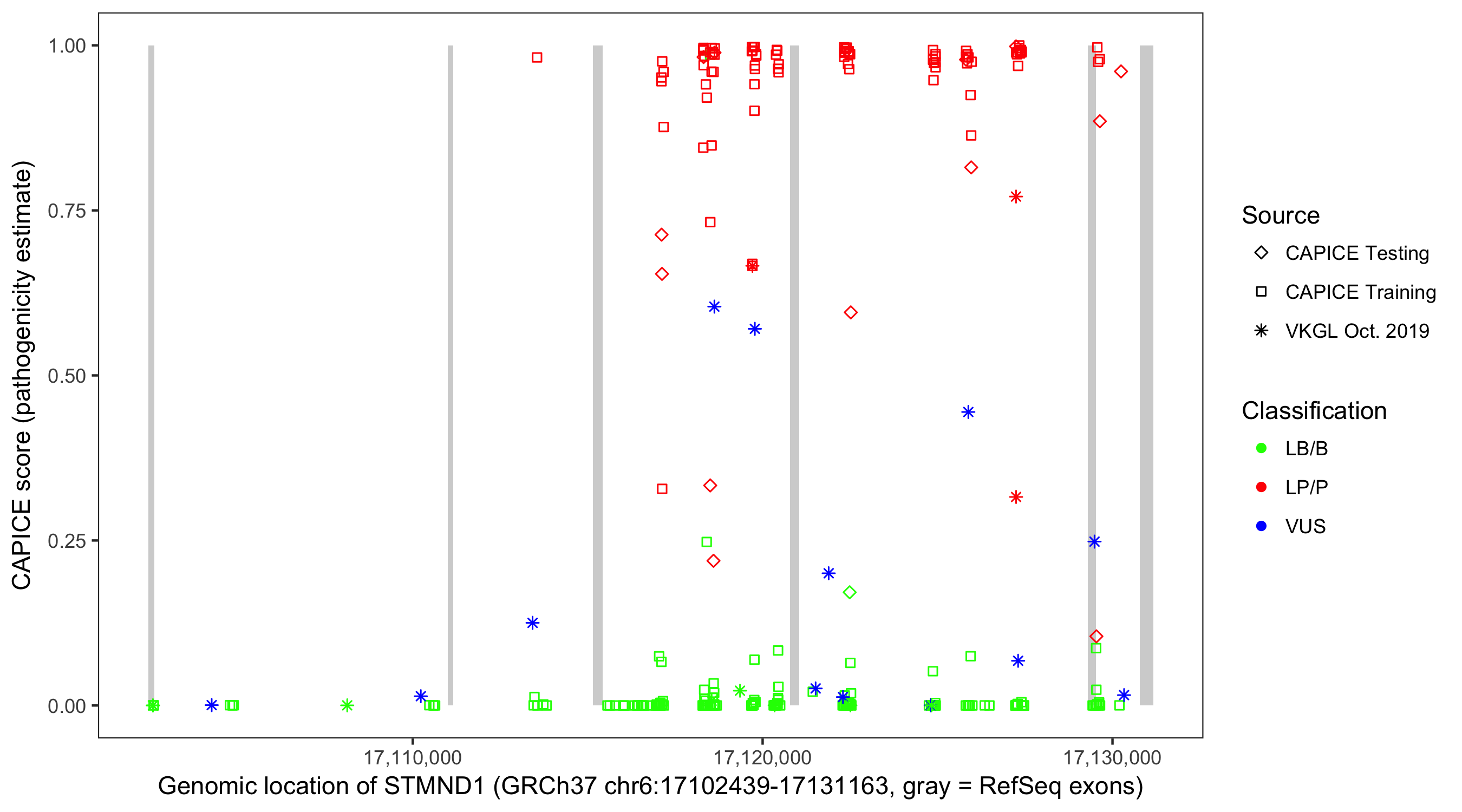 Shown are CAPICE train/test variants plus VKGL Oct 2019.
