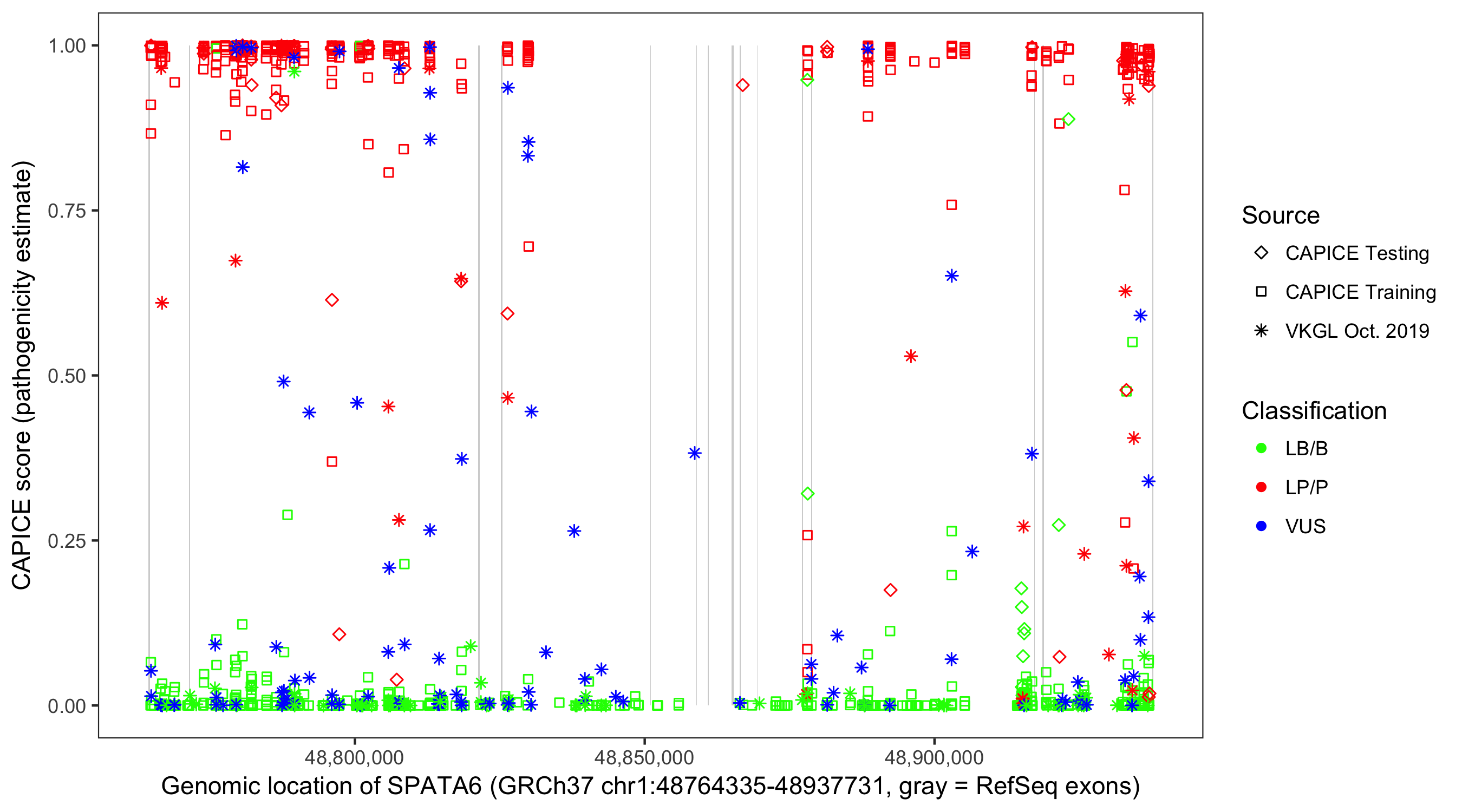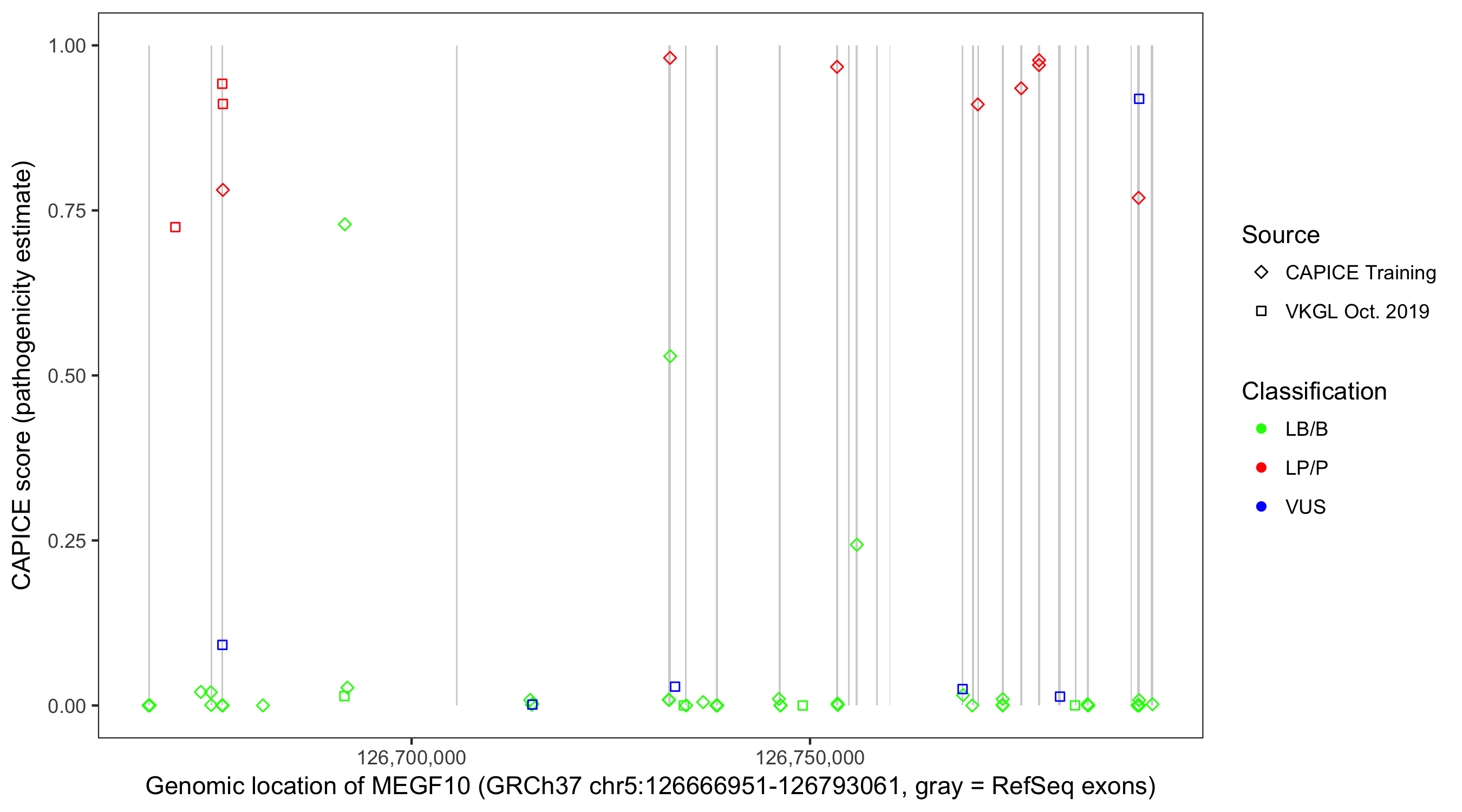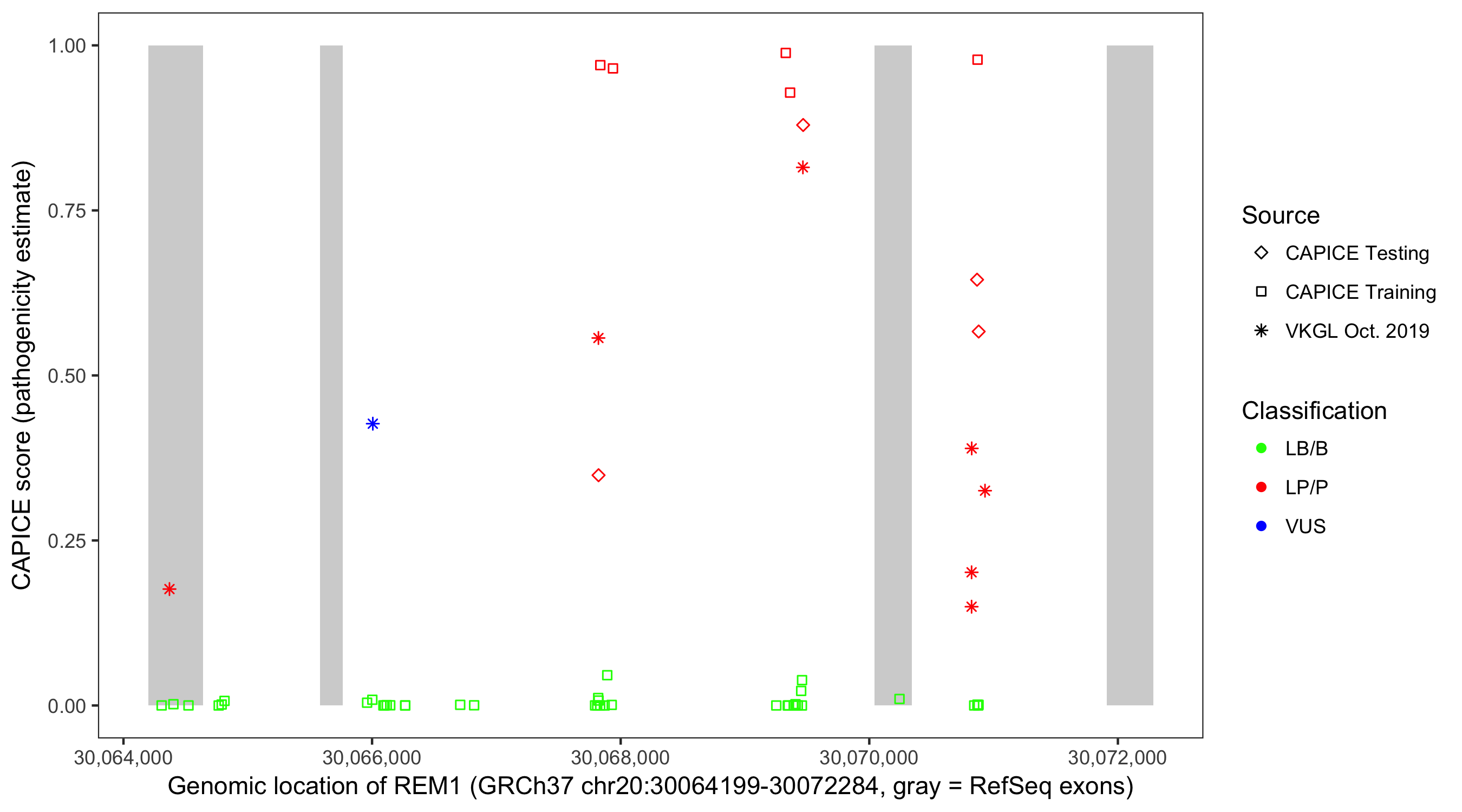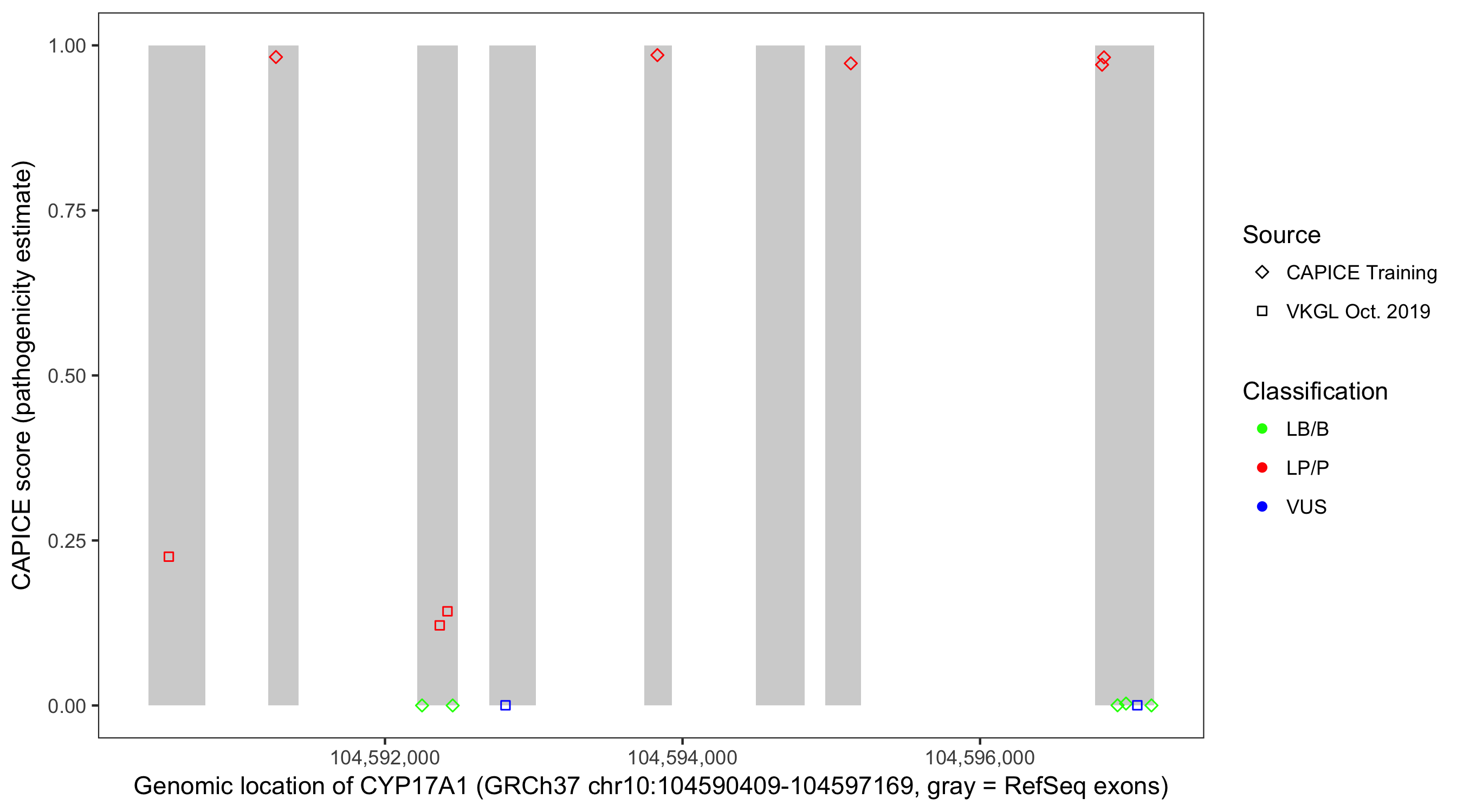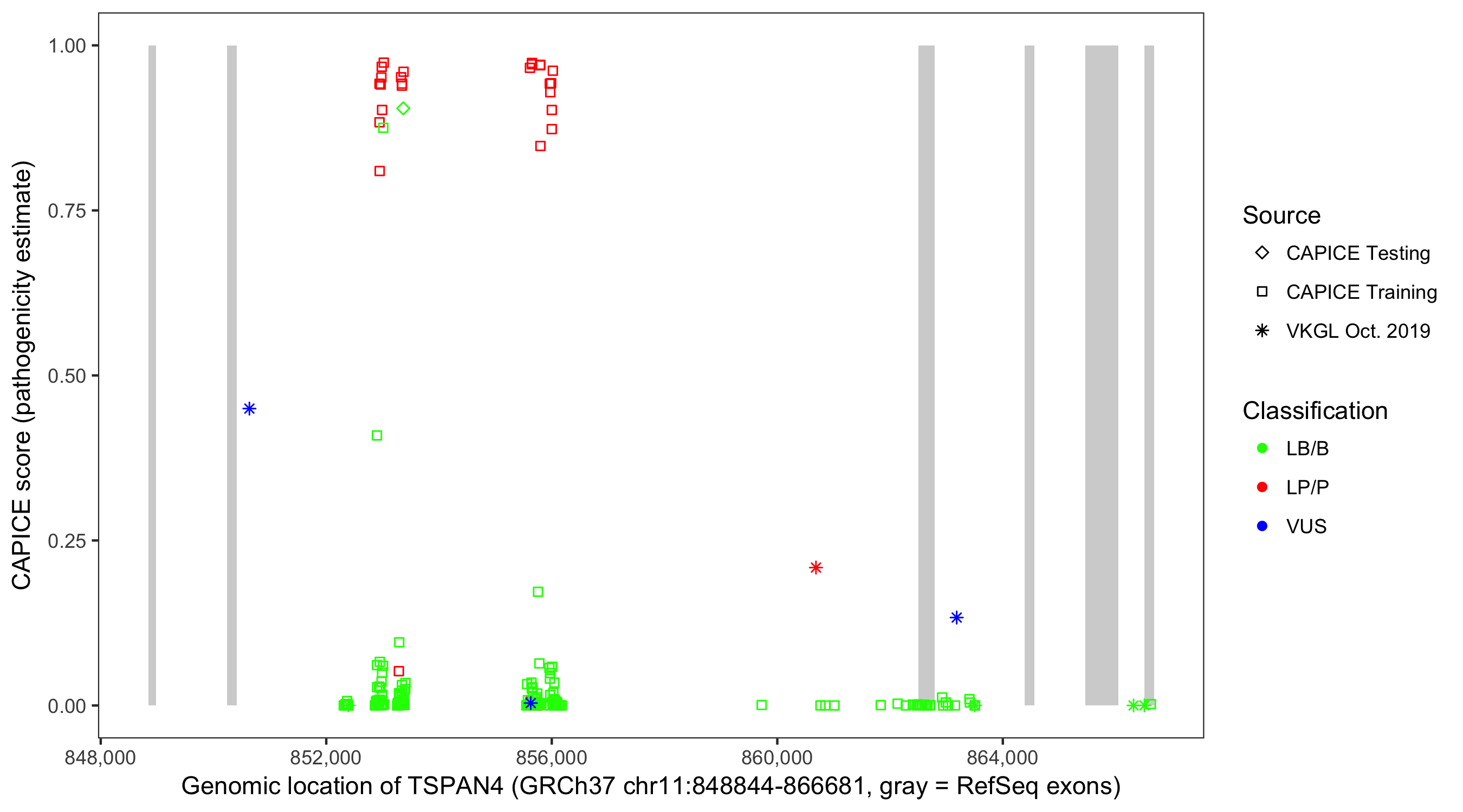 Shown are CAPICE train/test variants plus VKGL Oct 2019.