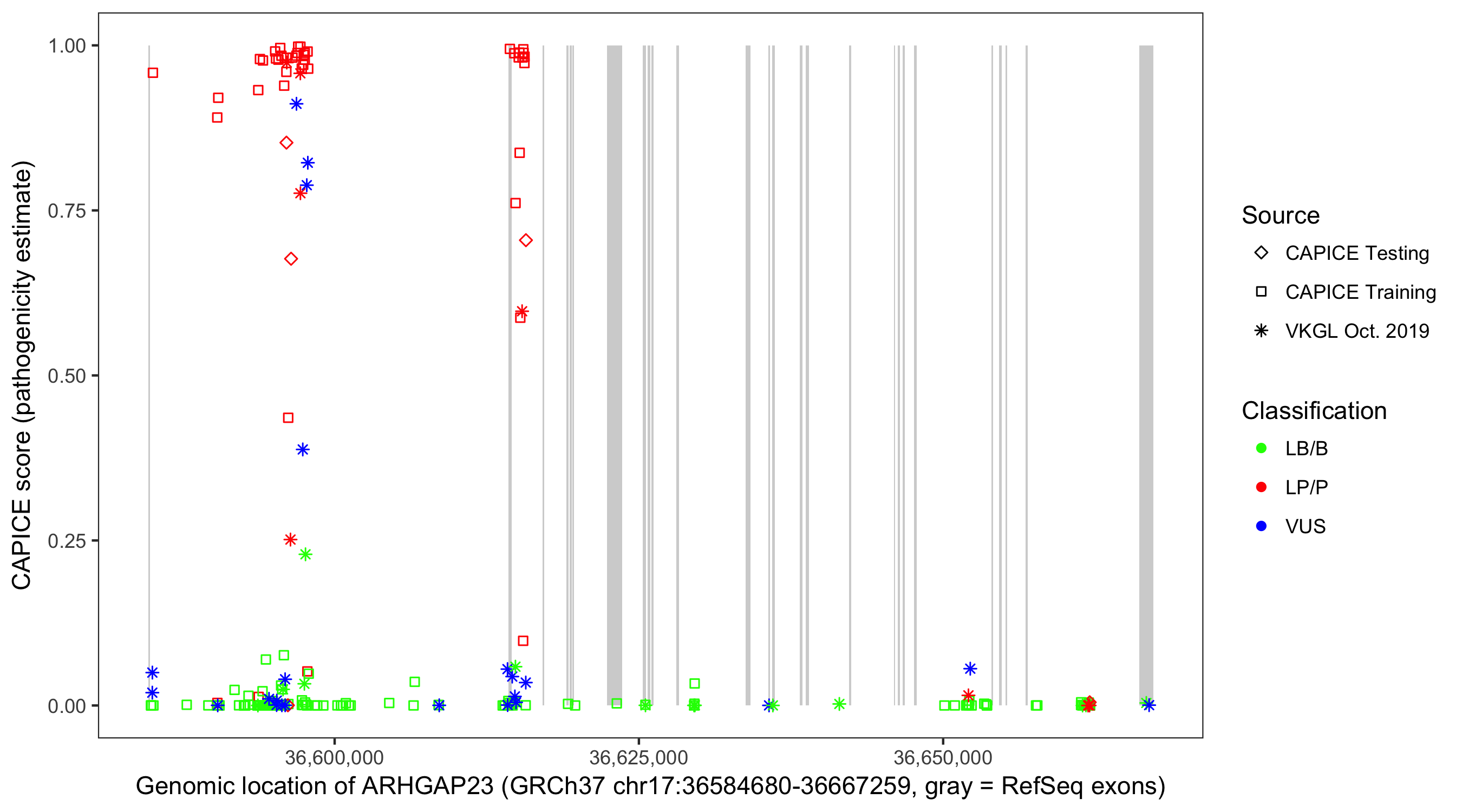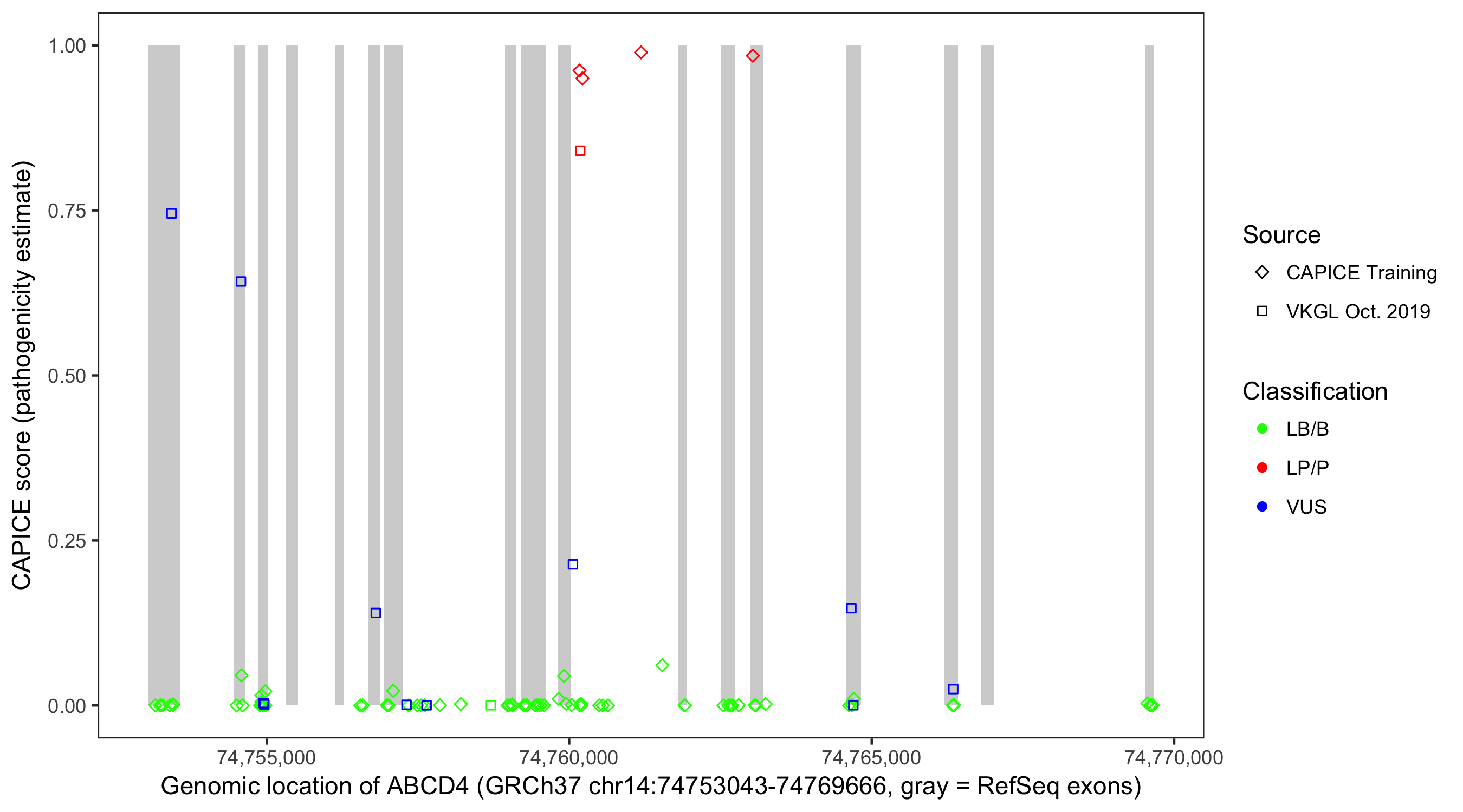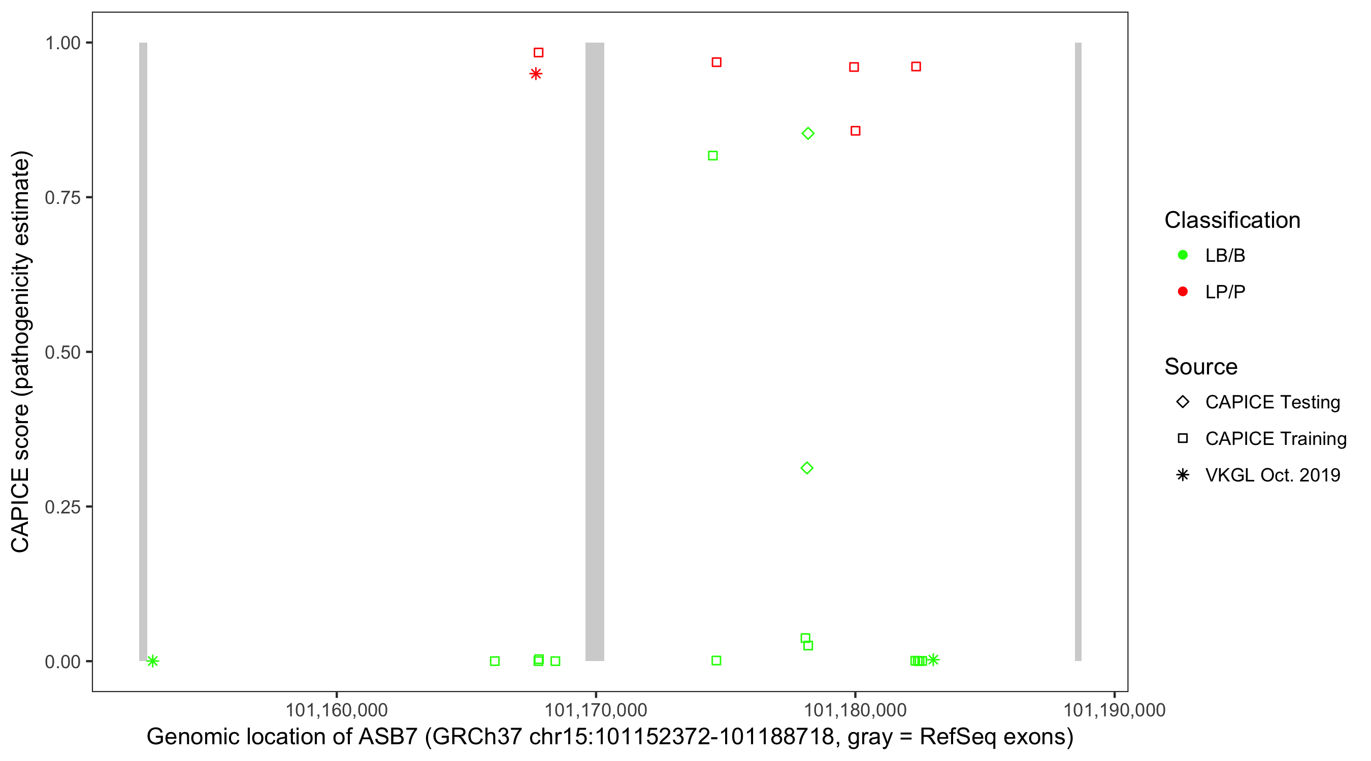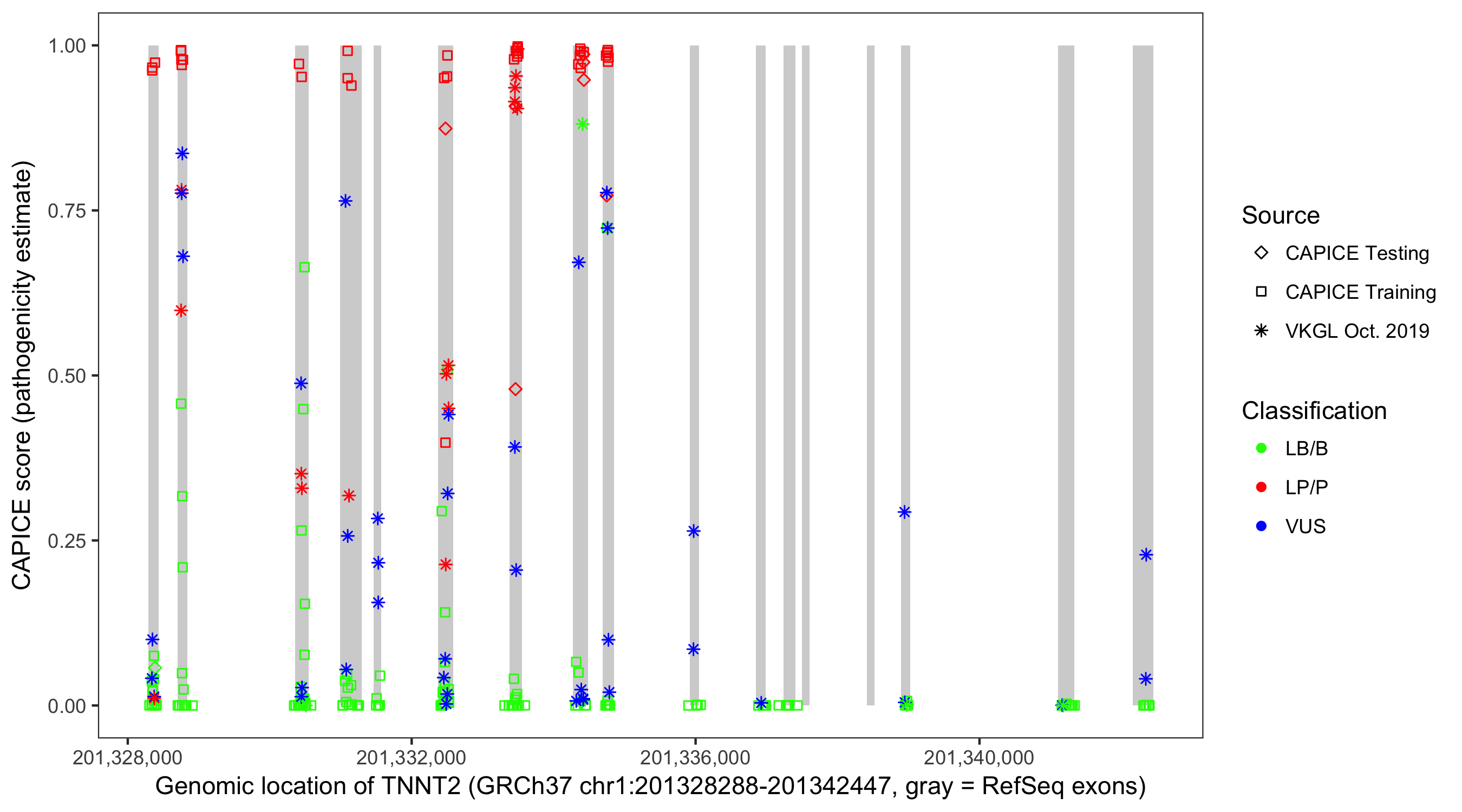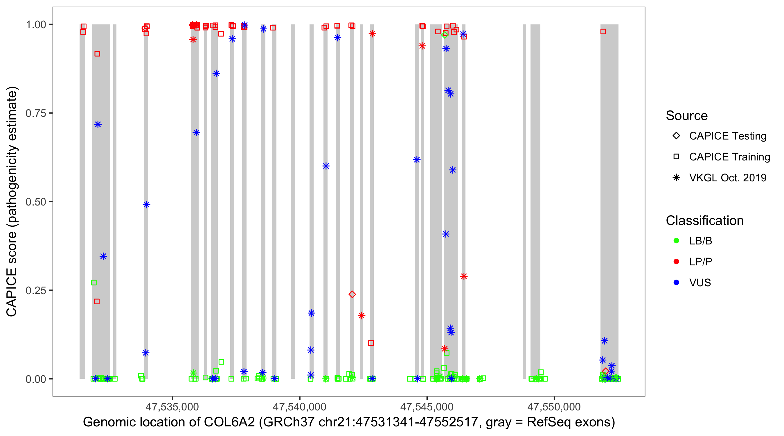 Shown are CAPICE train/test variants plus VKGL Oct 2019.