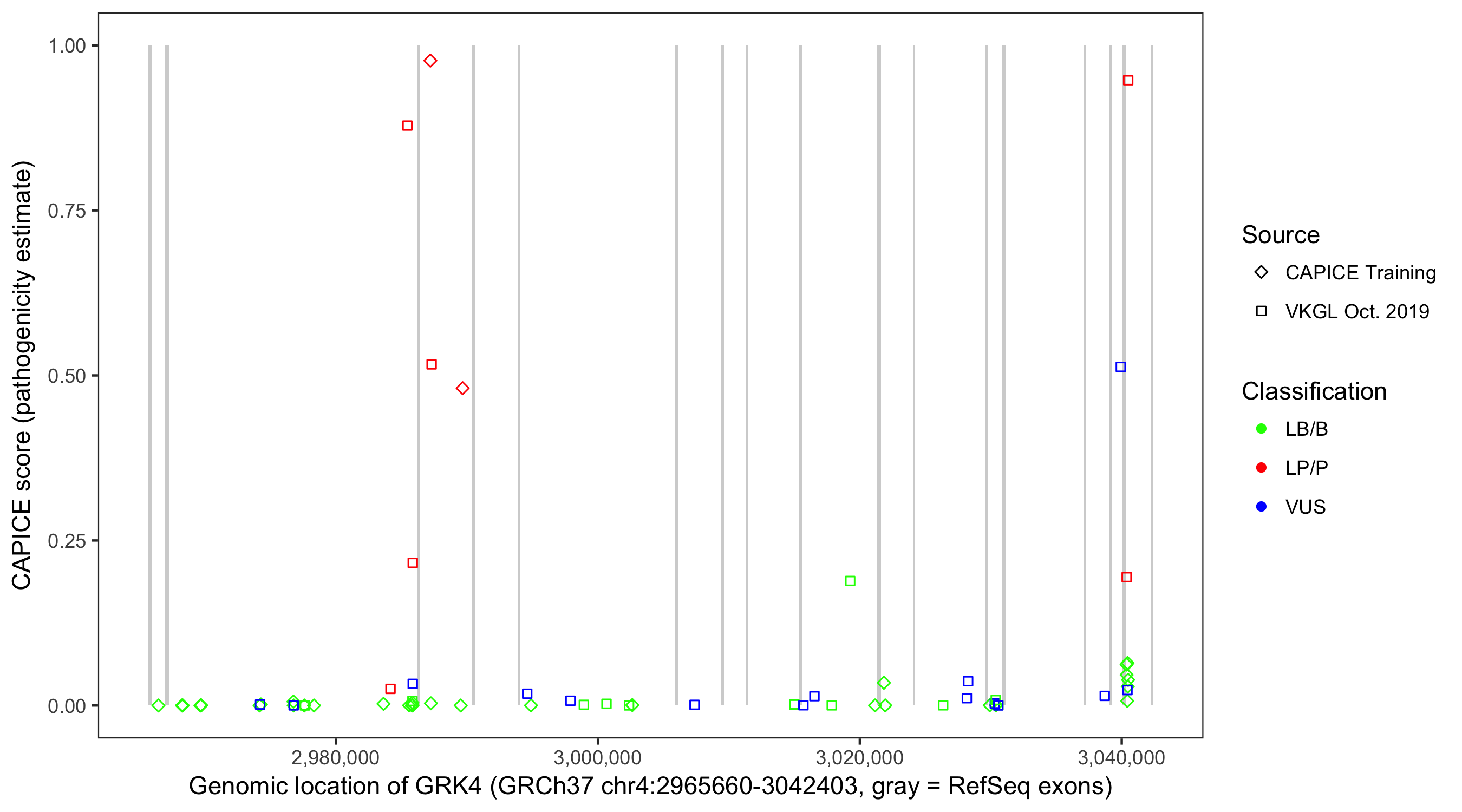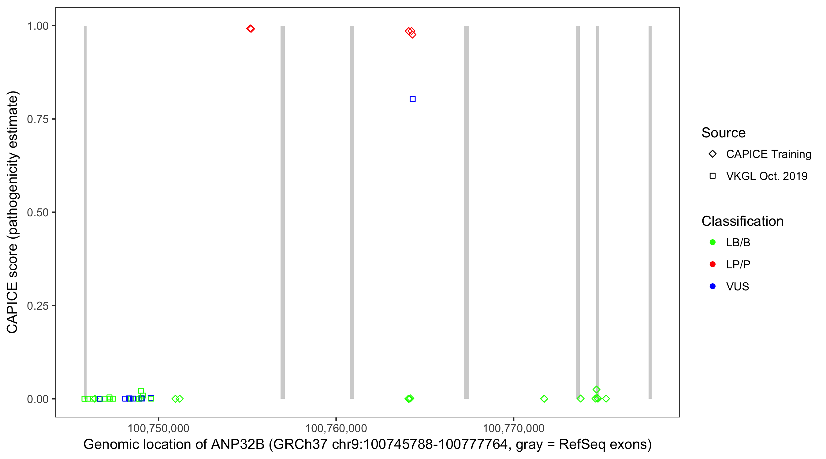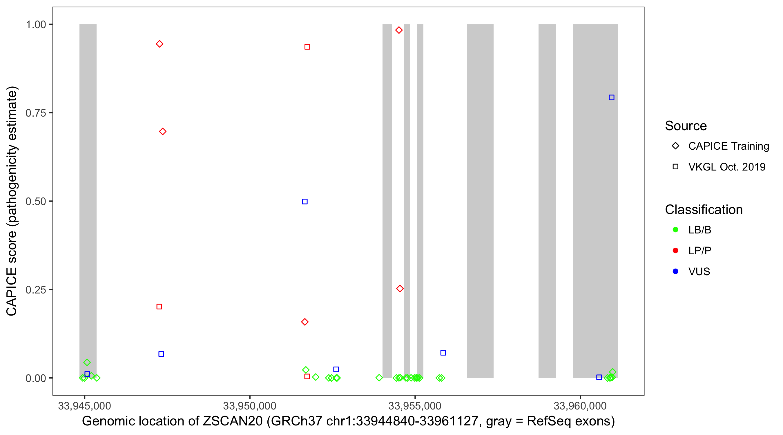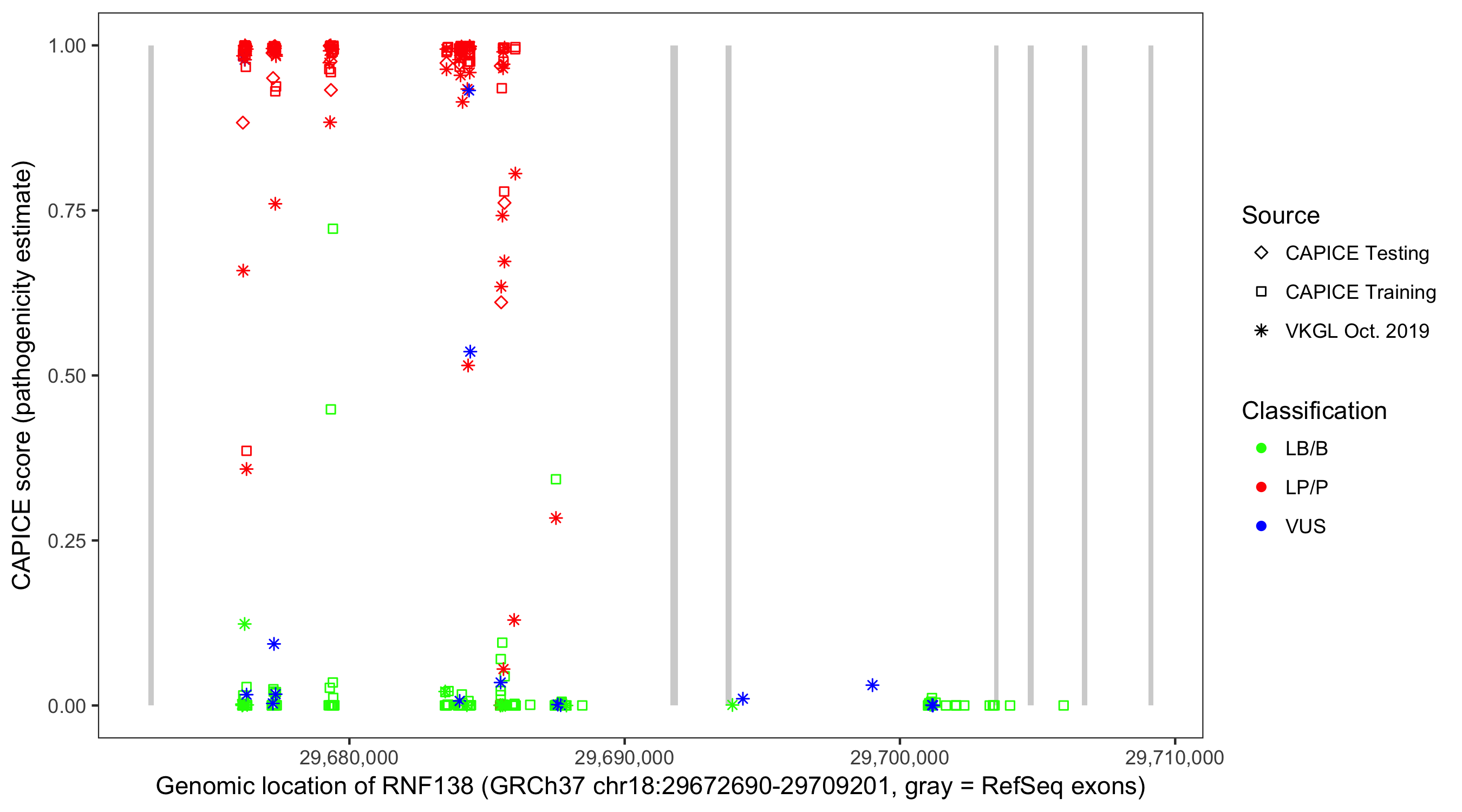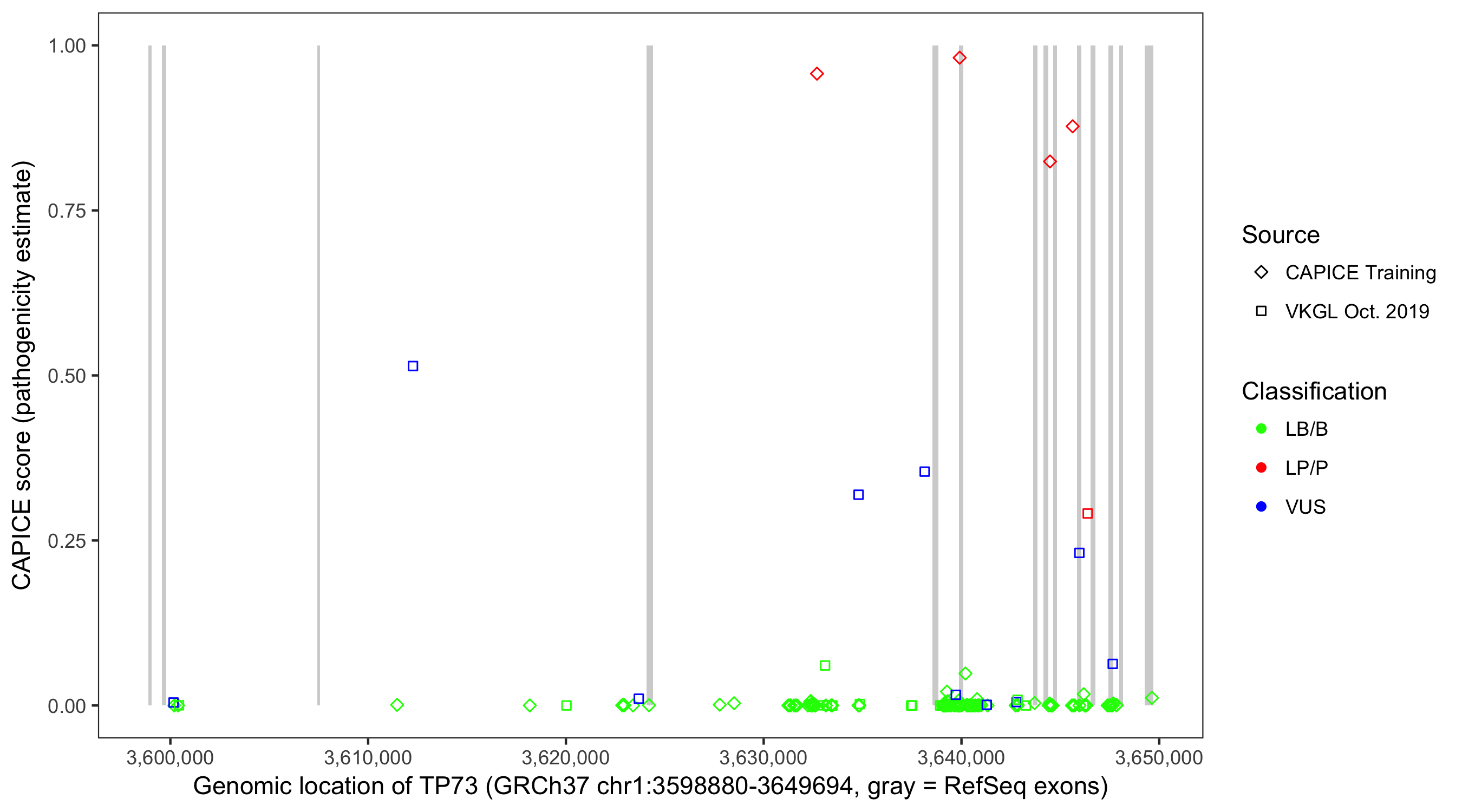 Shown are CAPICE train/test variants plus VKGL Oct 2019.