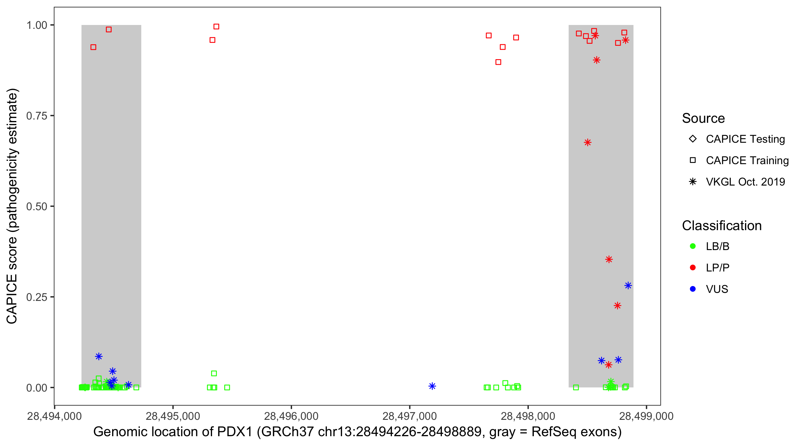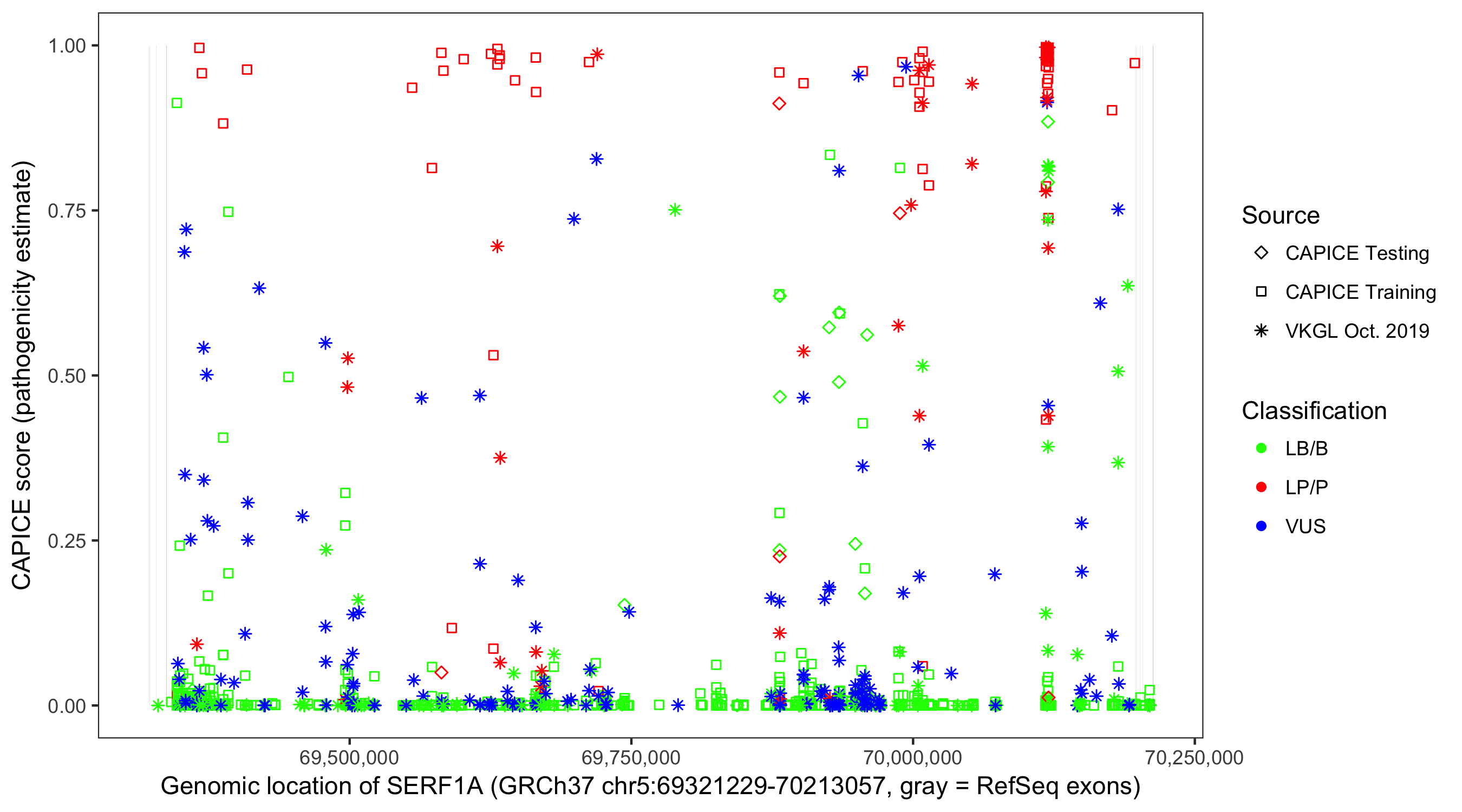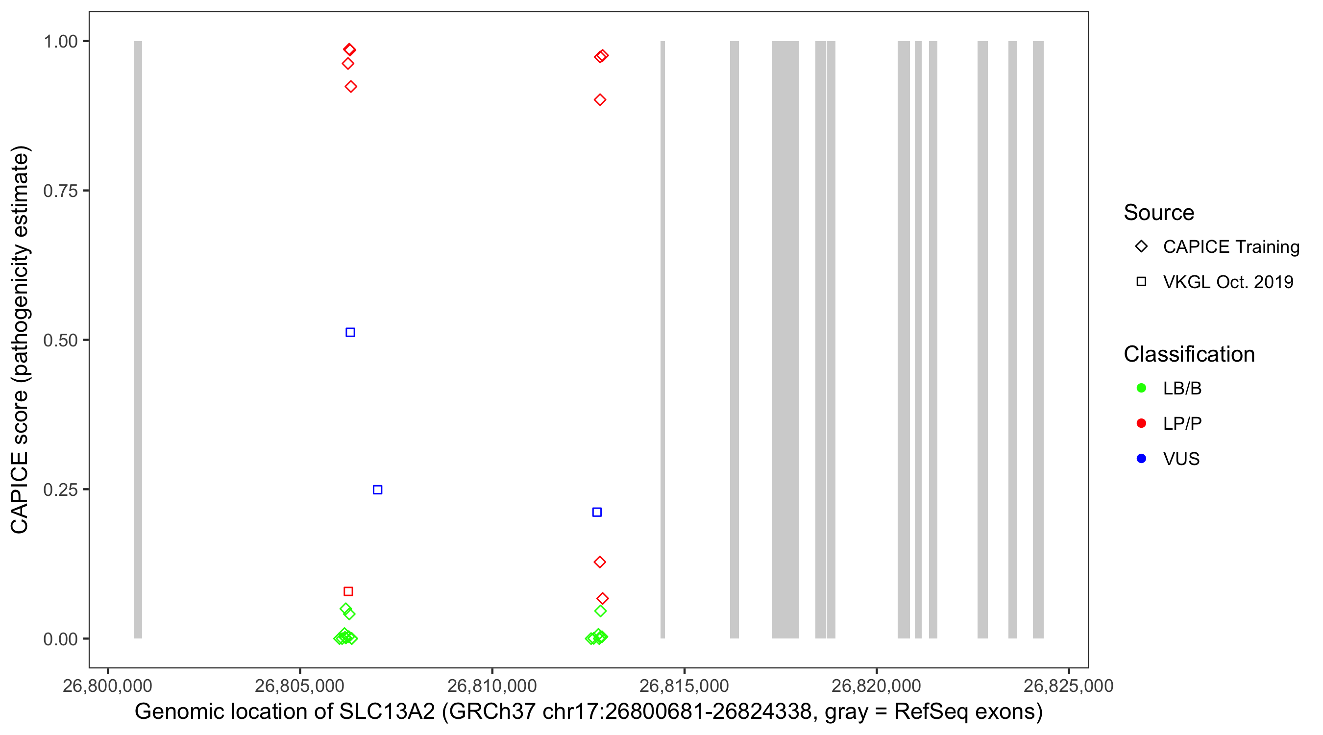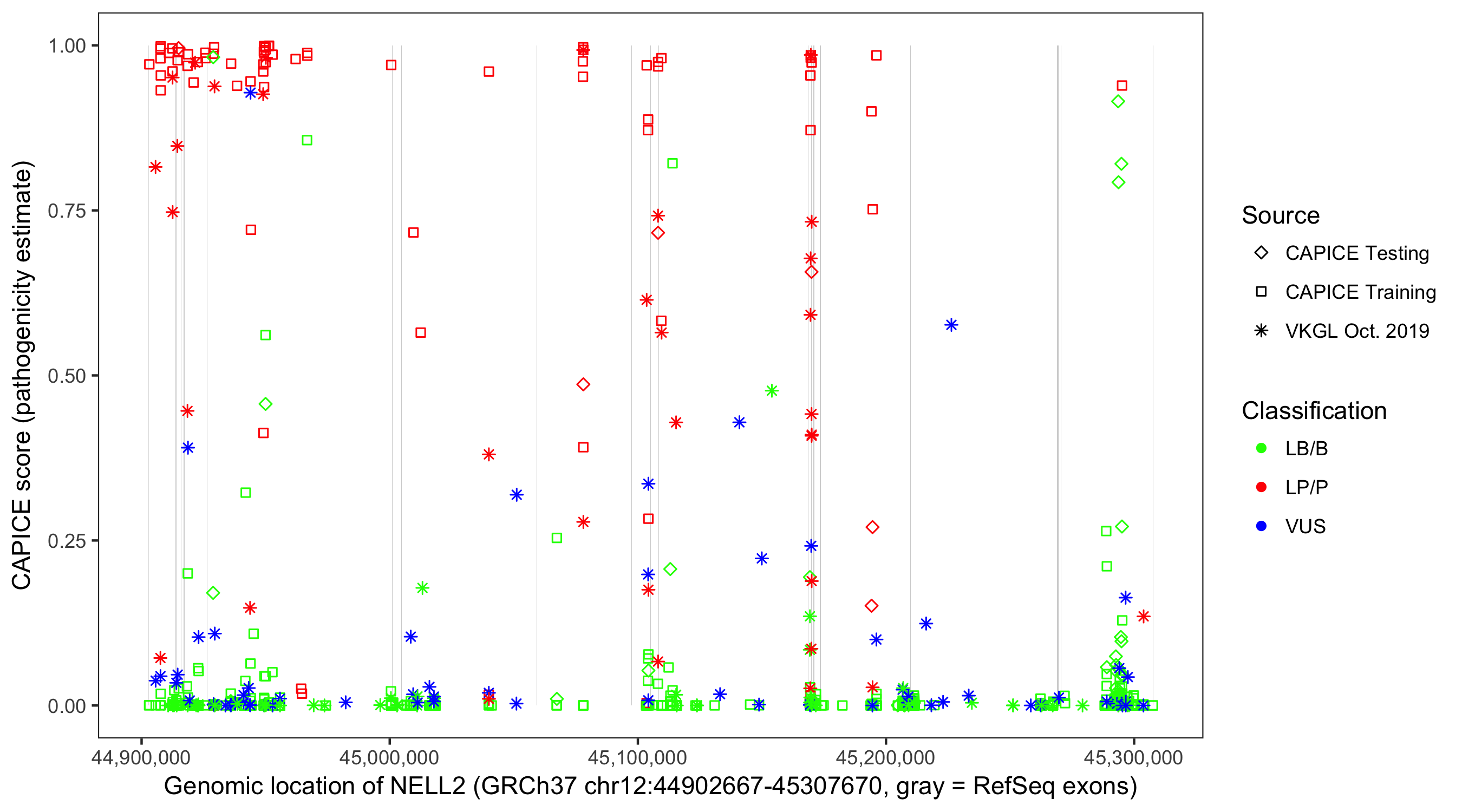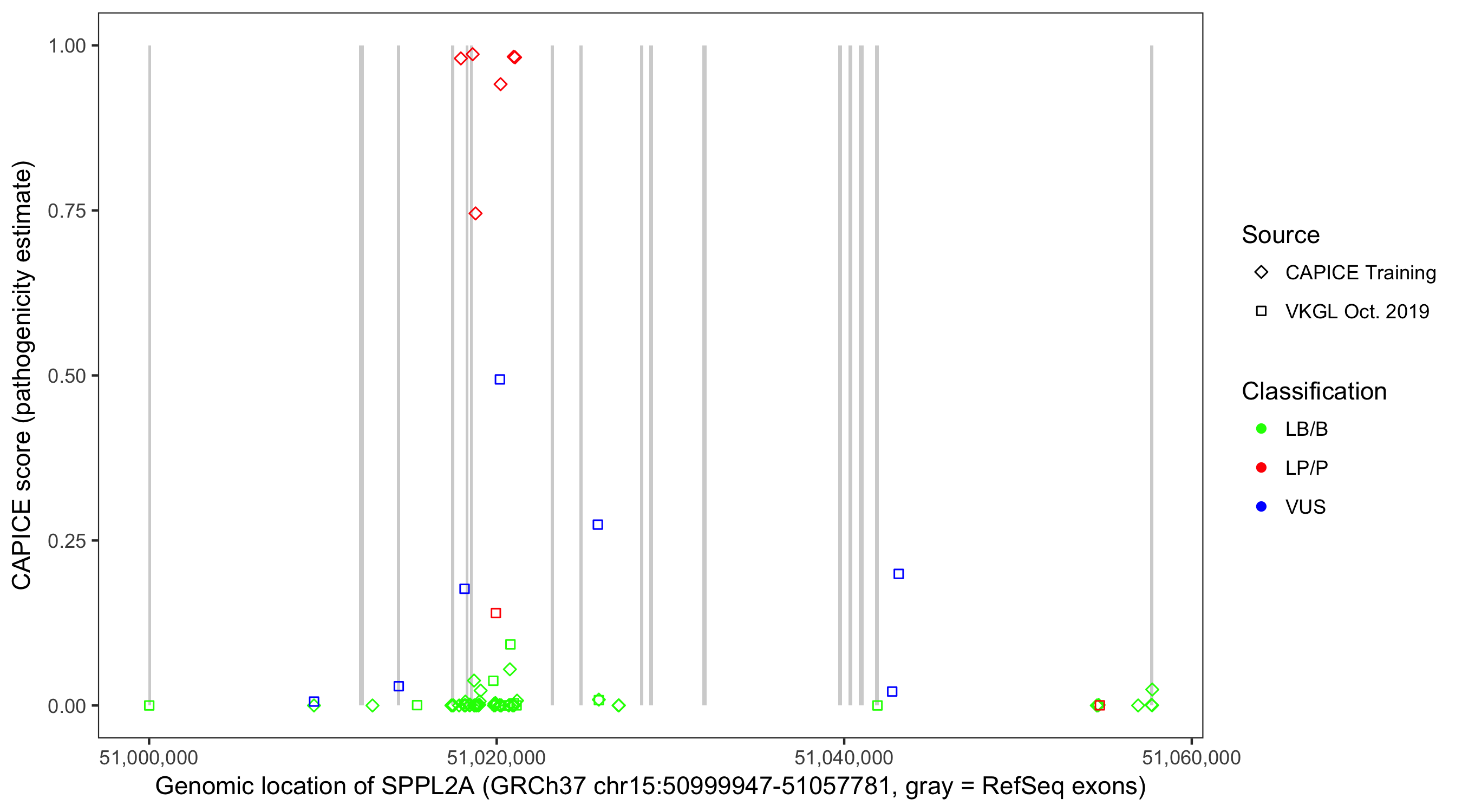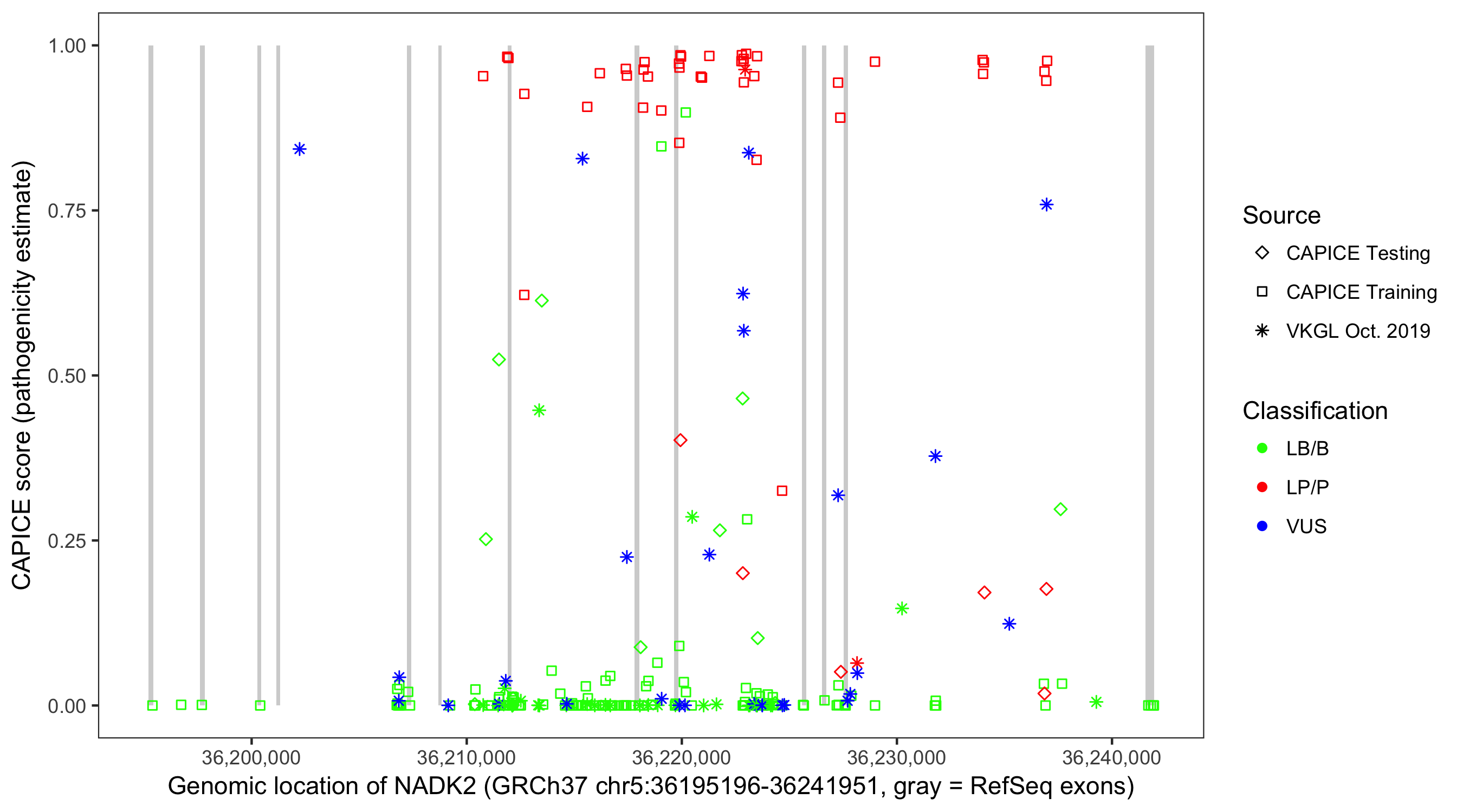 Shown are CAPICE train/test variants plus VKGL Oct 2019.