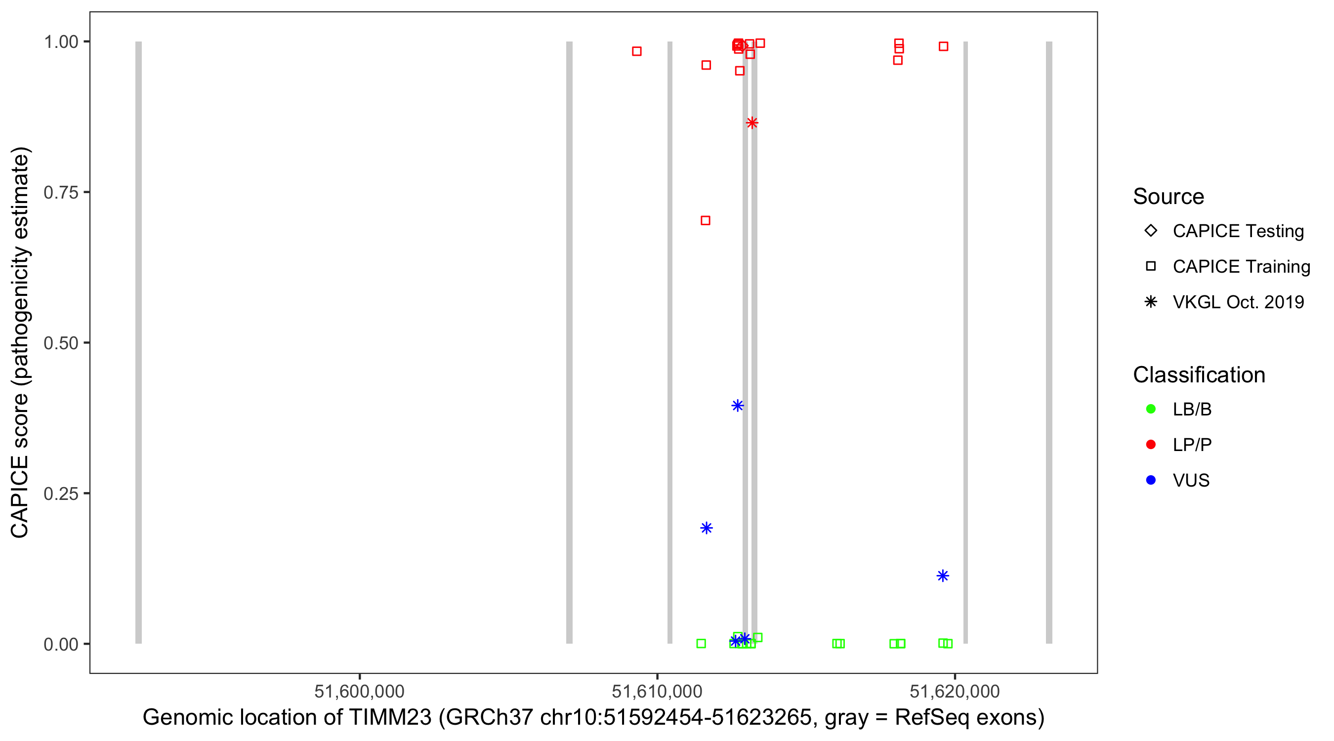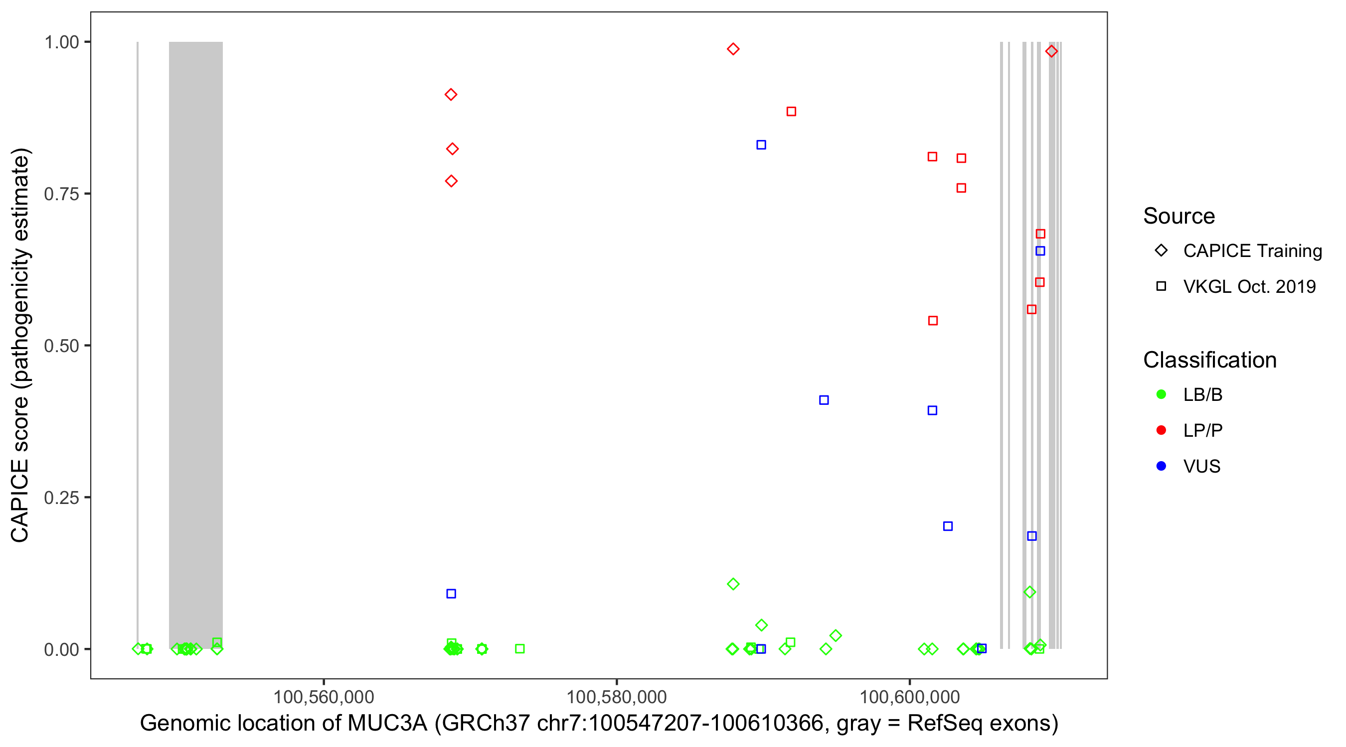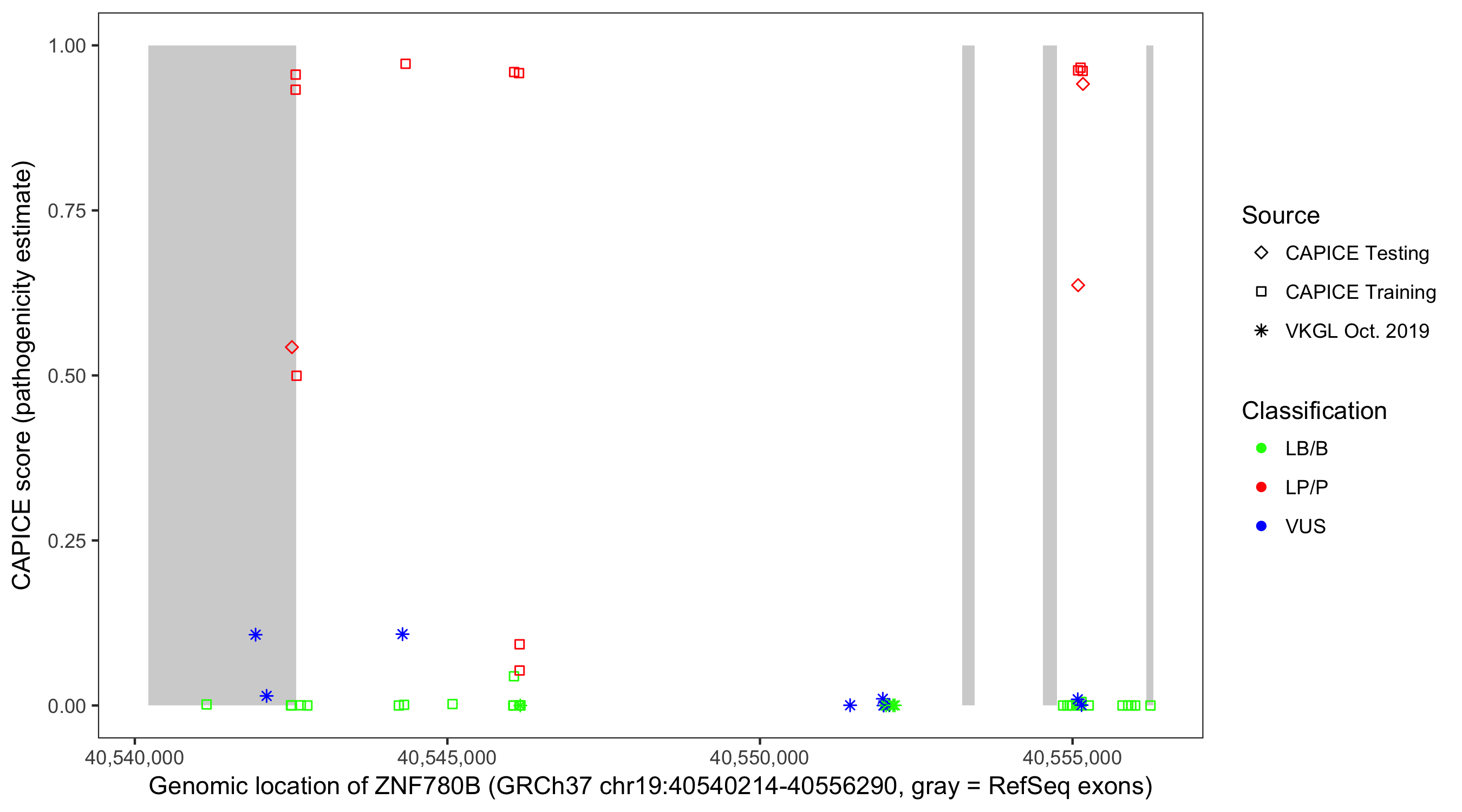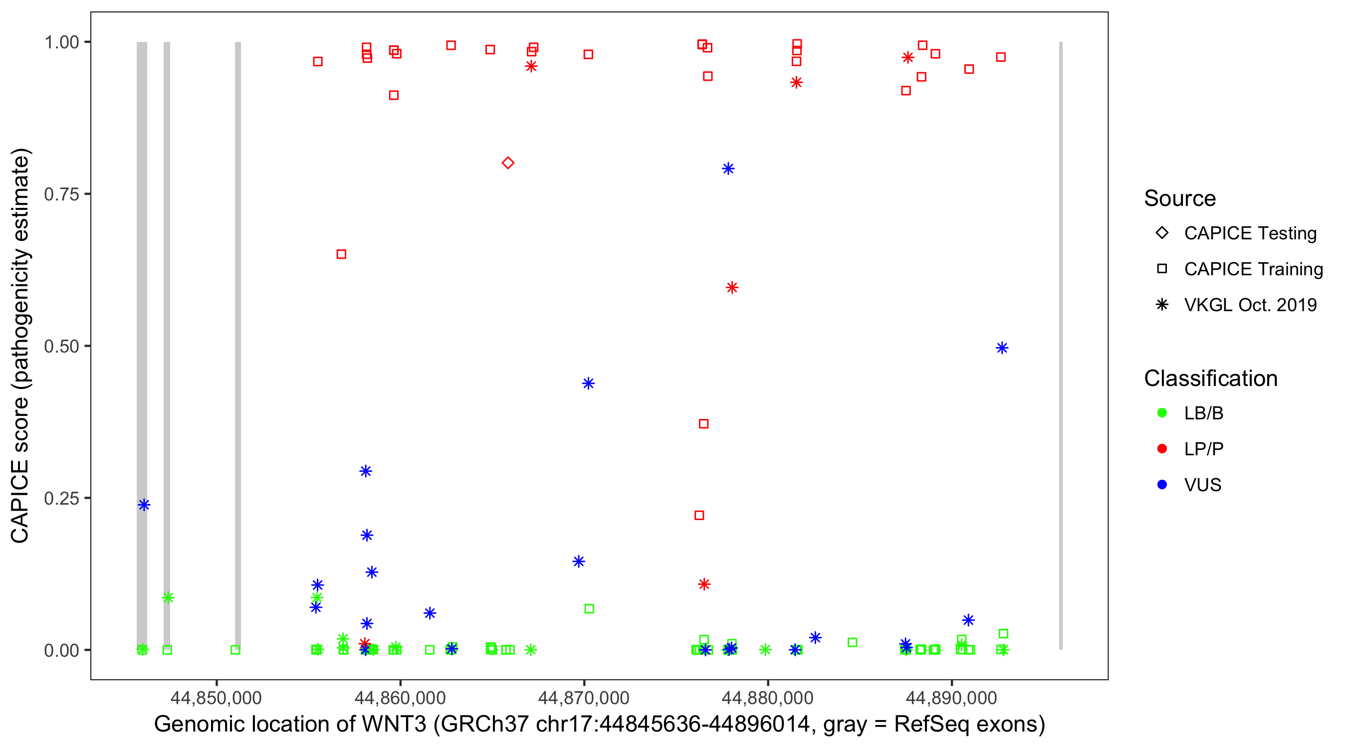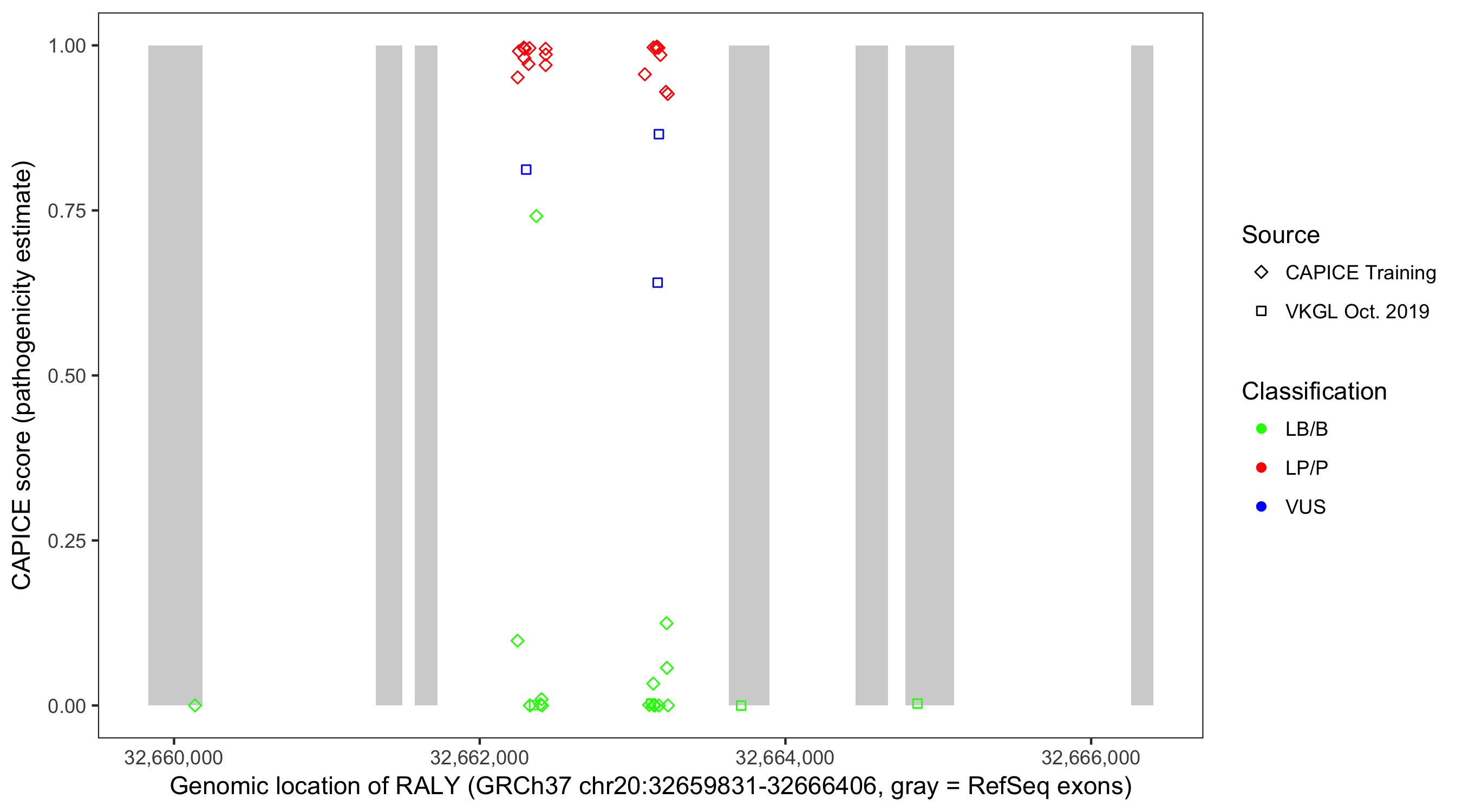 Shown are CAPICE train/test variants plus VKGL Oct 2019.