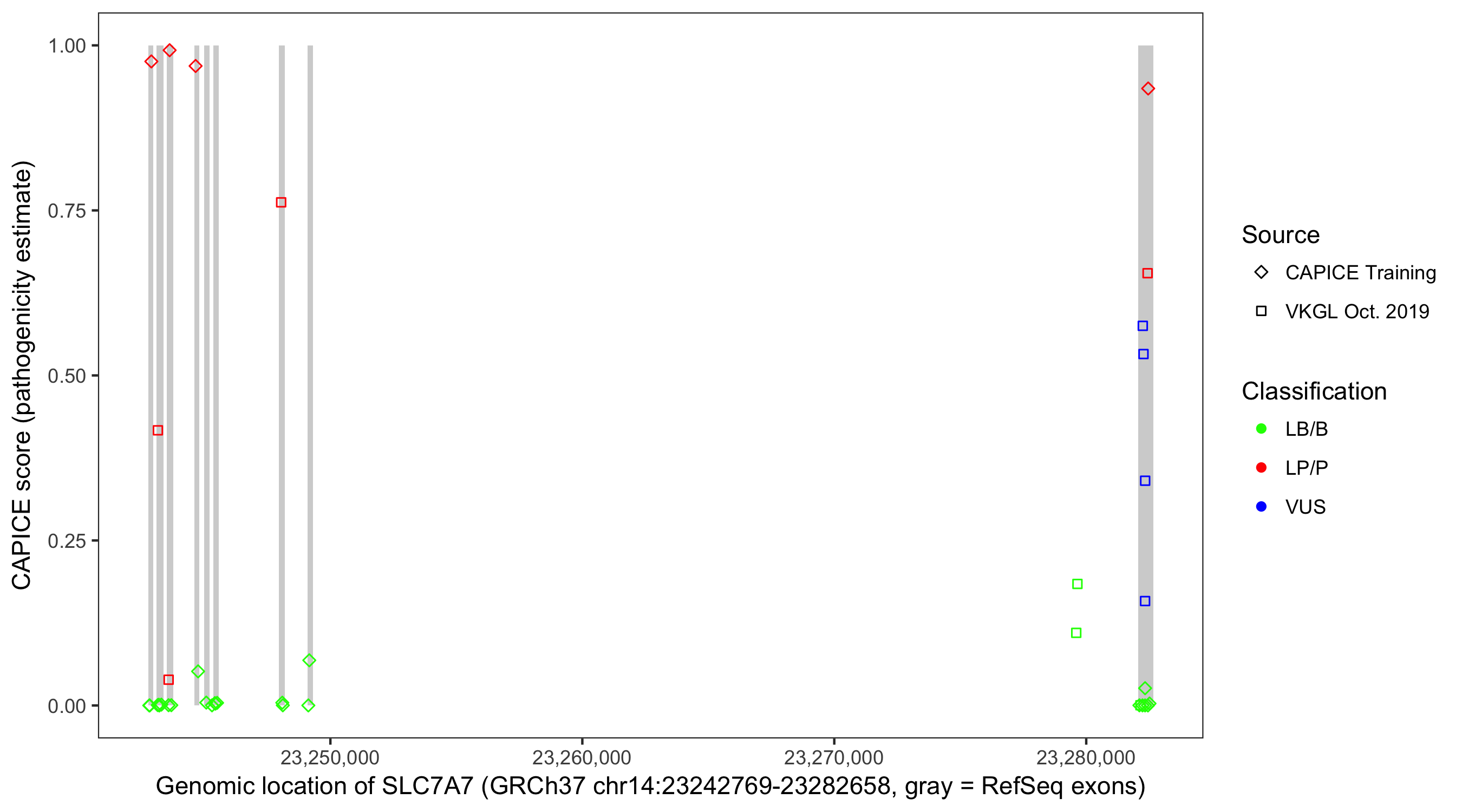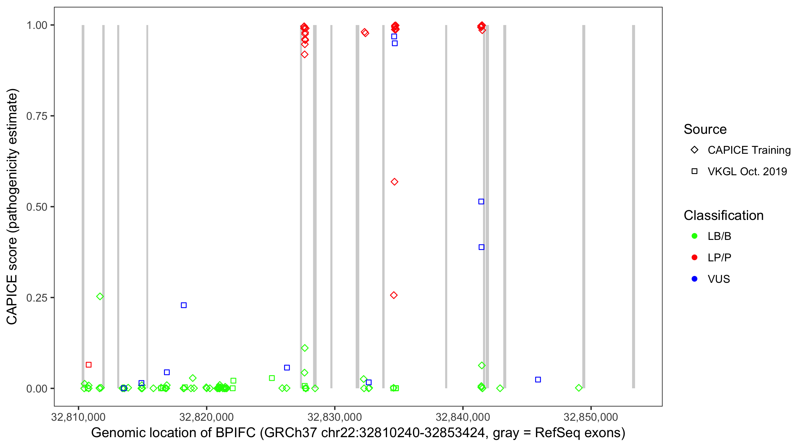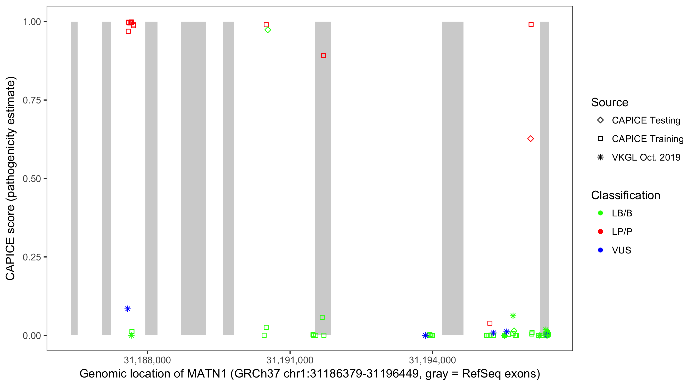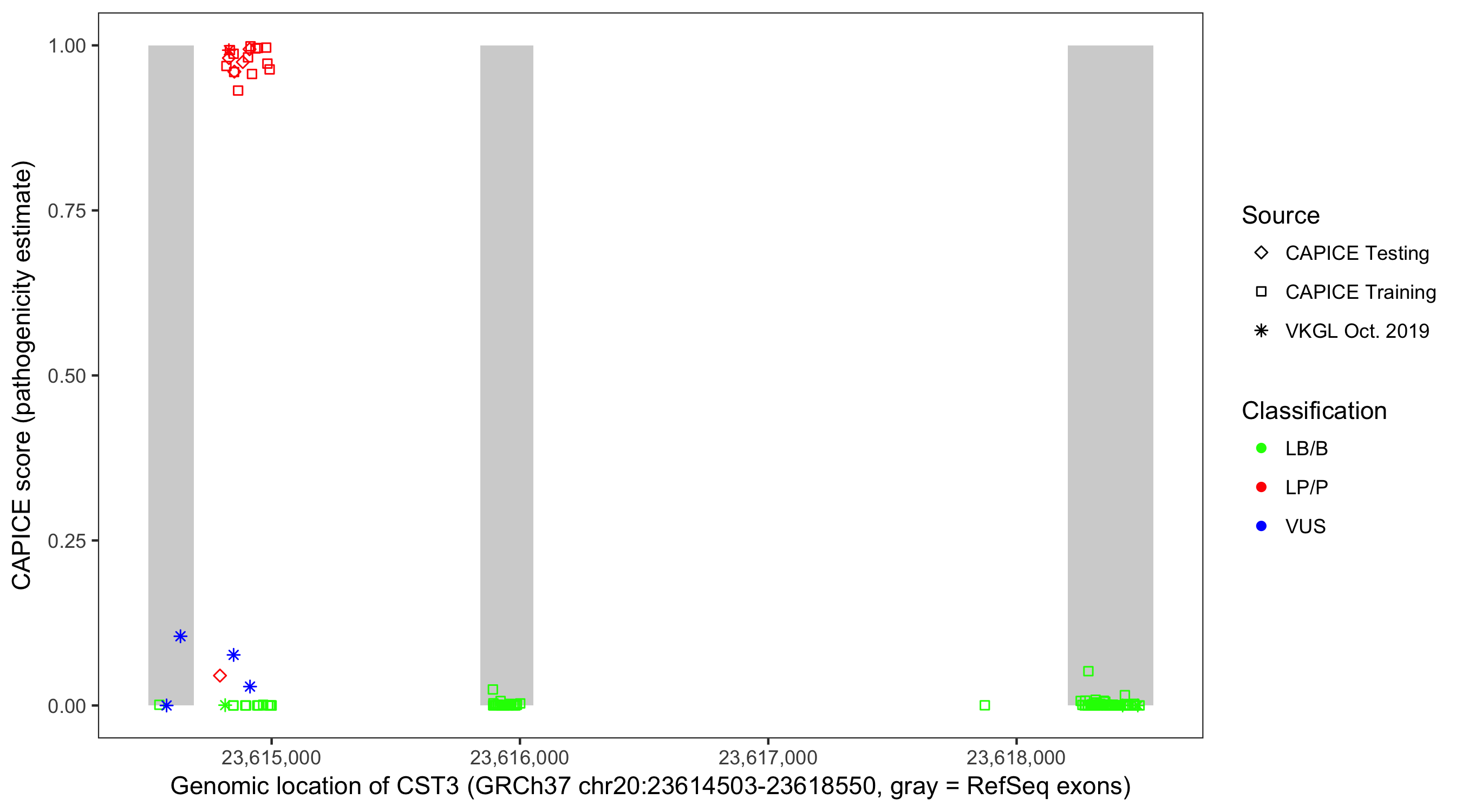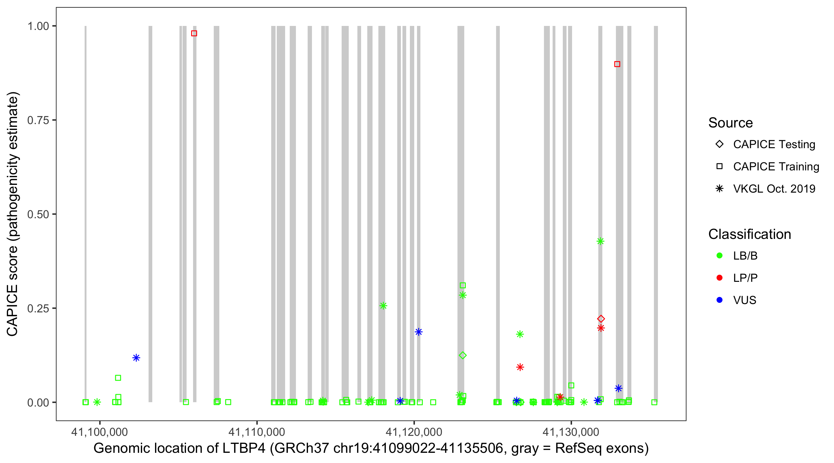 Shown are CAPICE train/test variants plus VKGL Oct 2019.