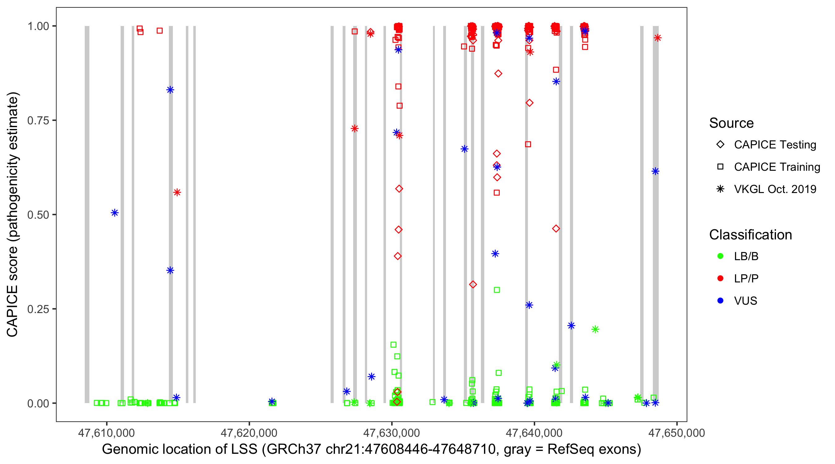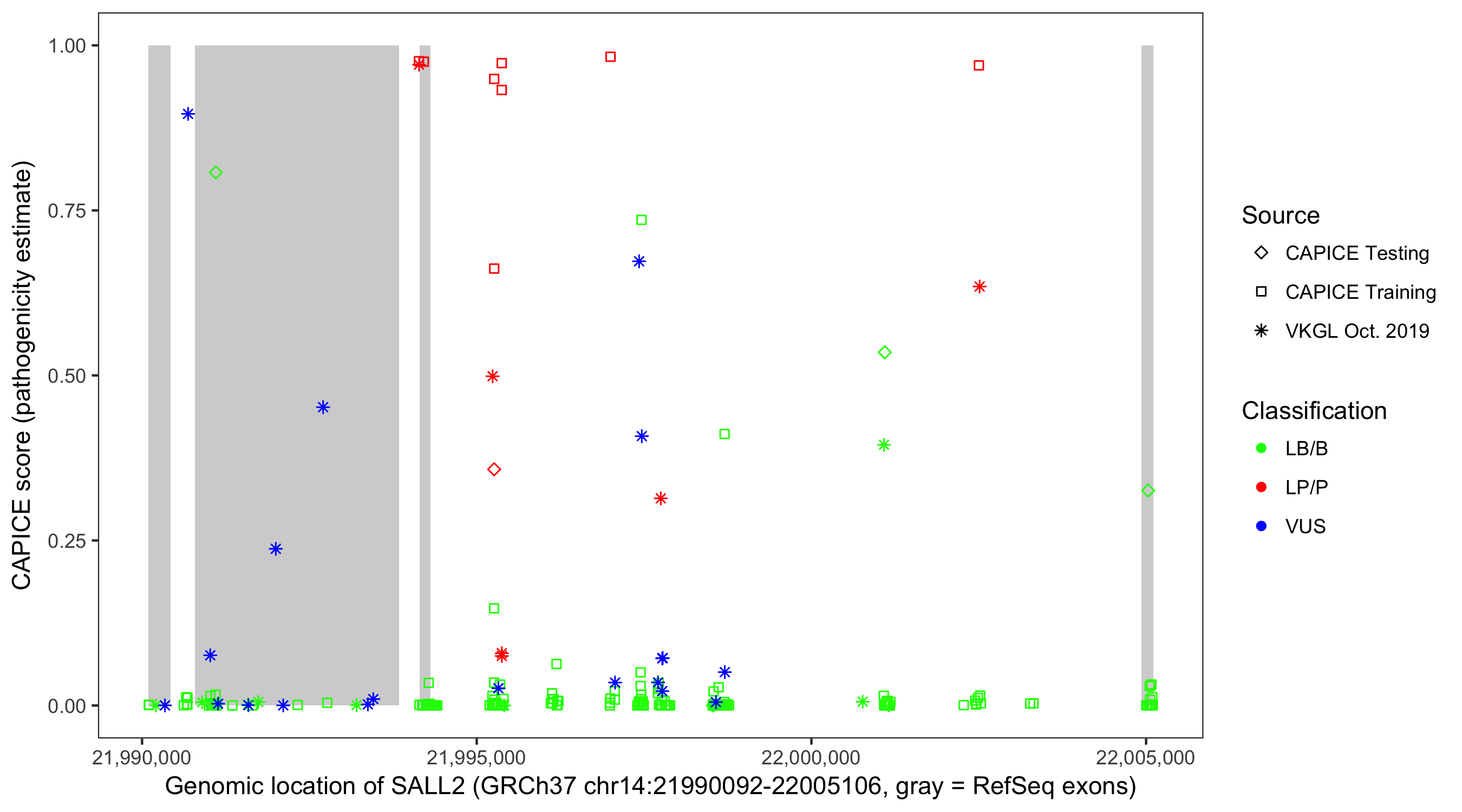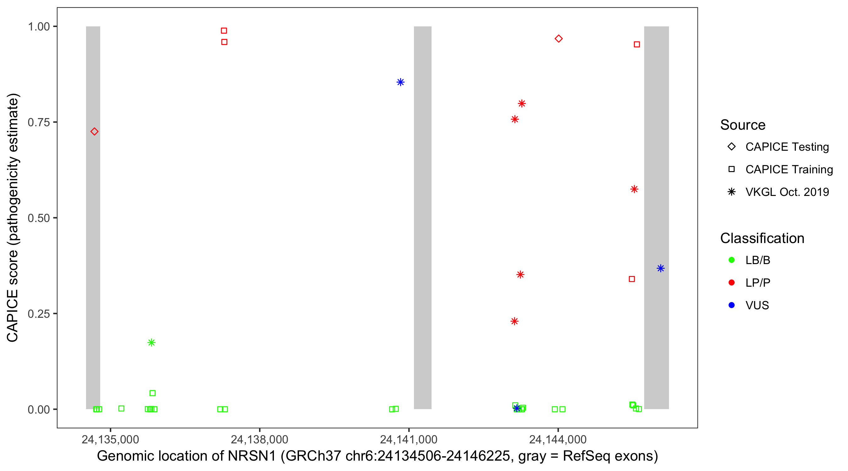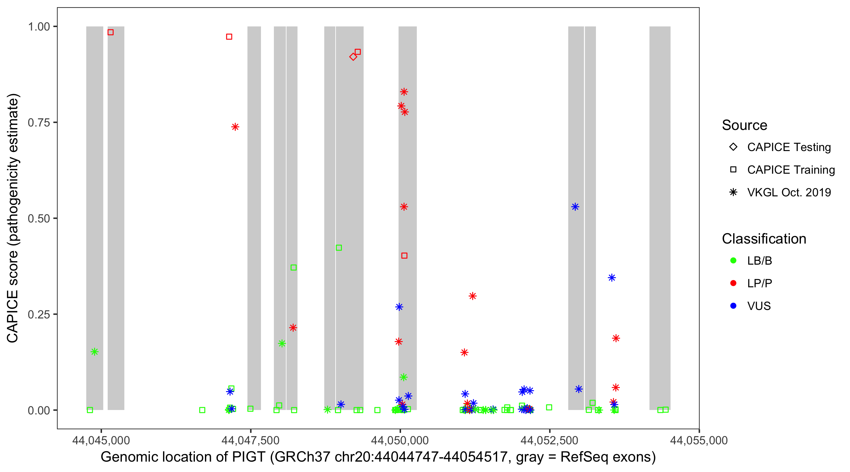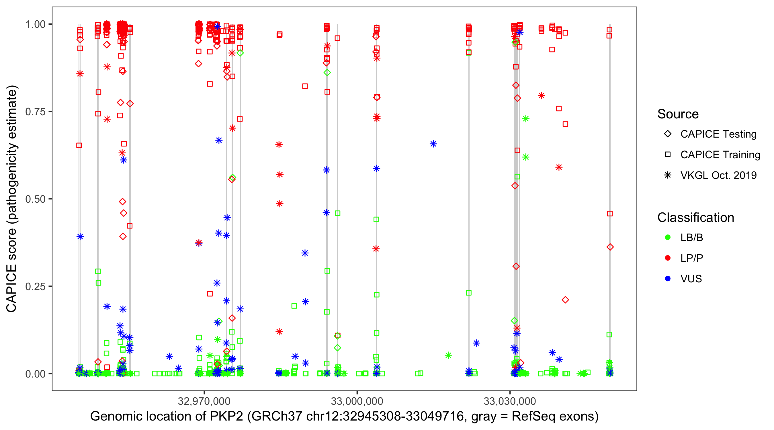 Shown are CAPICE train/test variants plus VKGL Oct 2019.
