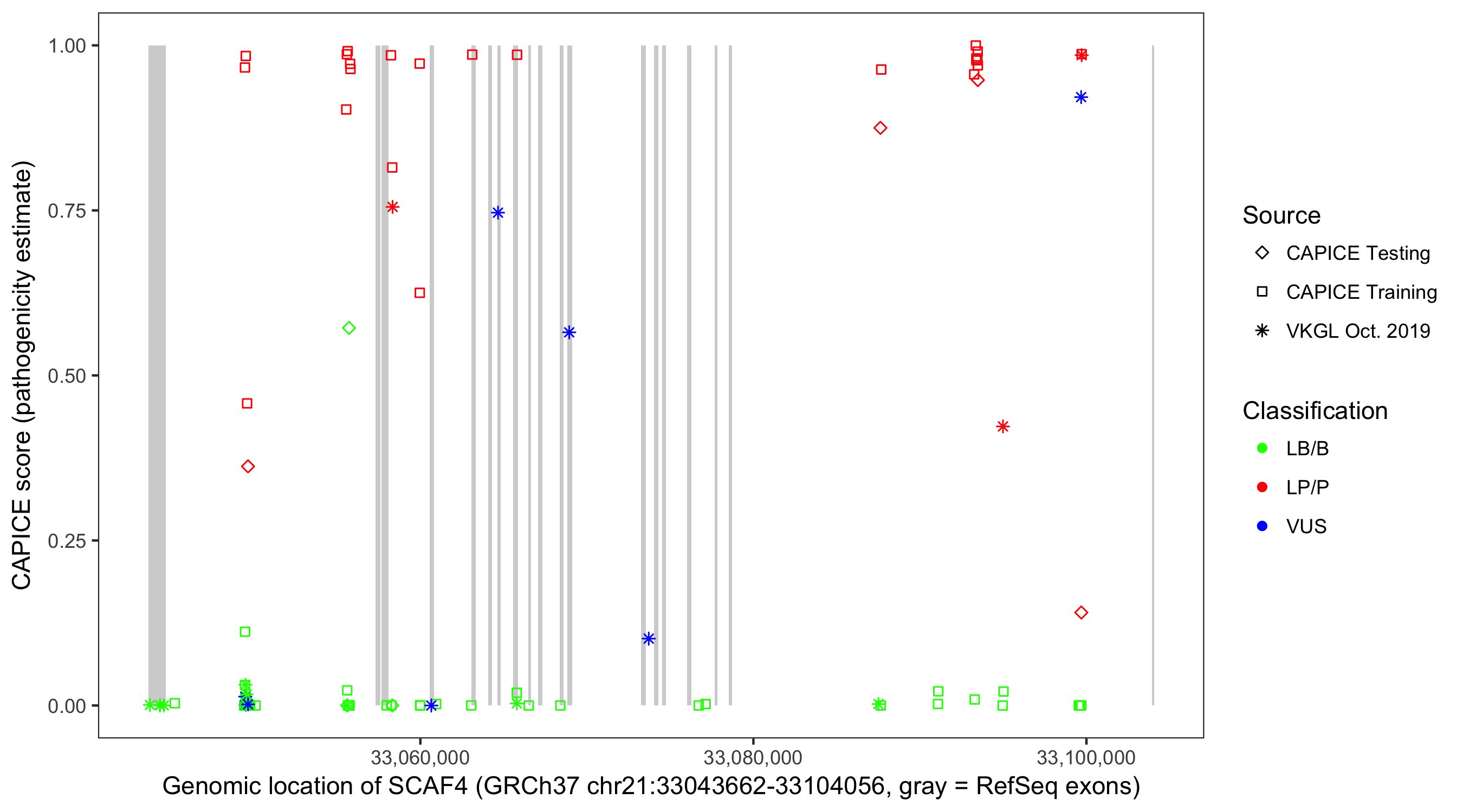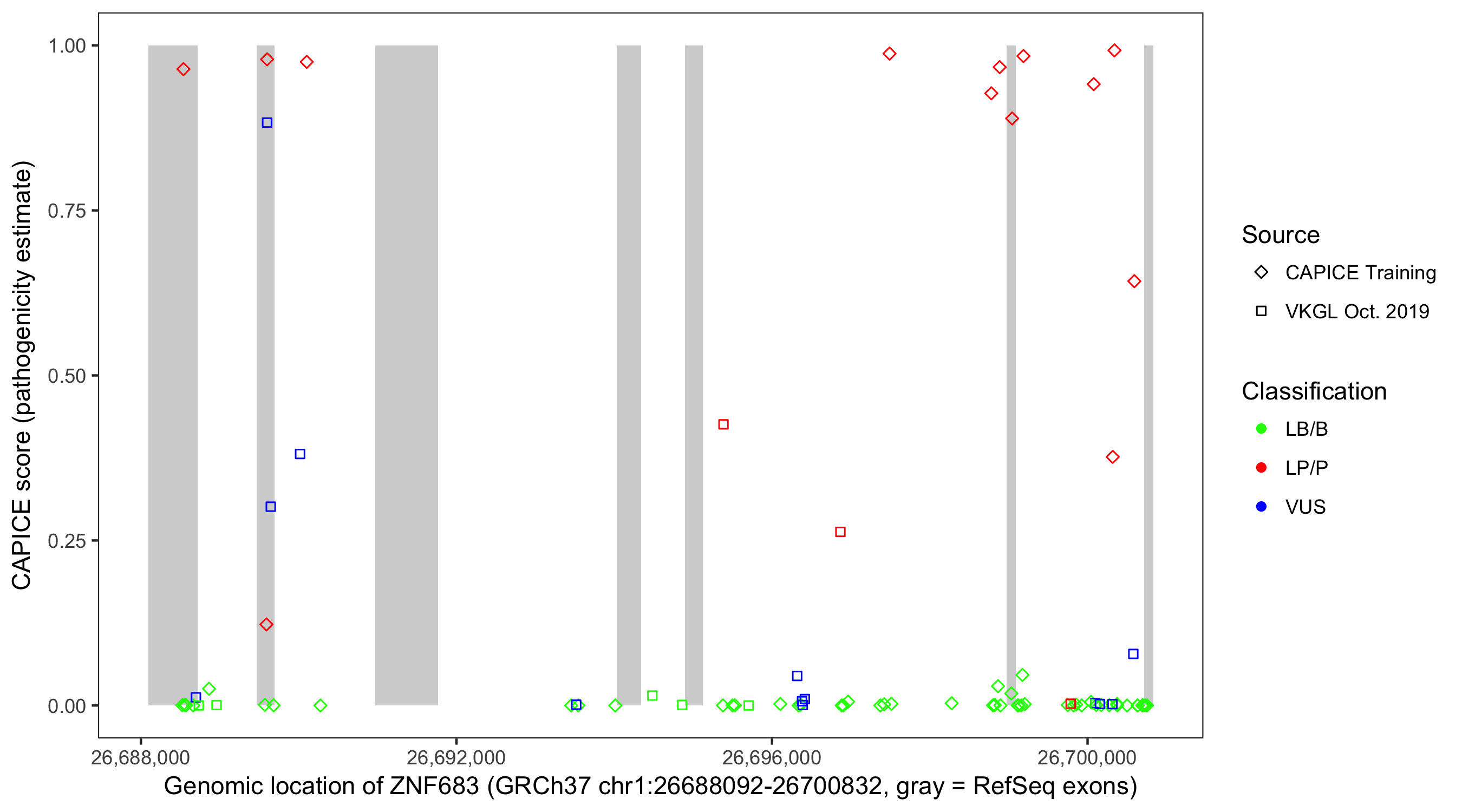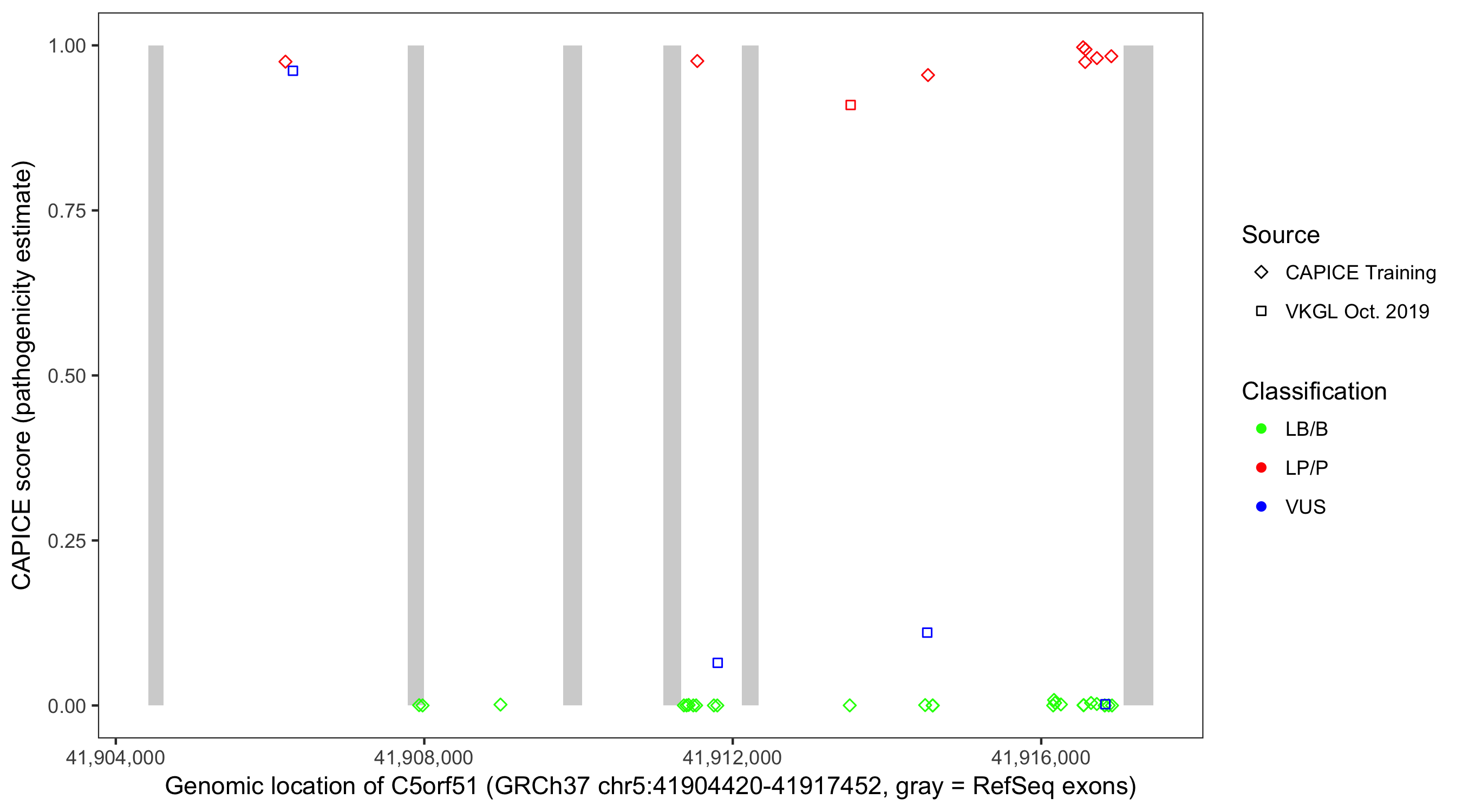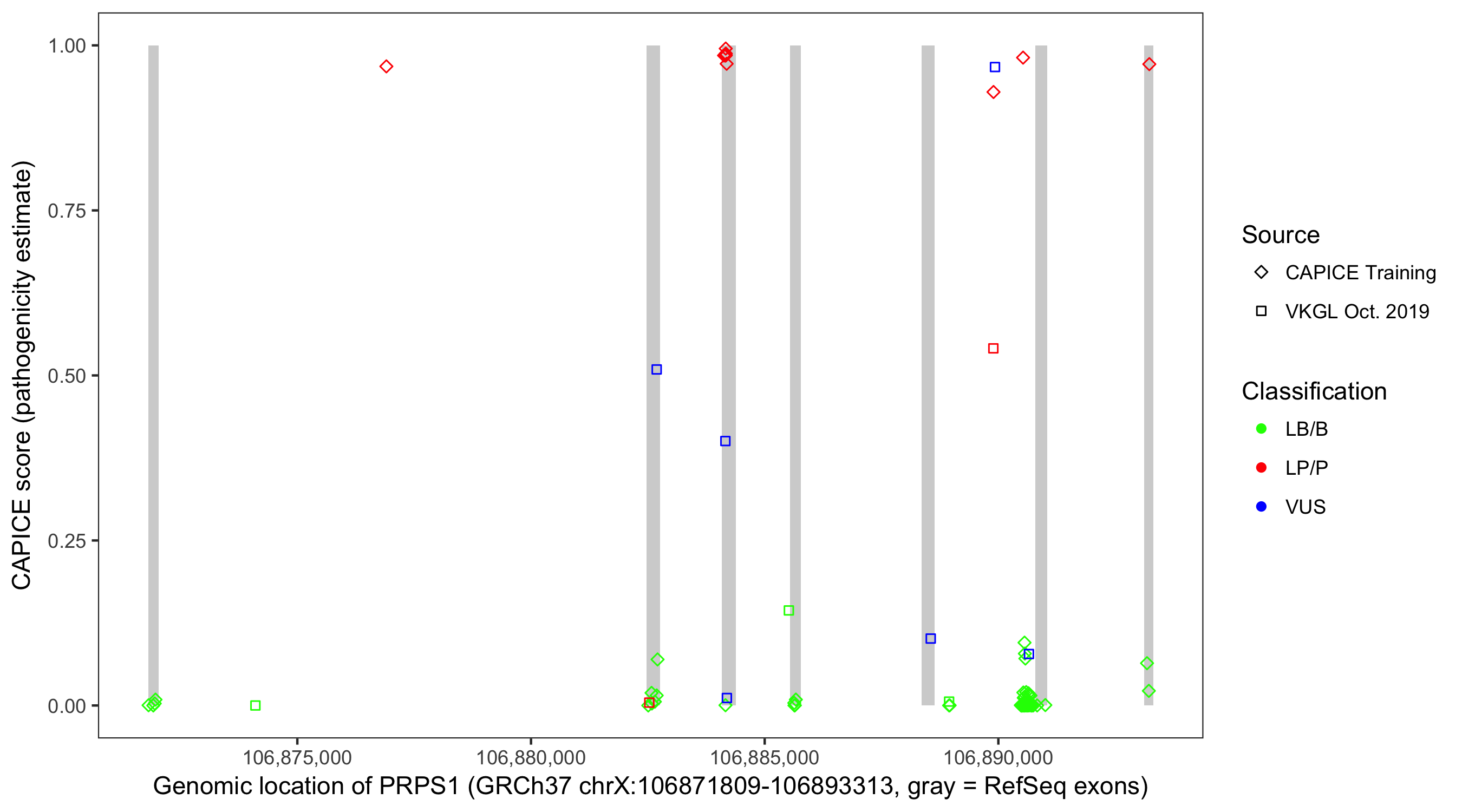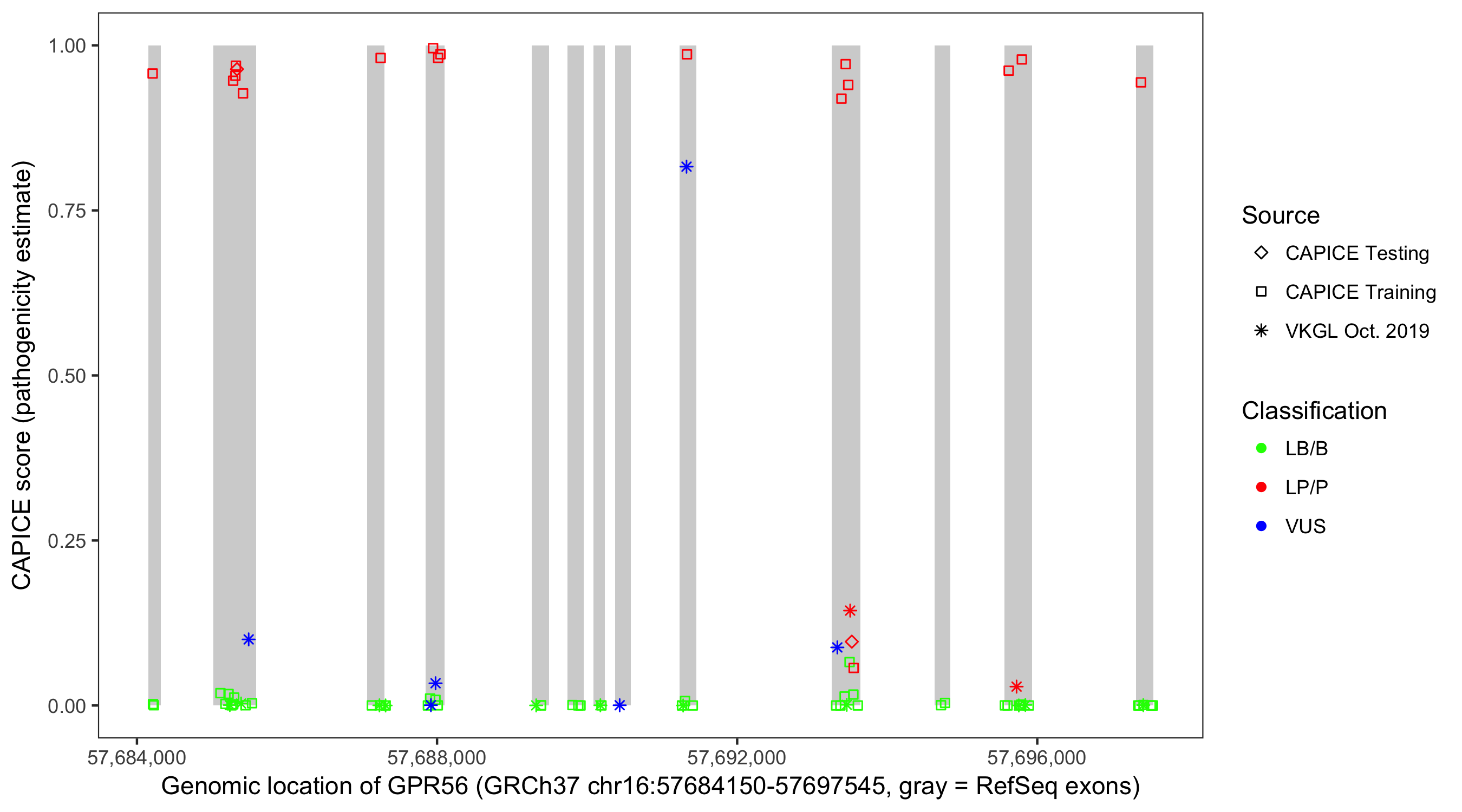 Shown are CAPICE train/test variants plus VKGL Oct 2019.