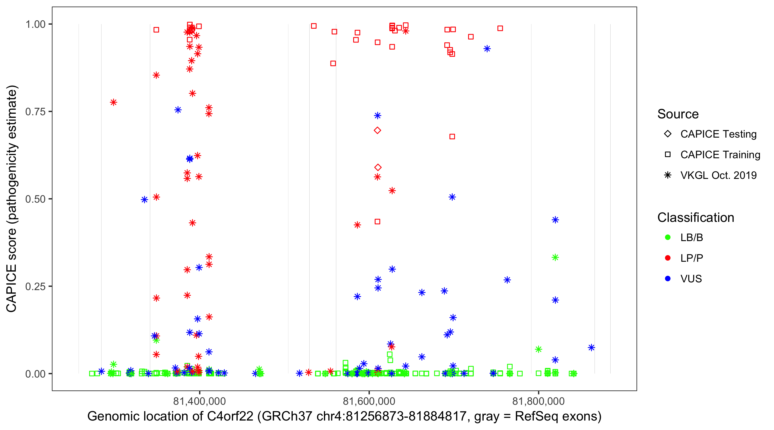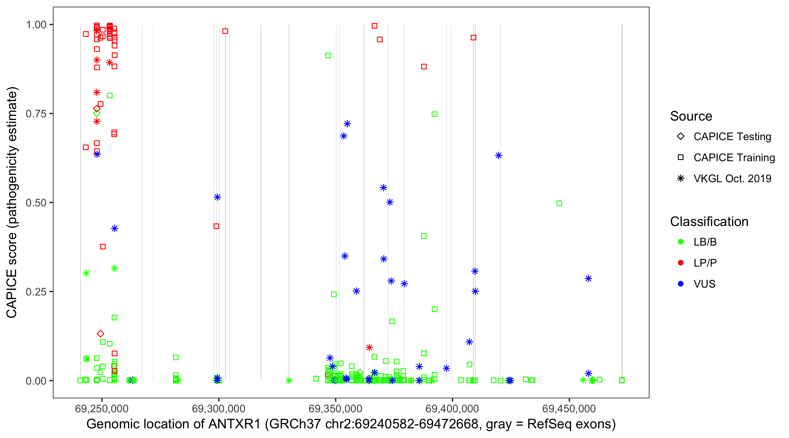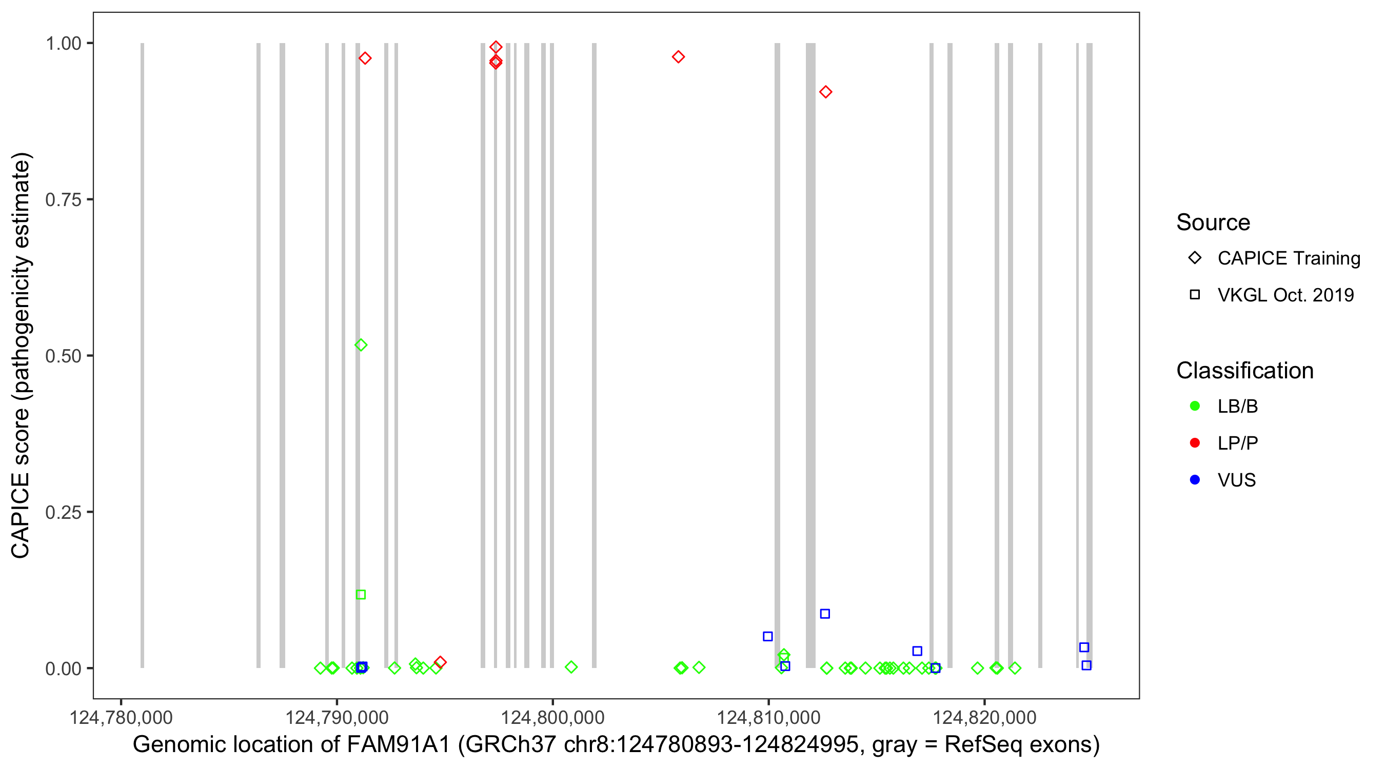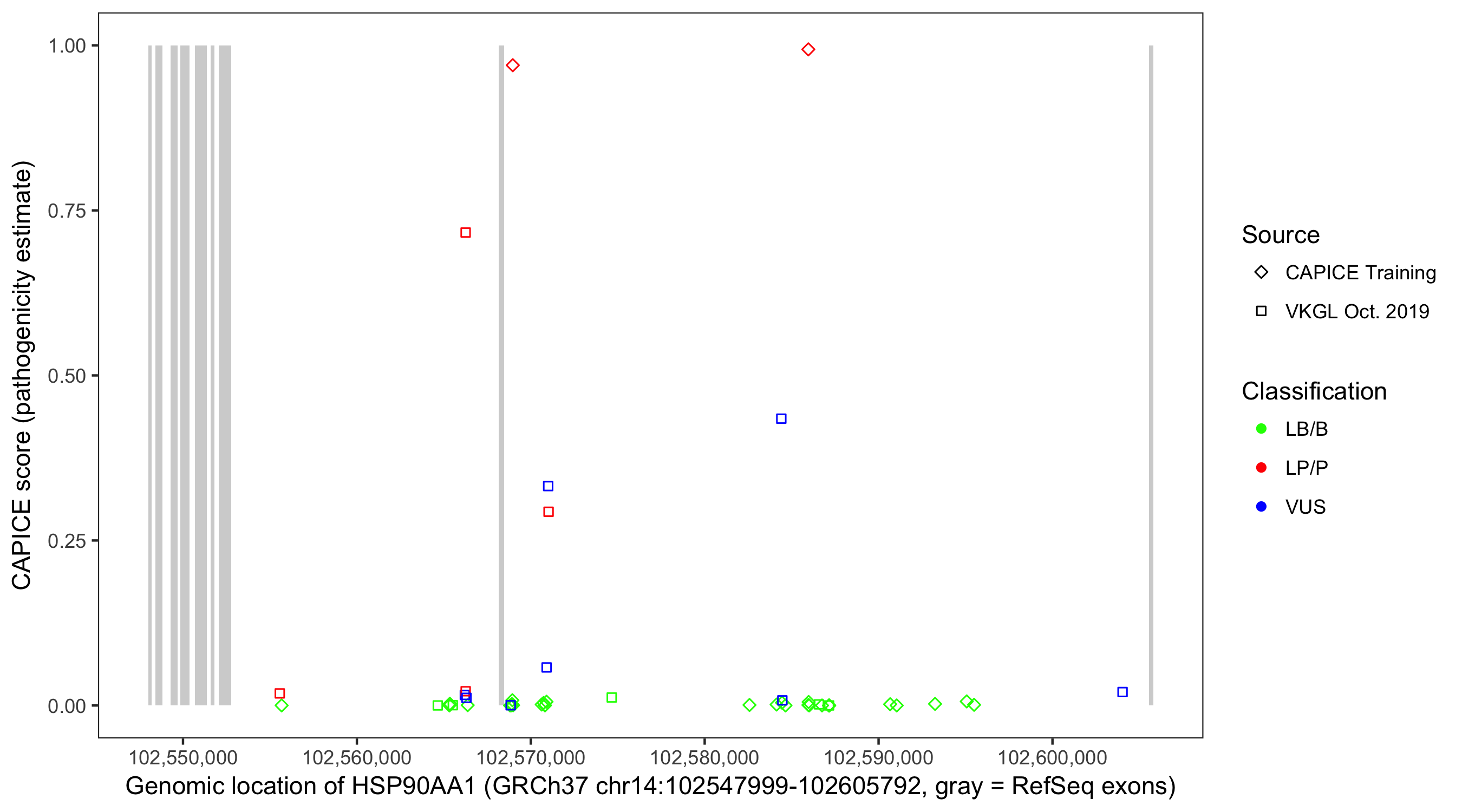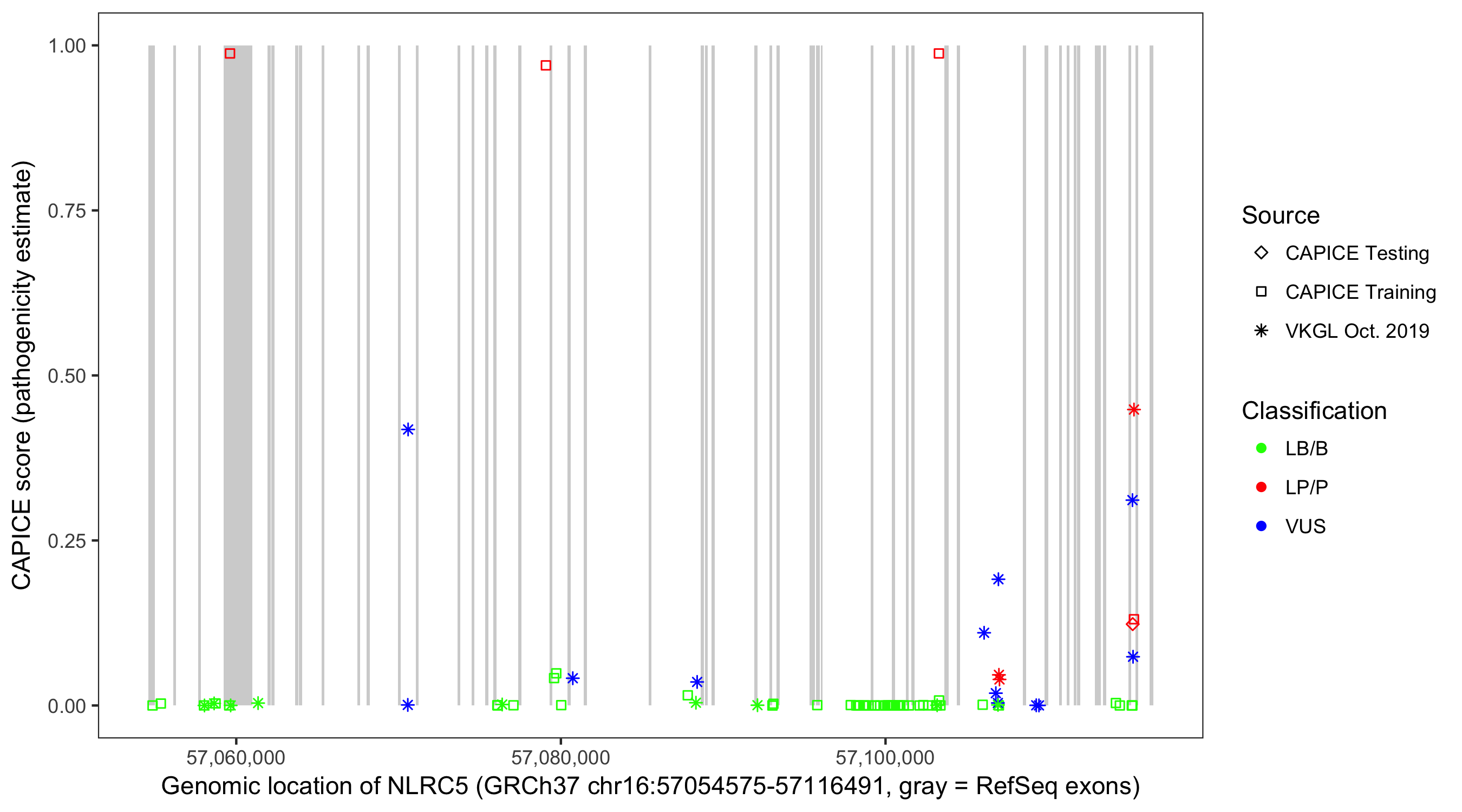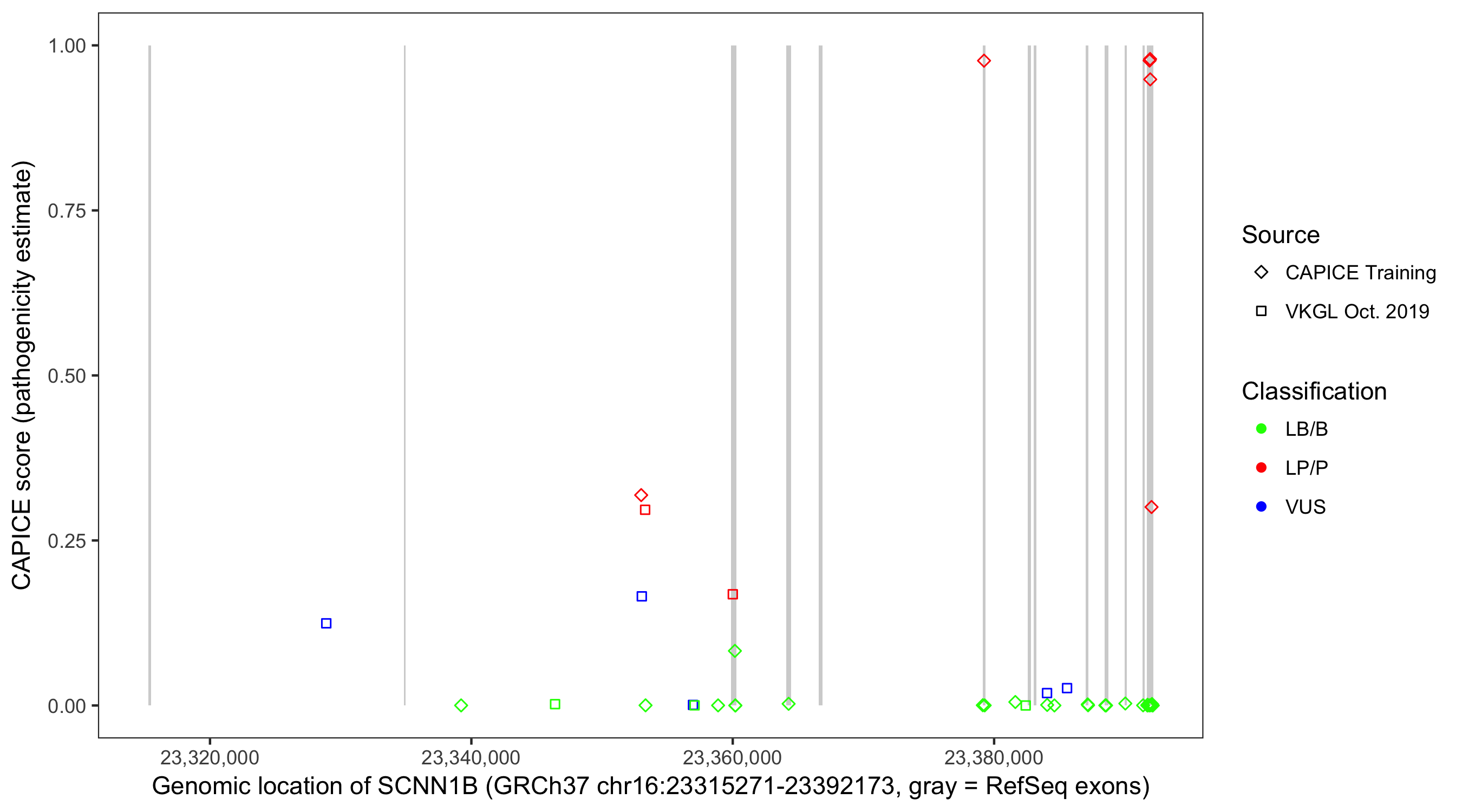 Shown are CAPICE train/test variants plus VKGL Oct 2019.