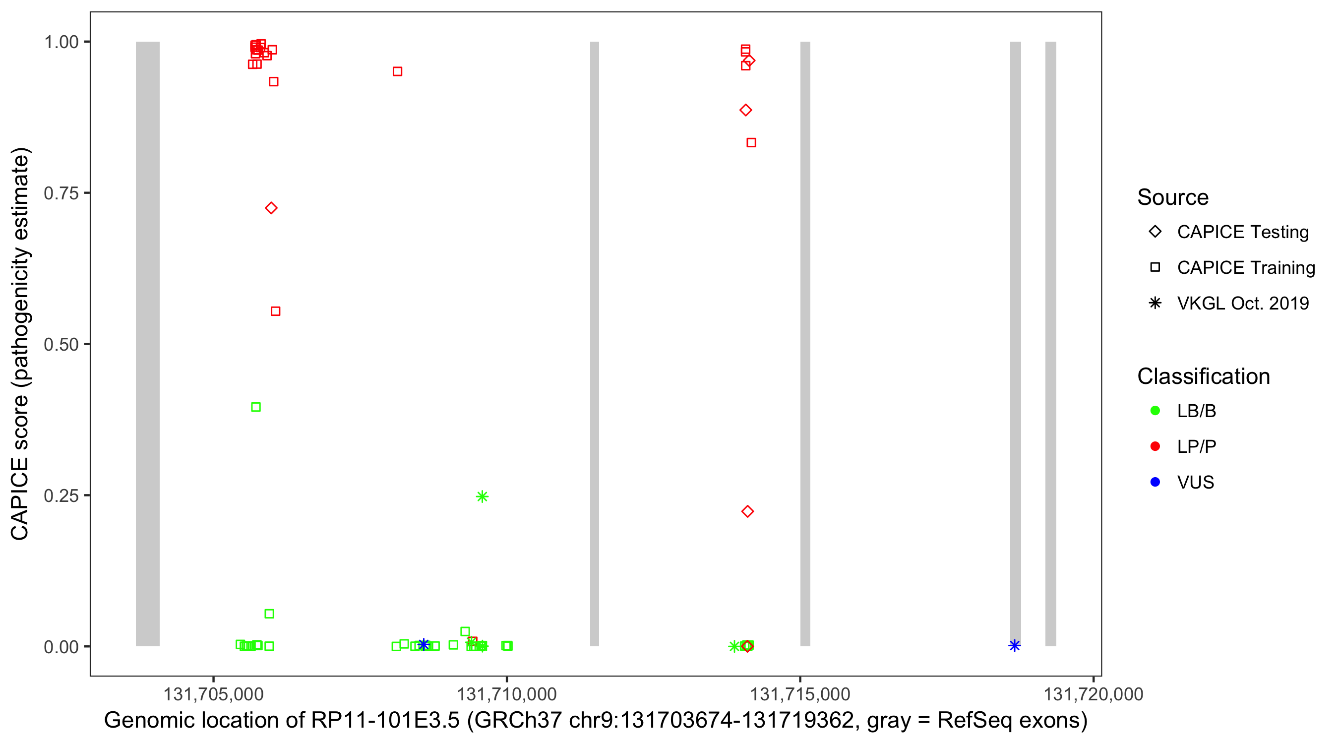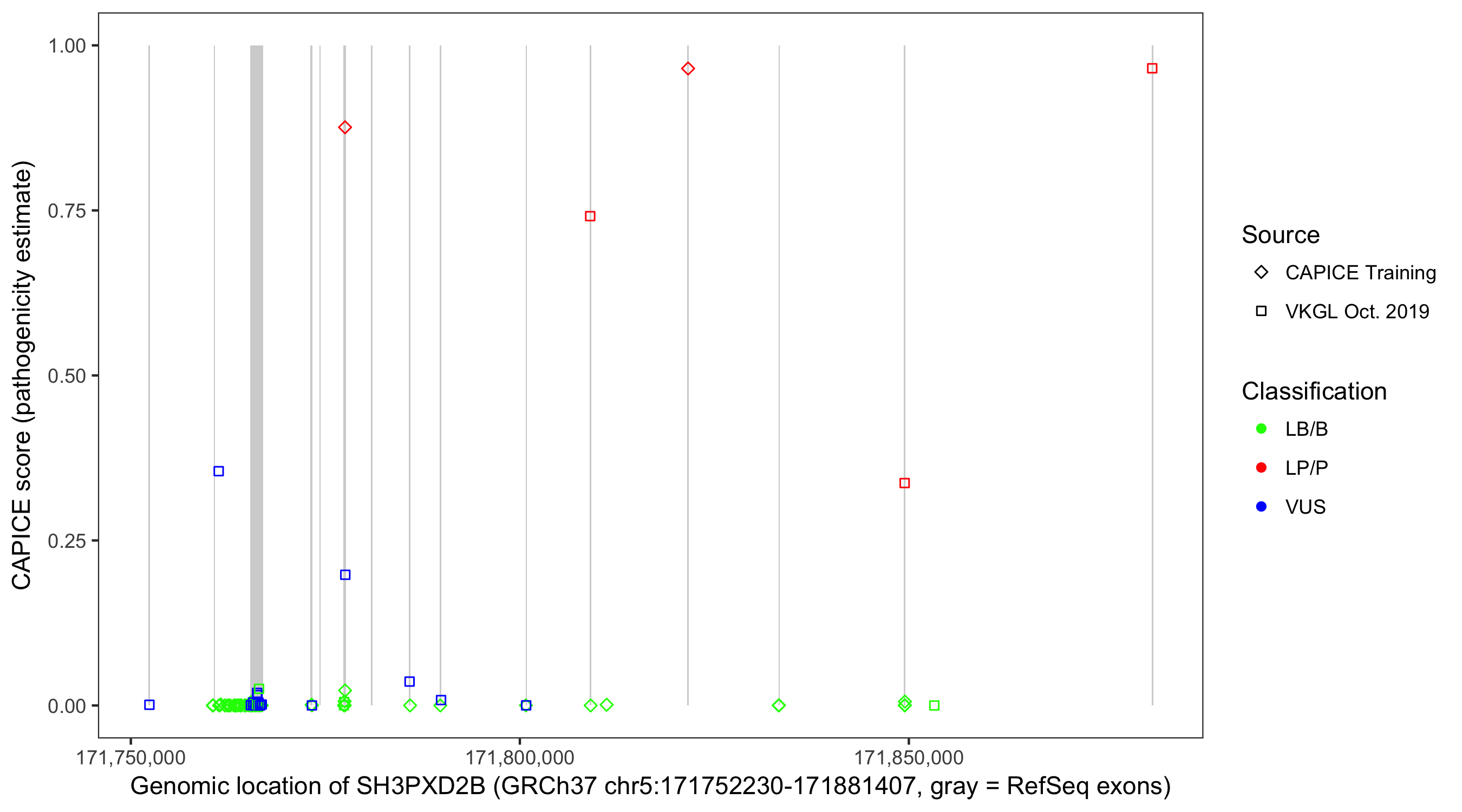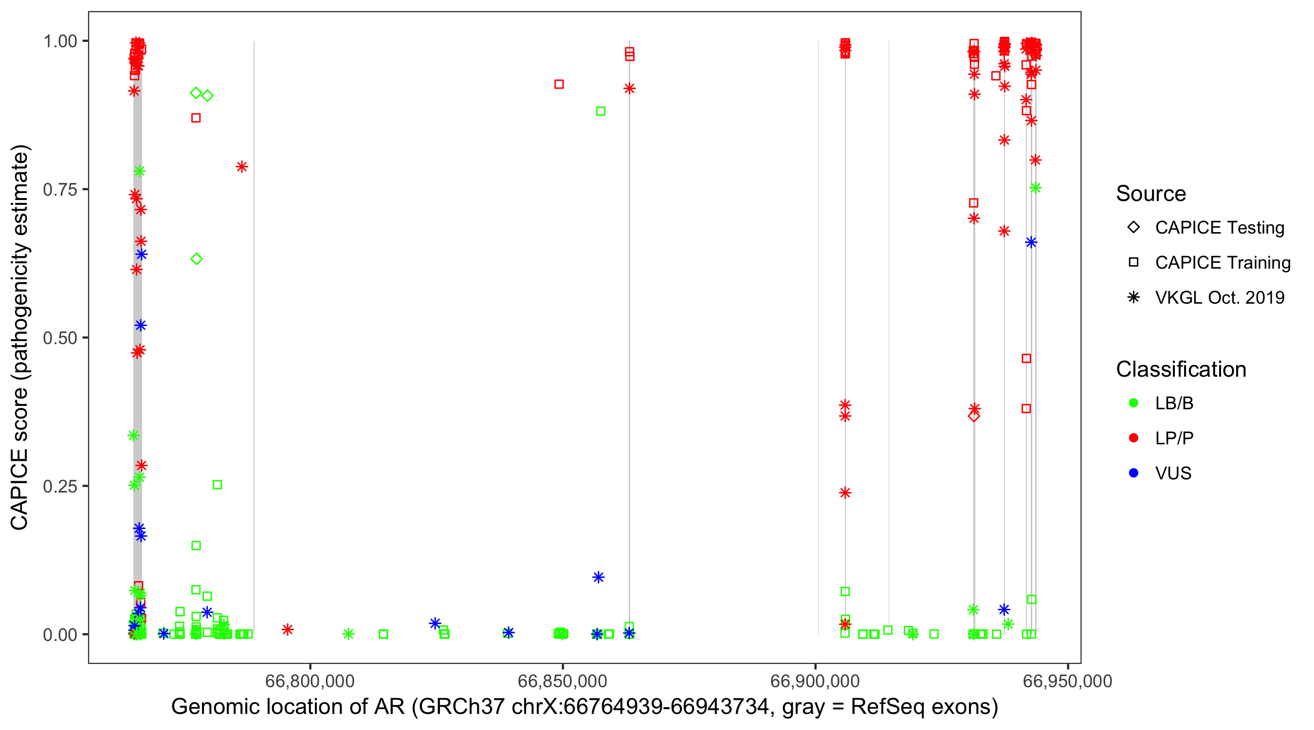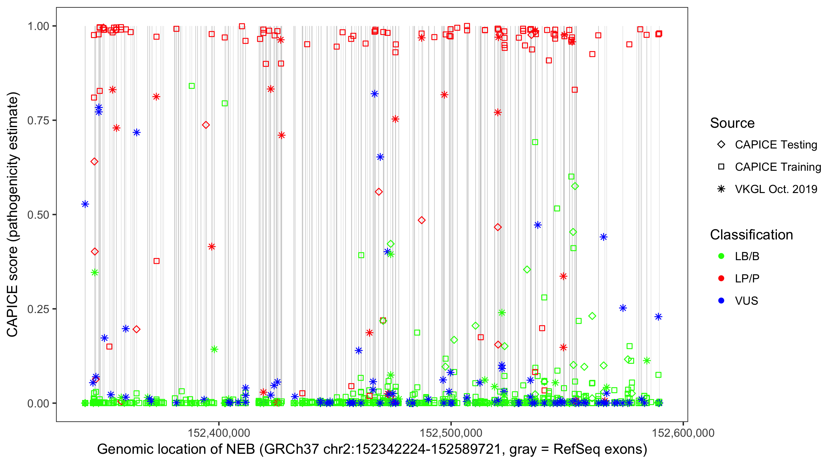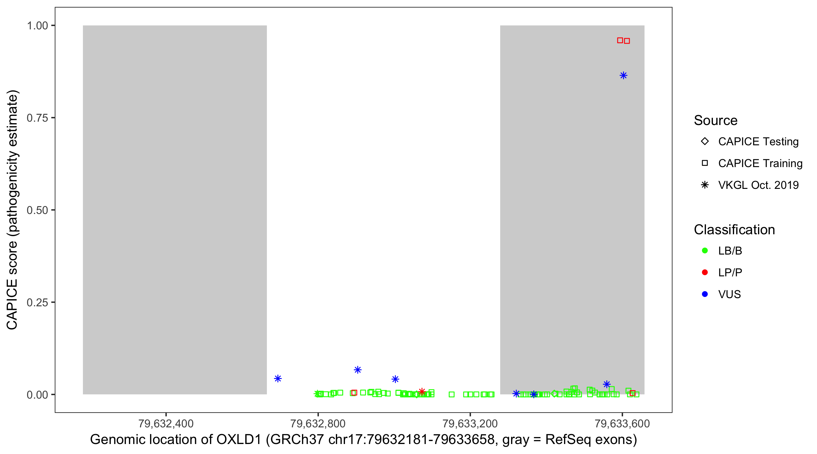 Shown are CAPICE train/test variants plus VKGL Oct 2019.