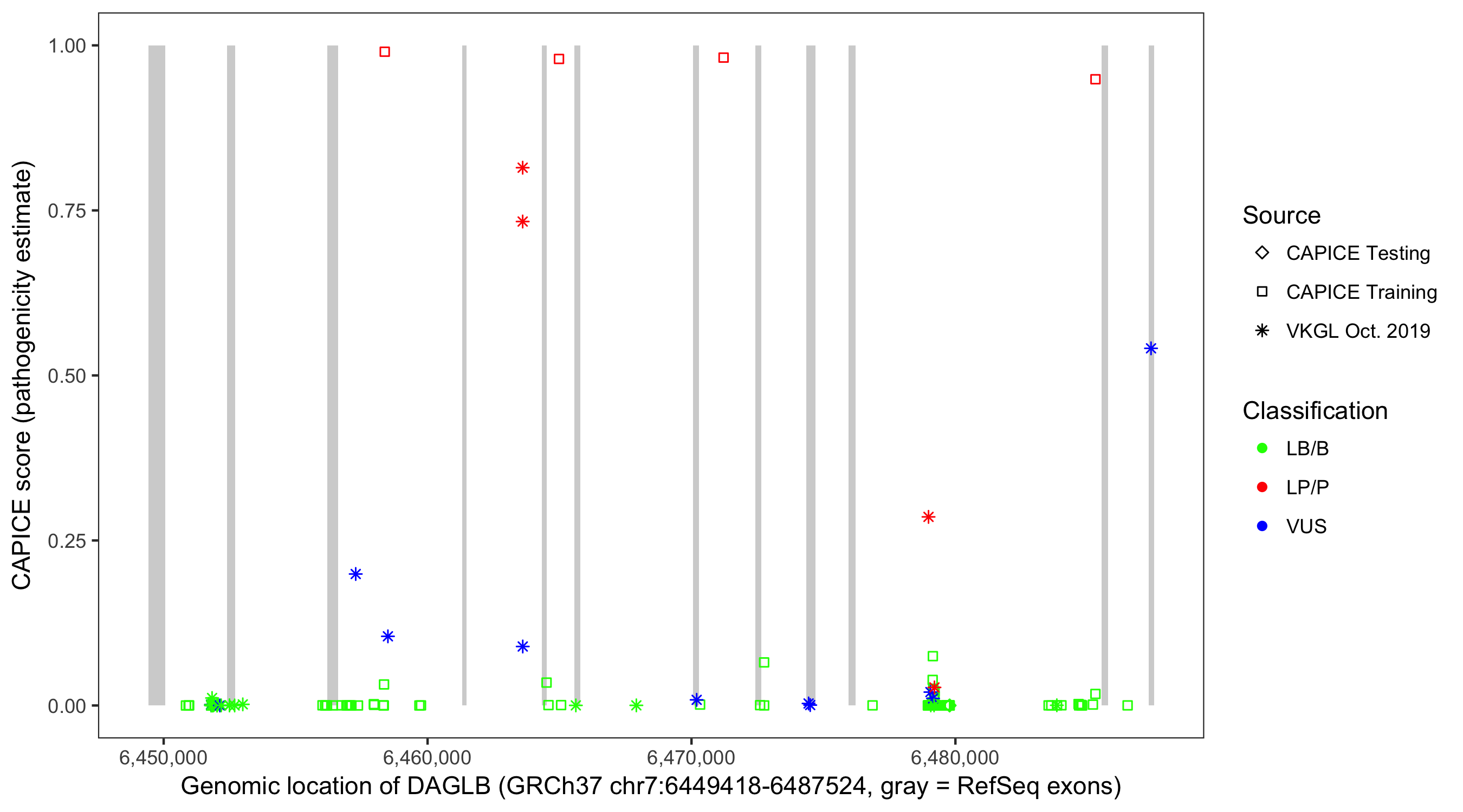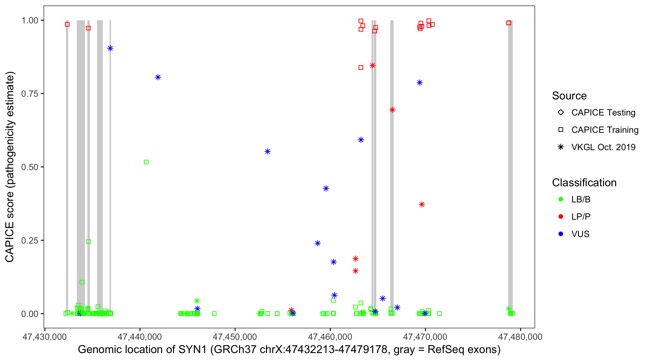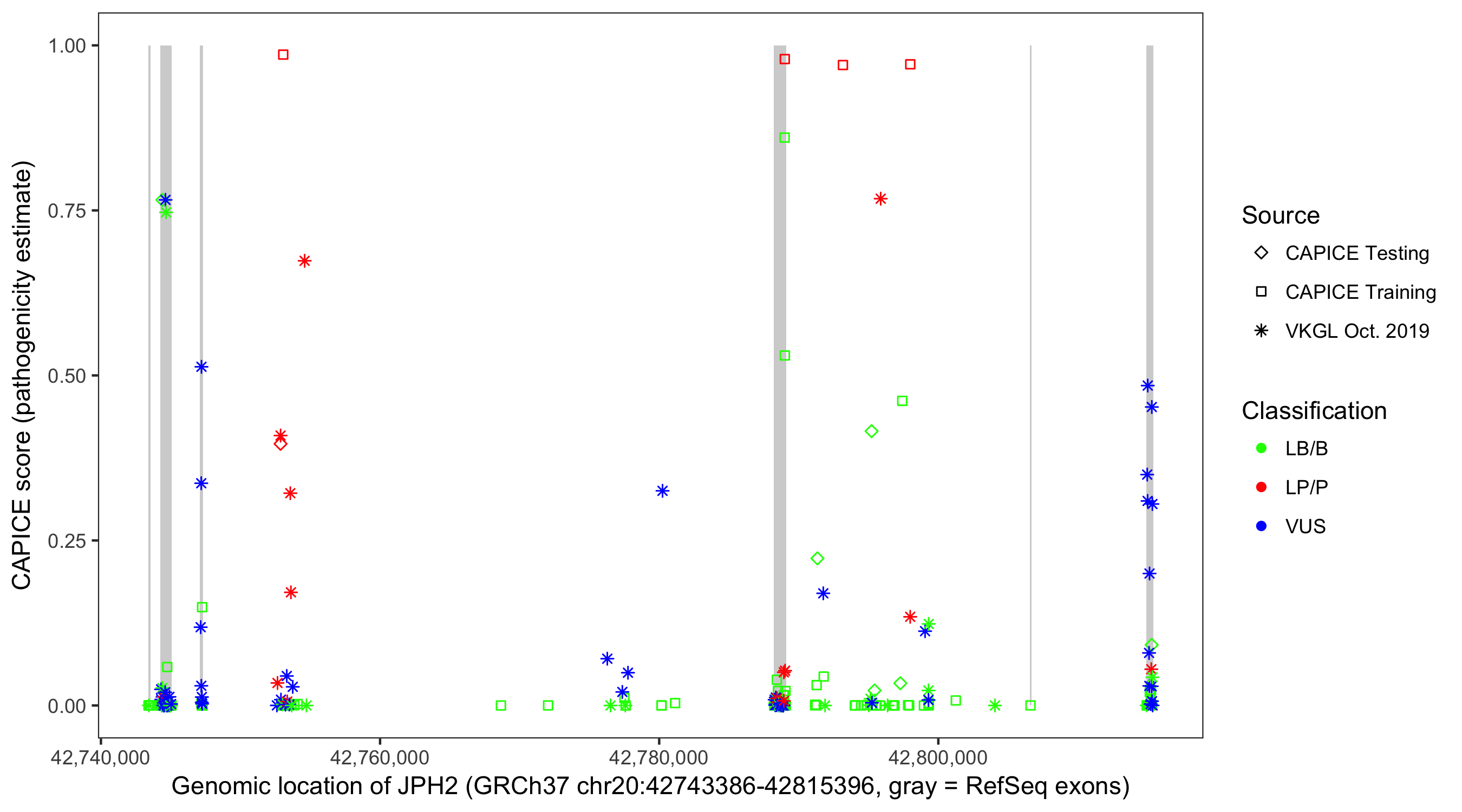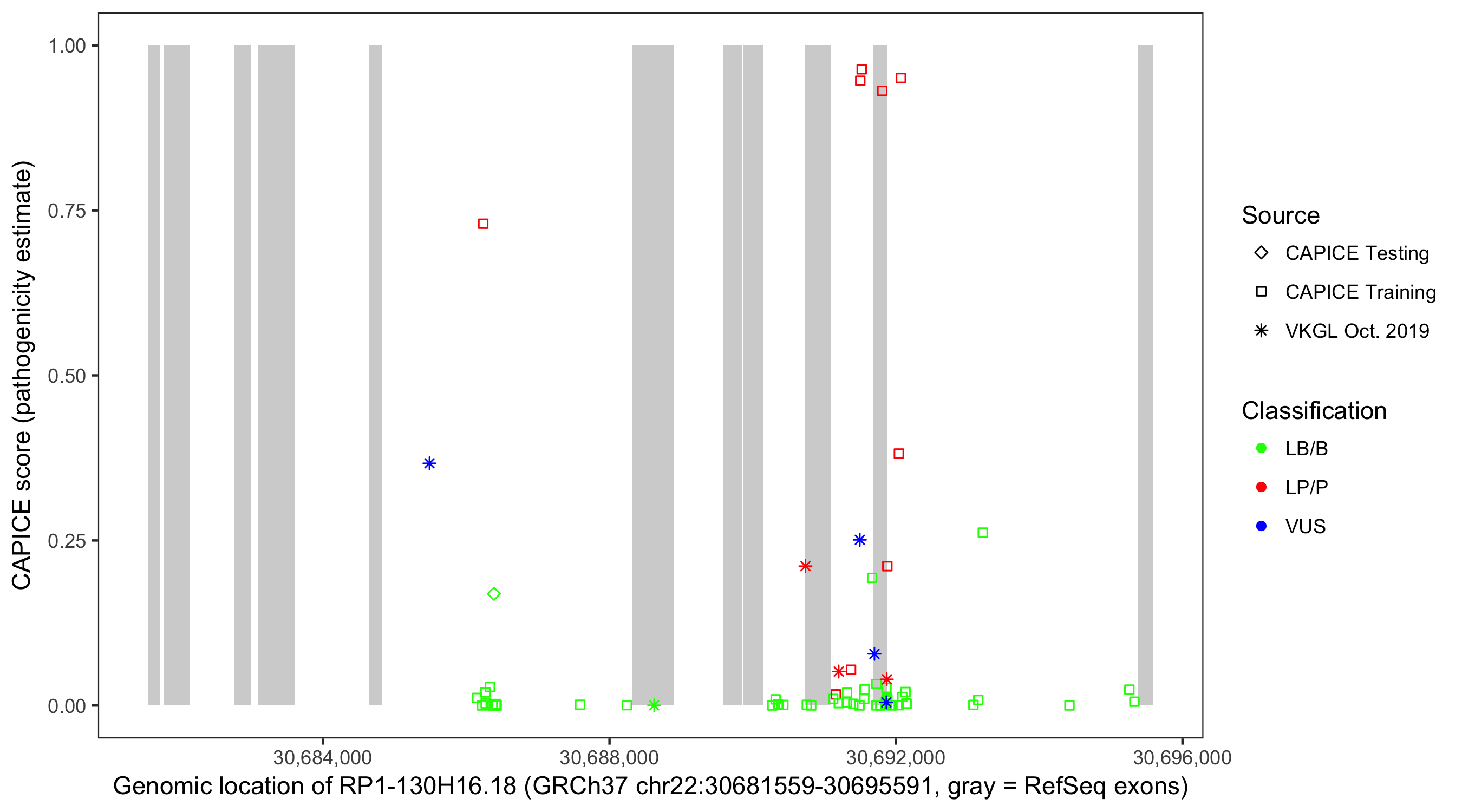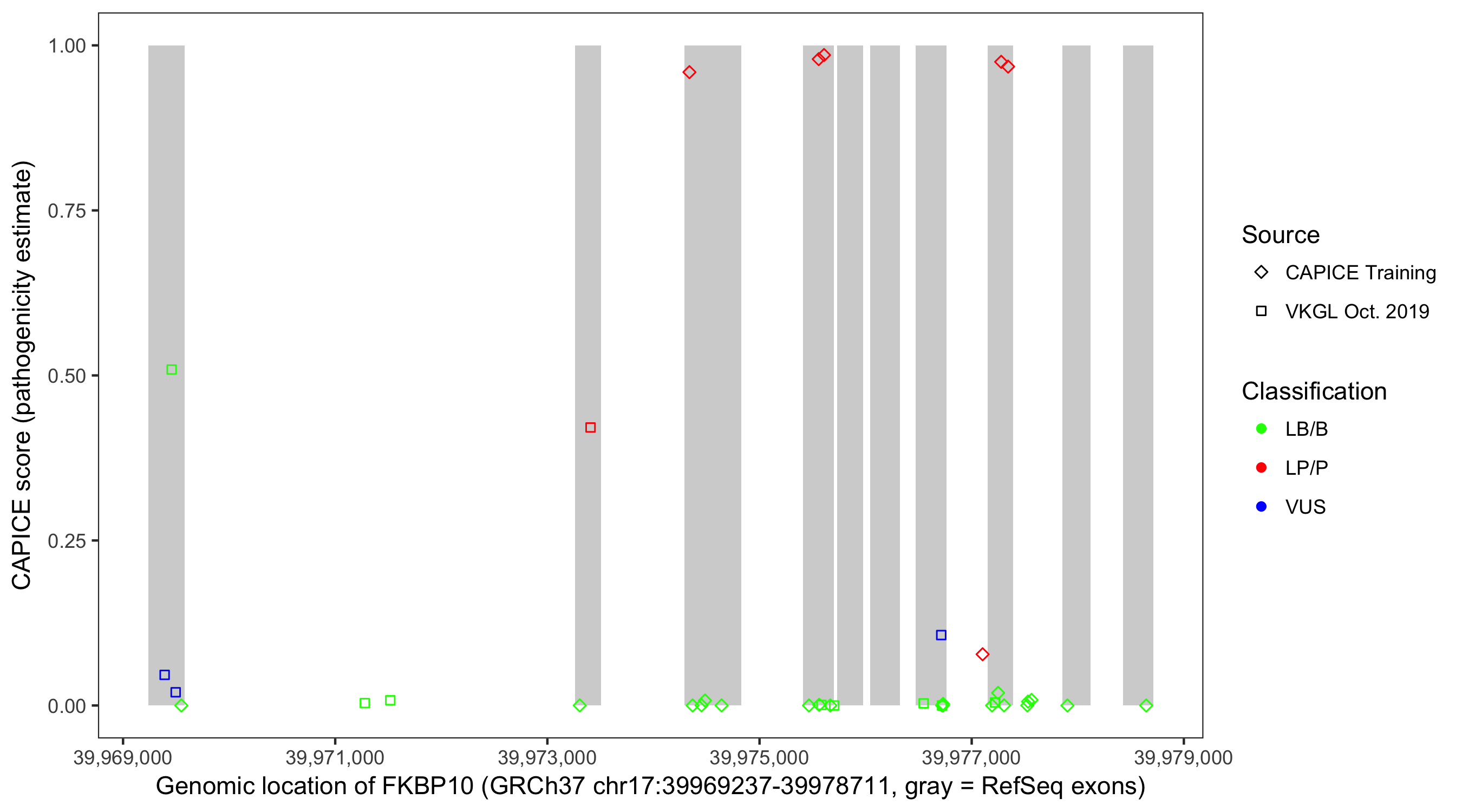 Shown are CAPICE train/test variants plus VKGL Oct 2019.