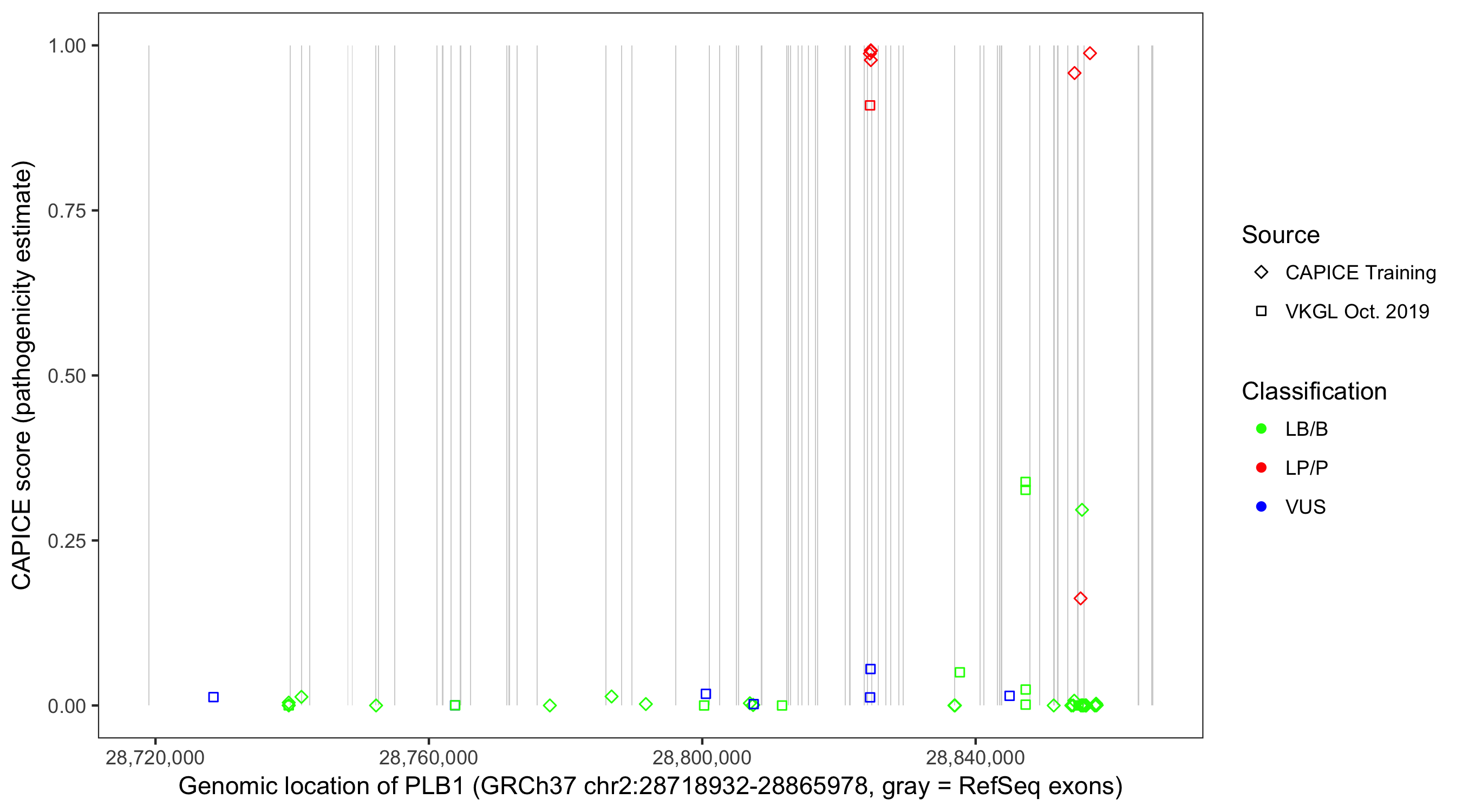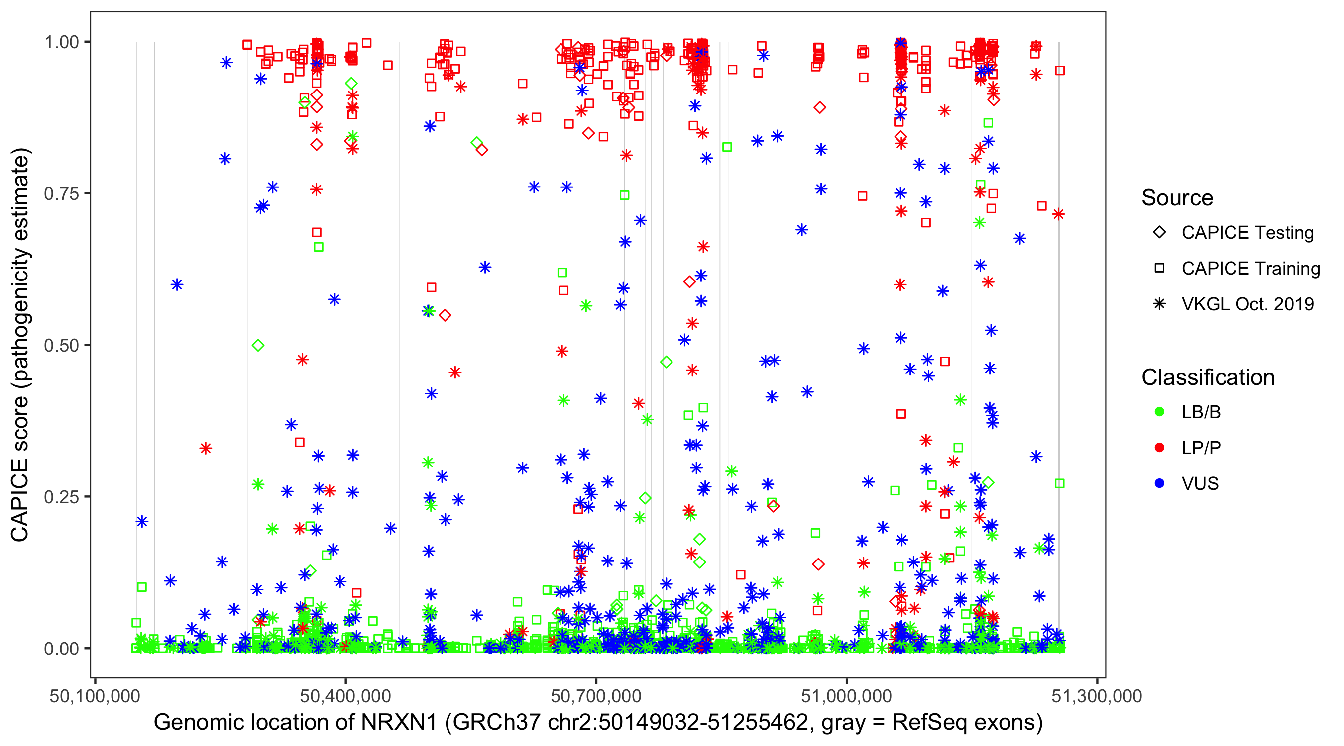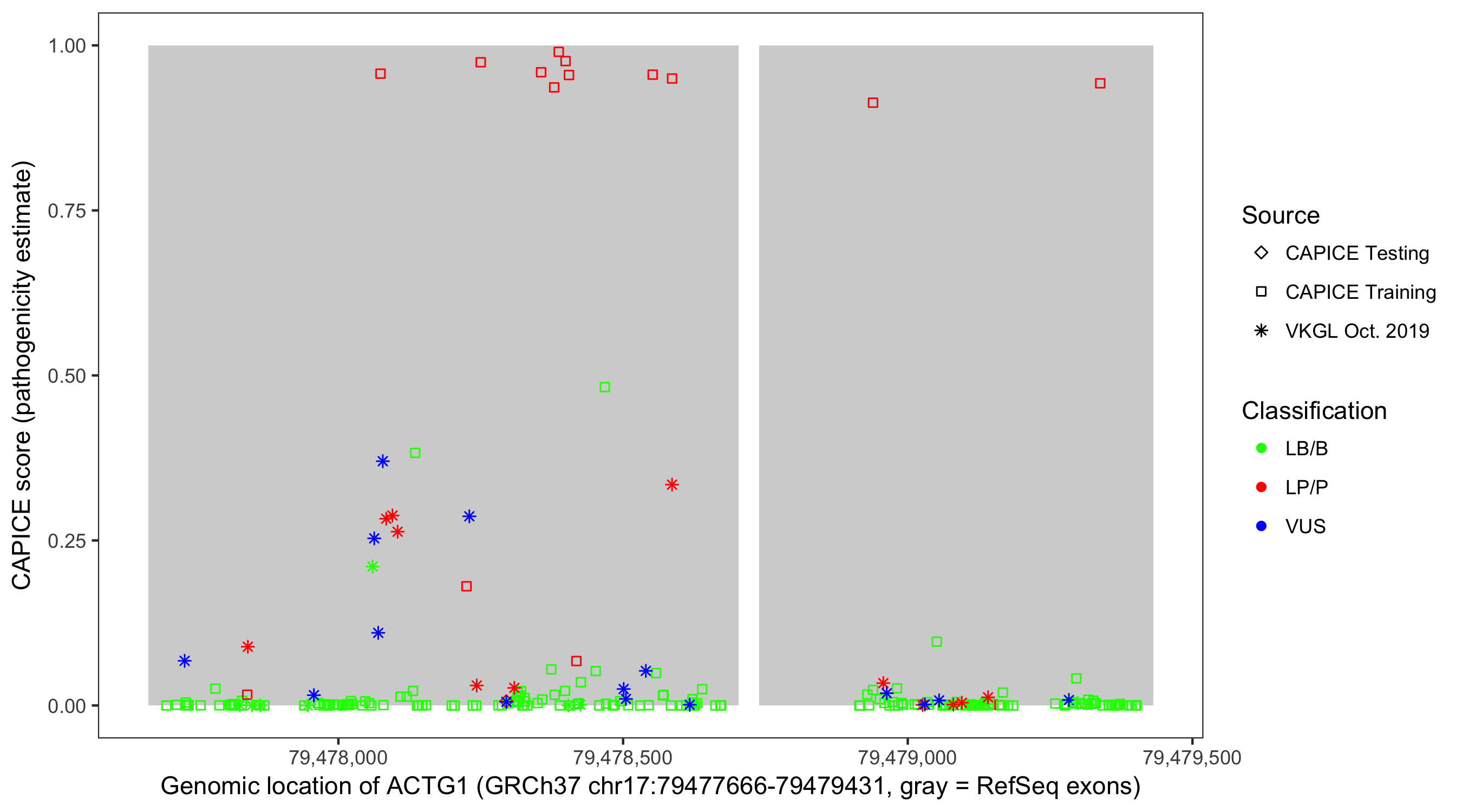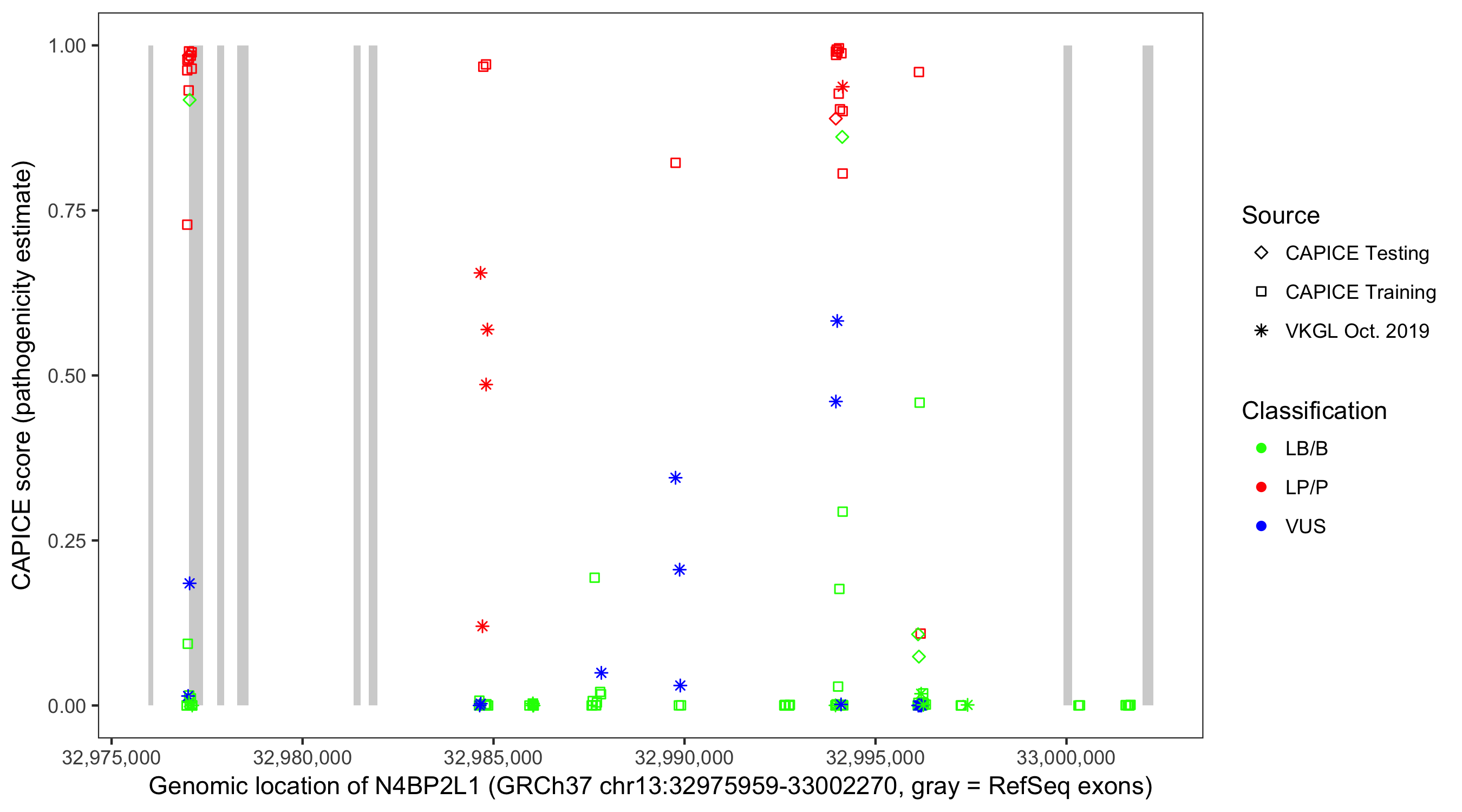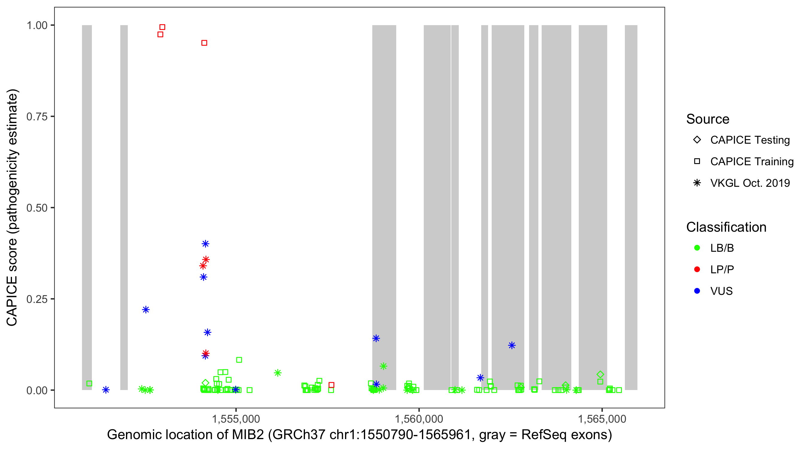 Shown are CAPICE train/test variants plus VKGL Oct 2019.