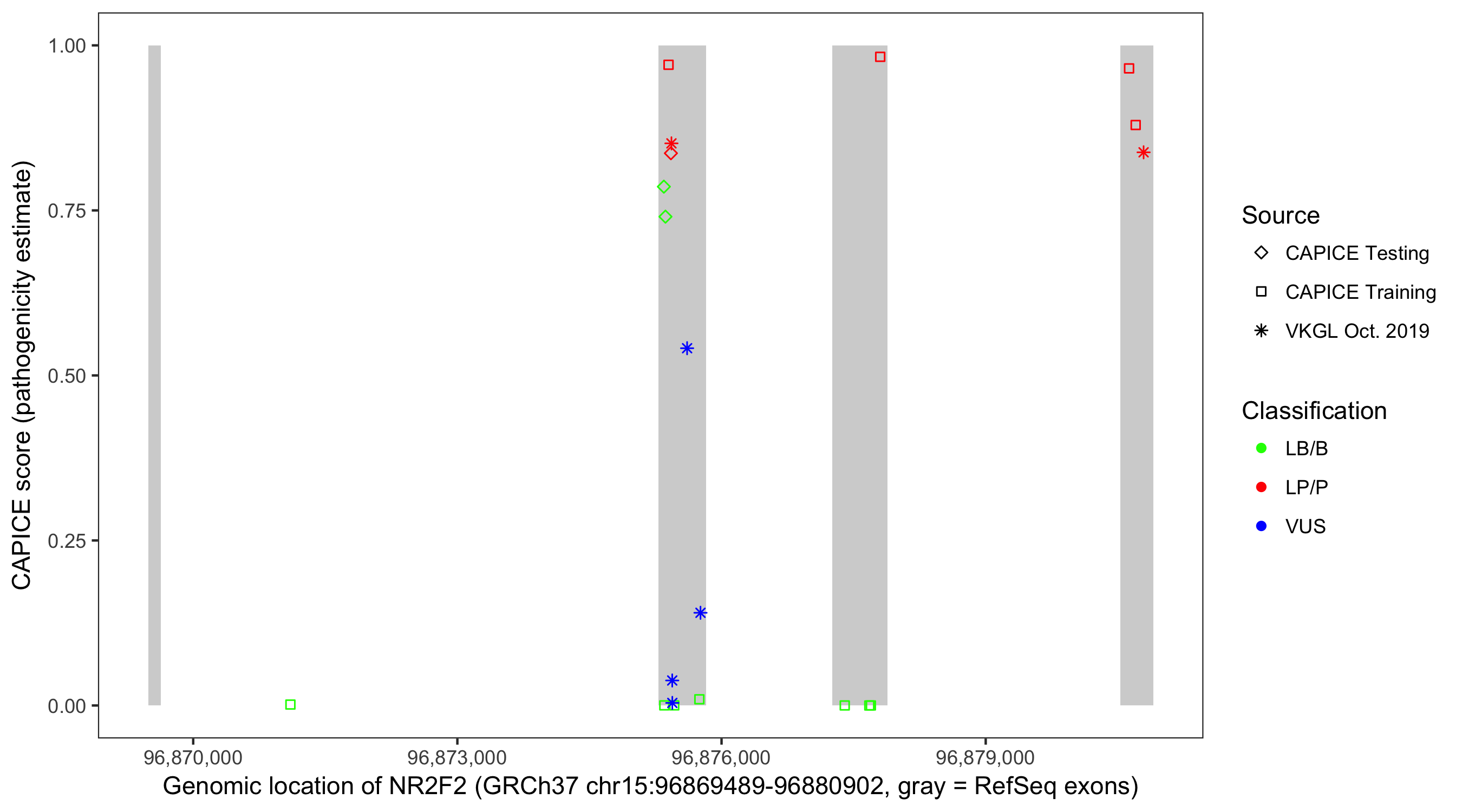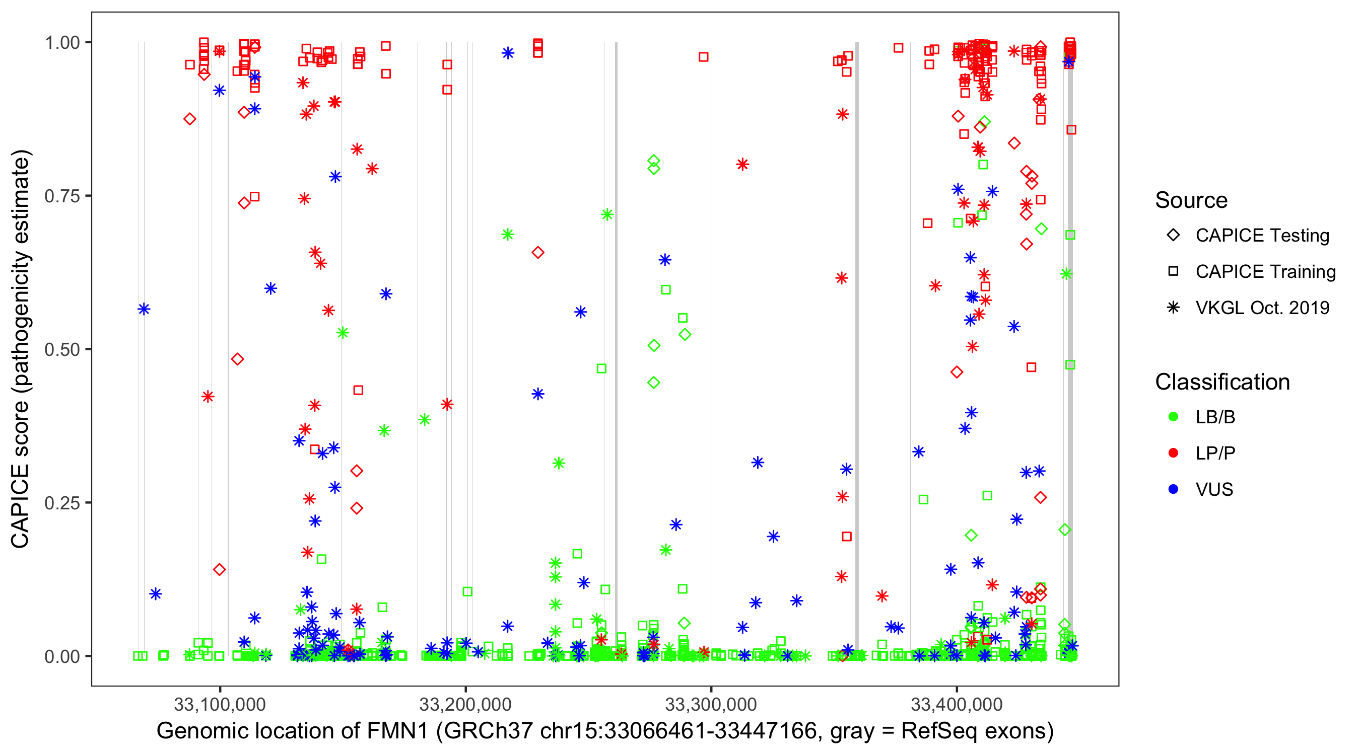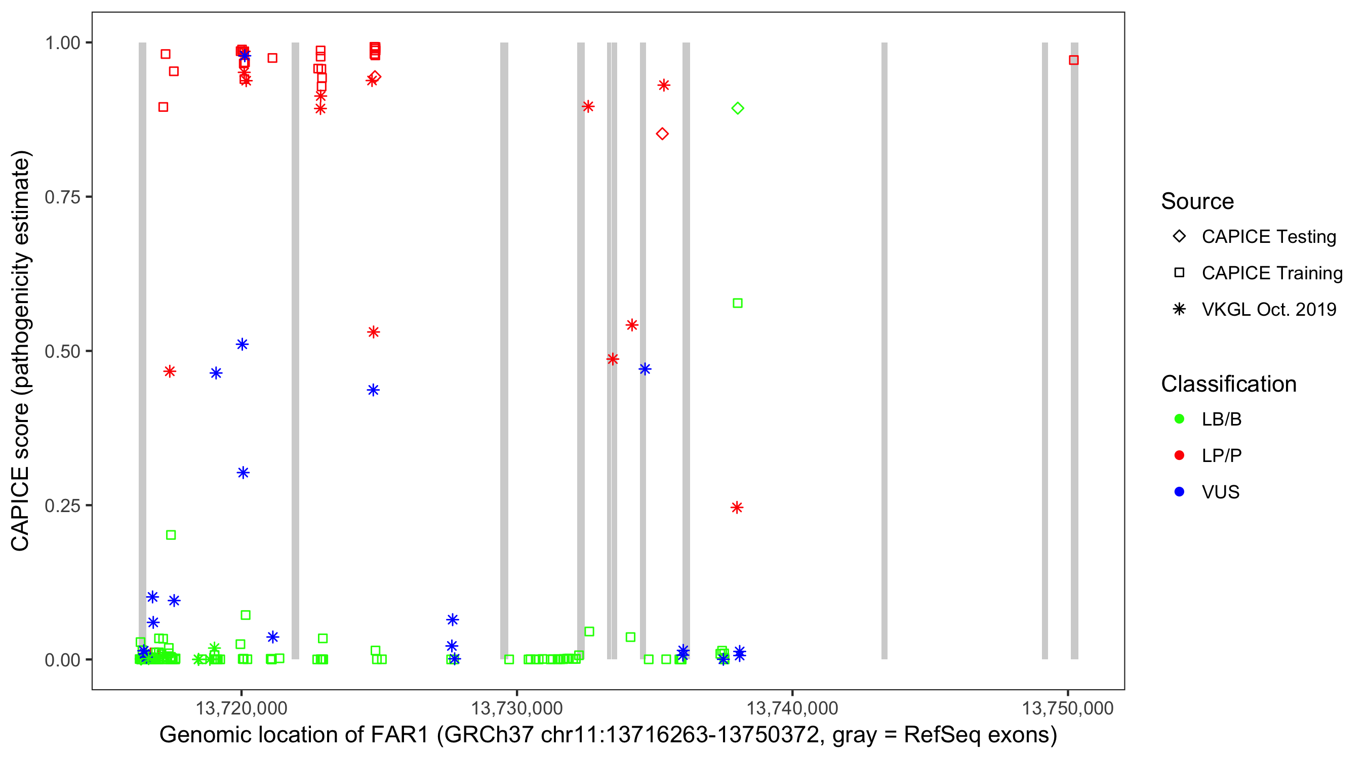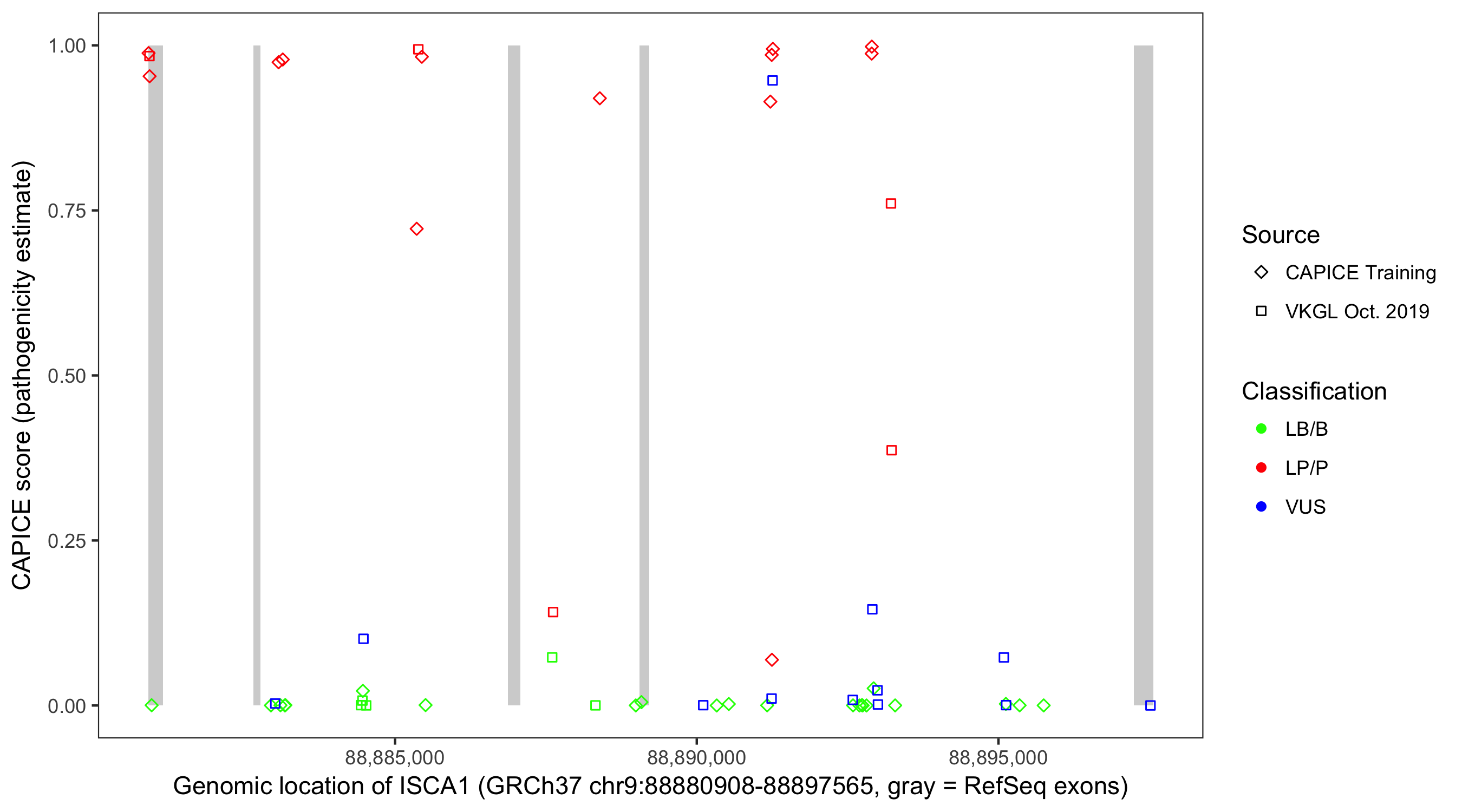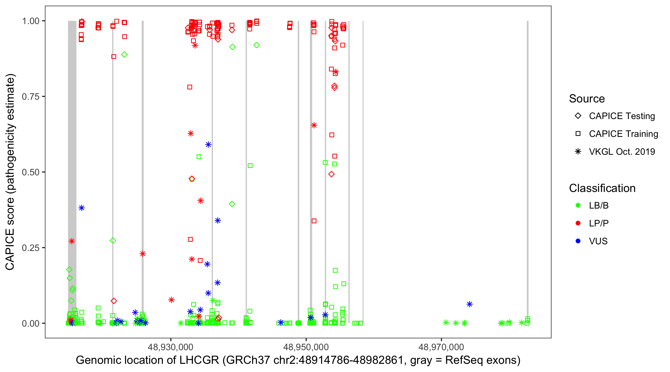 Shown are CAPICE train/test variants plus VKGL Oct 2019.