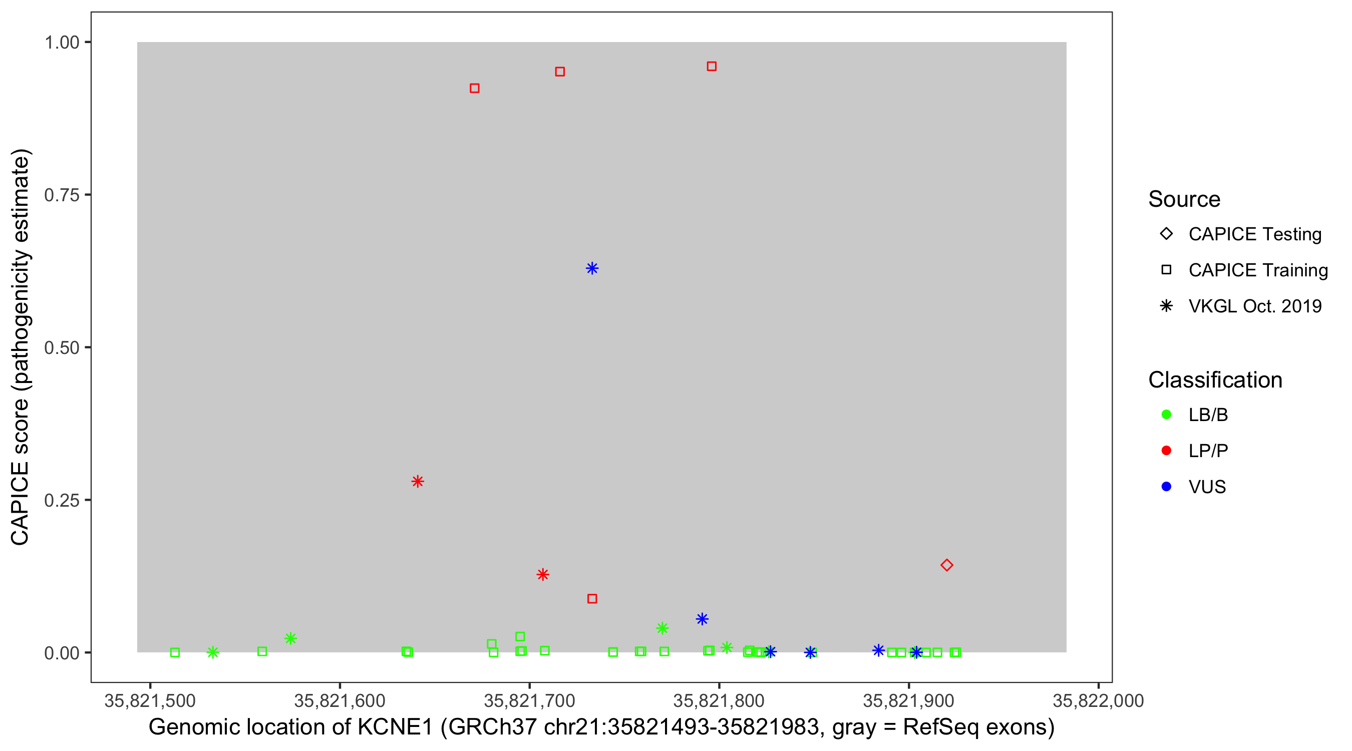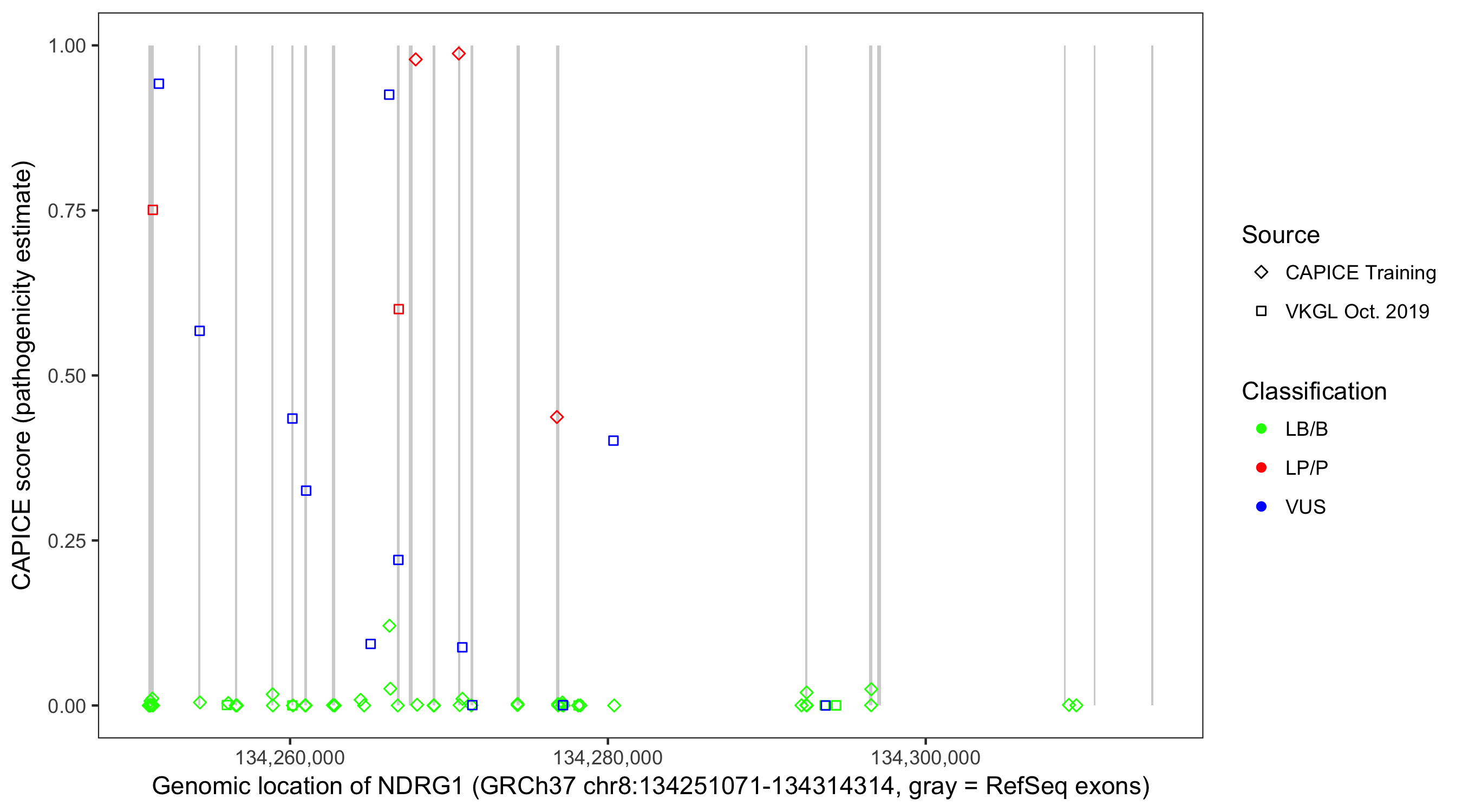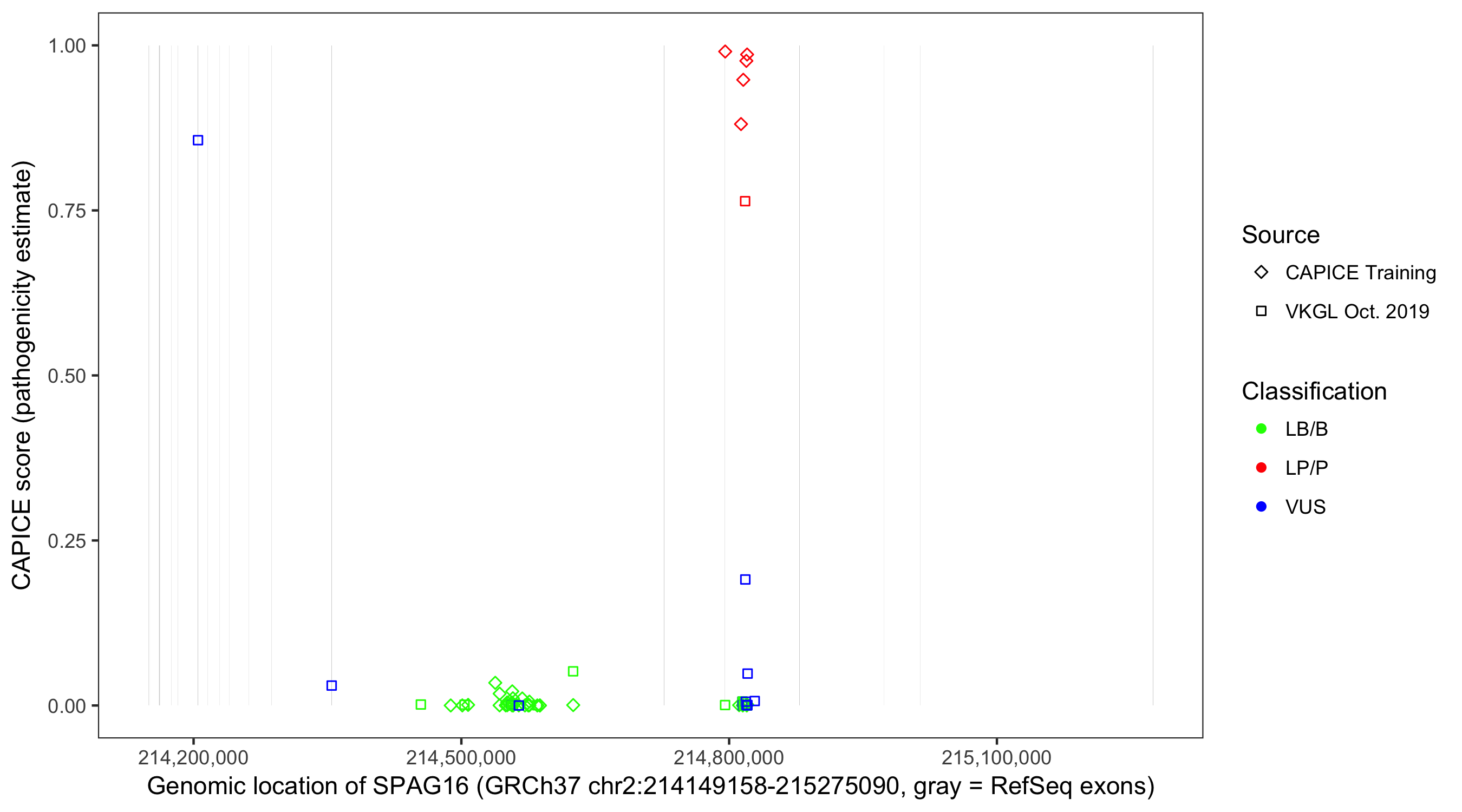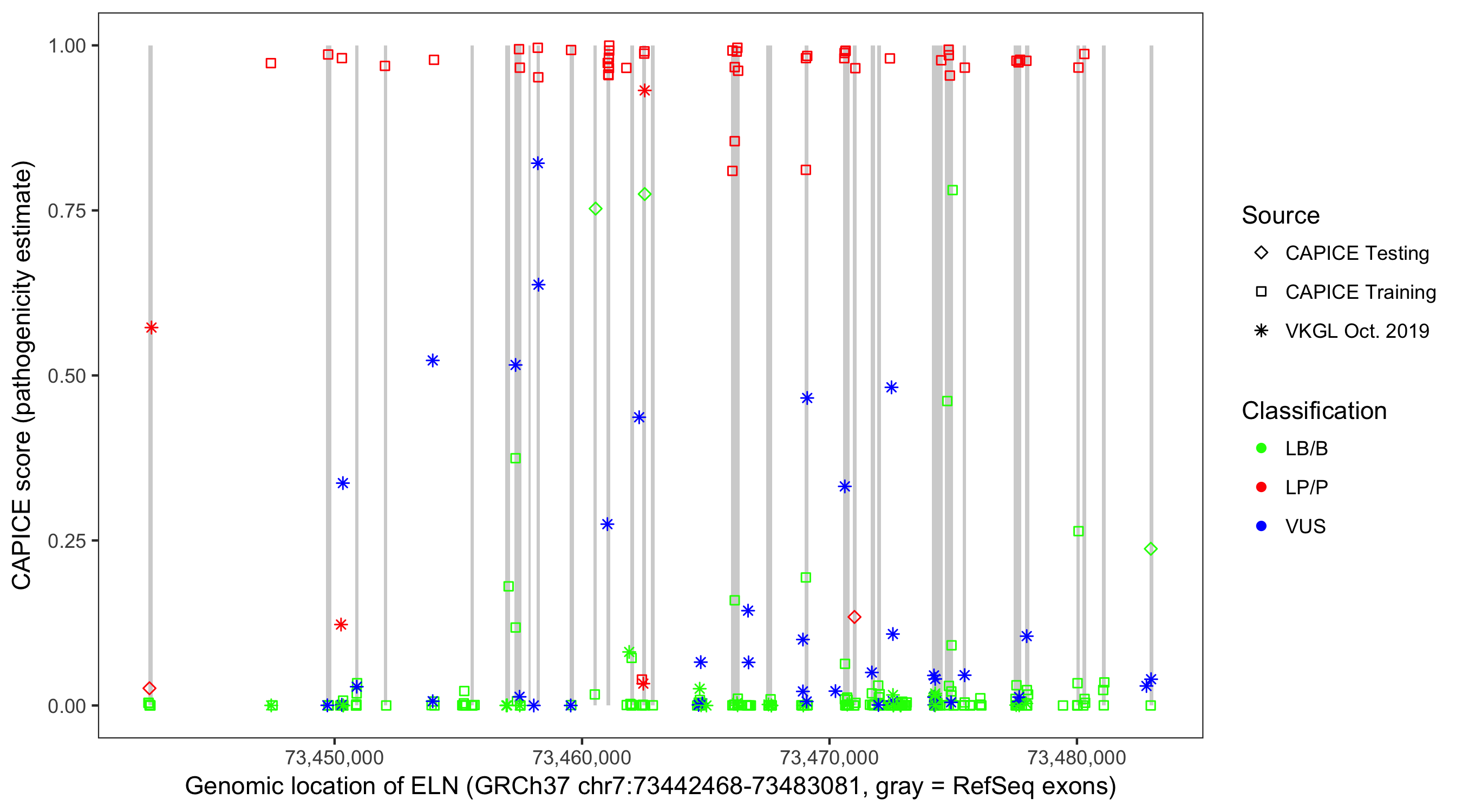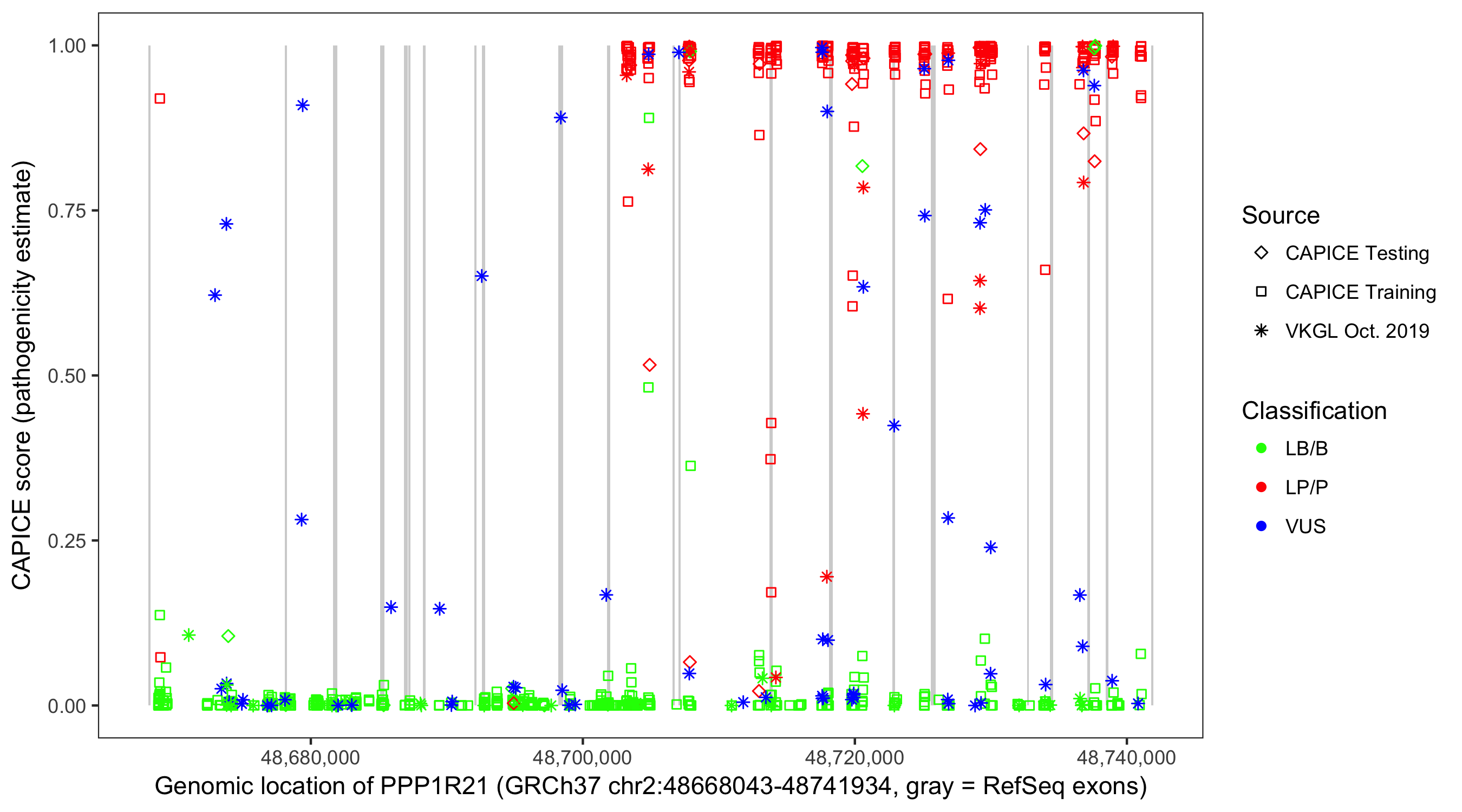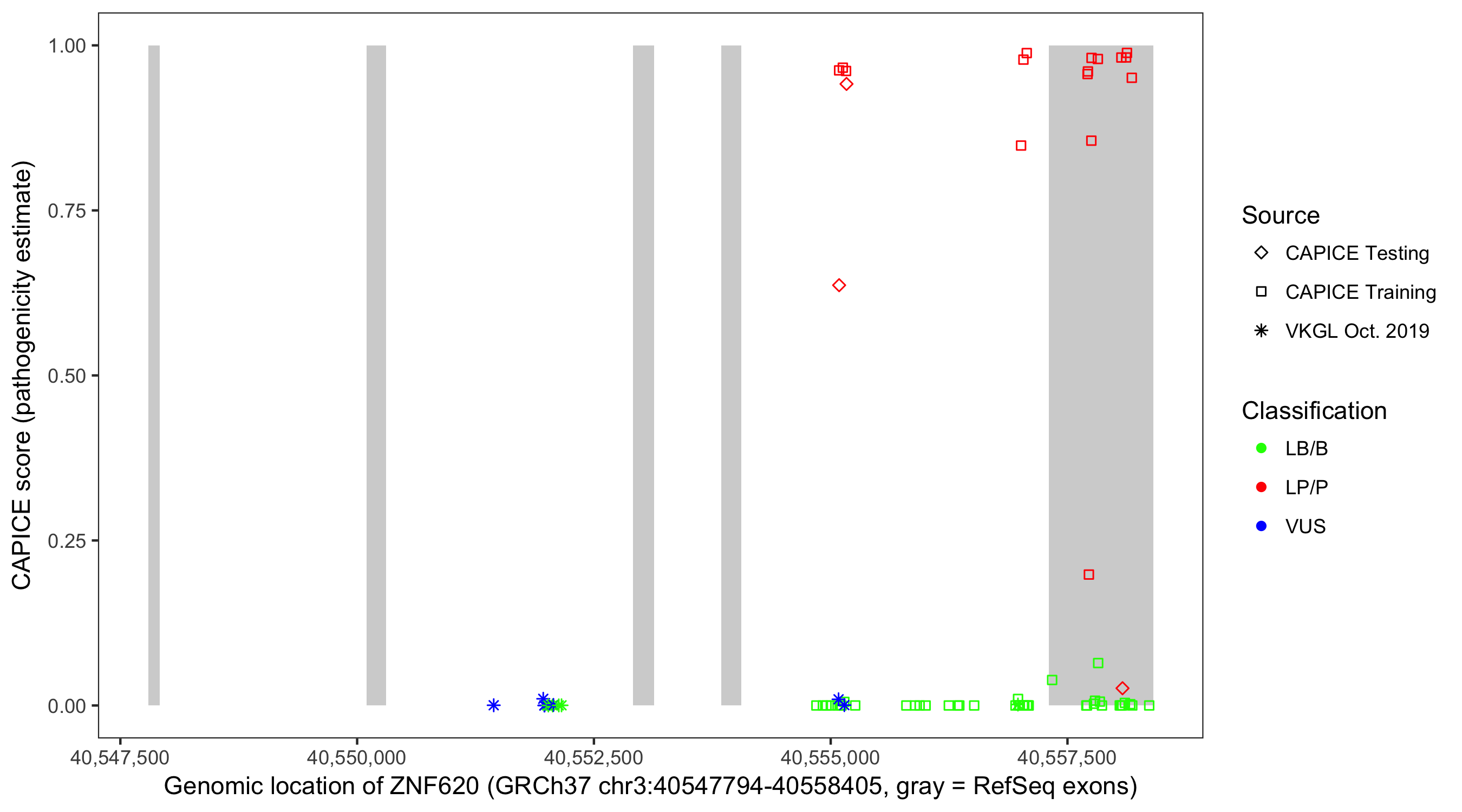 Shown are CAPICE train/test variants plus VKGL Oct 2019.