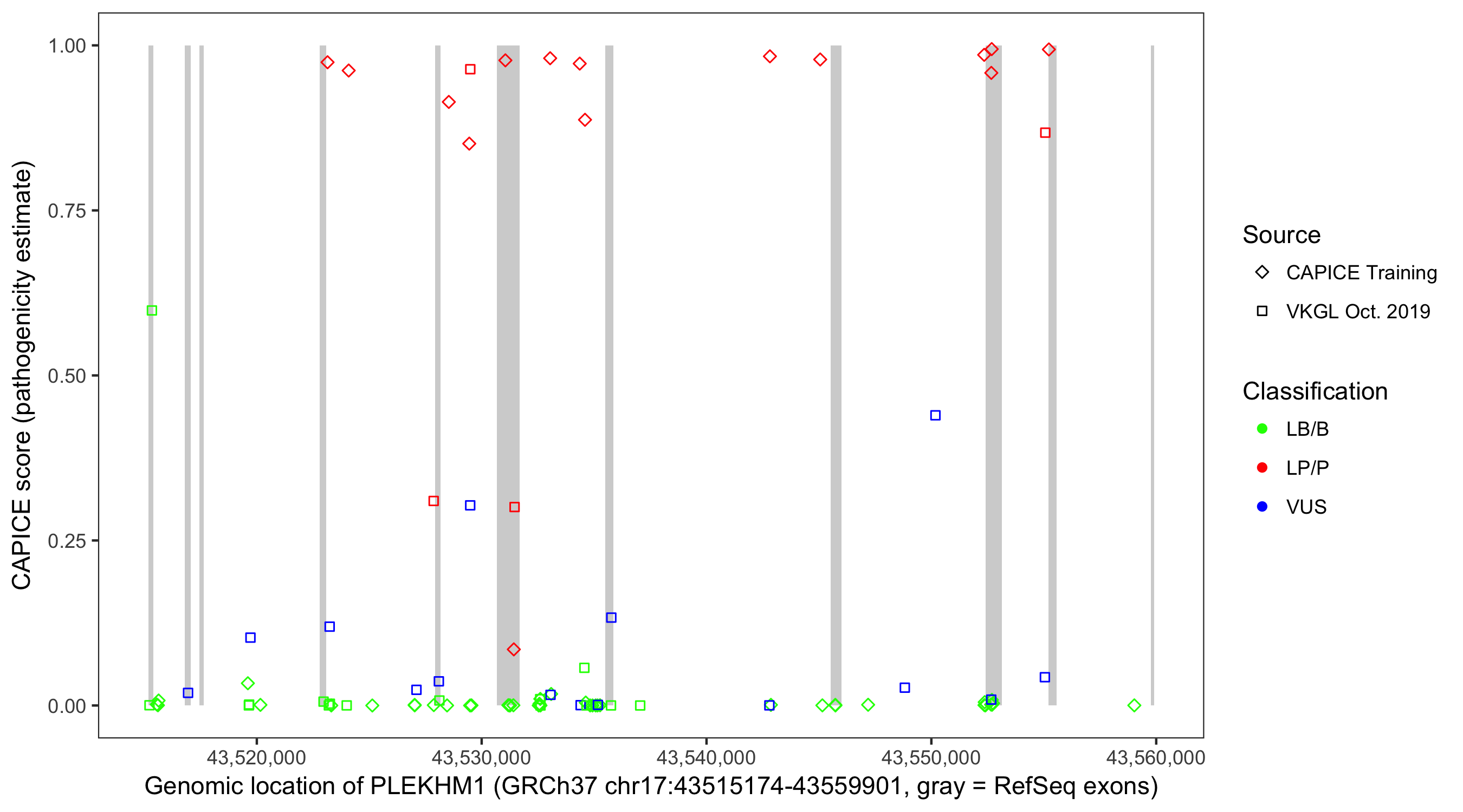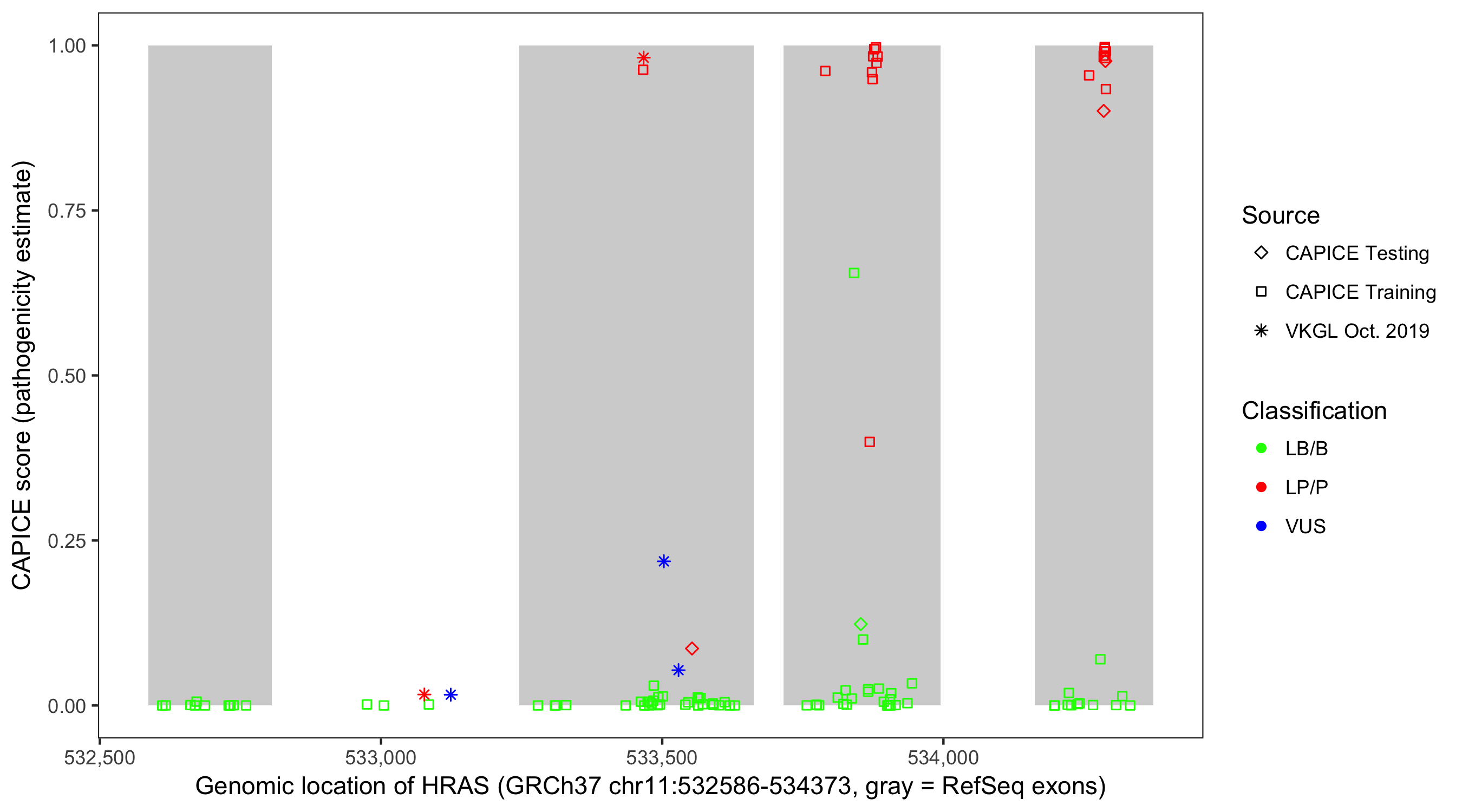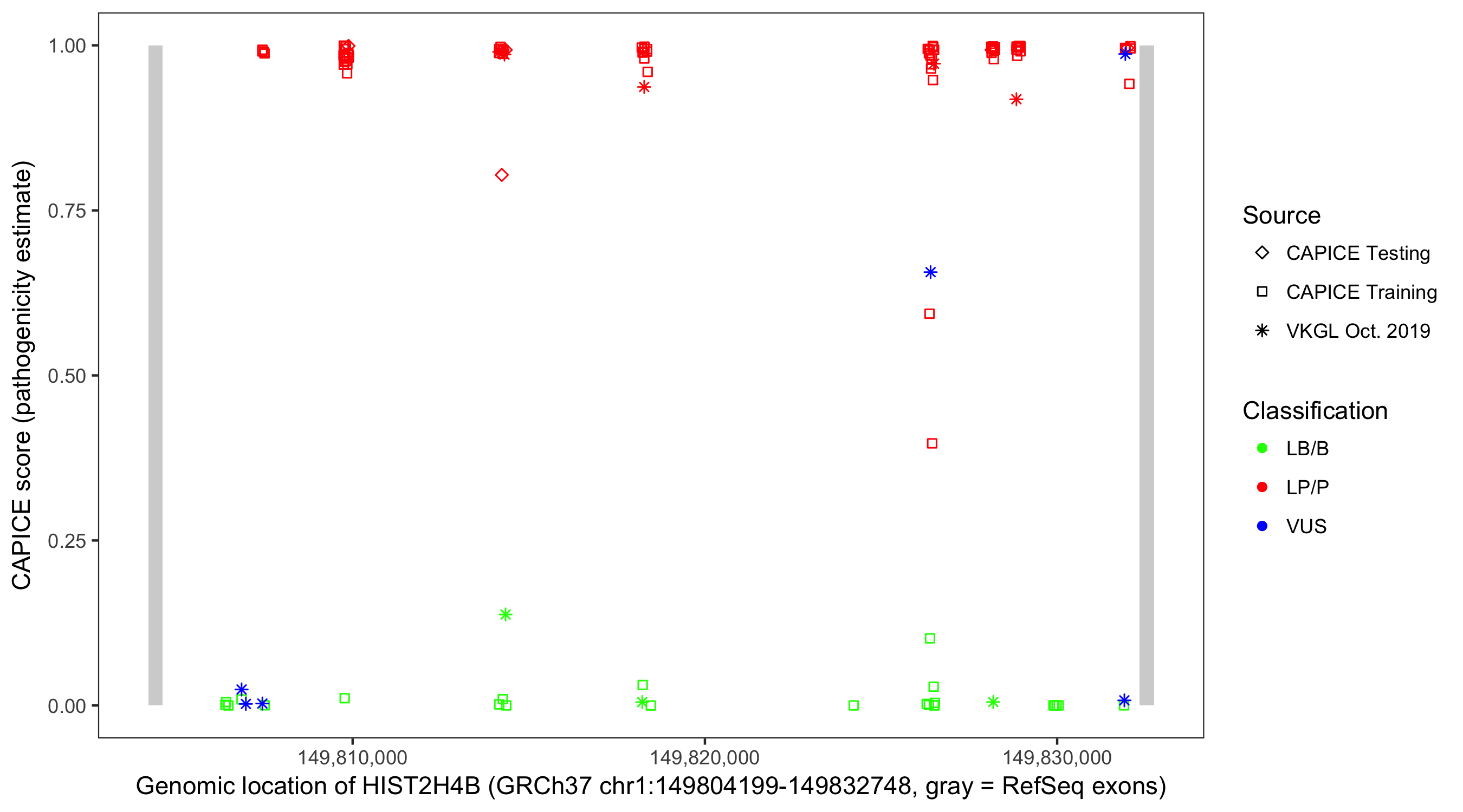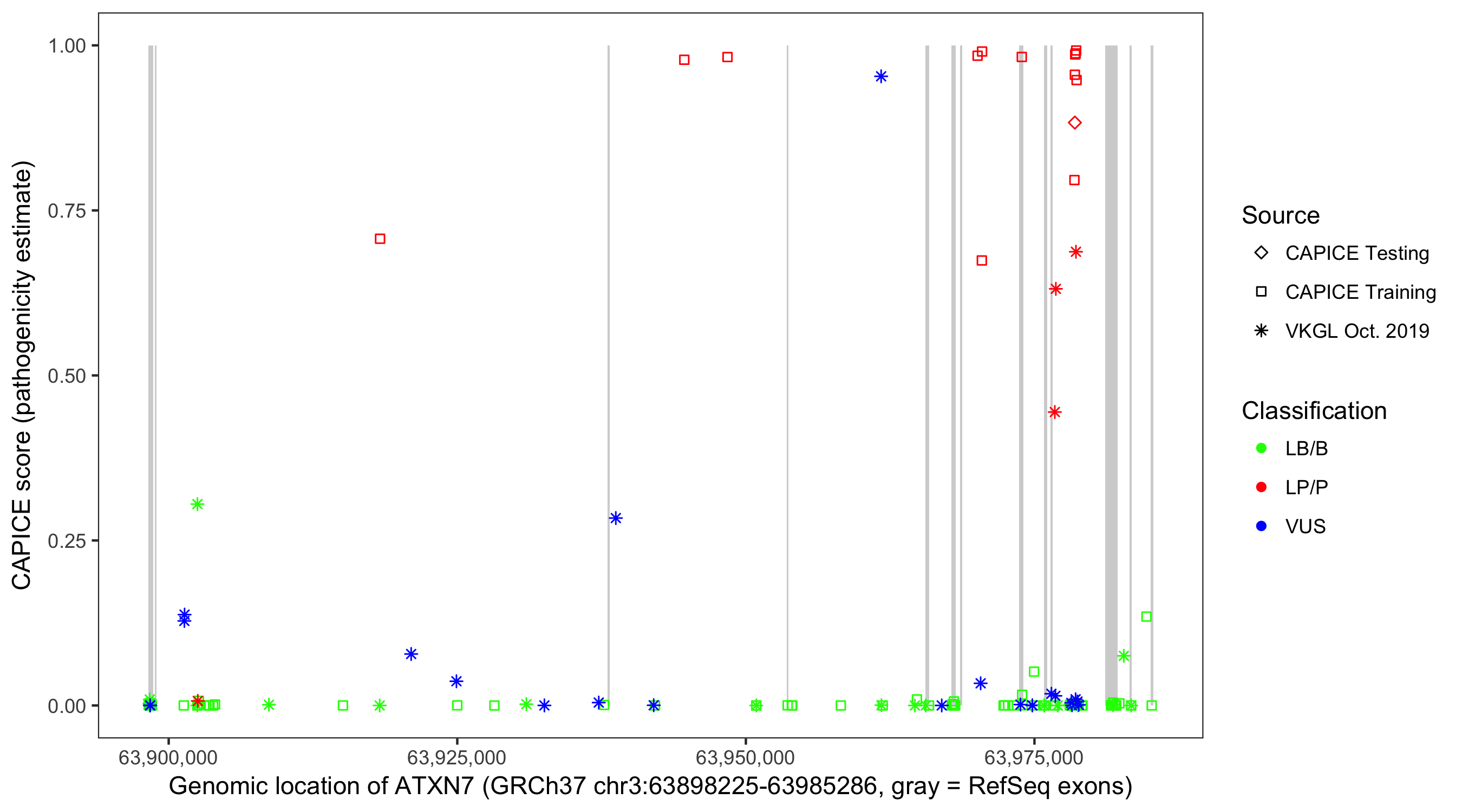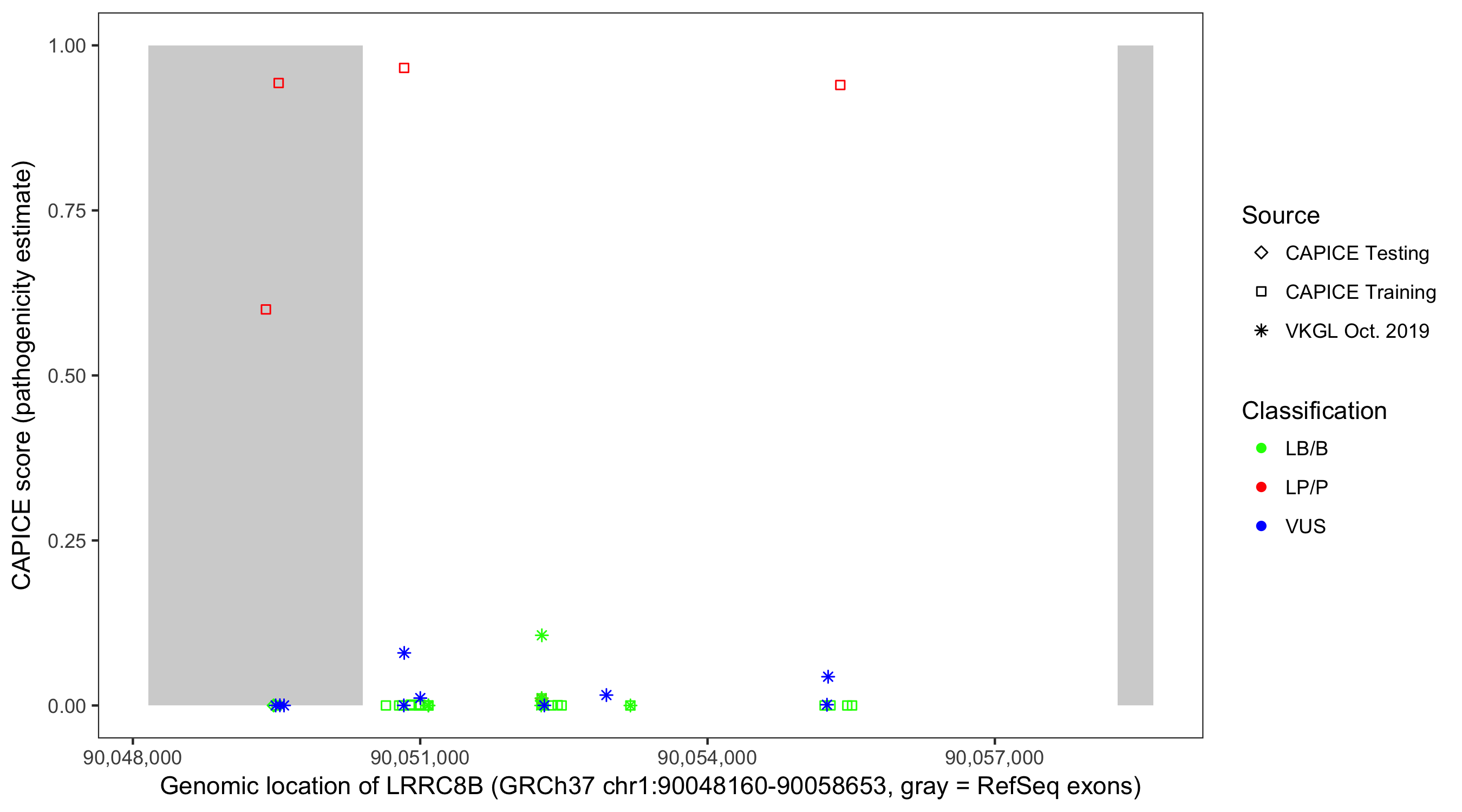Shown are CAPICE train/test variants plus VKGL Oct 2019.