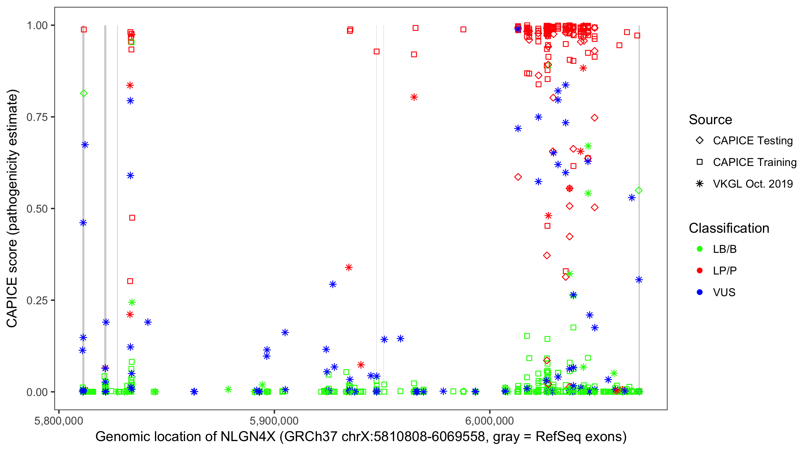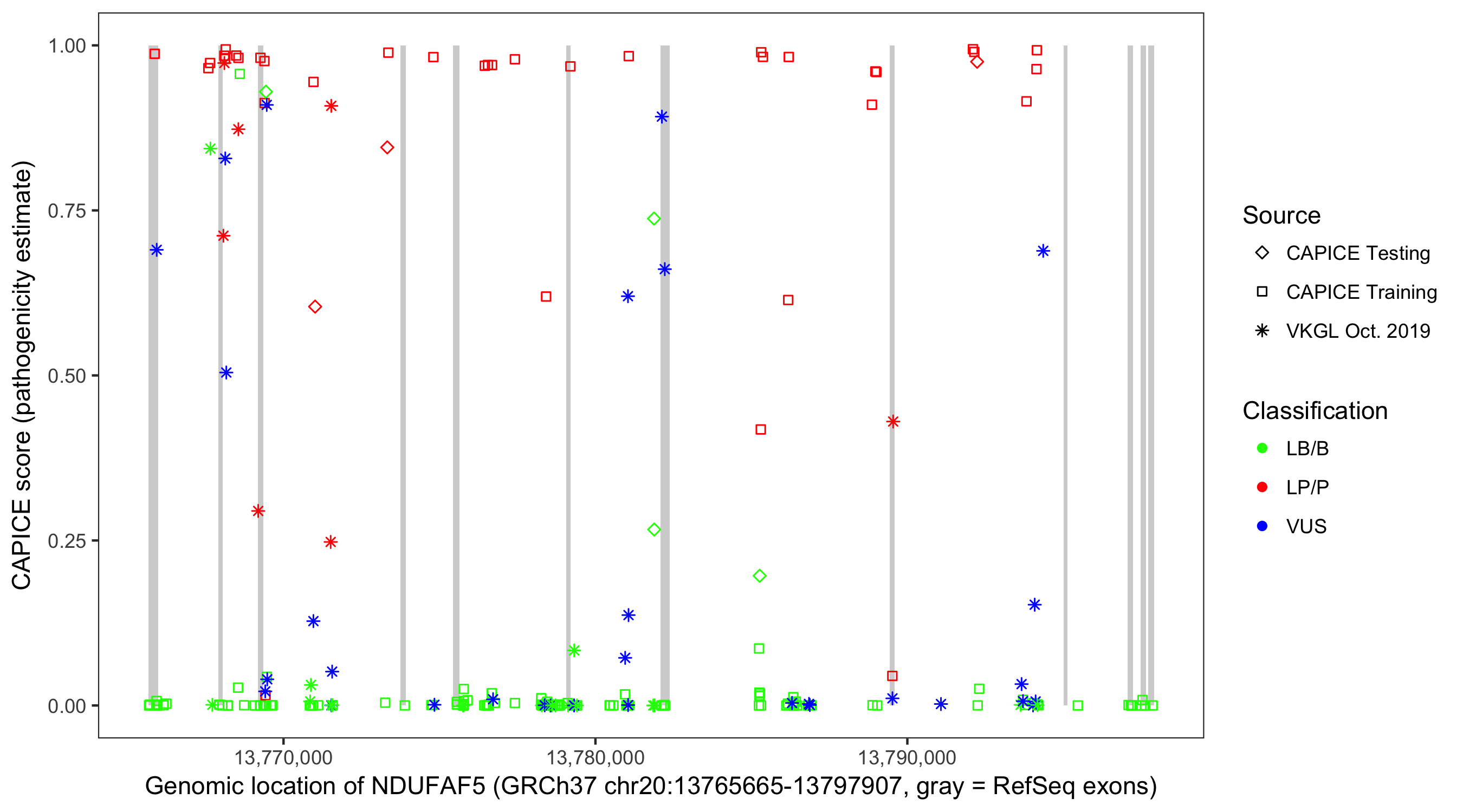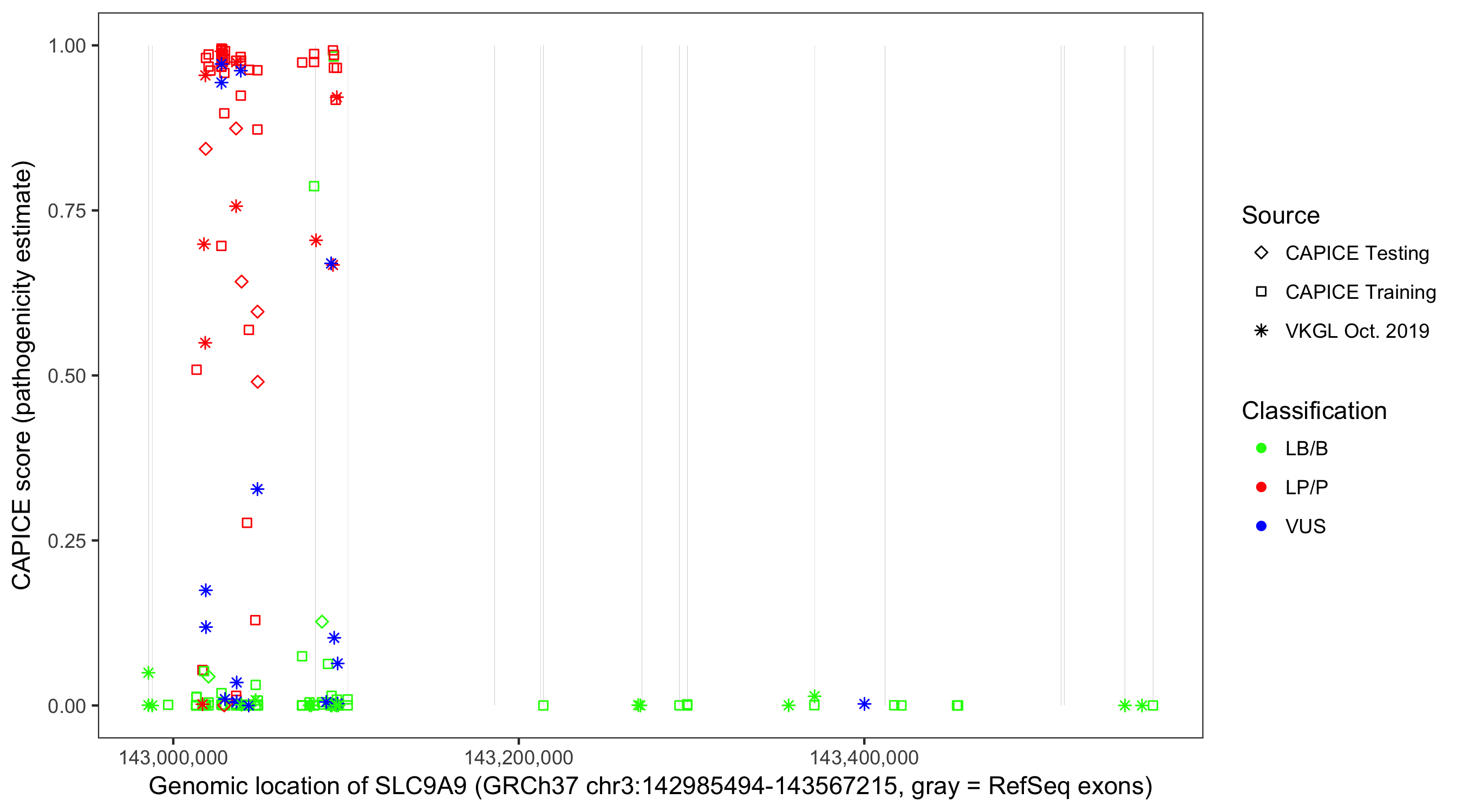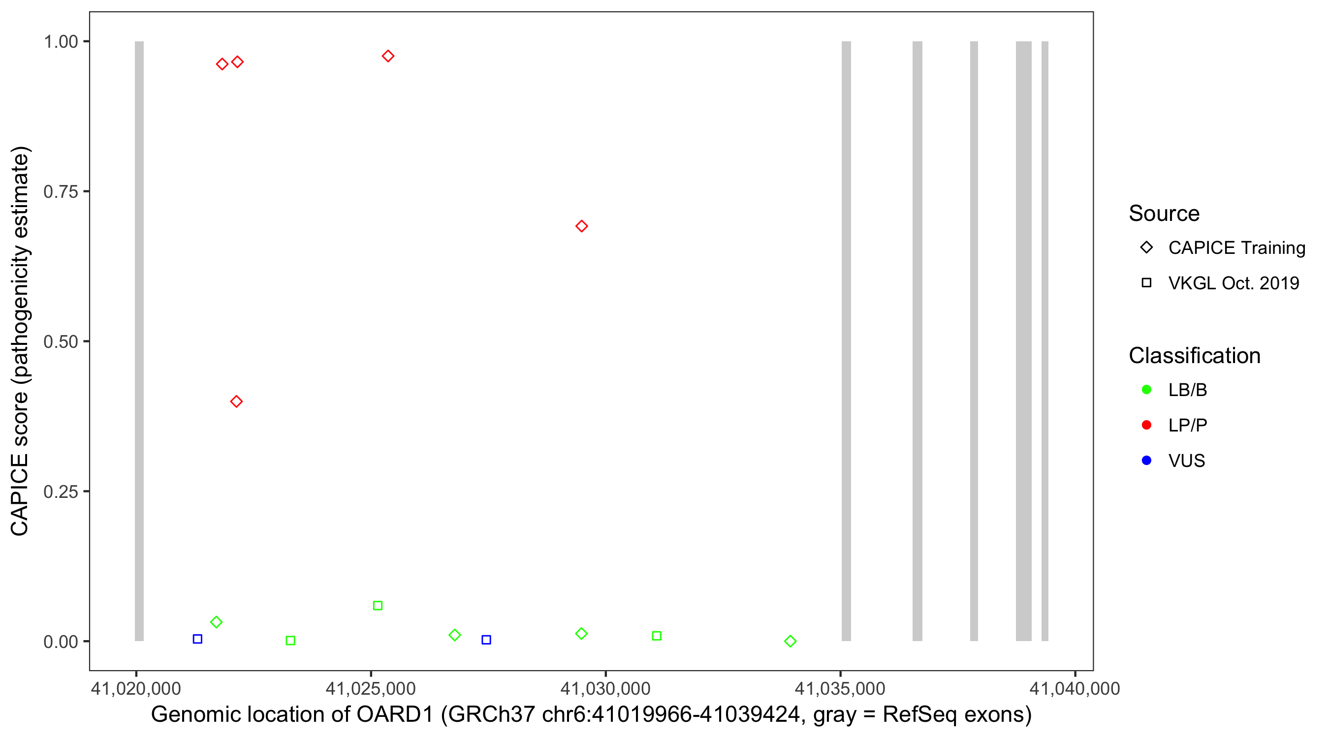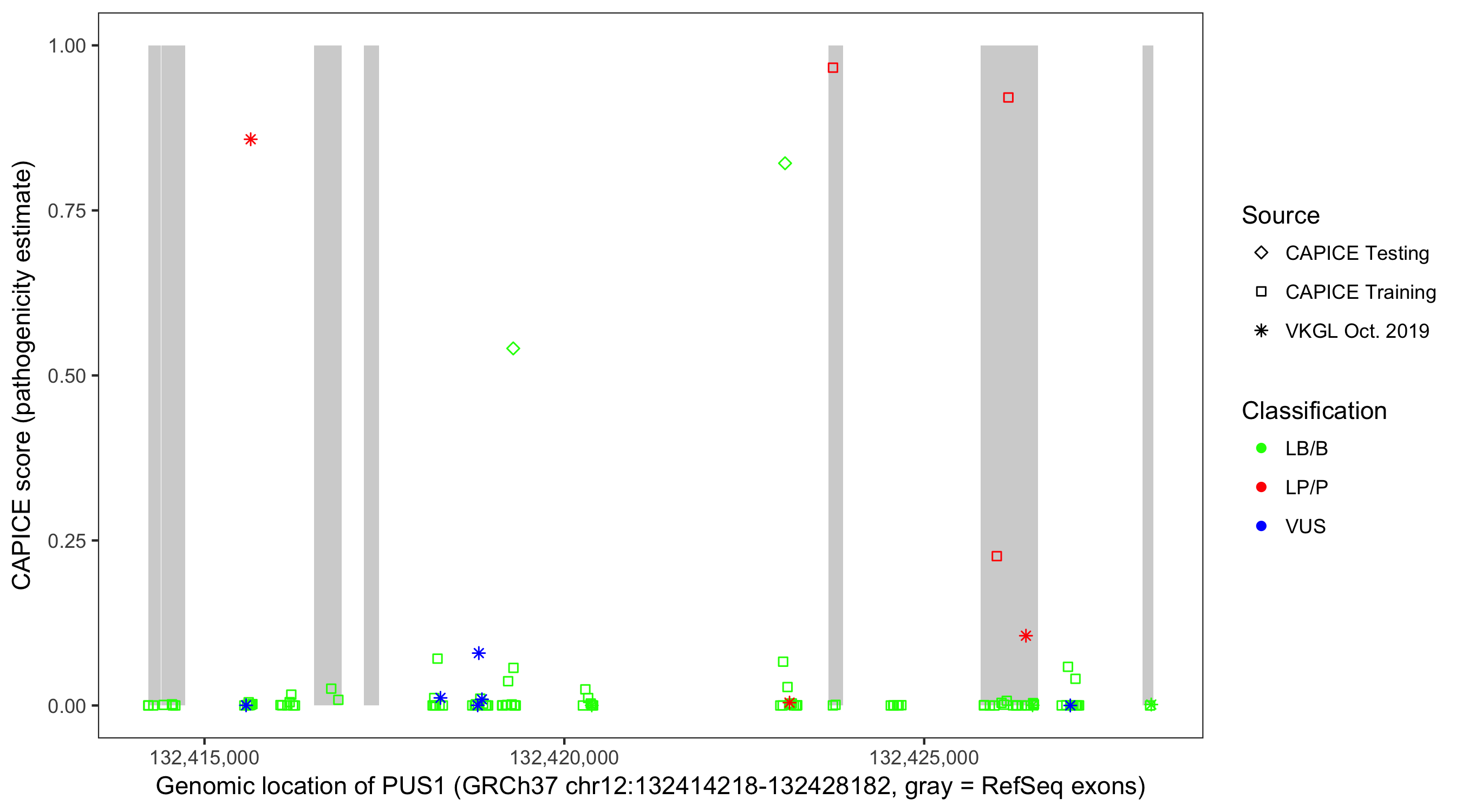 Shown are CAPICE train/test variants plus VKGL Oct 2019.