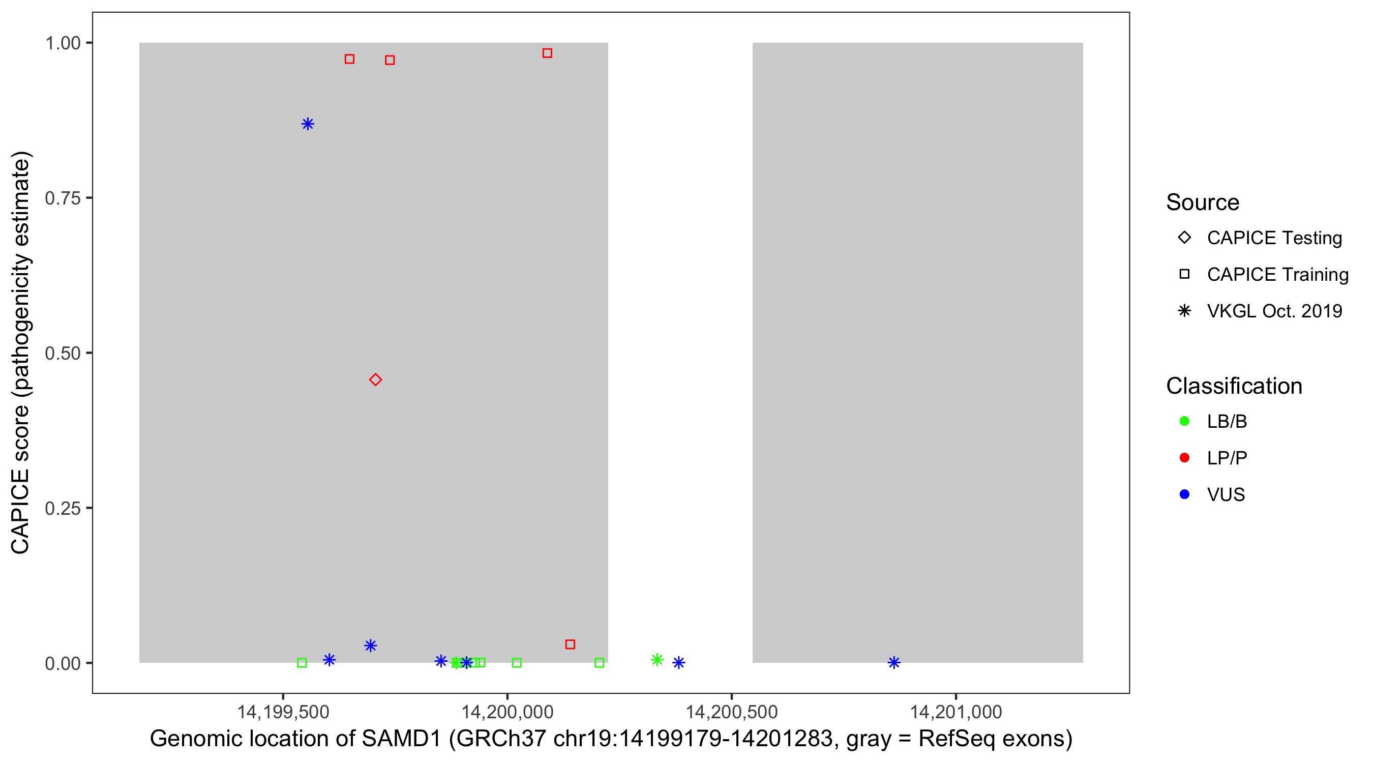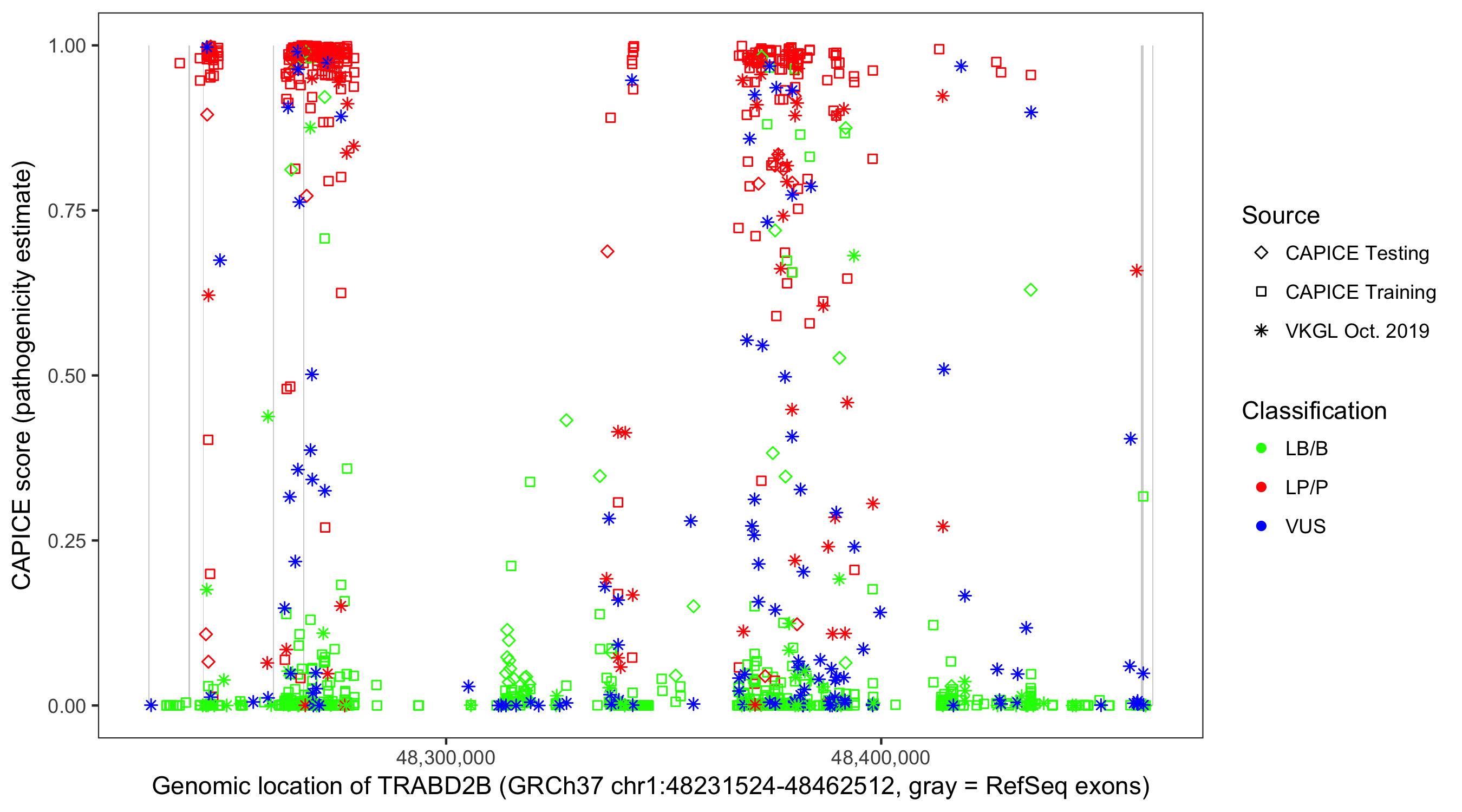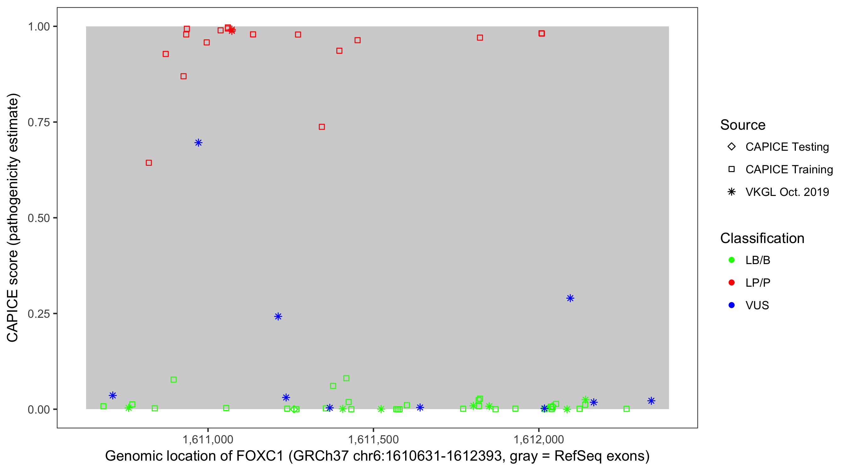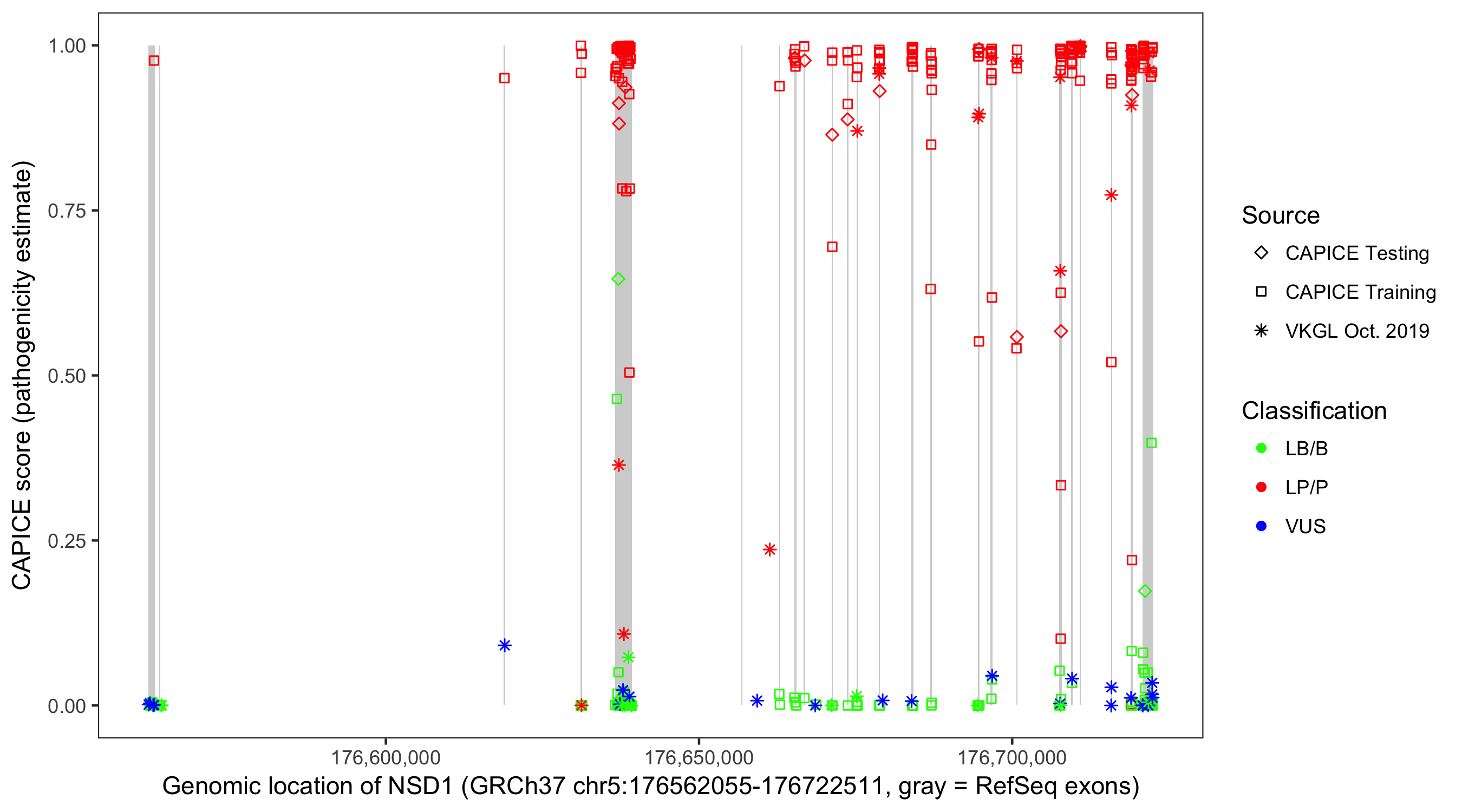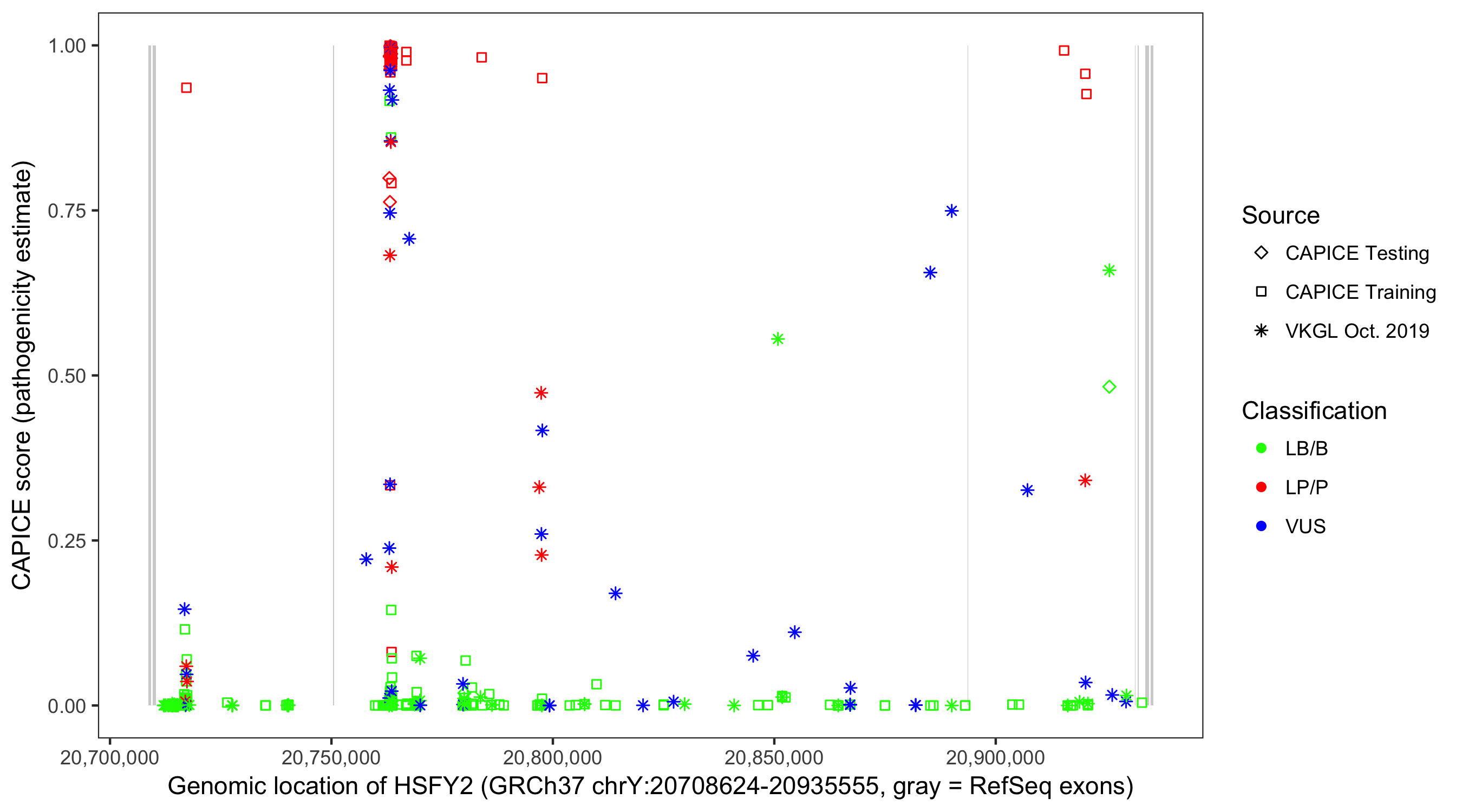 Shown are CAPICE train/test variants plus VKGL Oct 2019.