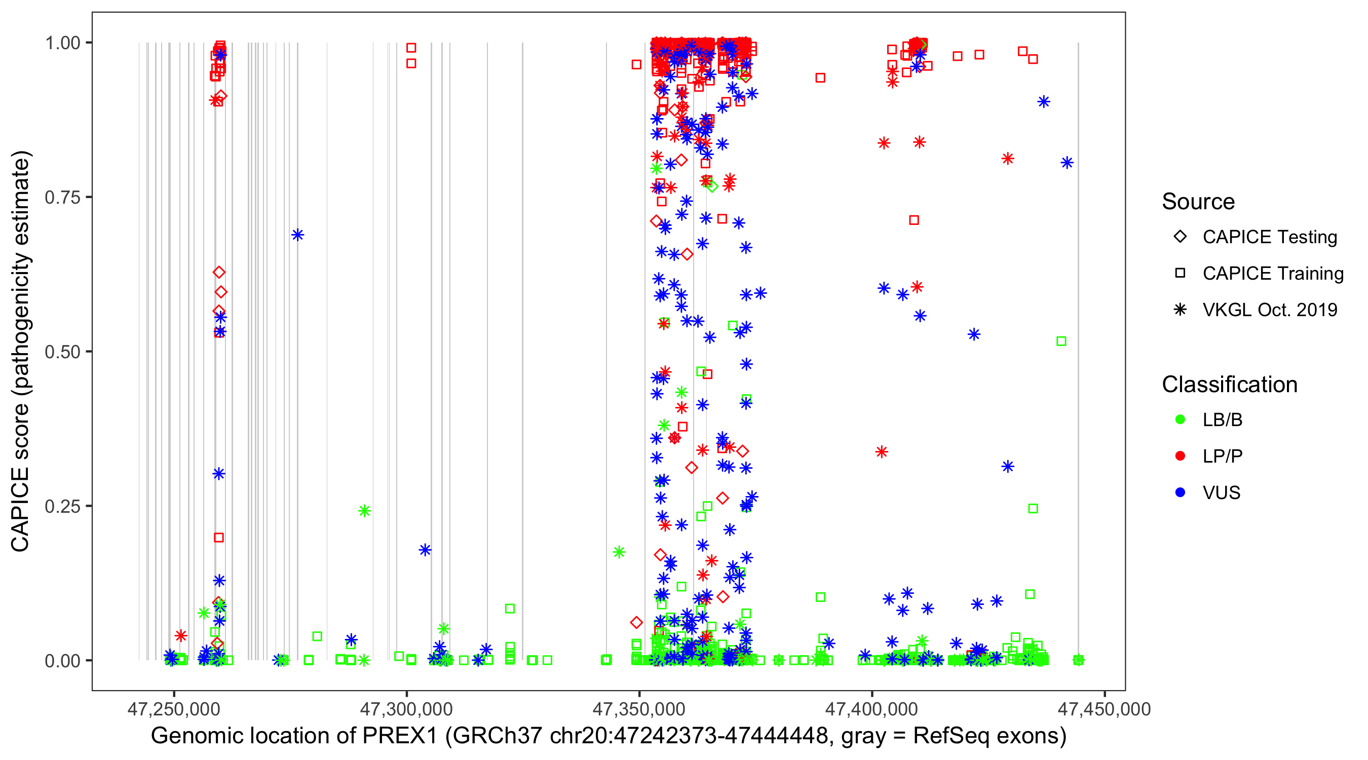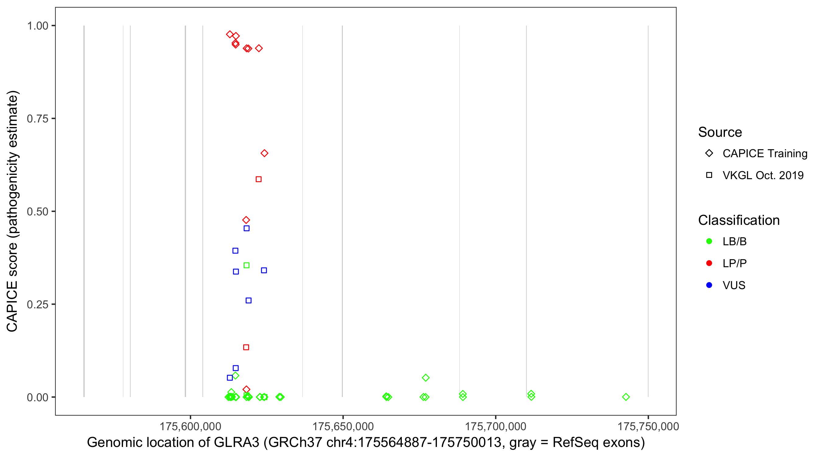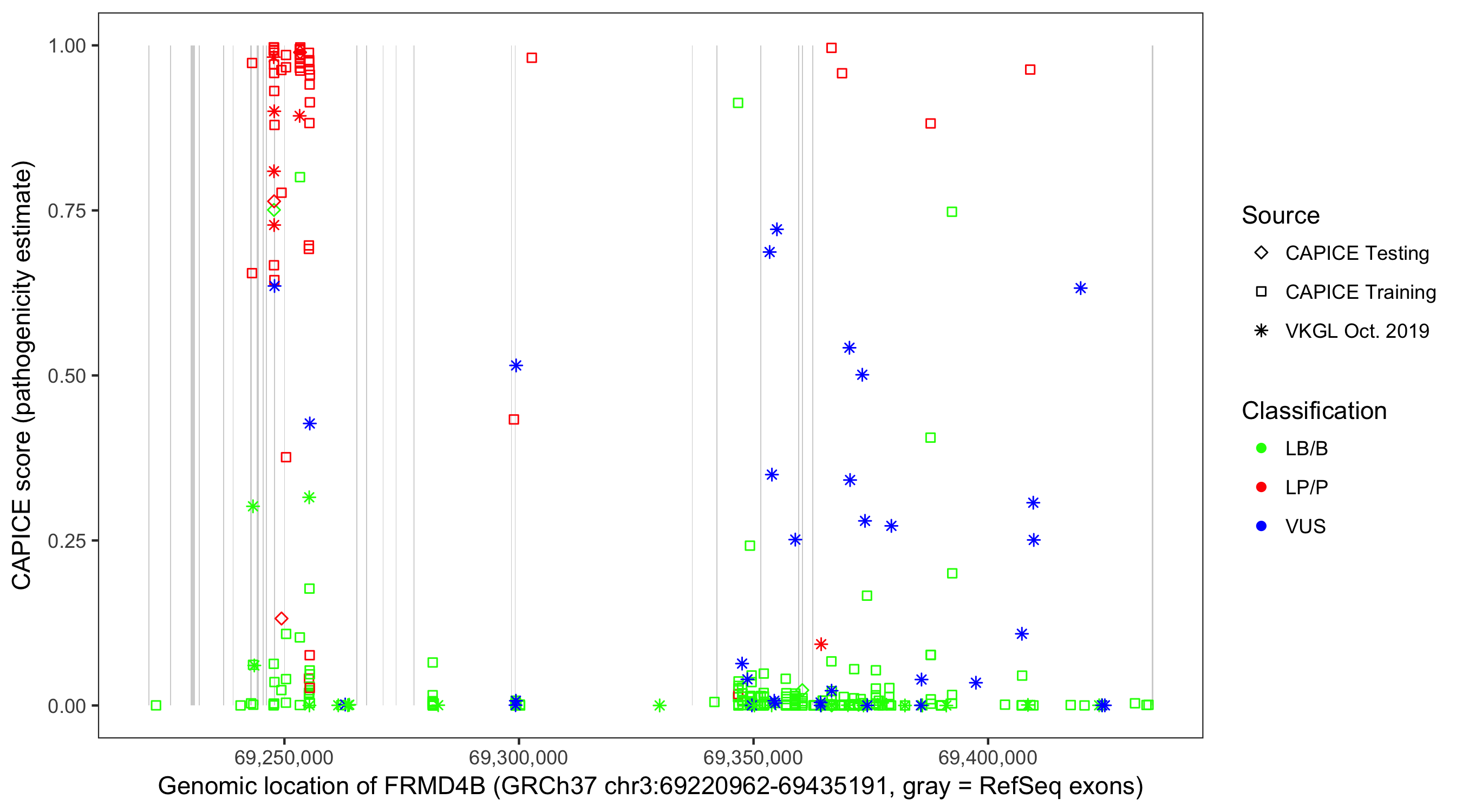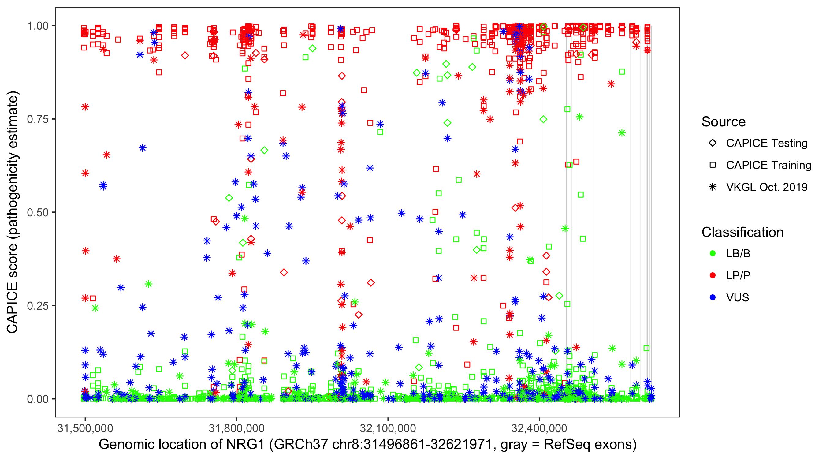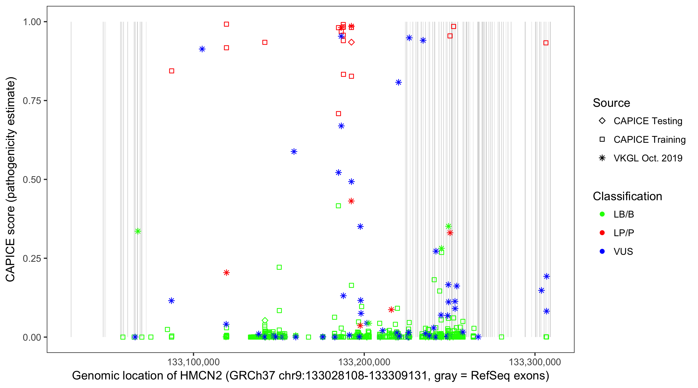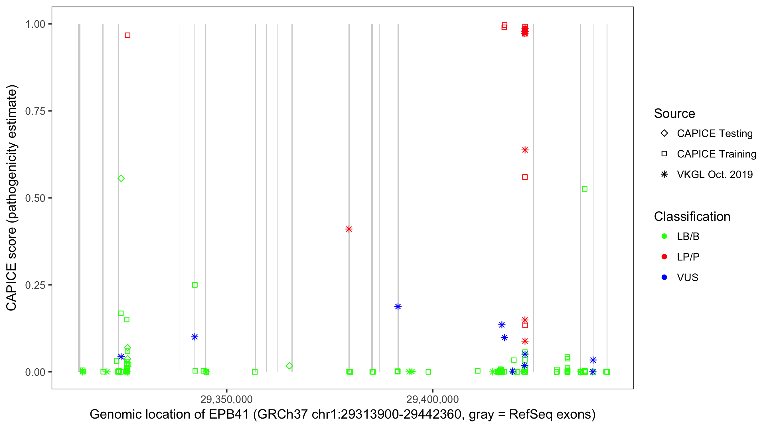 Shown are CAPICE train/test variants plus VKGL Oct 2019.