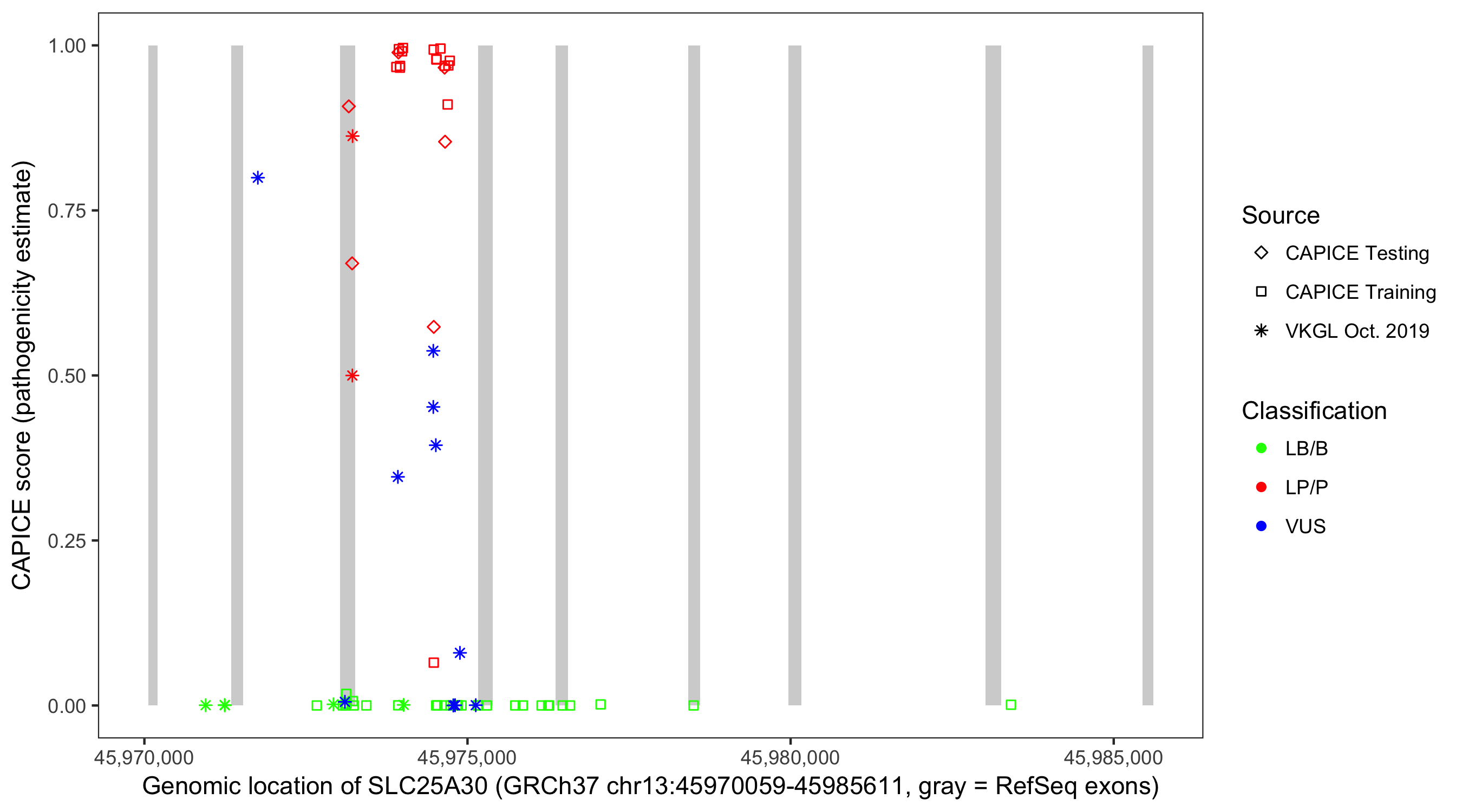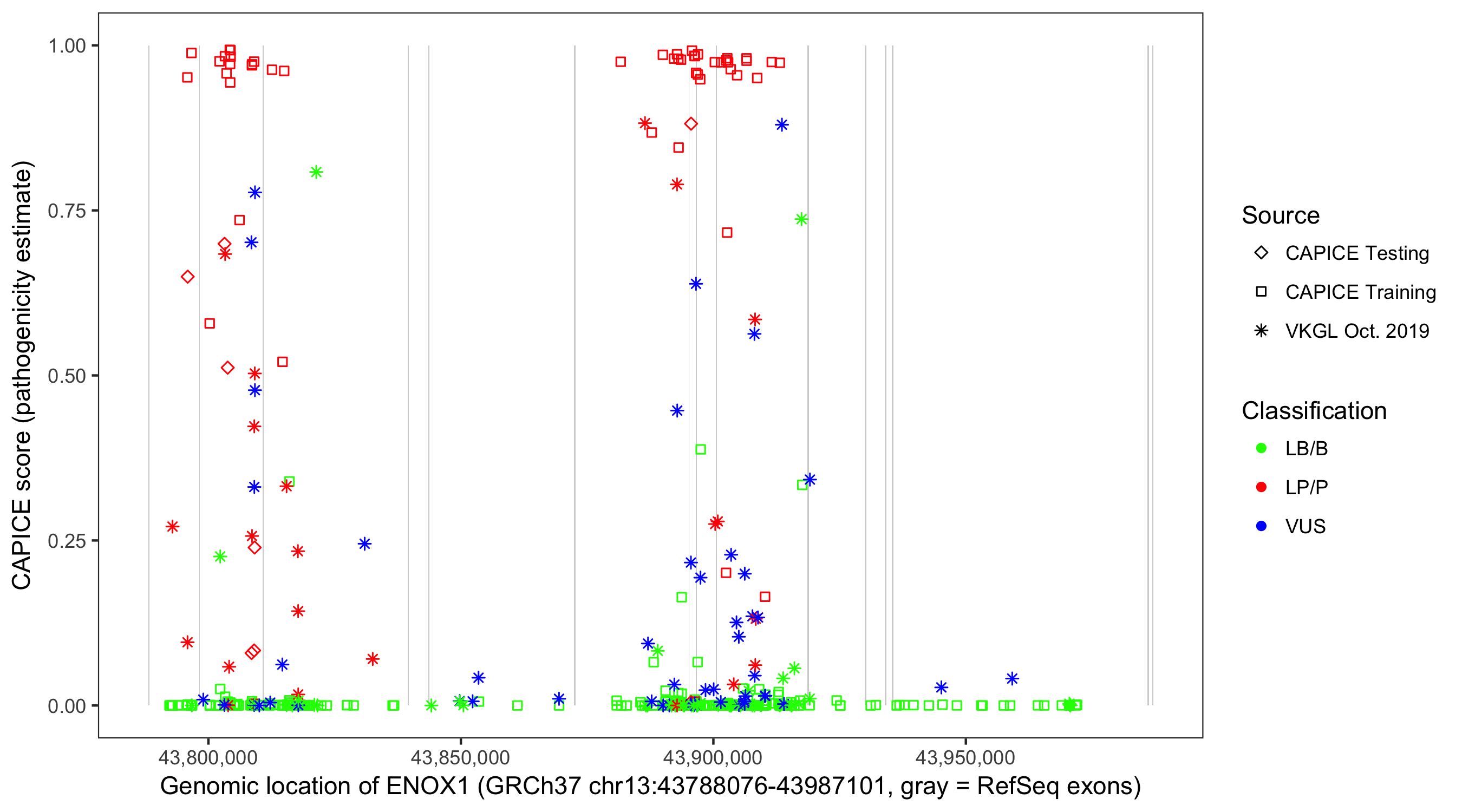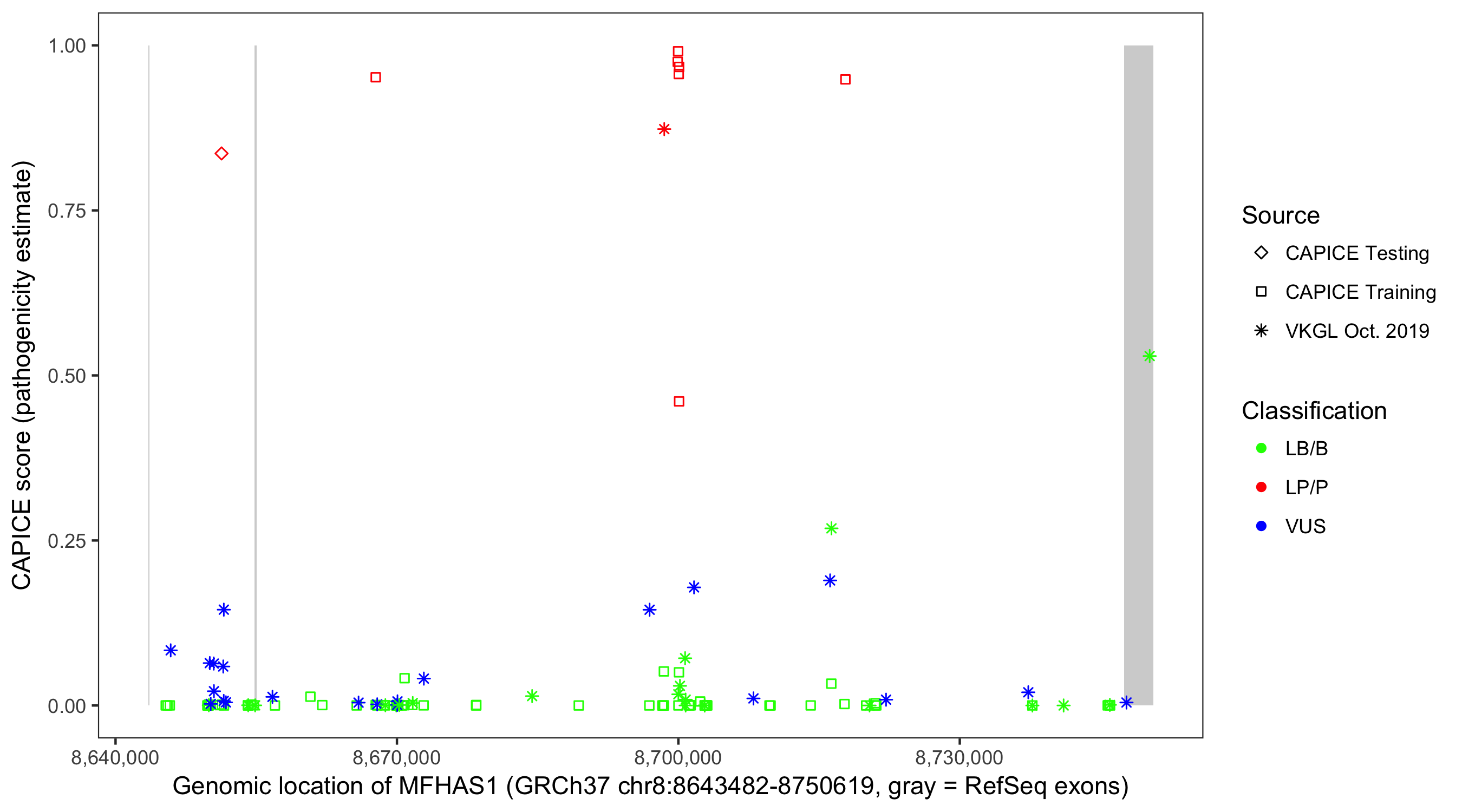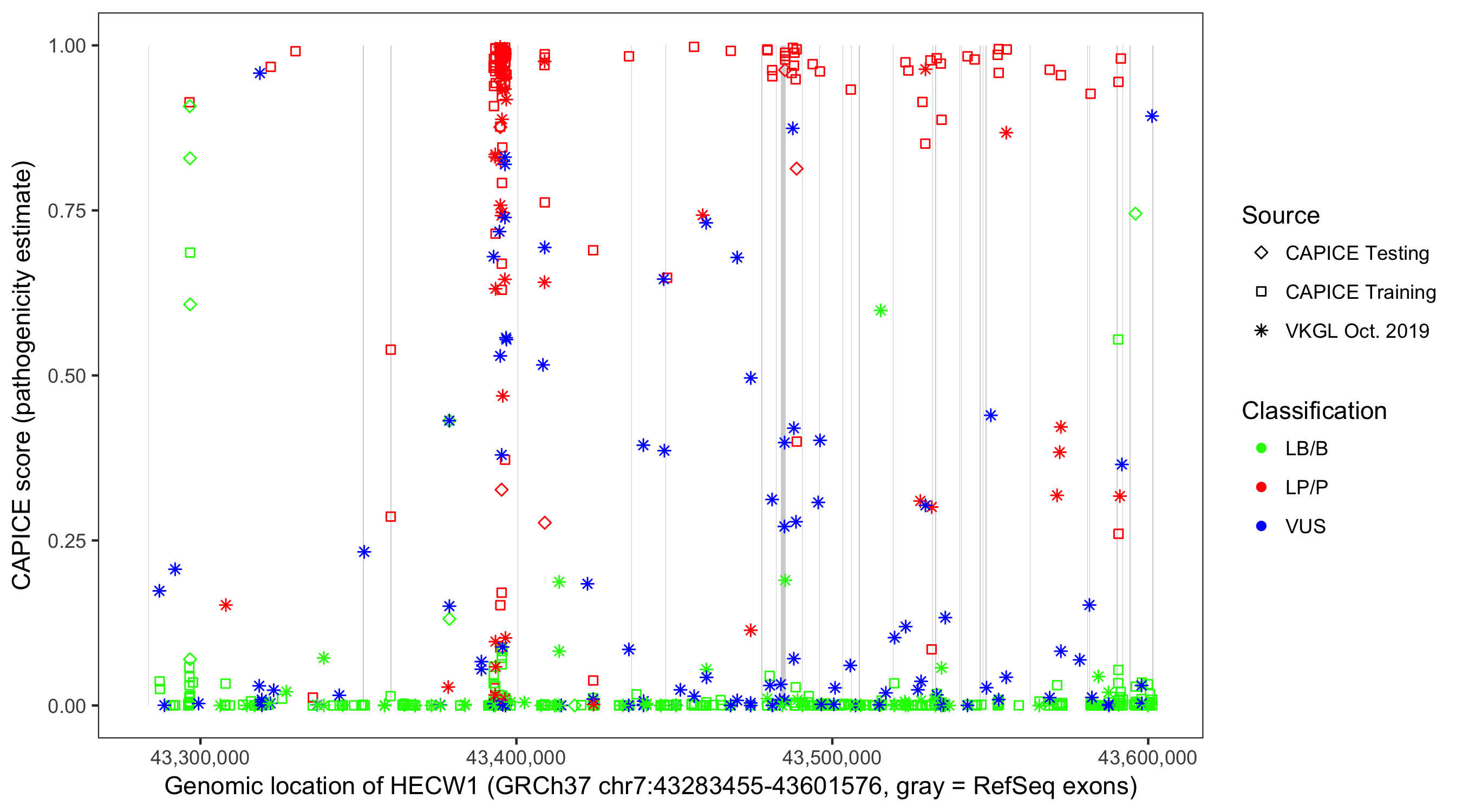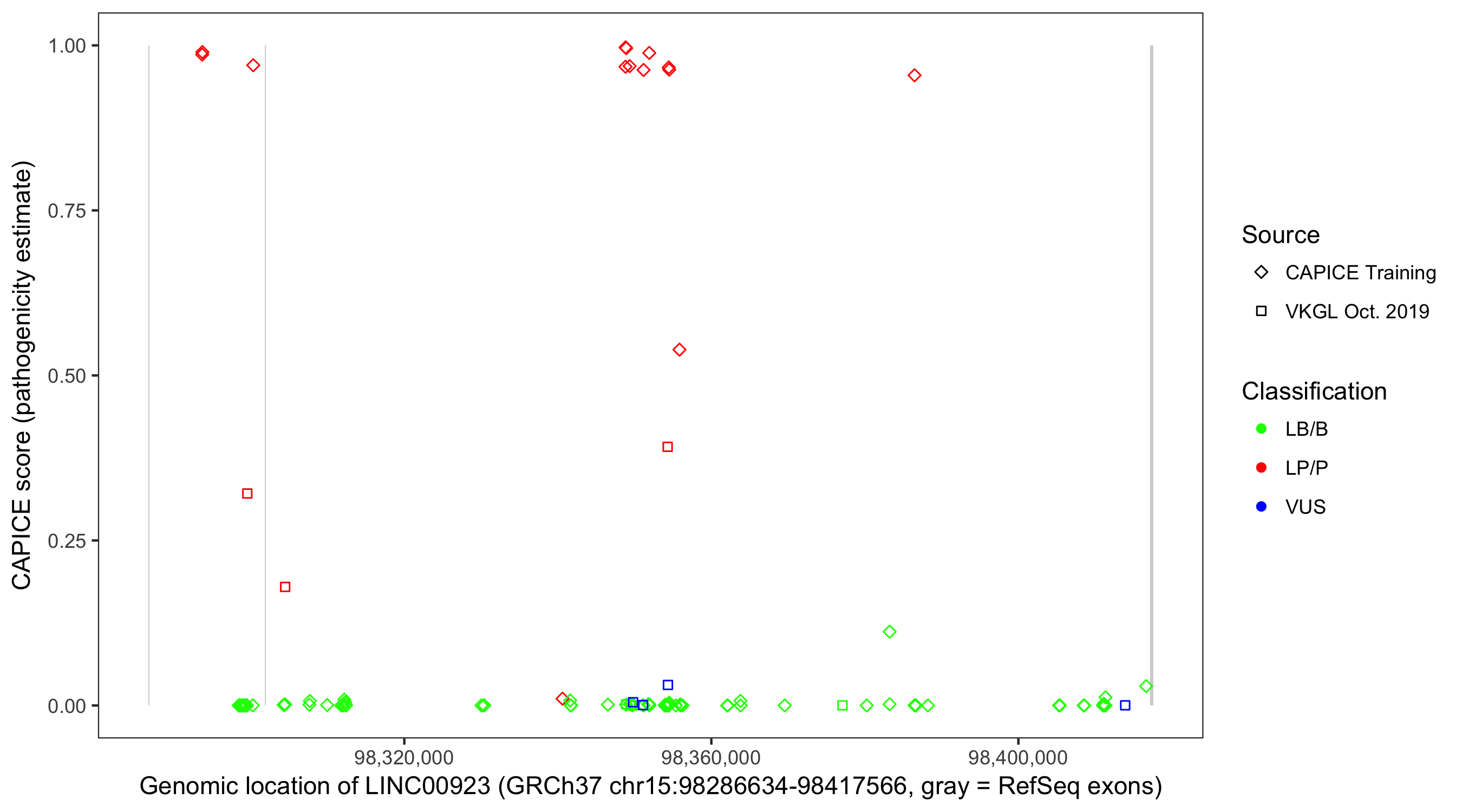 Shown are CAPICE train/test variants plus VKGL Oct 2019.
